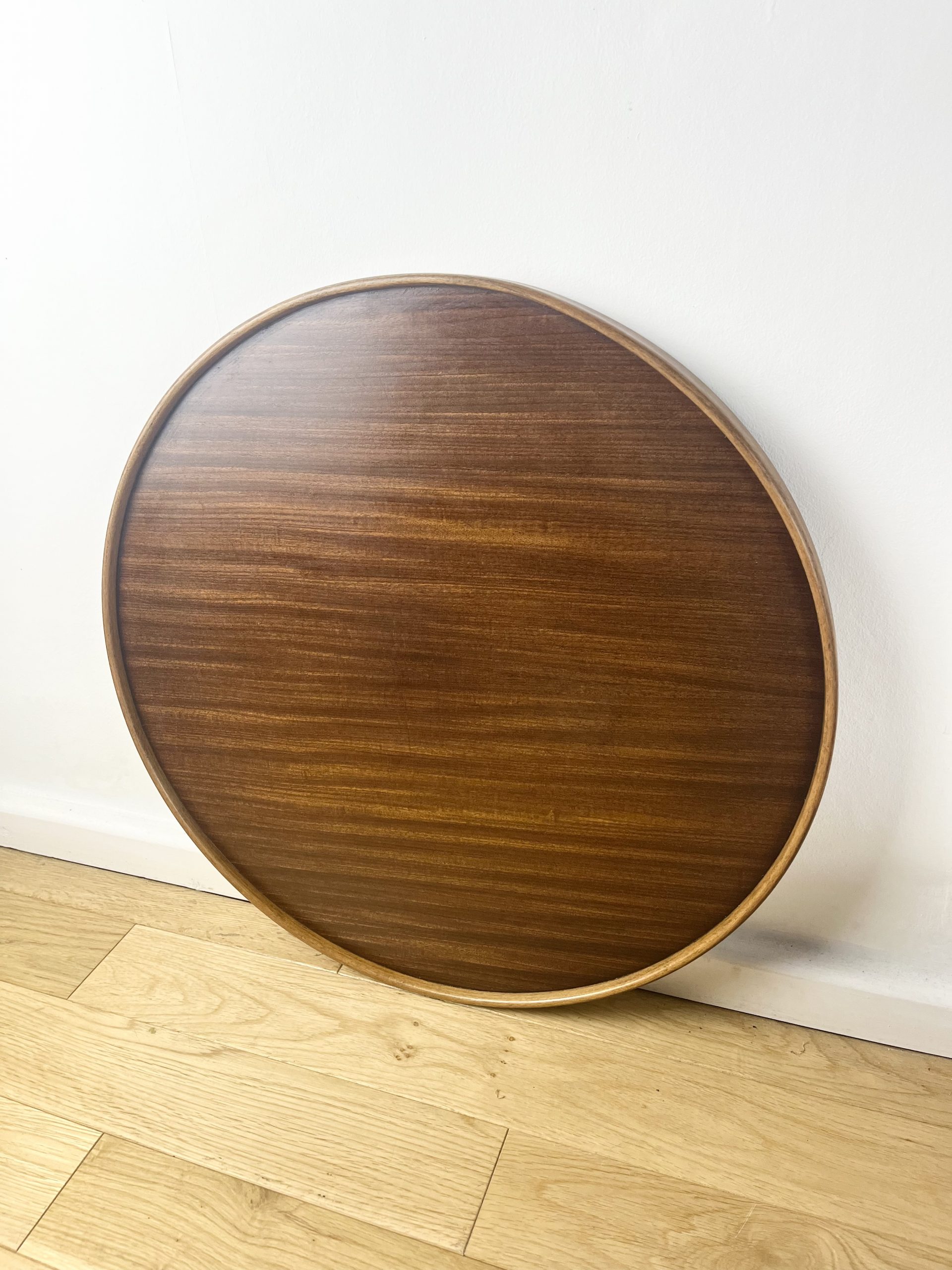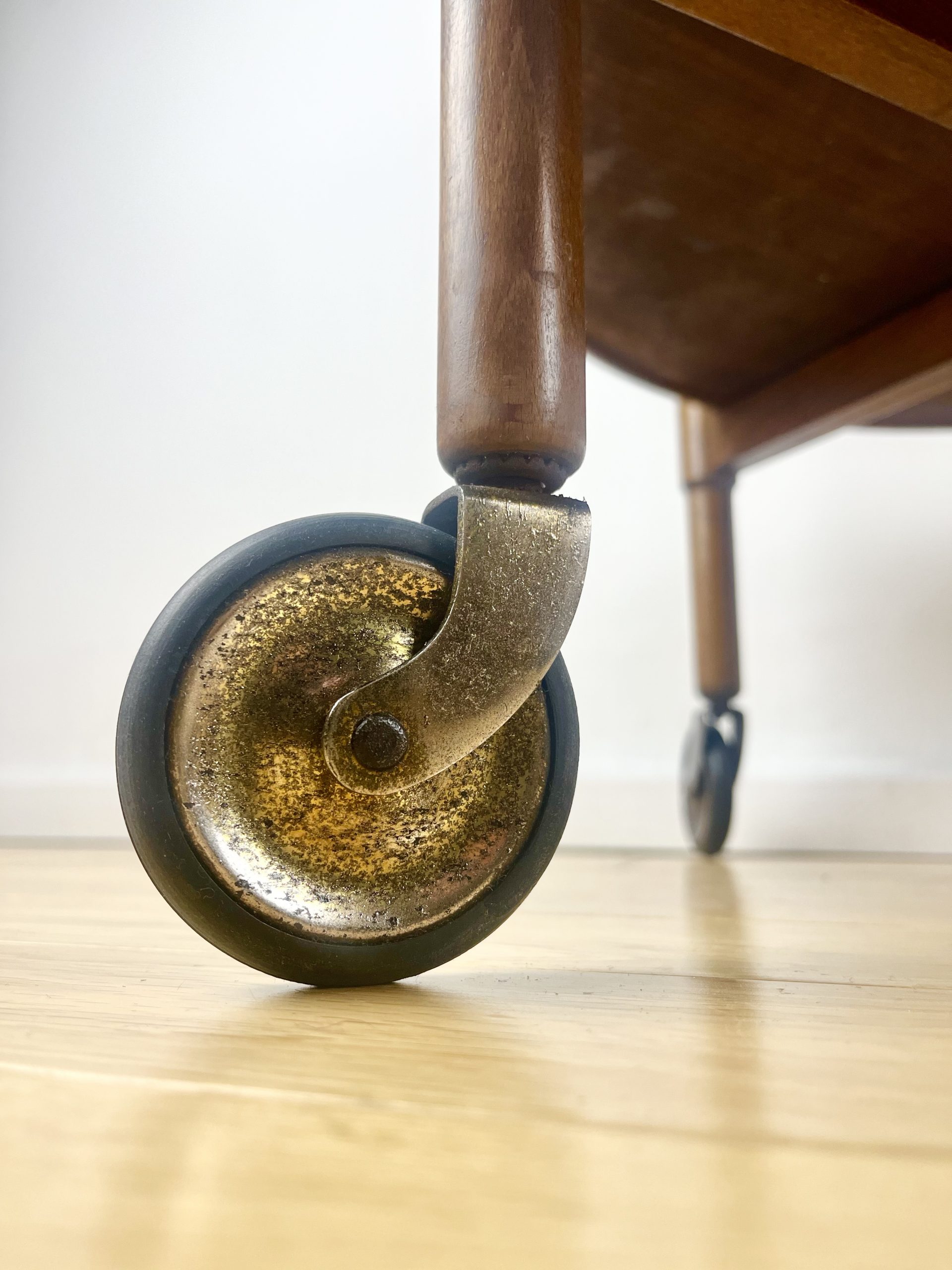 A solid oak frame houses two oak-rimmed mahogany trays. The top tray is removable for serving your tipples of choice, and the nicely patinaed brass casters benefit from that rarest of features… they actually run smoothly!