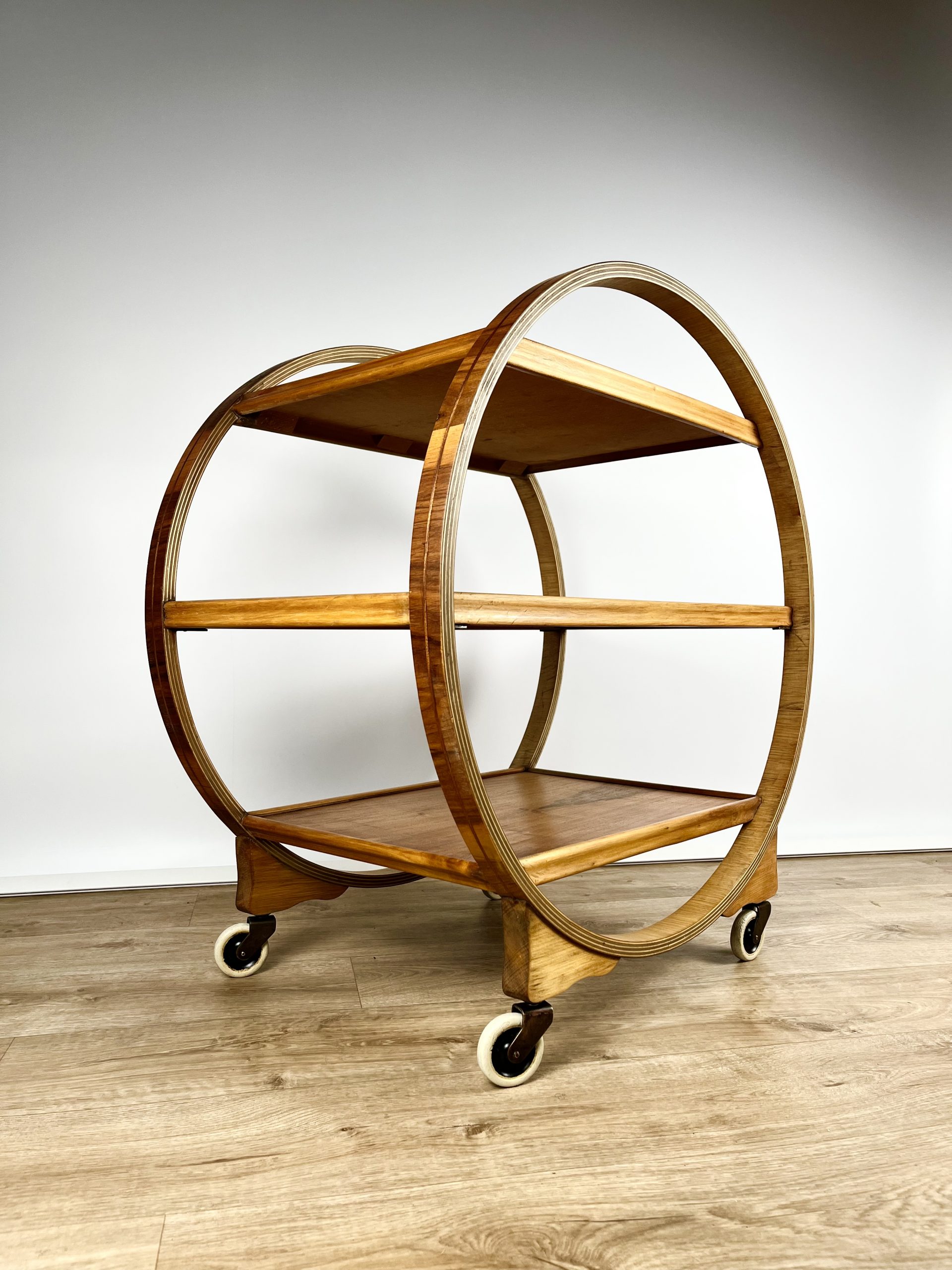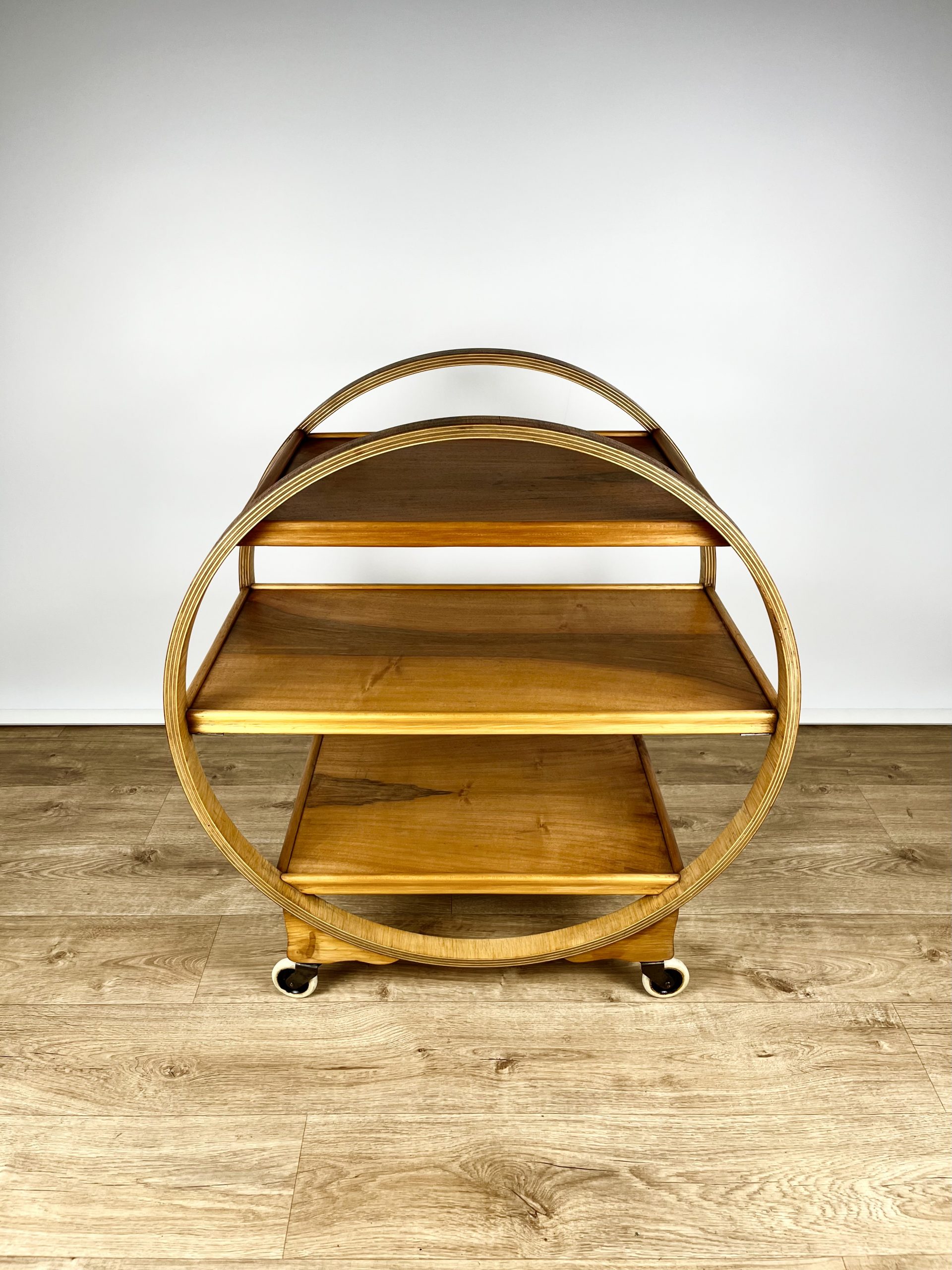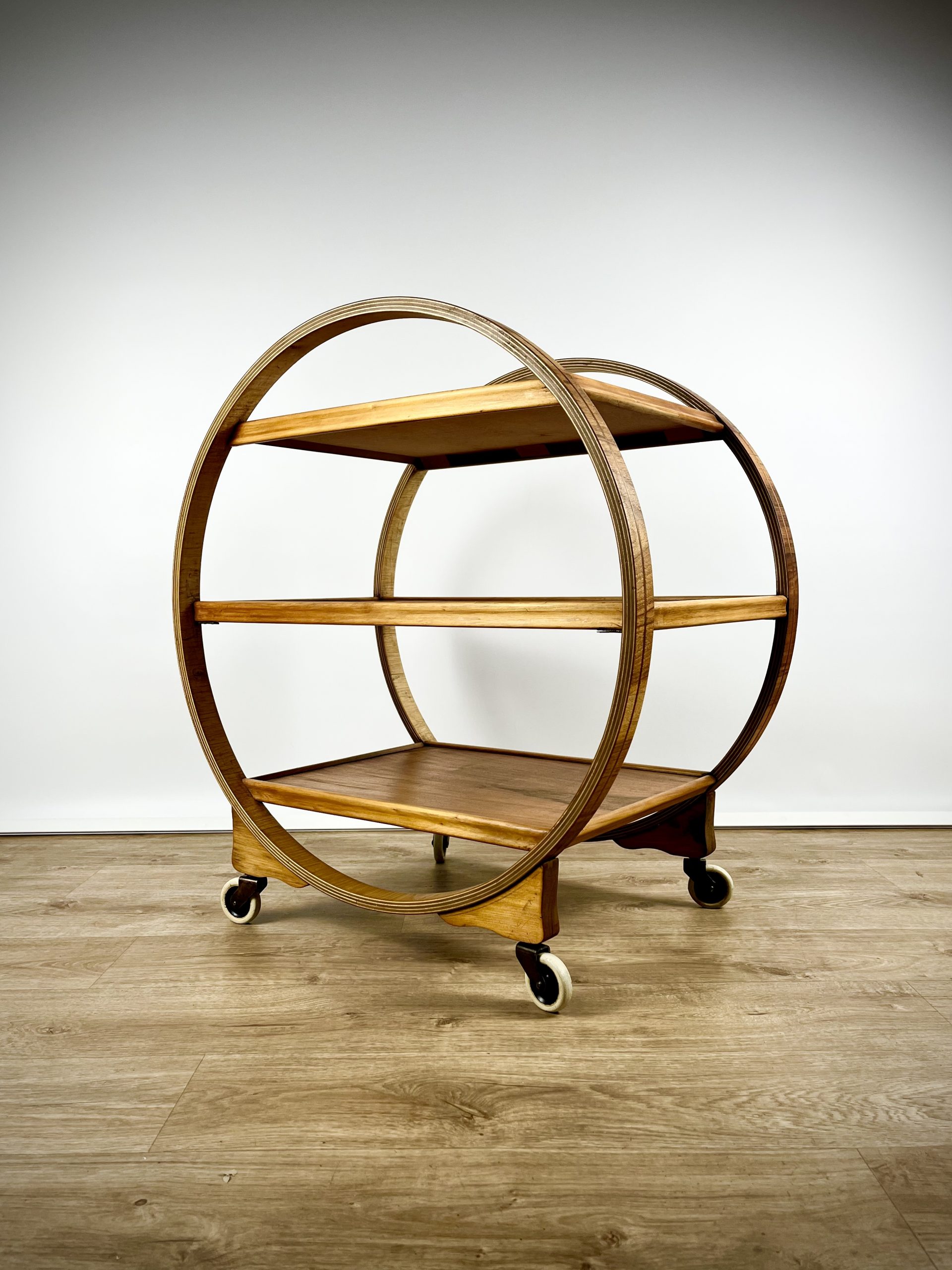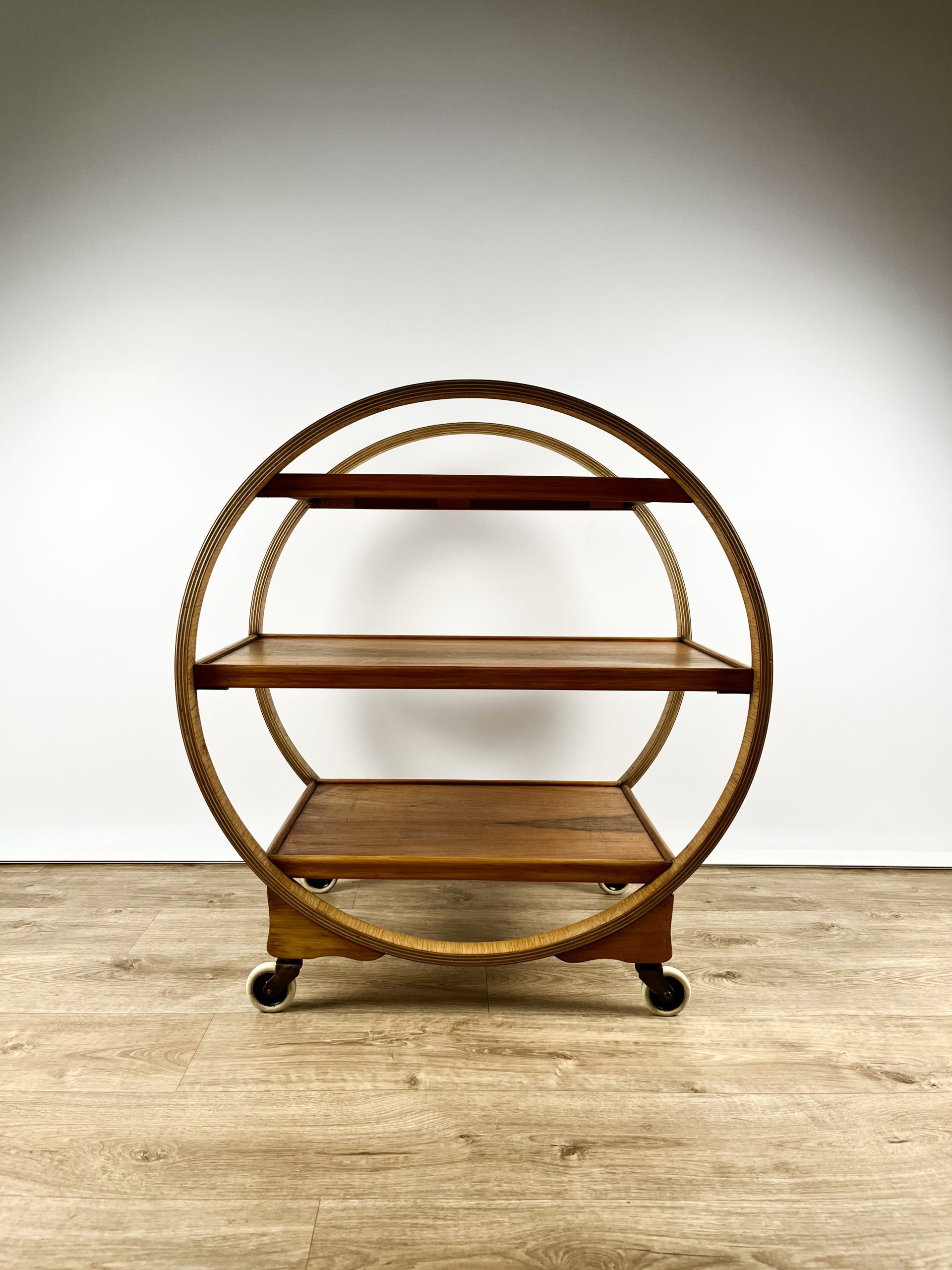 Produced in England during the 1930s, this classic 3-tier Art Deco serving trolley is constructed from walnut veneered ply, and cuts a mean silhouette with that circular, geometric form!