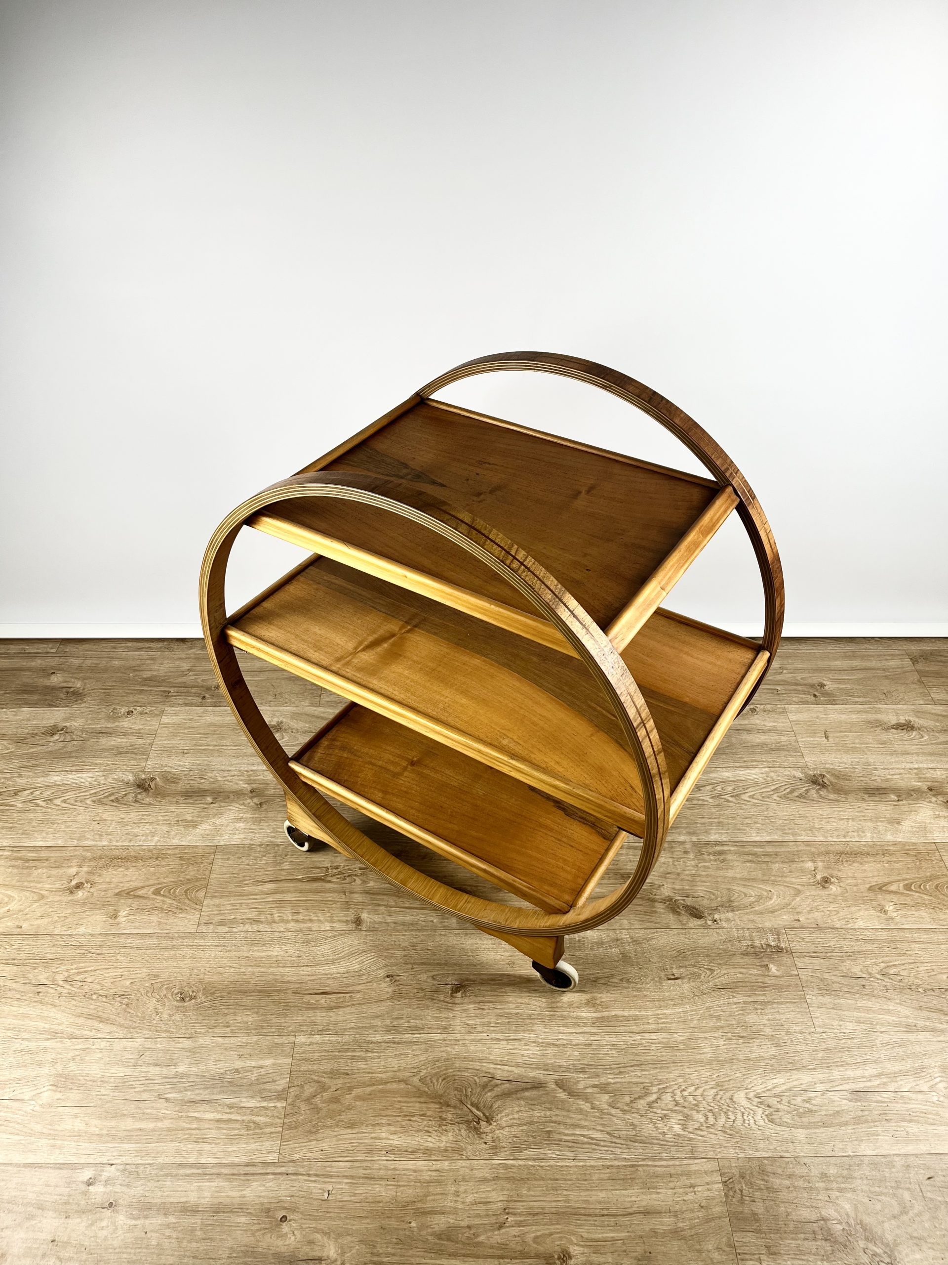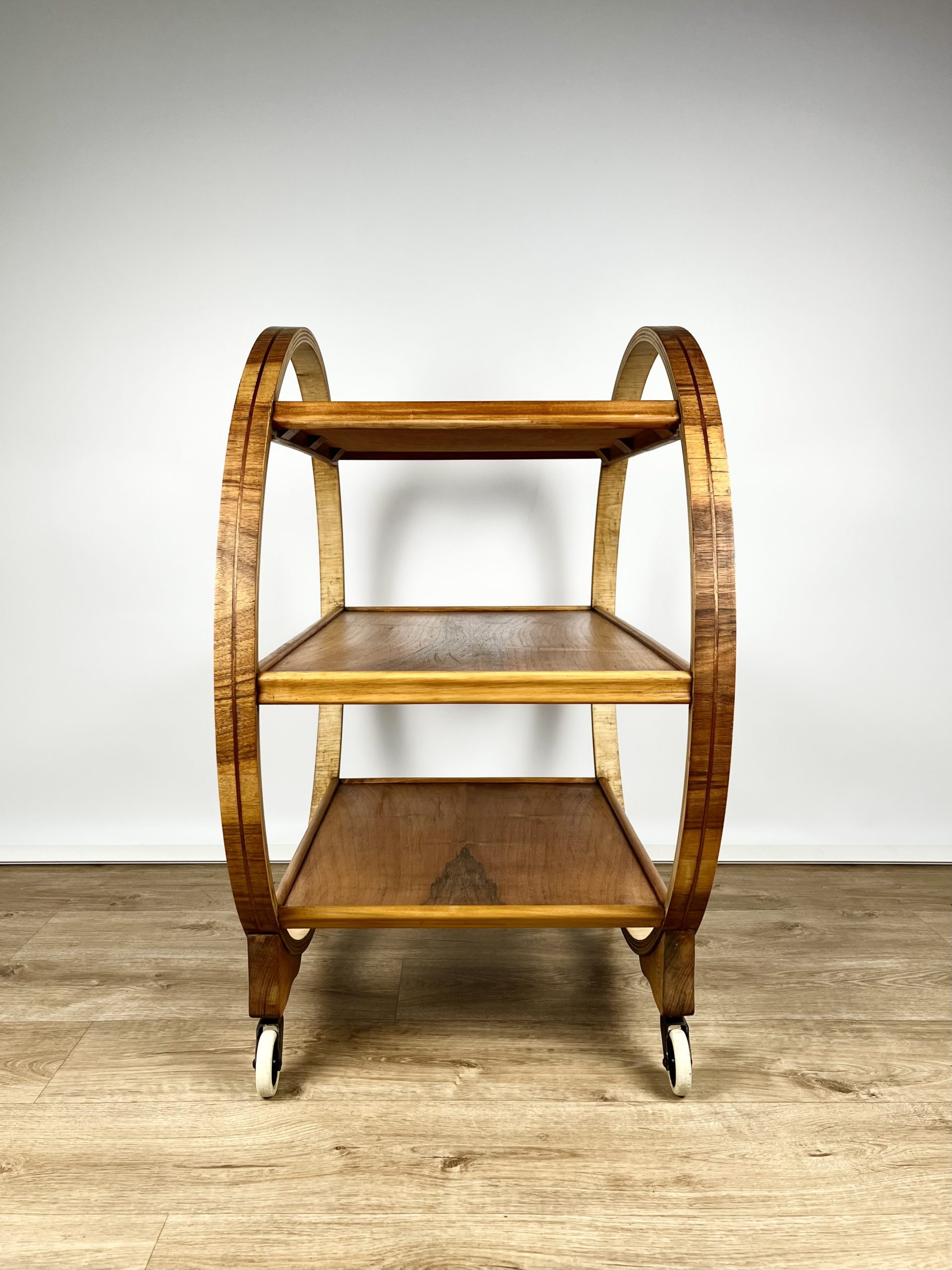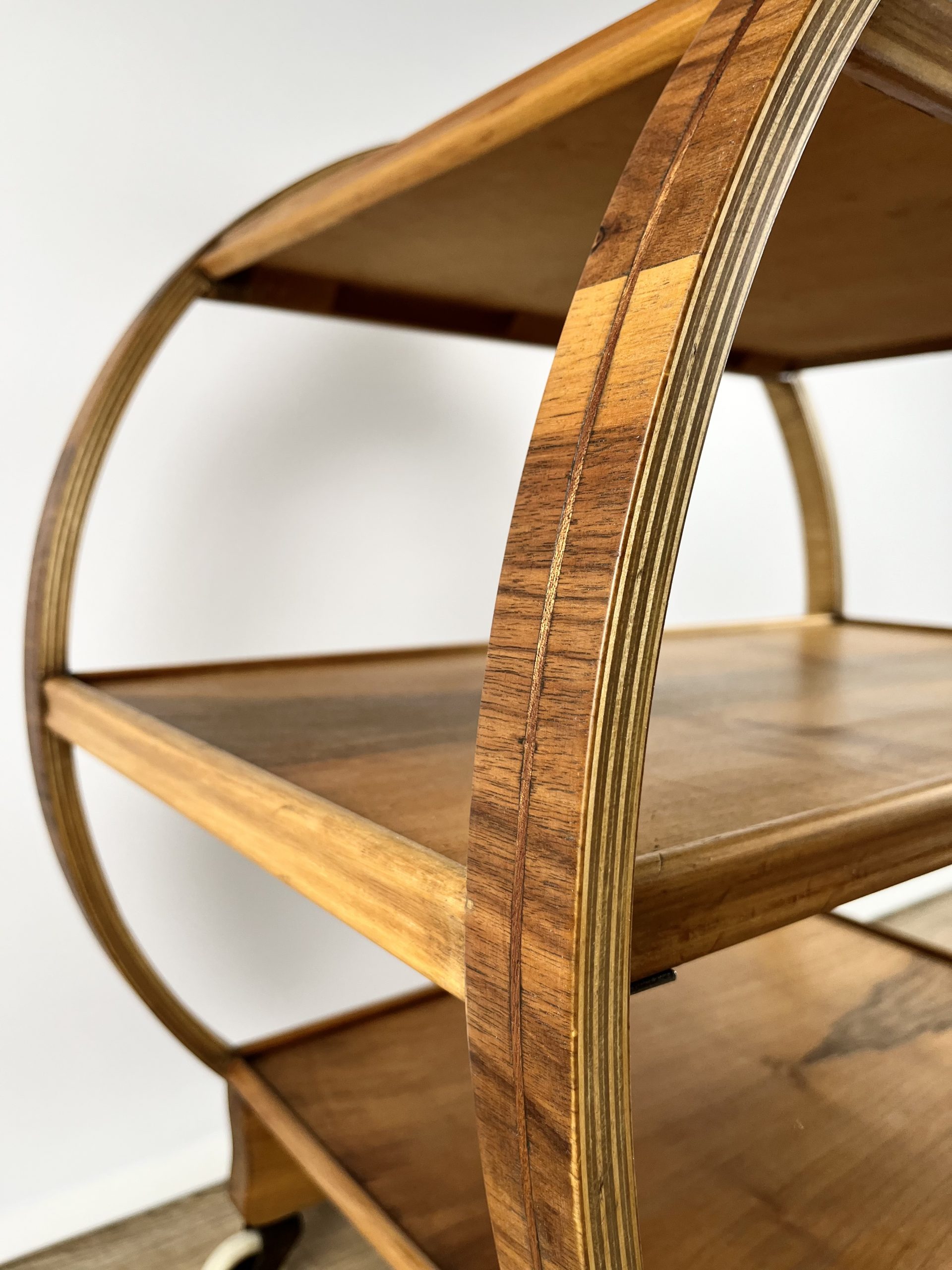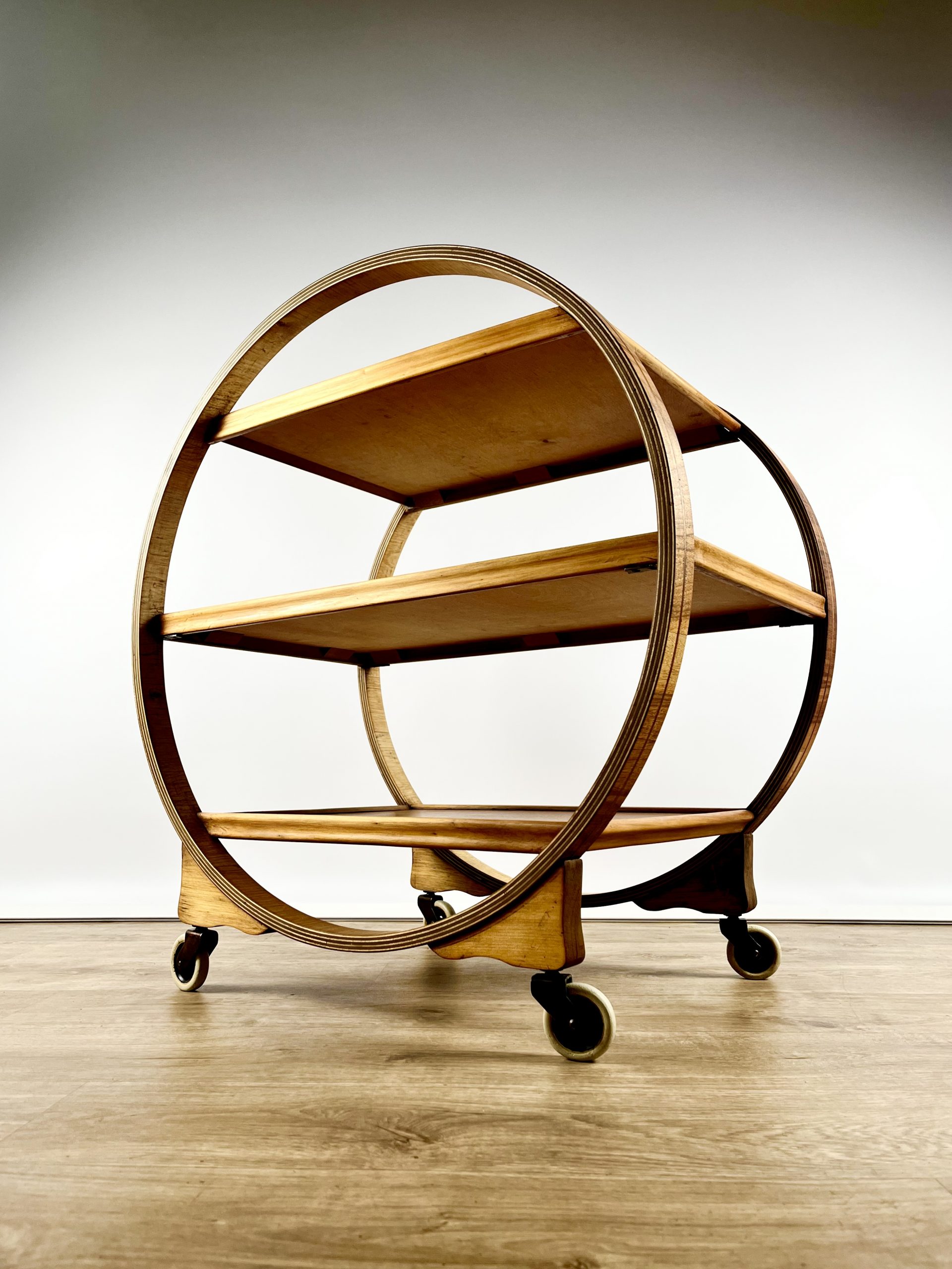 Produced in England during the 1930s, this classic 3-tier Art Deco serving trolley is constructed from walnut veneered ply, and cuts a mean silhouette with that circular, geometric form!