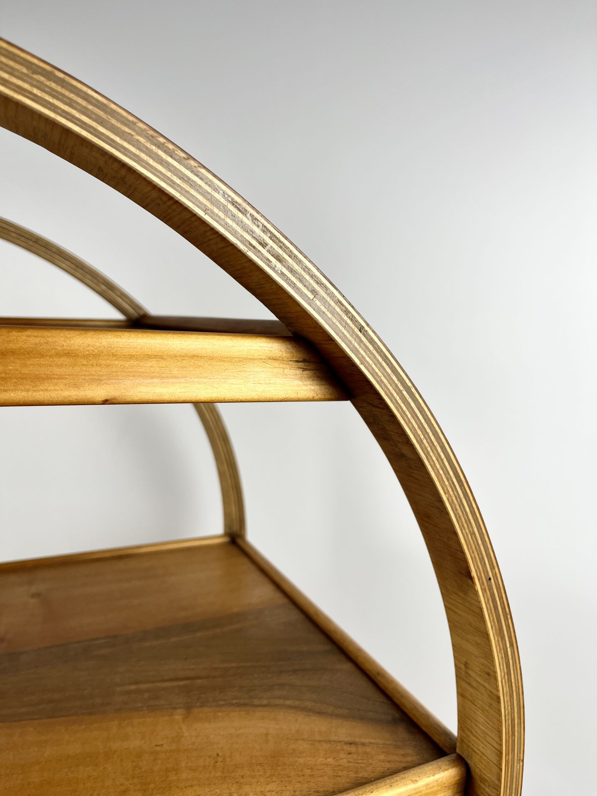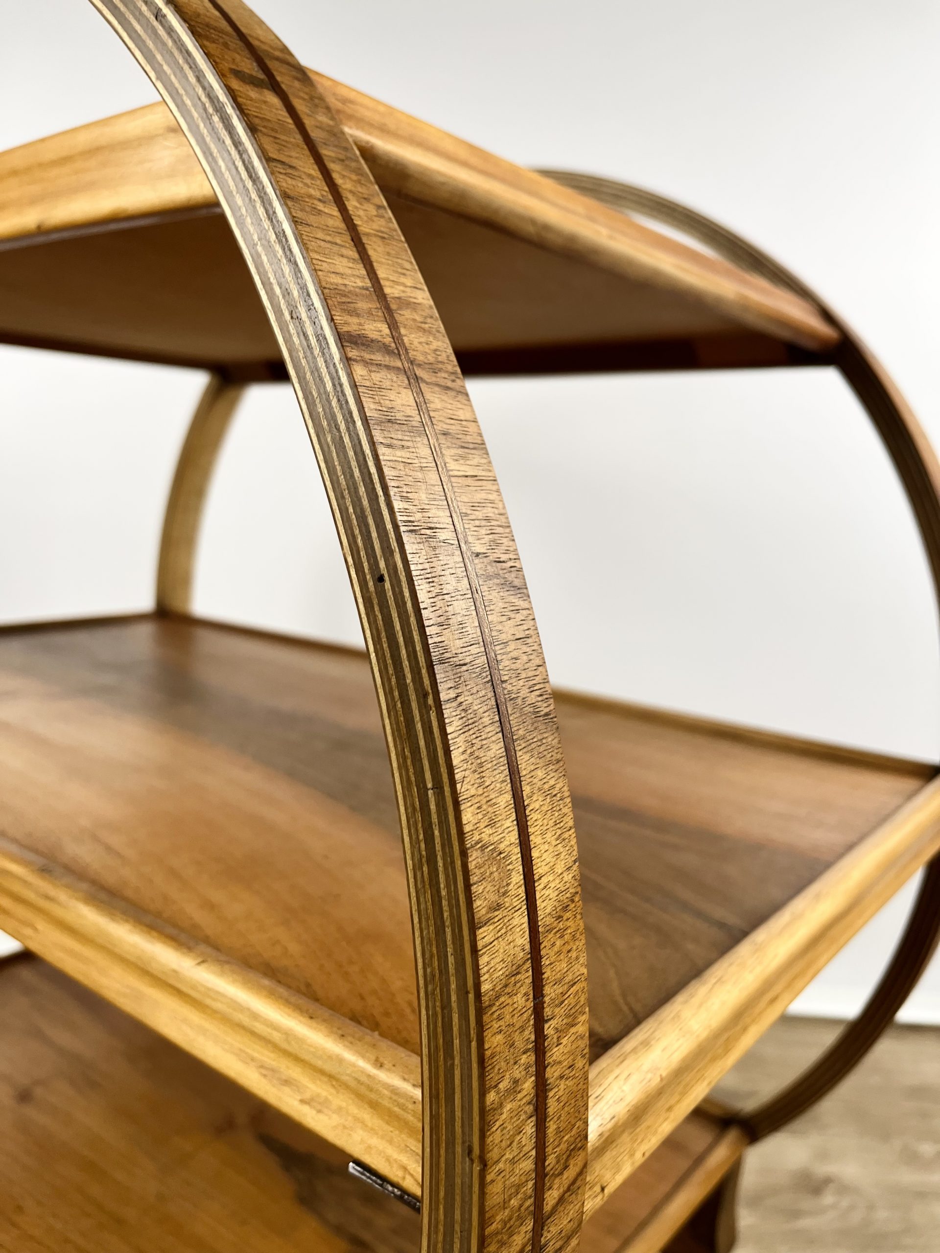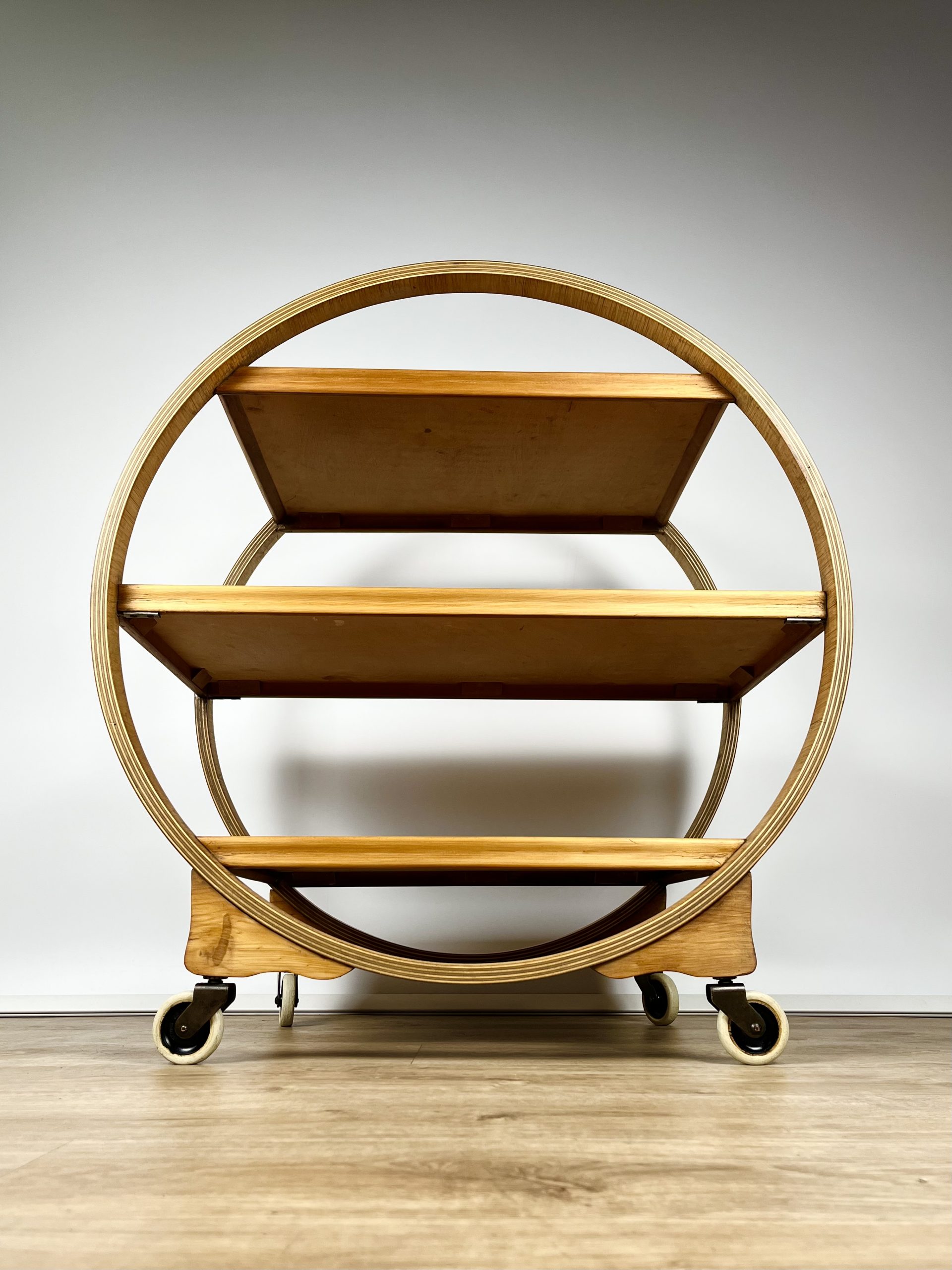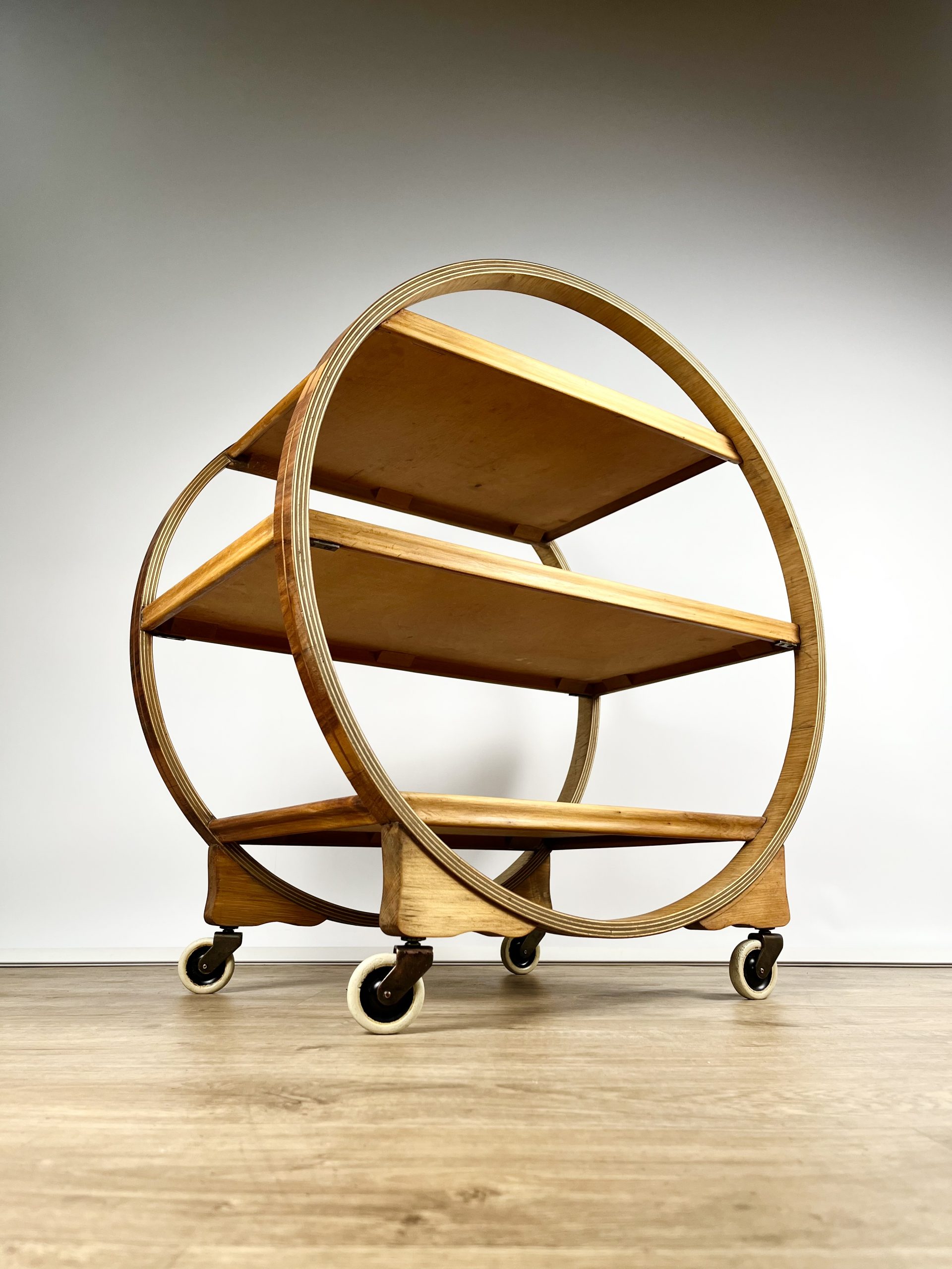Produced in England during the 1930s, this classic 3-tier Art Deco serving trolley is constructed from walnut veneered ply, and cuts a mean silhouette with that circular, geometric form!