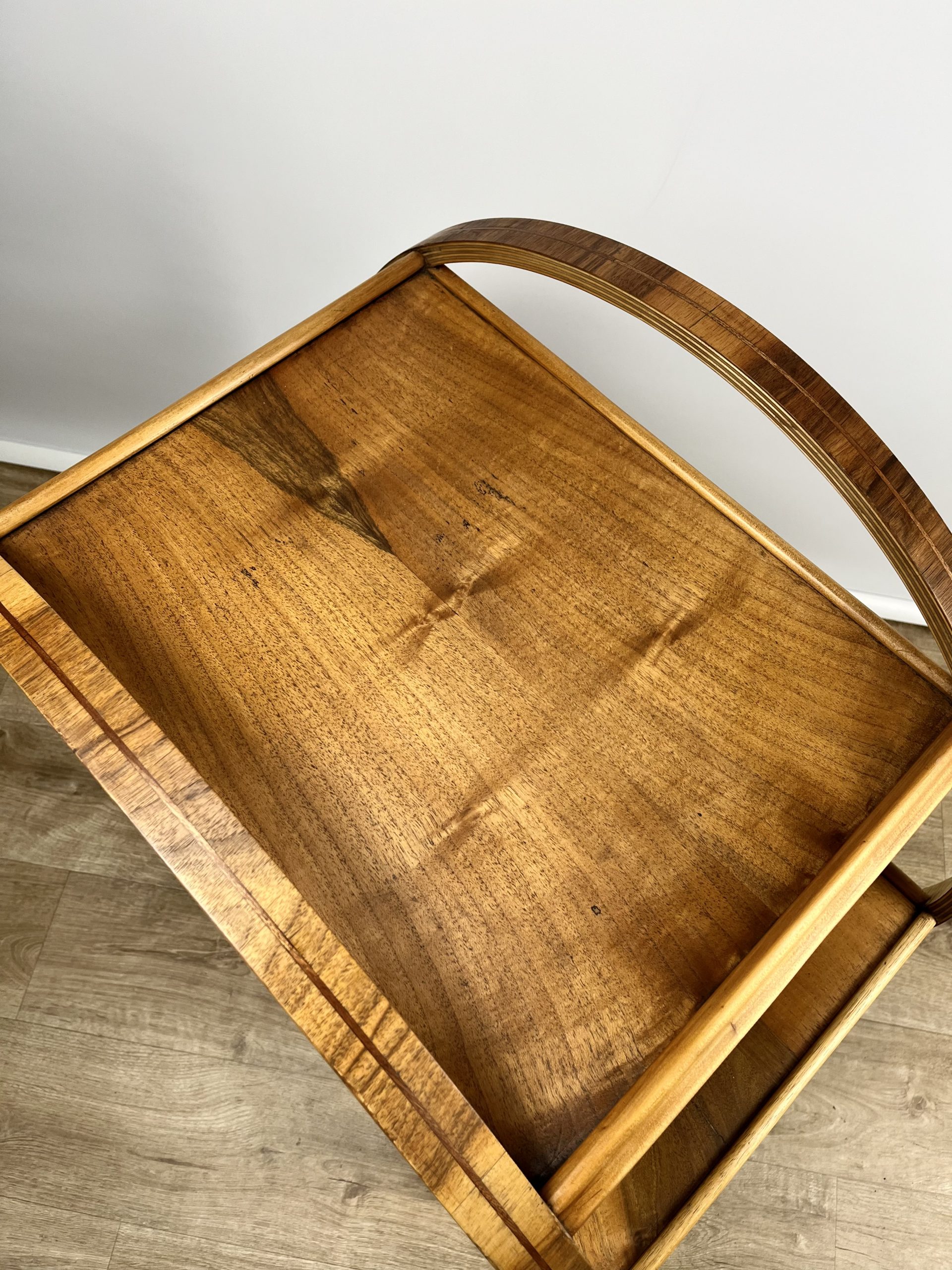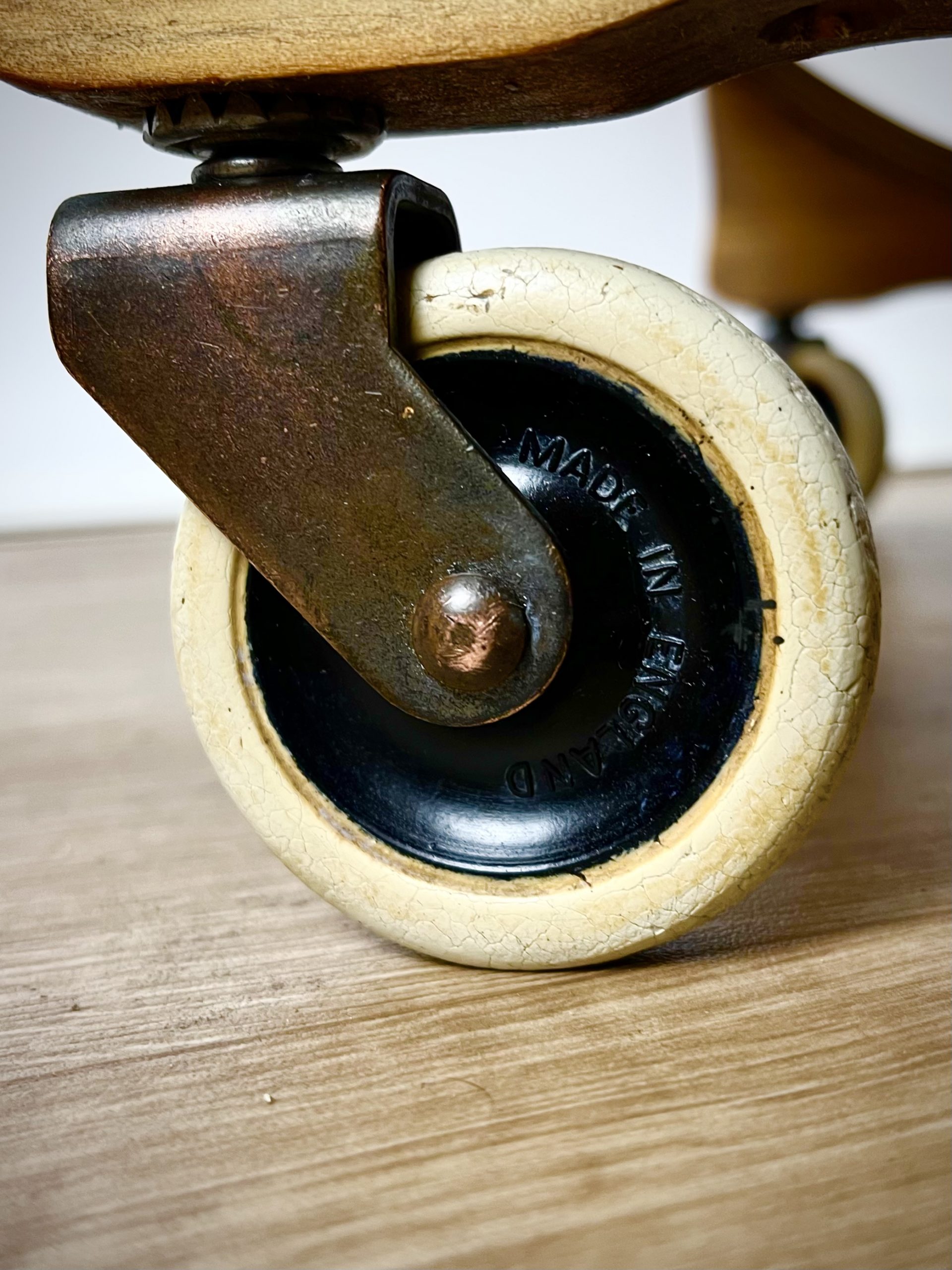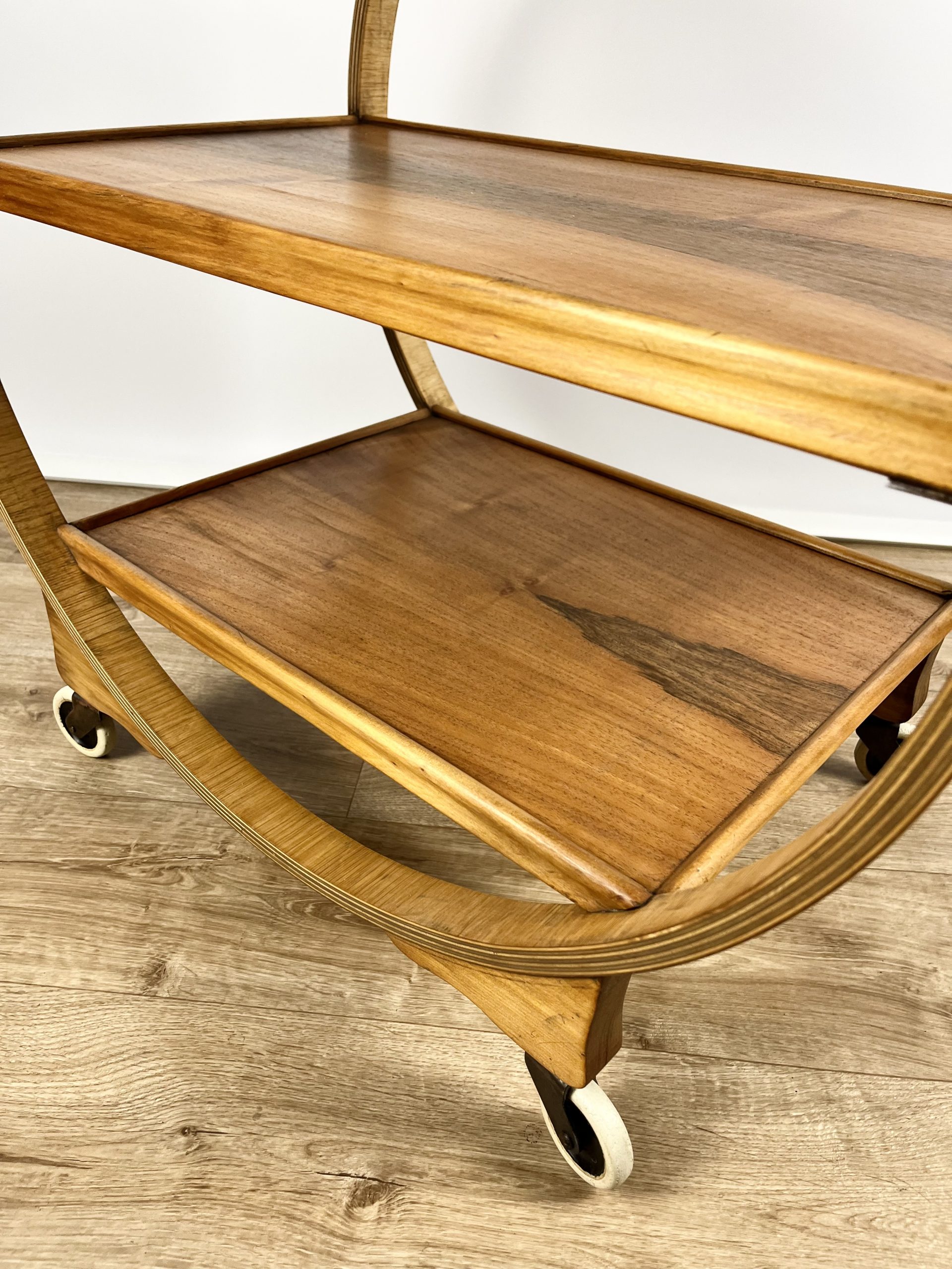 An exposed plywood frame with beautifully figured walnut and a contrasting teak inlay round its circumference. The four original wheels are embossed ‘Made in England’ on each side.