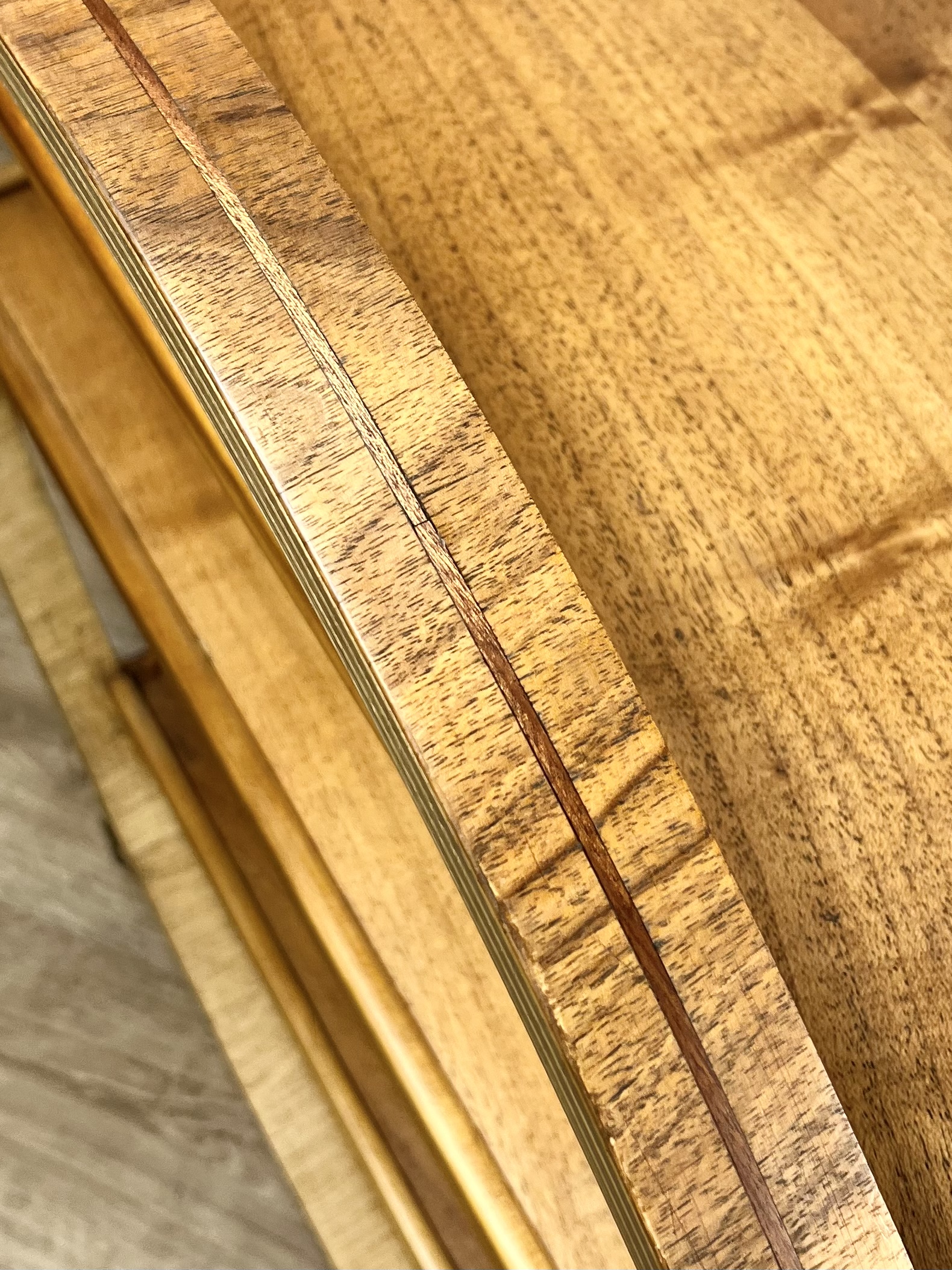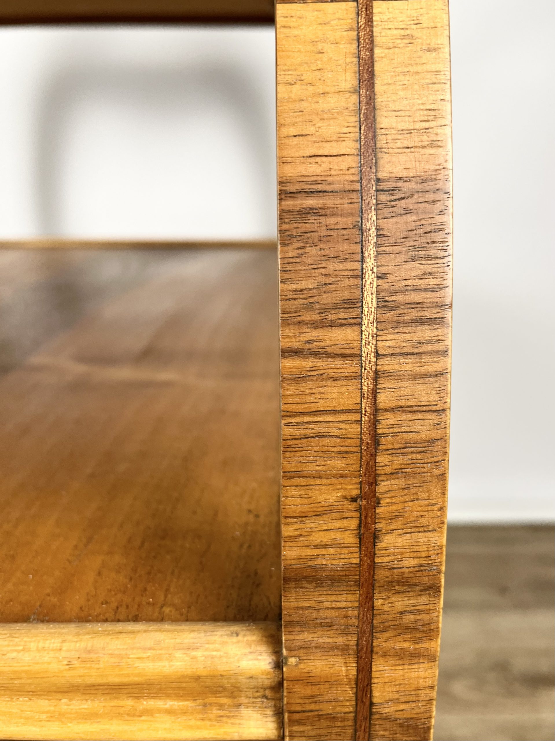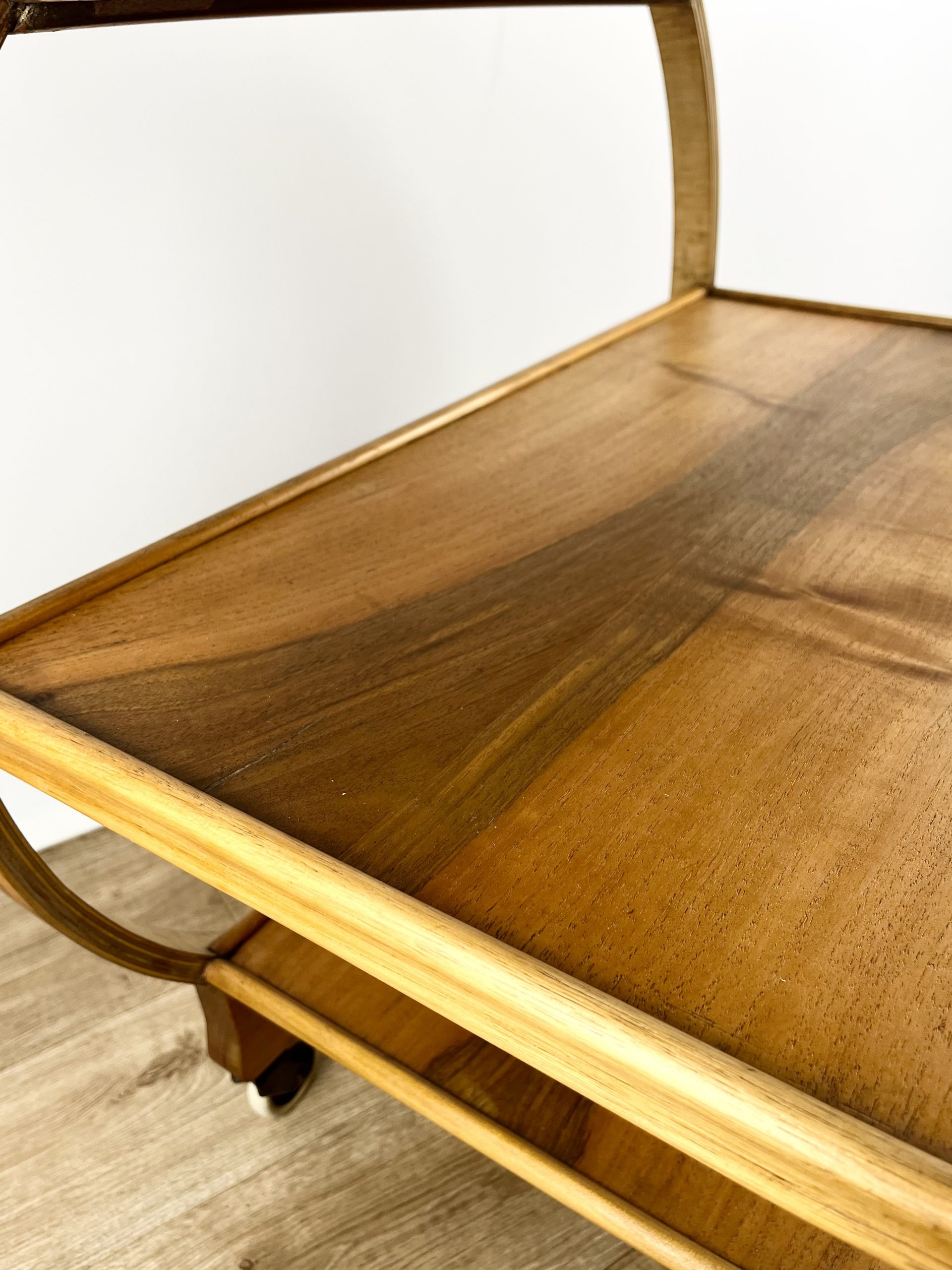 An exposed plywood frame with beautifully figured walnut and a contrasting teak inlay round its circumference. The four original wheels are embossed ‘Made in England’ on each side.