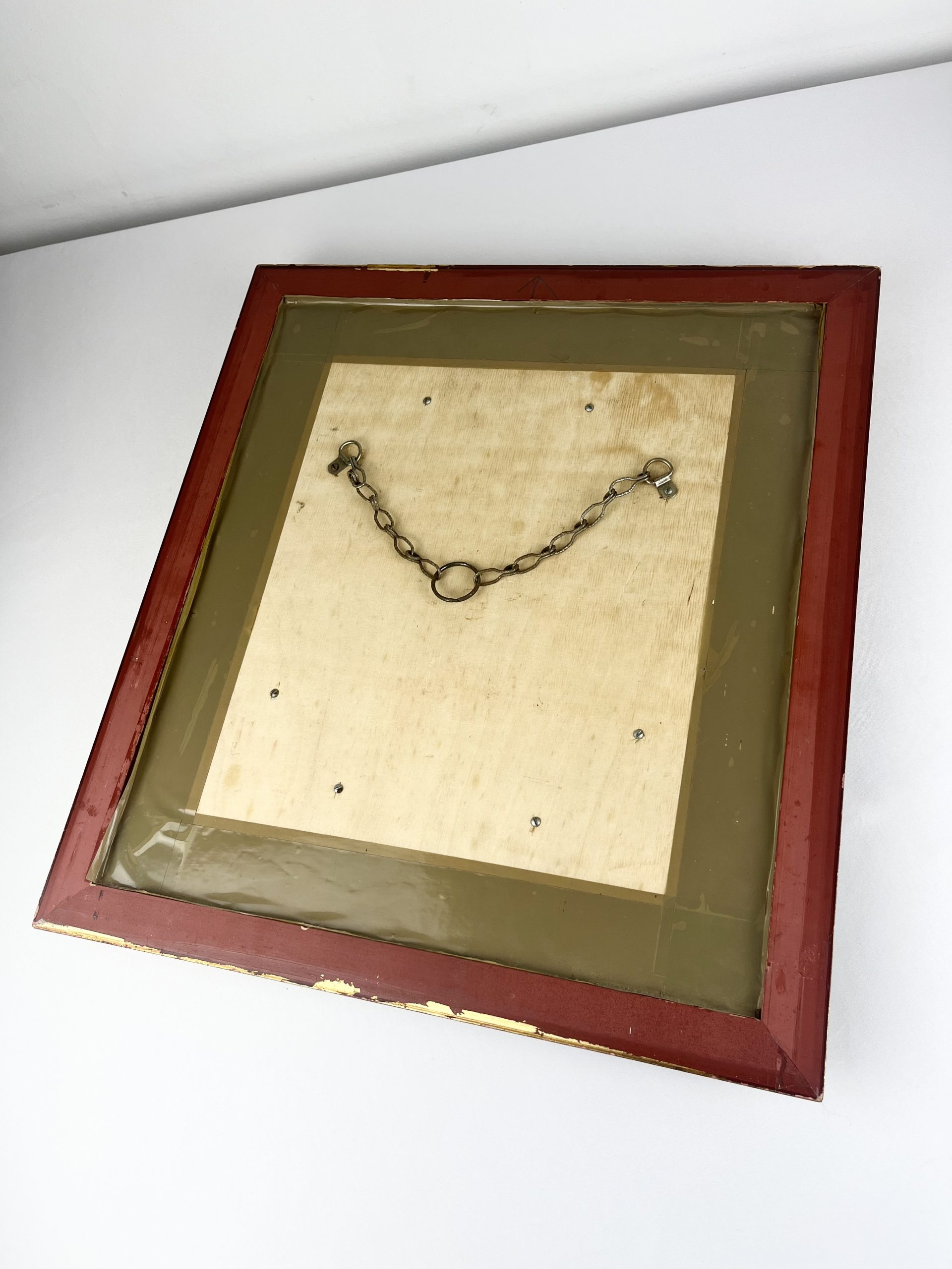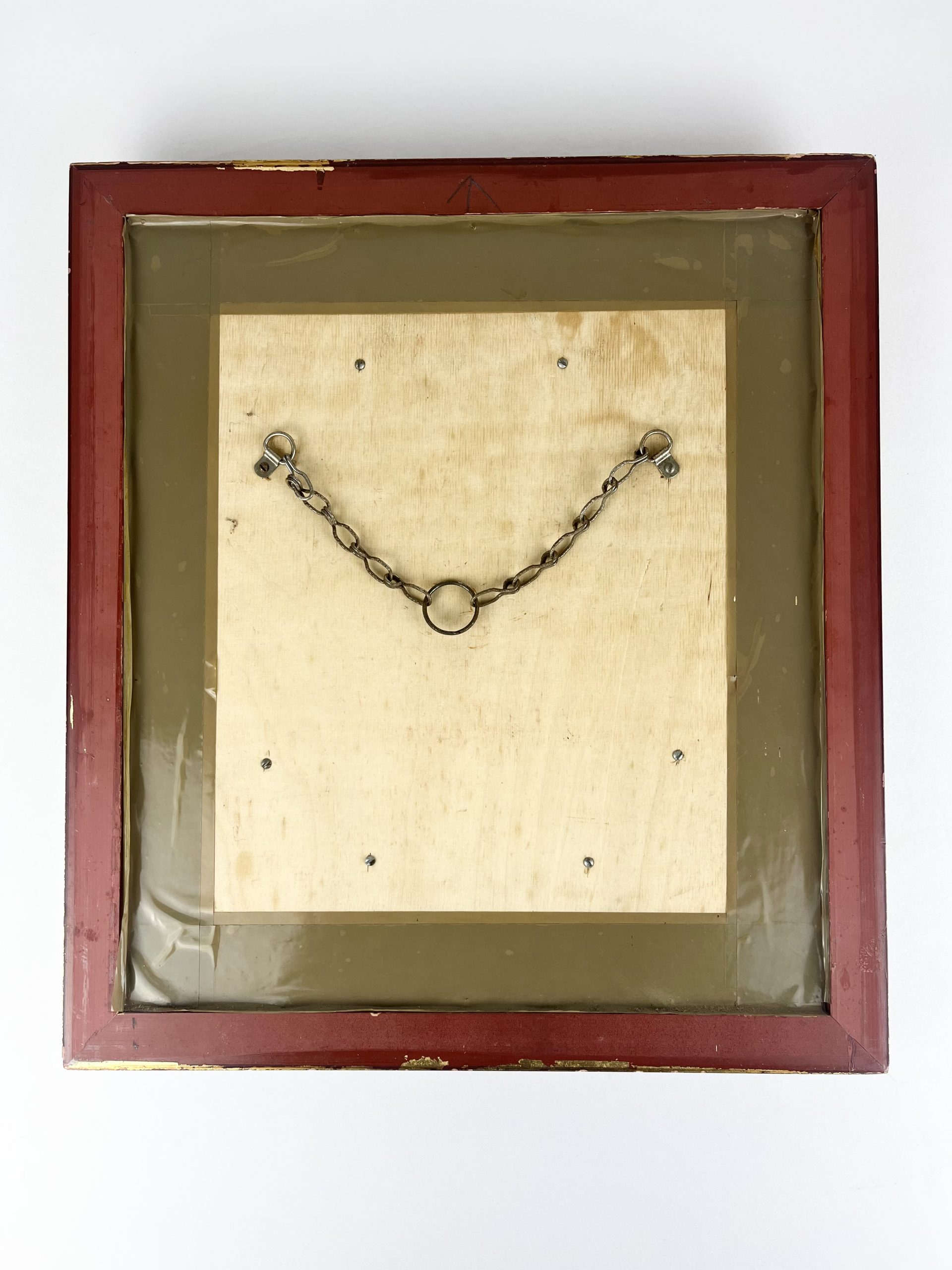 The frame’s design looks to have been achieved by layering different coloured paints before etching out this beautiful gold, Islamic inspired motif.