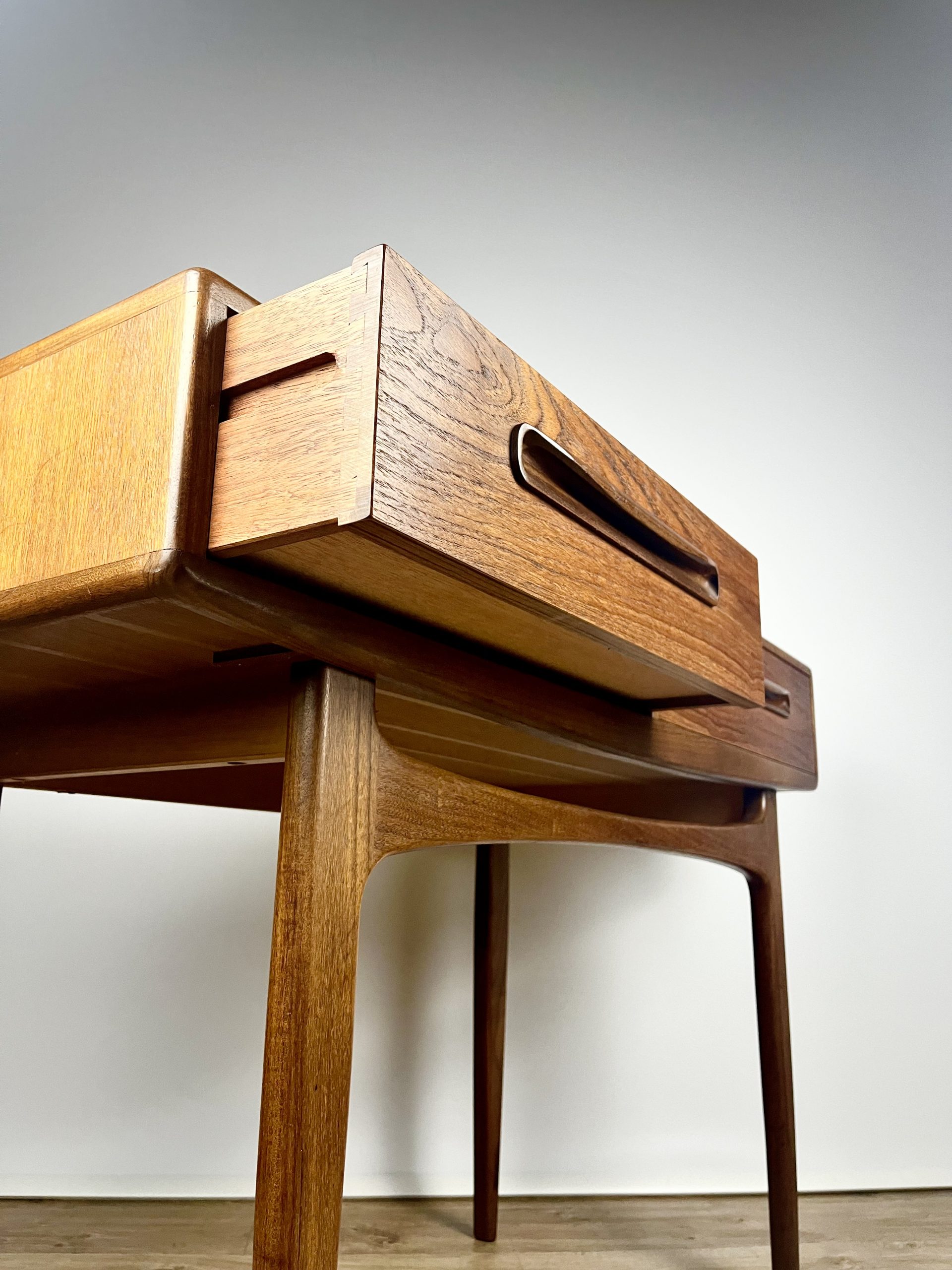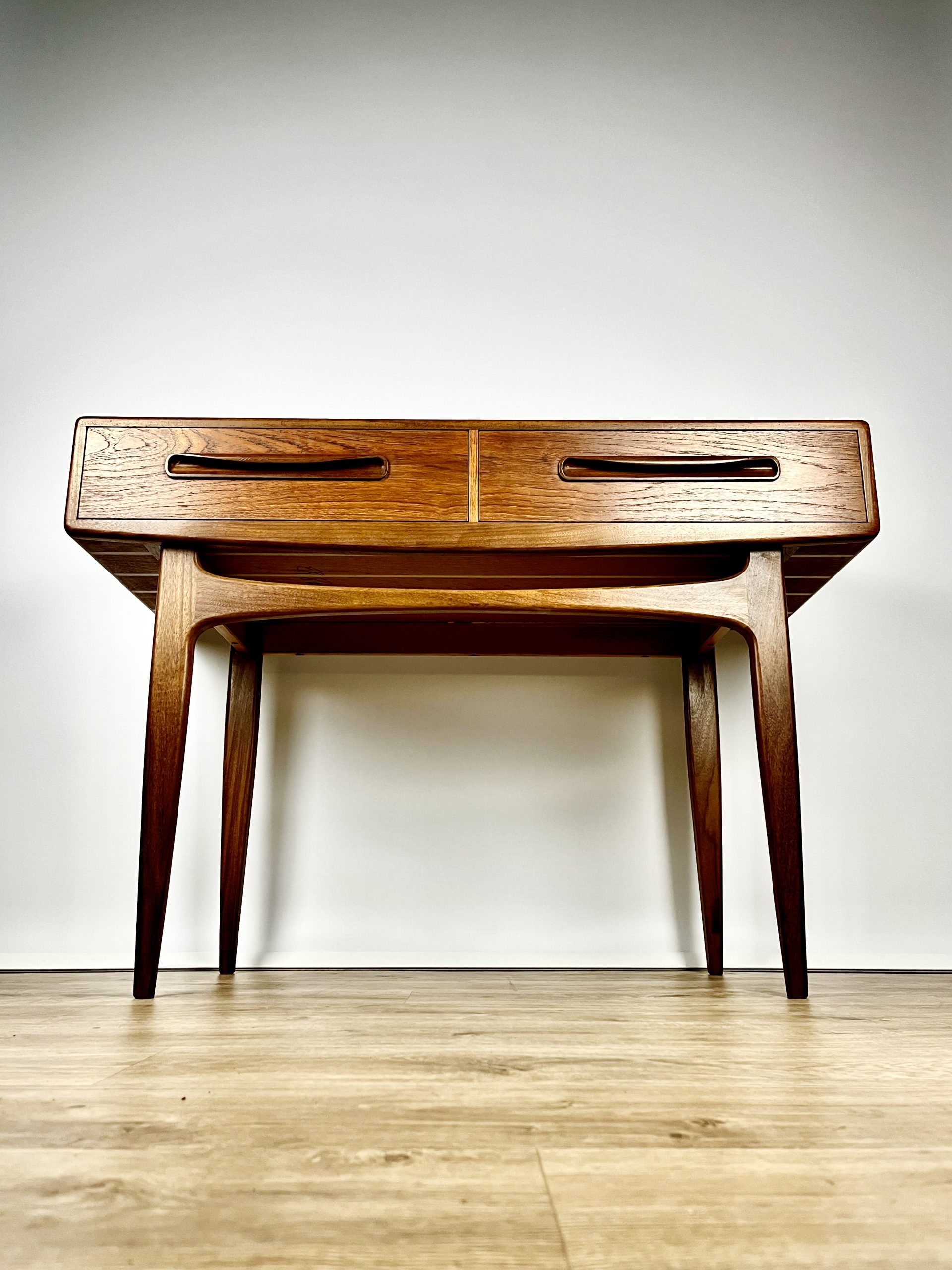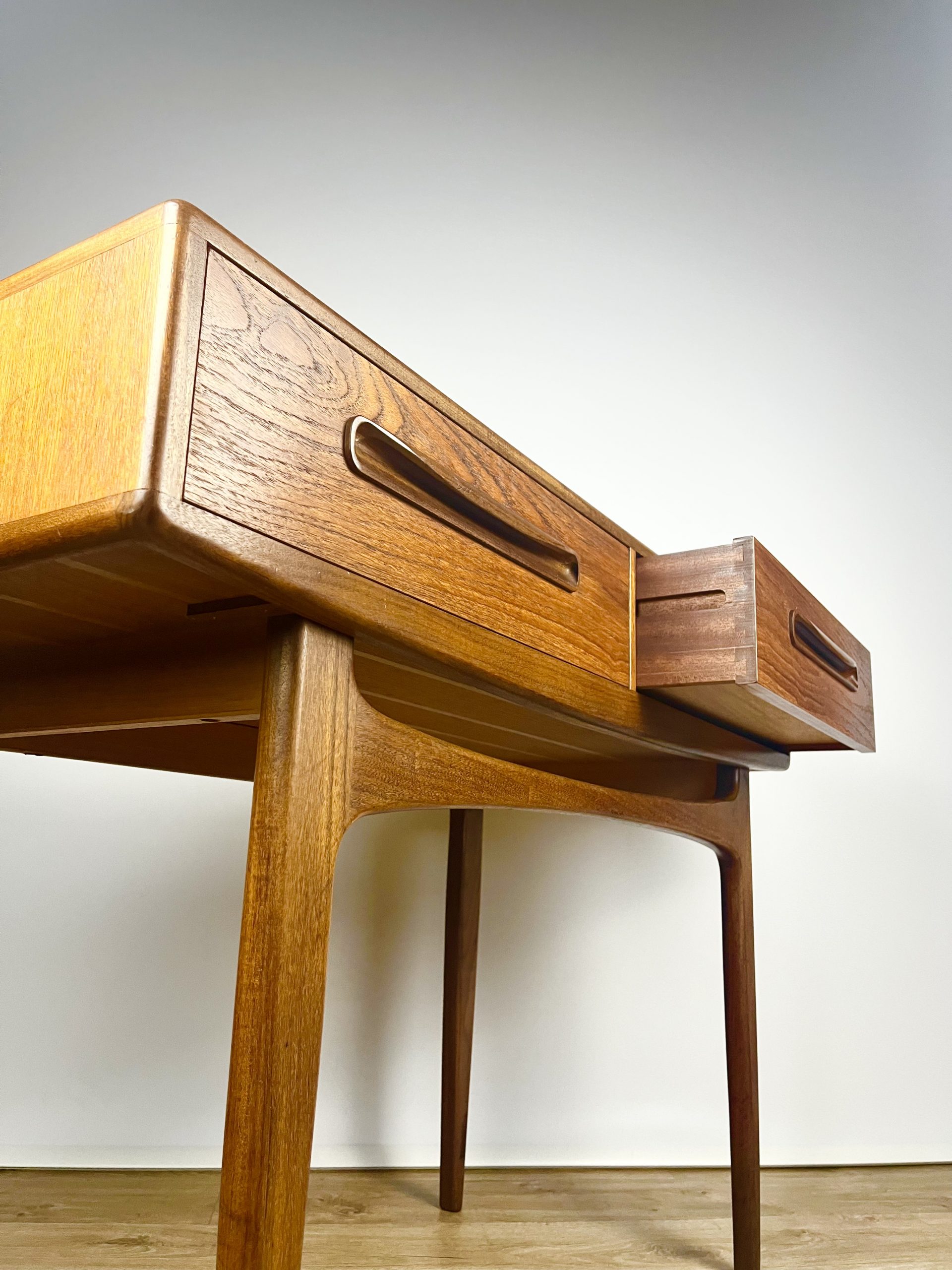 A teak veneered carcass houses two large dovetail-jointed drawers, and is raised on a slender, dark Afromosia frame and legs.