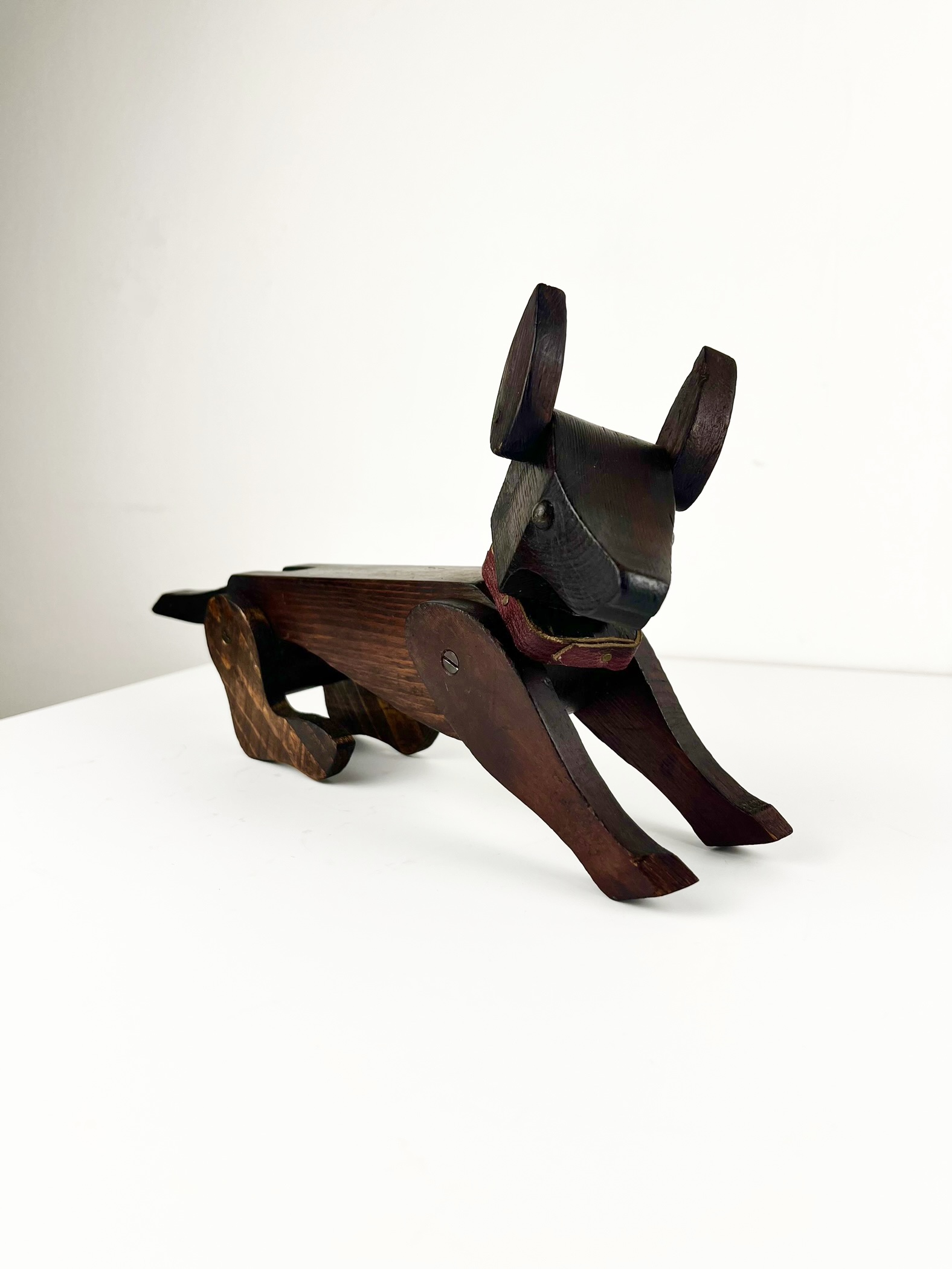 Lovingly crafted from stained pine with metal stud eyes and a red leather collar, this charming example may be as early as Edwardian and is certainty pre-1950s.
