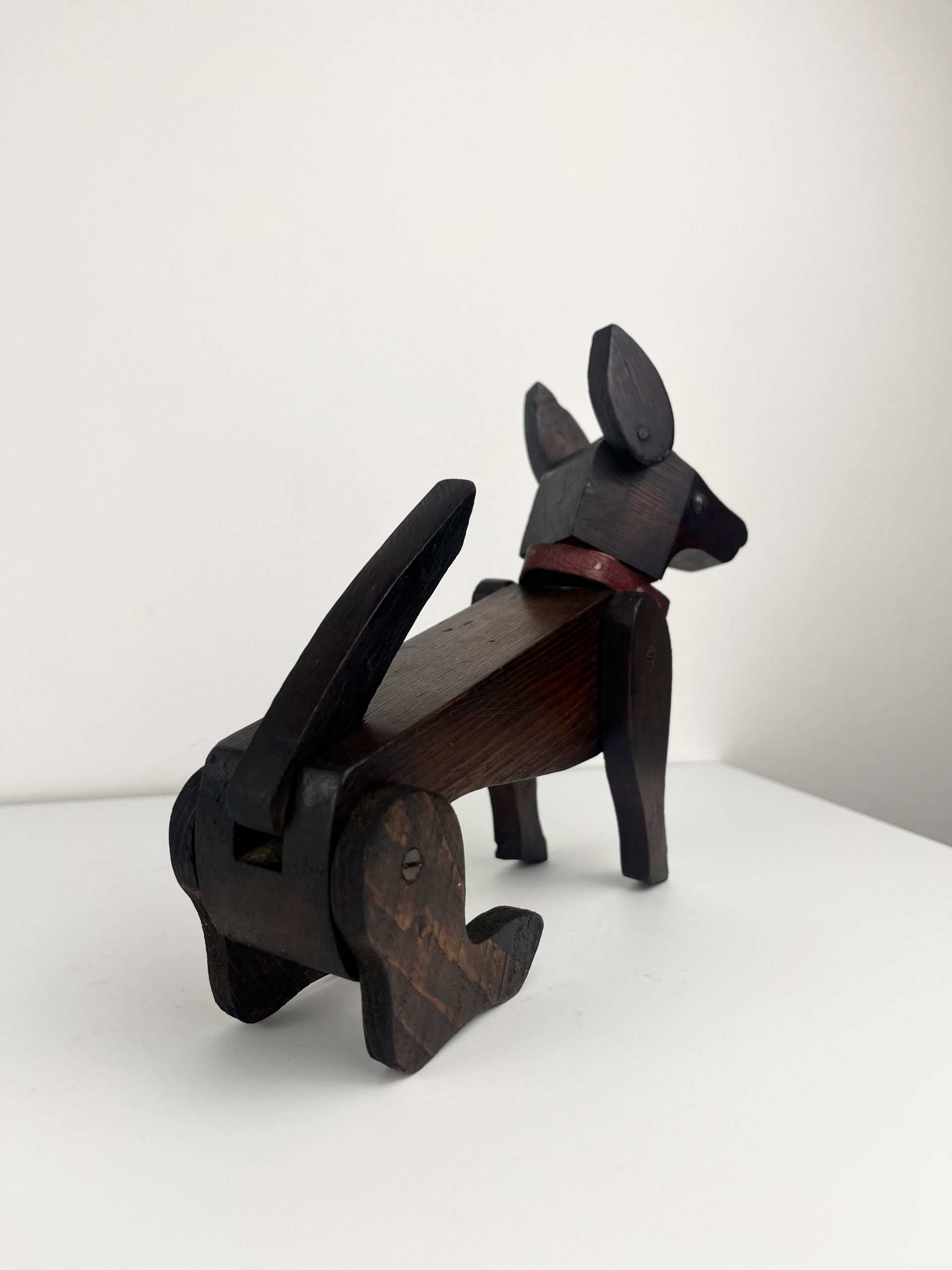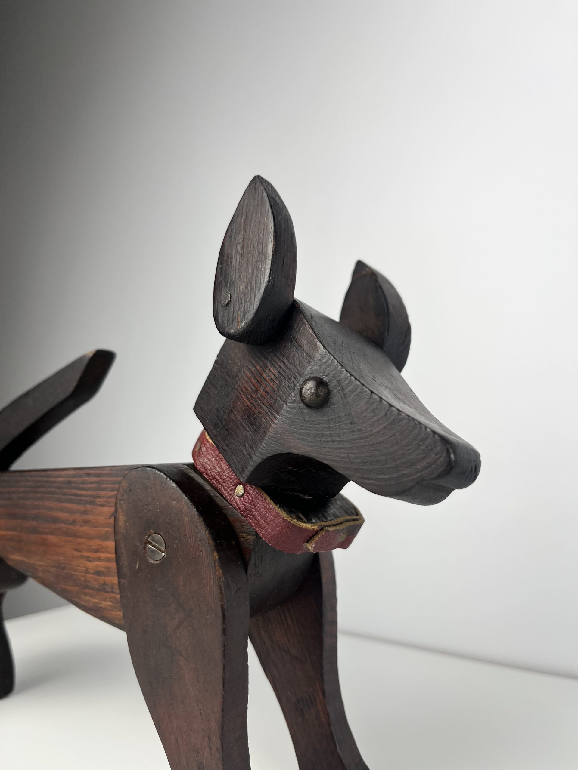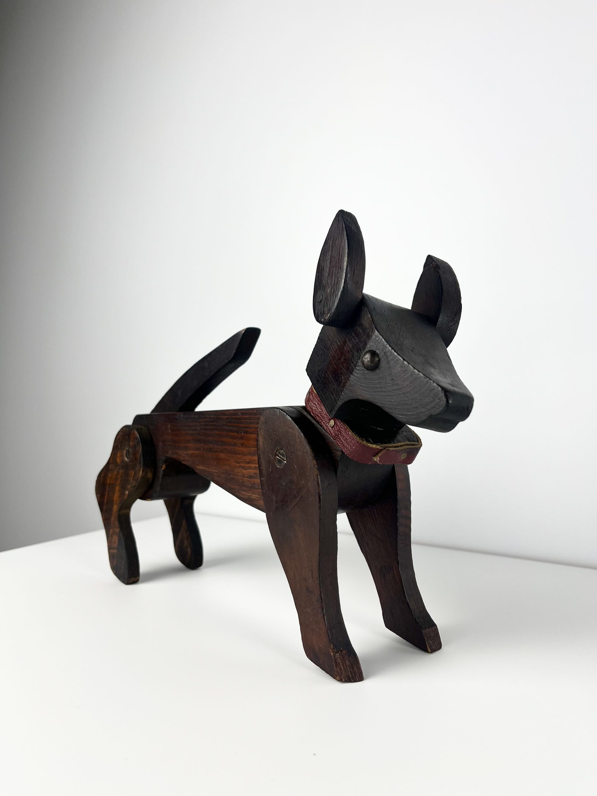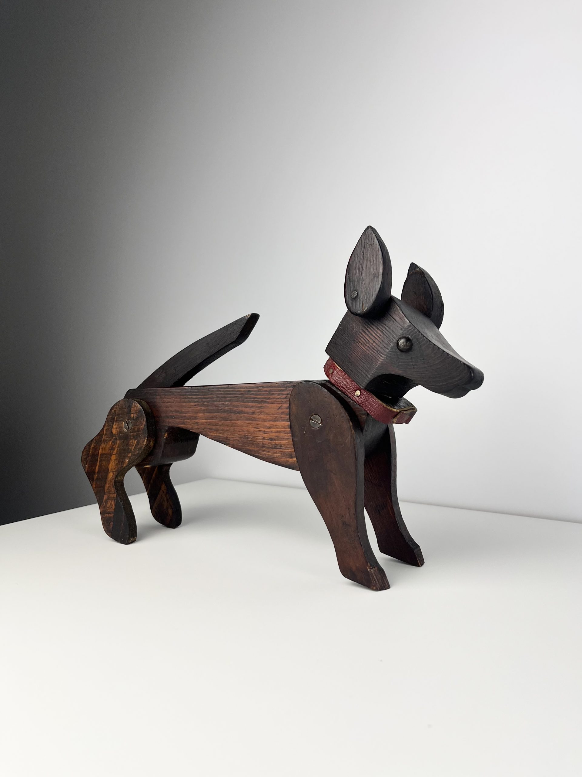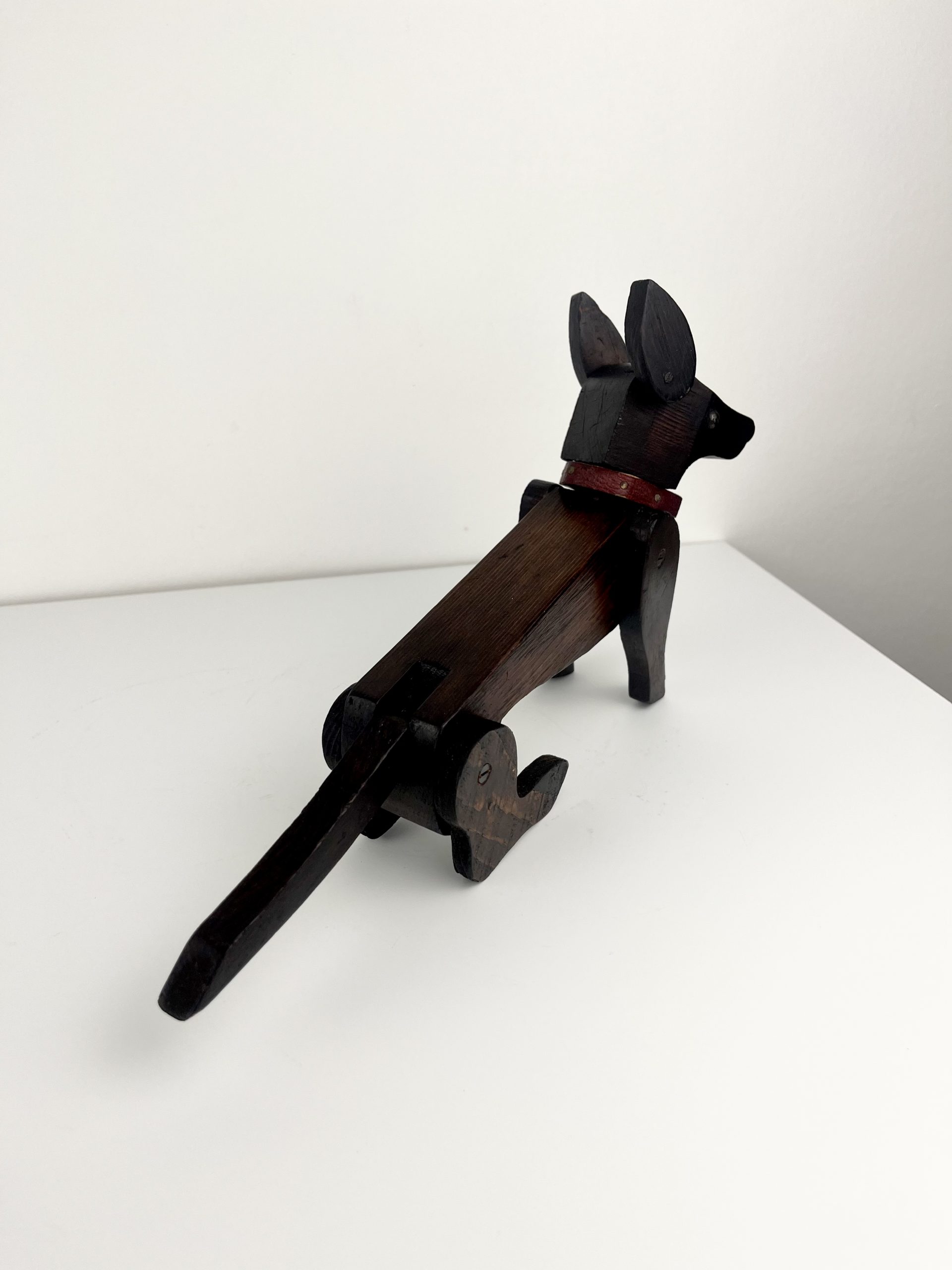 These scratch-built wooden dogs were produced as home projects throughout the 19th and early 20th centuries, and can be found in a variety of different styles. They are now highly collectible and considered little works of folk art.
