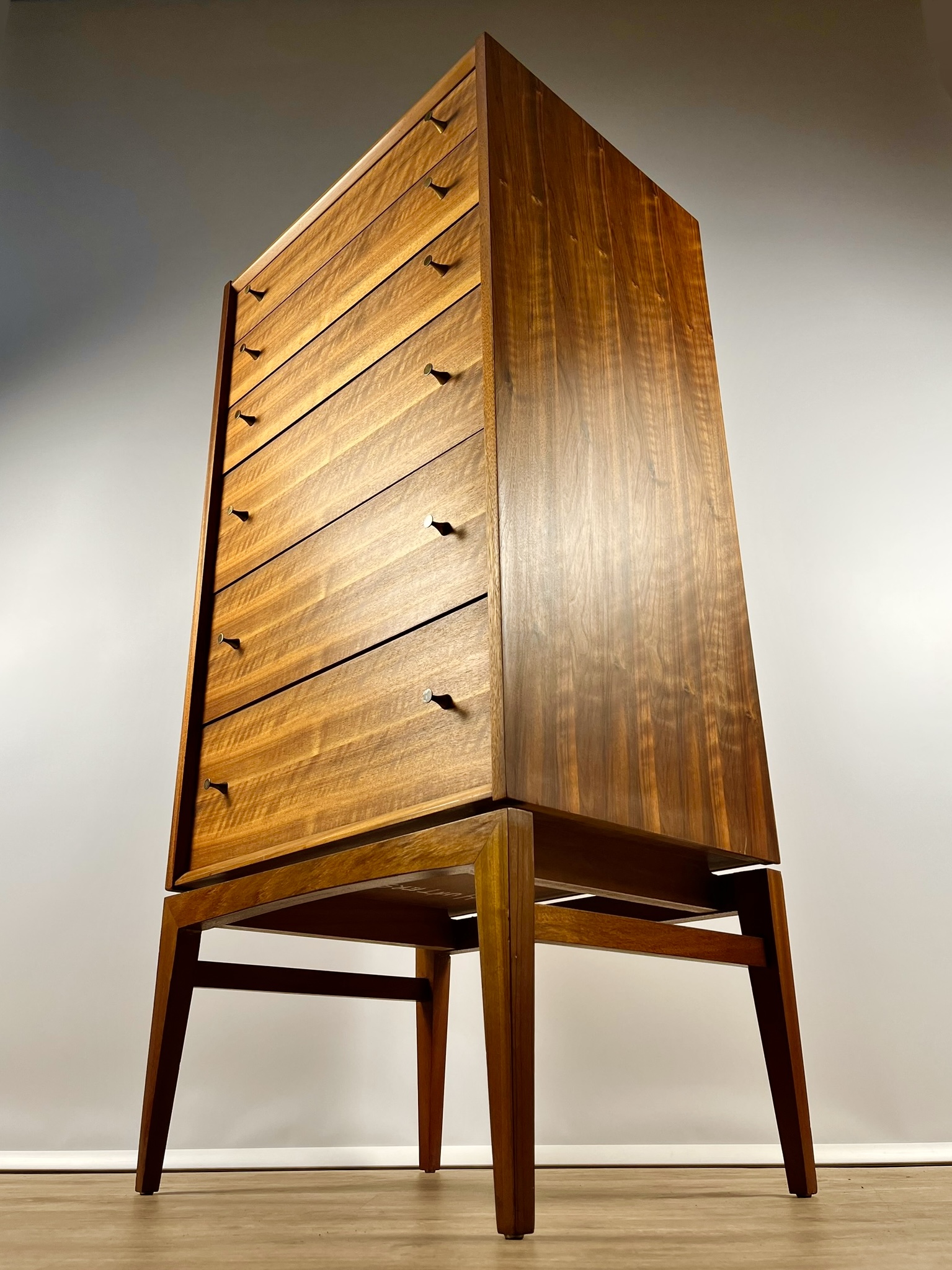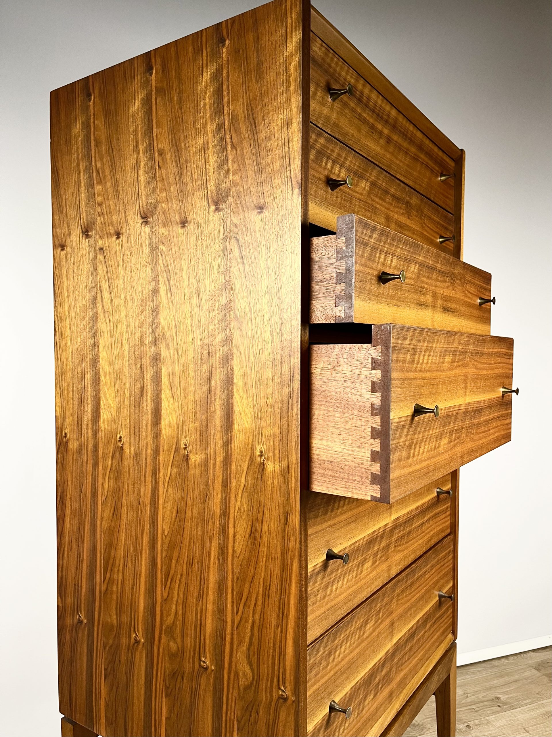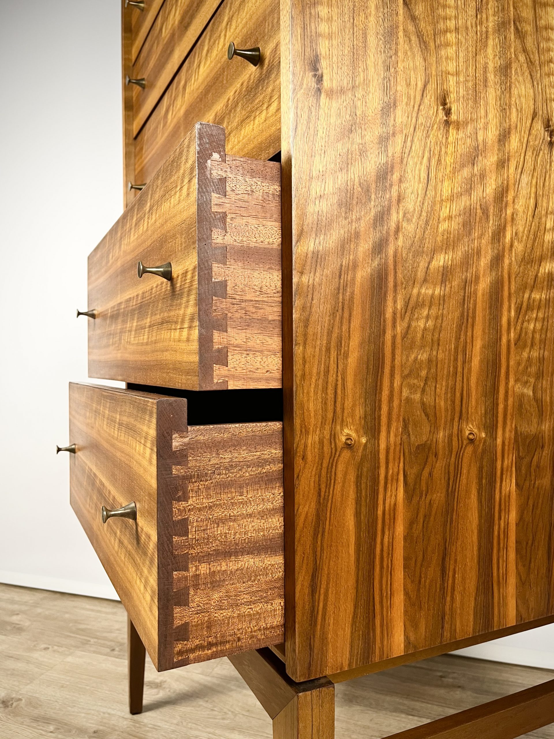 Veneered in high quality French walnut, it features six dovetail-jointed drawers with elegant turned brass drawer pulls, and floats on slender, ultra stylish legs!