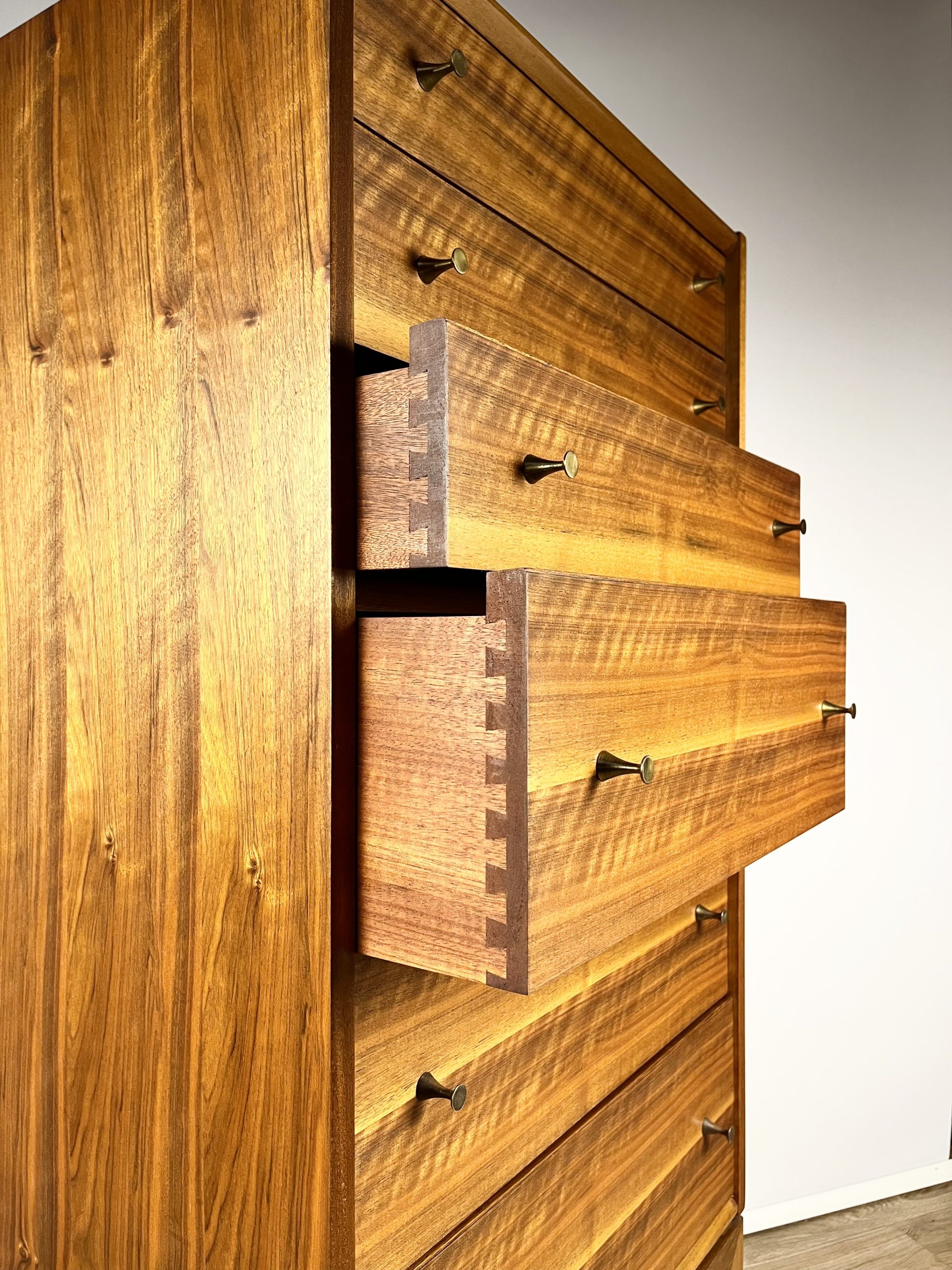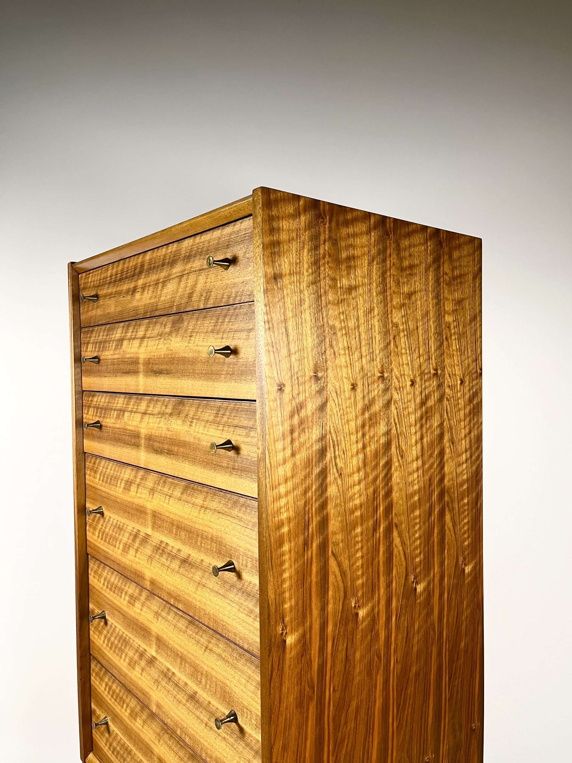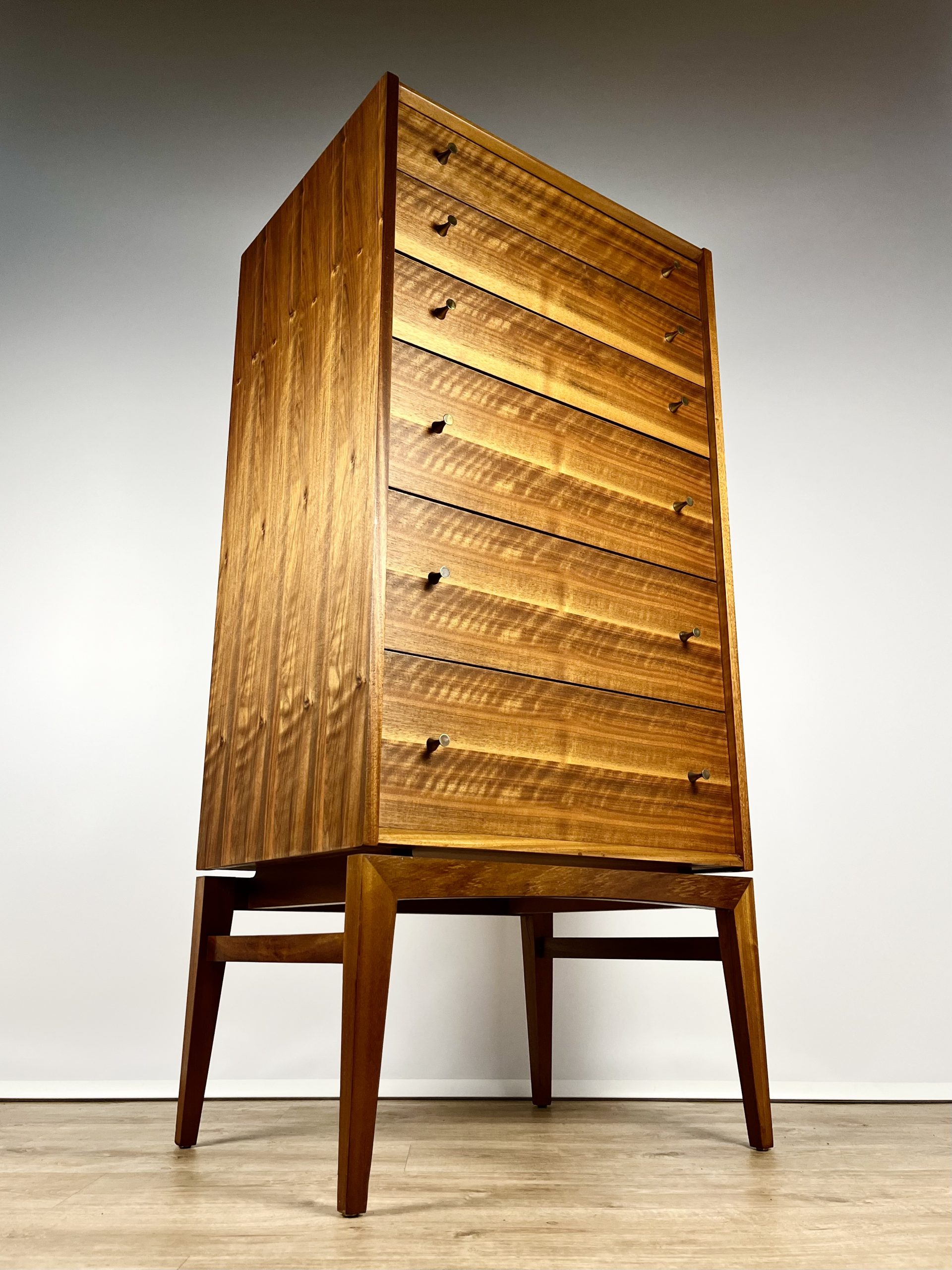 Veneered in high quality French walnut, it features six dovetail-jointed drawers with elegant turned brass drawer pulls, and floats on slender, ultra stylish legs!