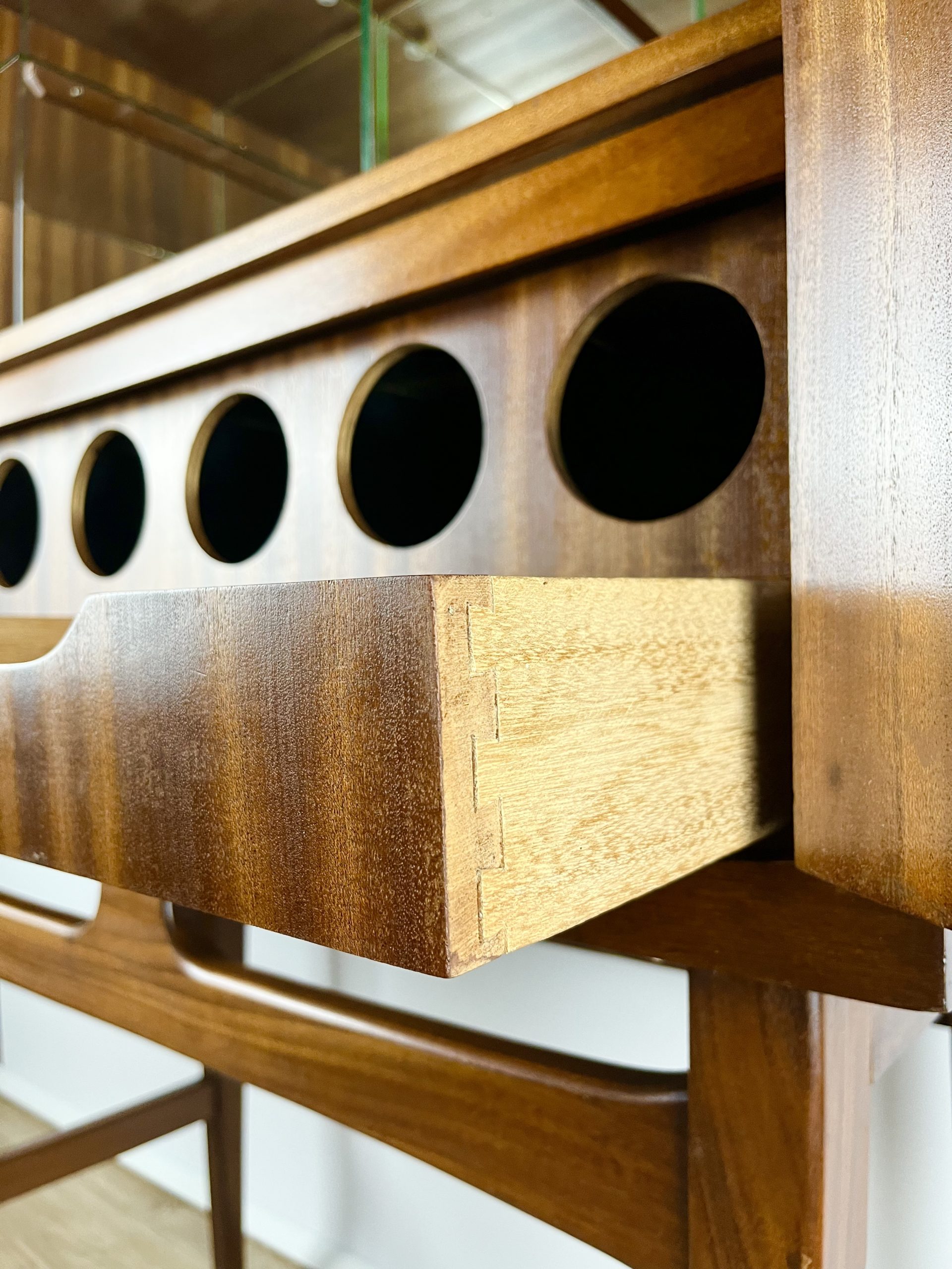 The twin doors open to reveal a matrix of mirrors and glass shelving, two dovetail-jointed drawers, a six-piece bottle rack and even a retractable drinks tray for preparing you favourite tipples!