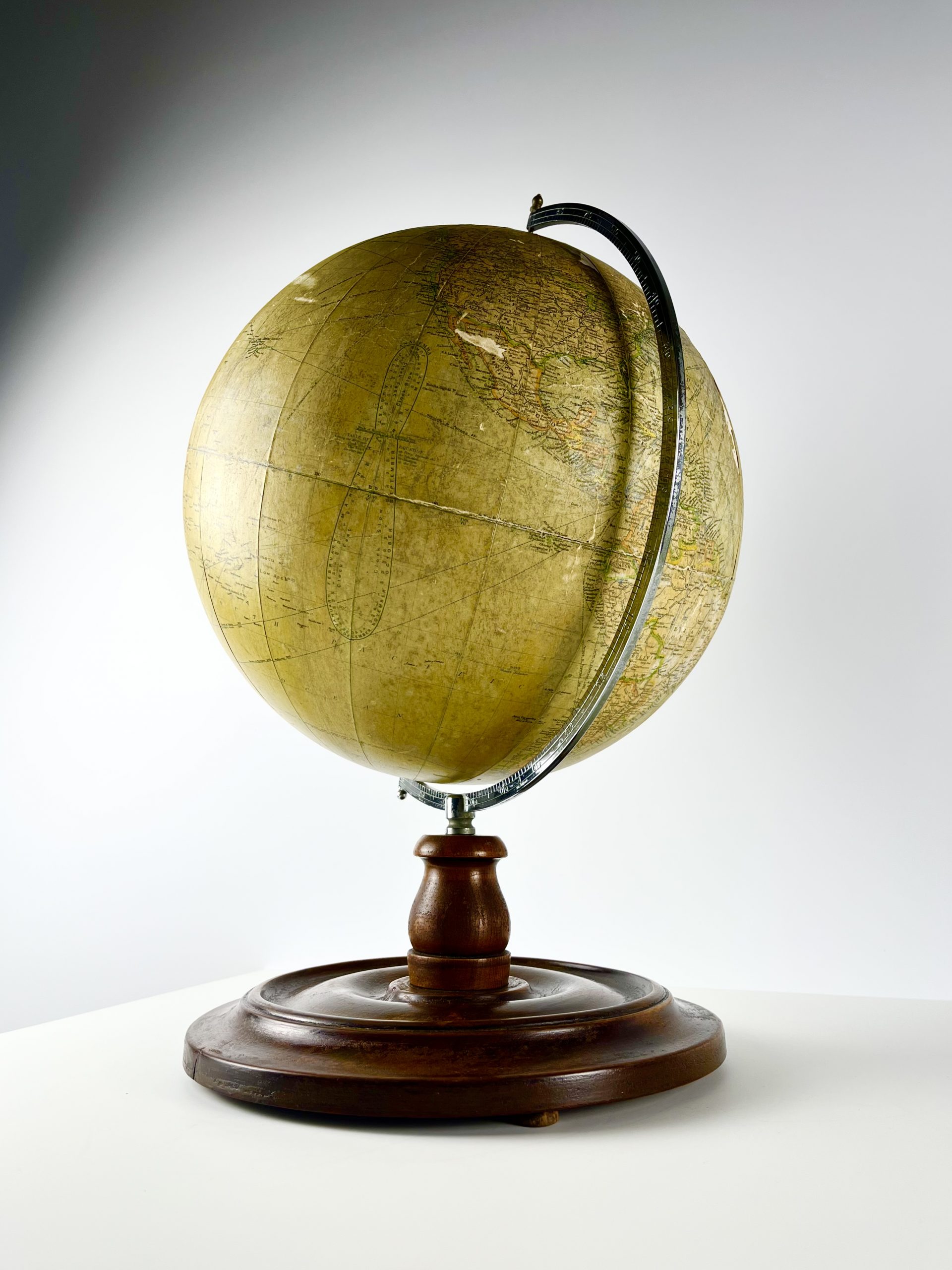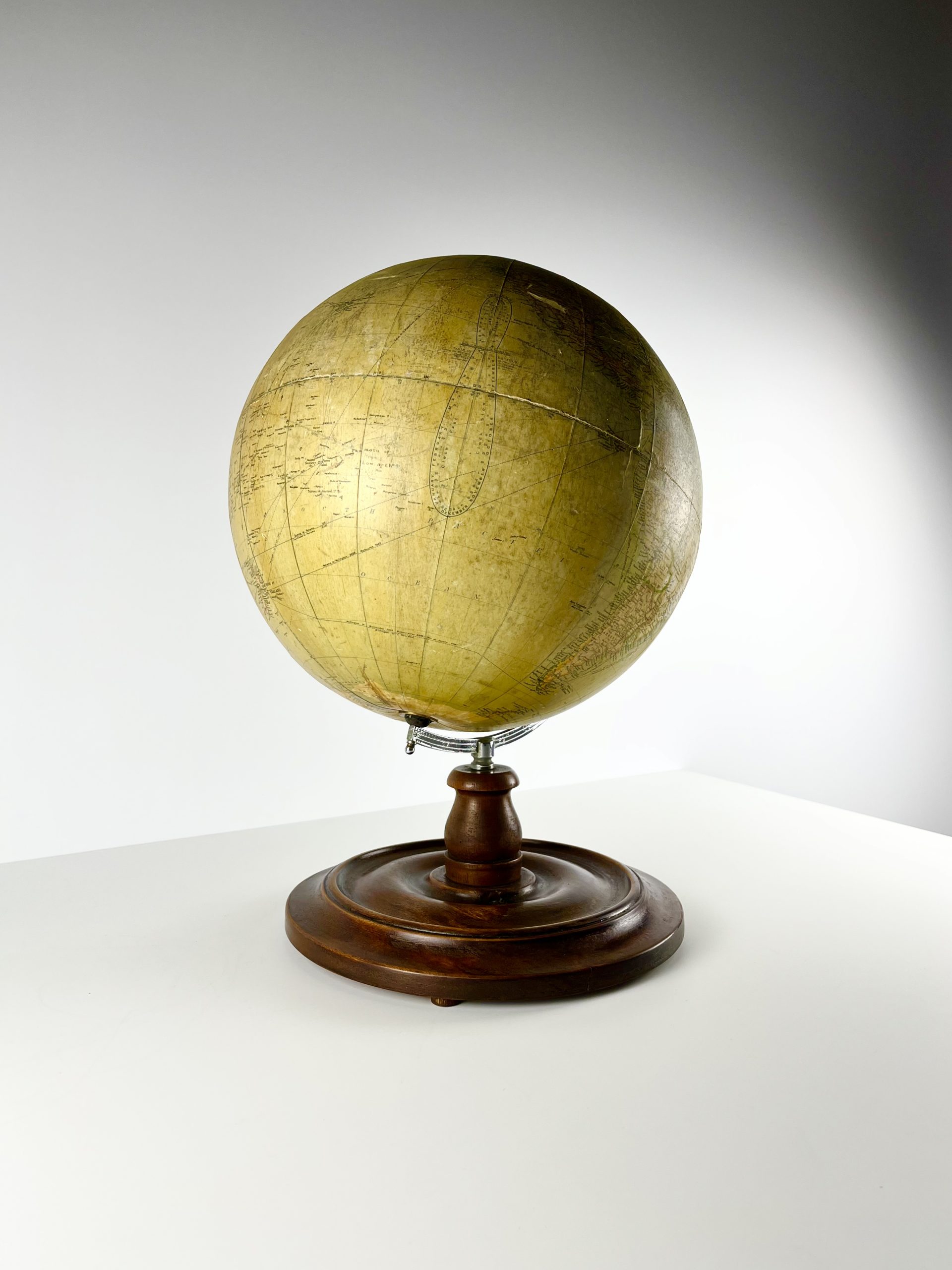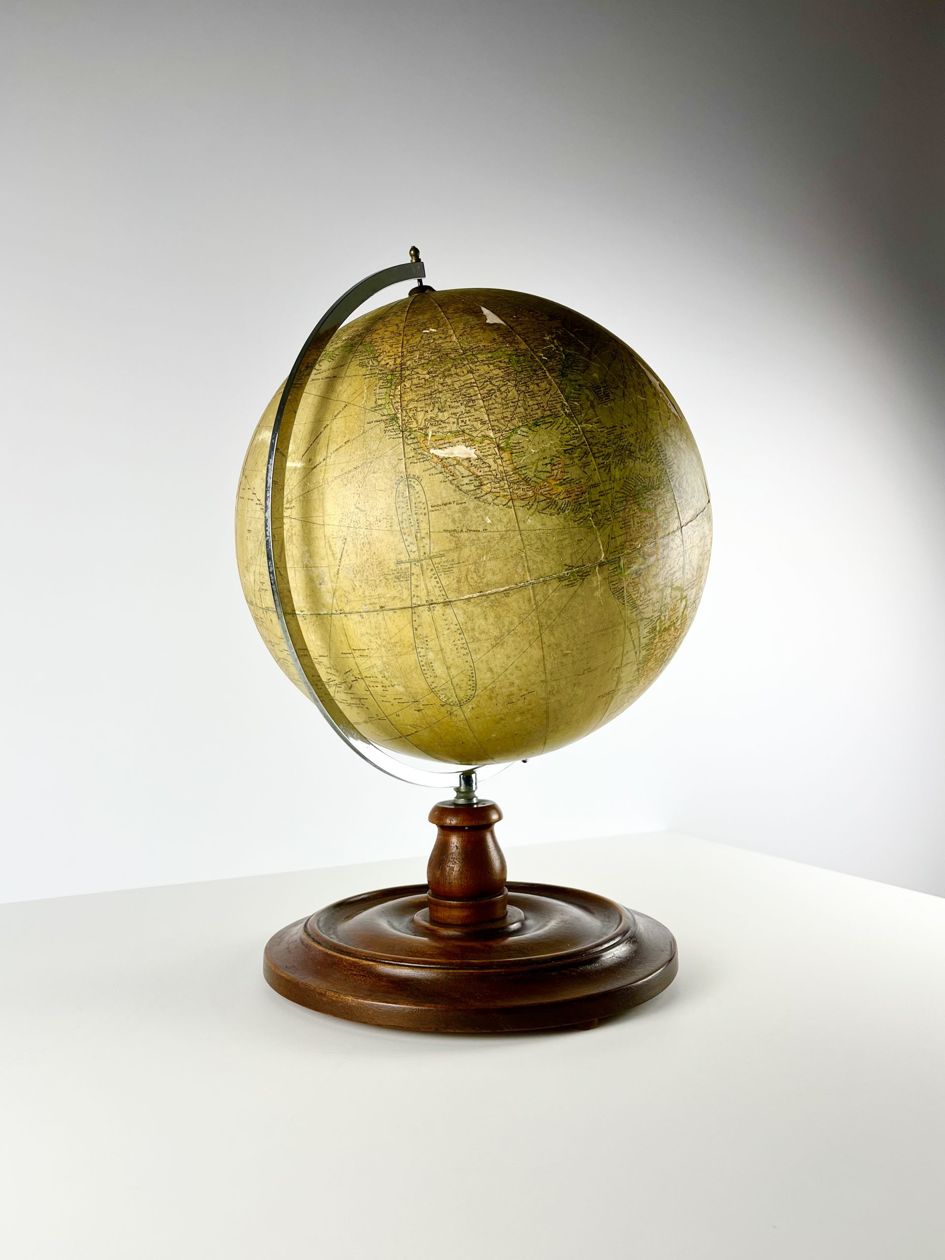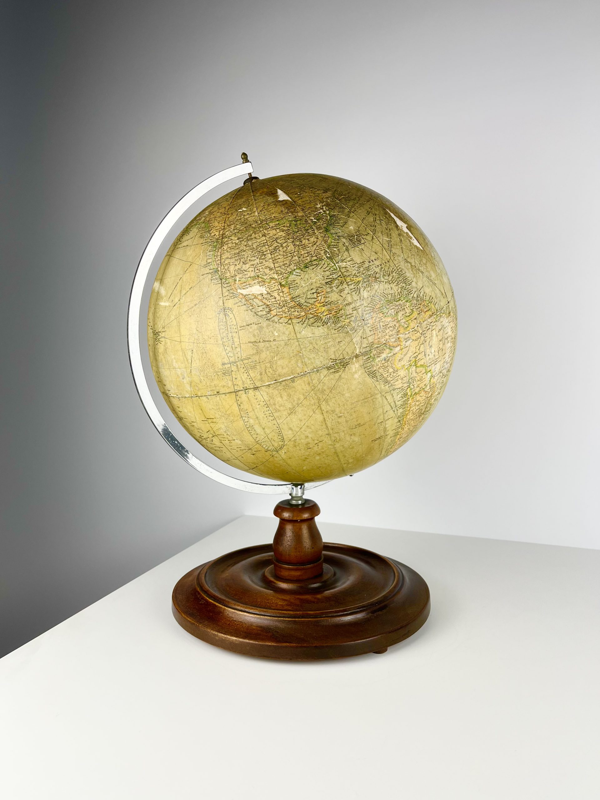 A 12-inch papier-mâché globe spins on a gleeming chrome mount, and stands proudly on a turned mahogany base. Remnants of an original label can still been seen attached to the underside of the base.
