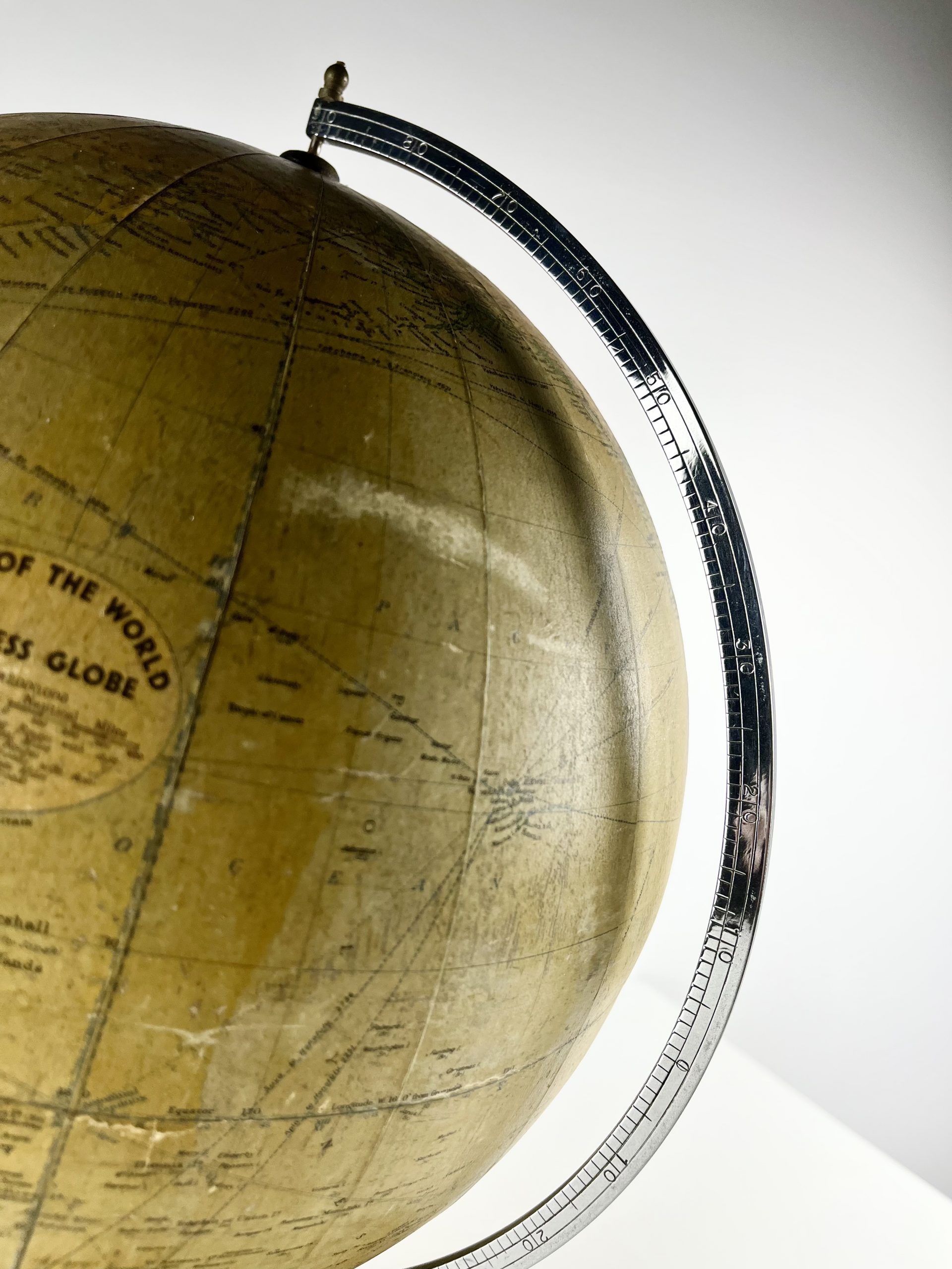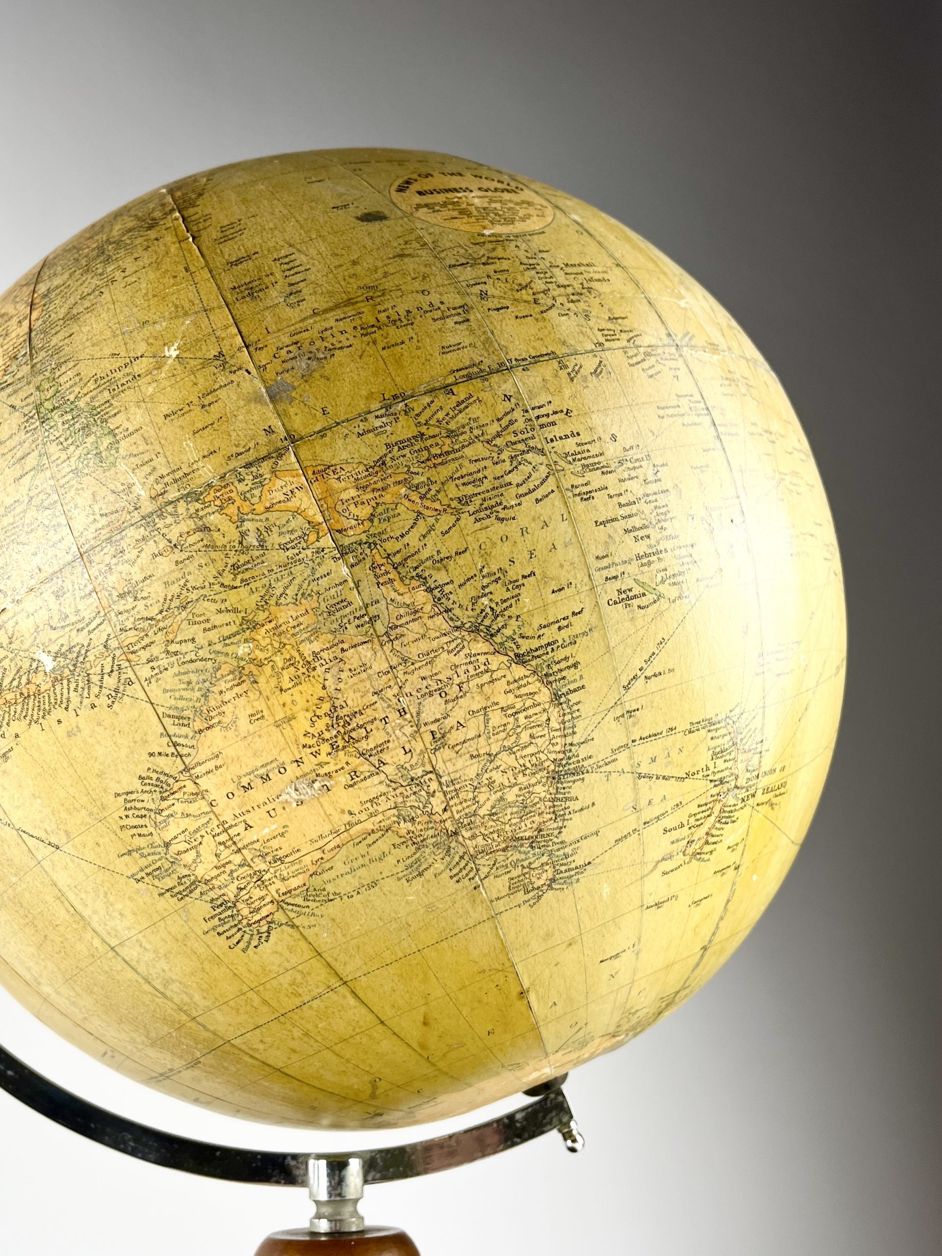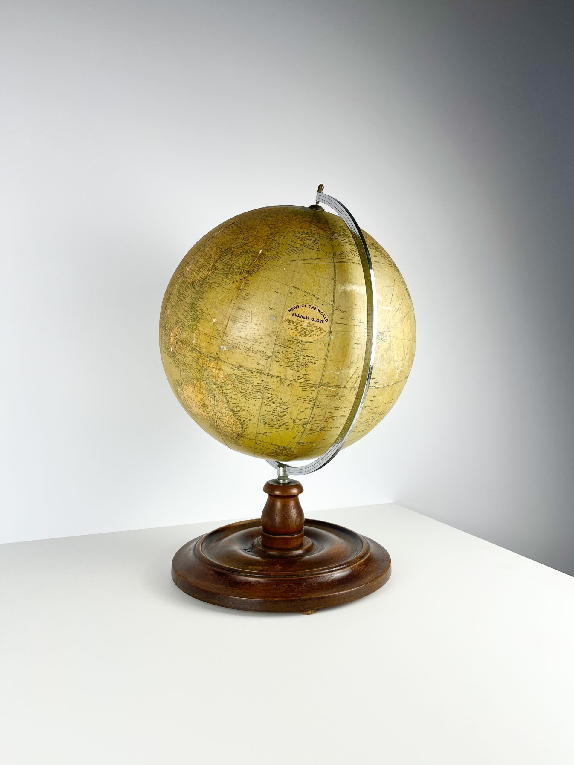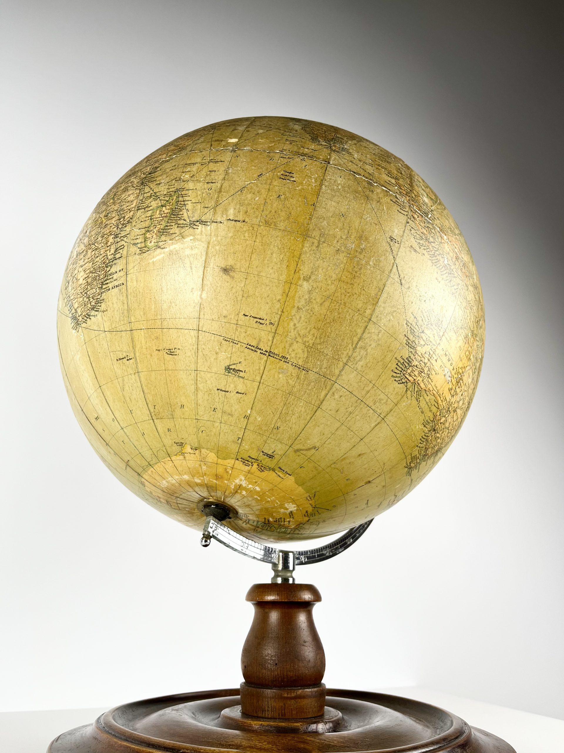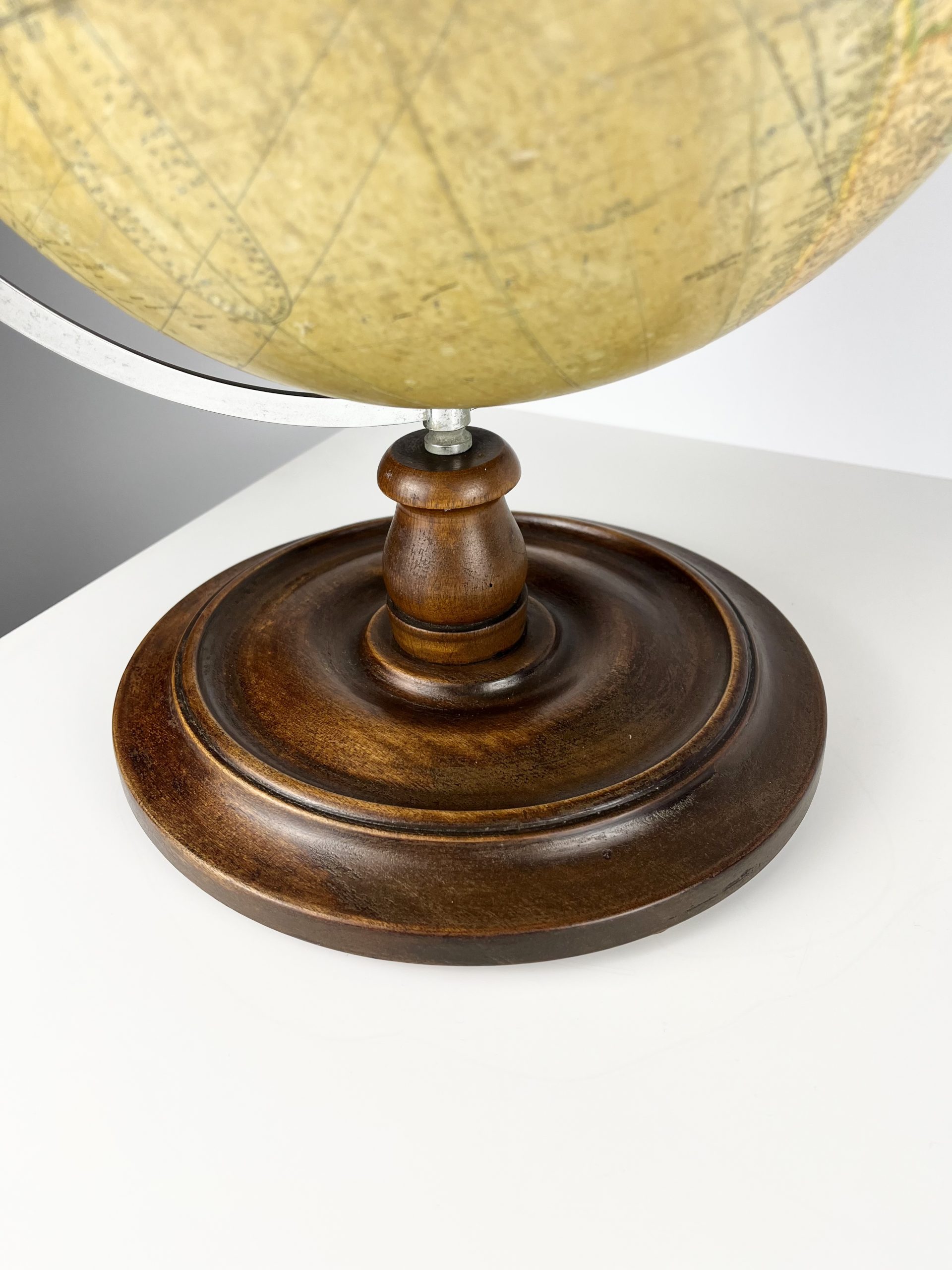 A 12-inch papier-mâché globe spins on a gleeming chrome mount, and stands proudly on a turned mahogany base. Remnants of an original label can still been seen attached to the underside of the base.