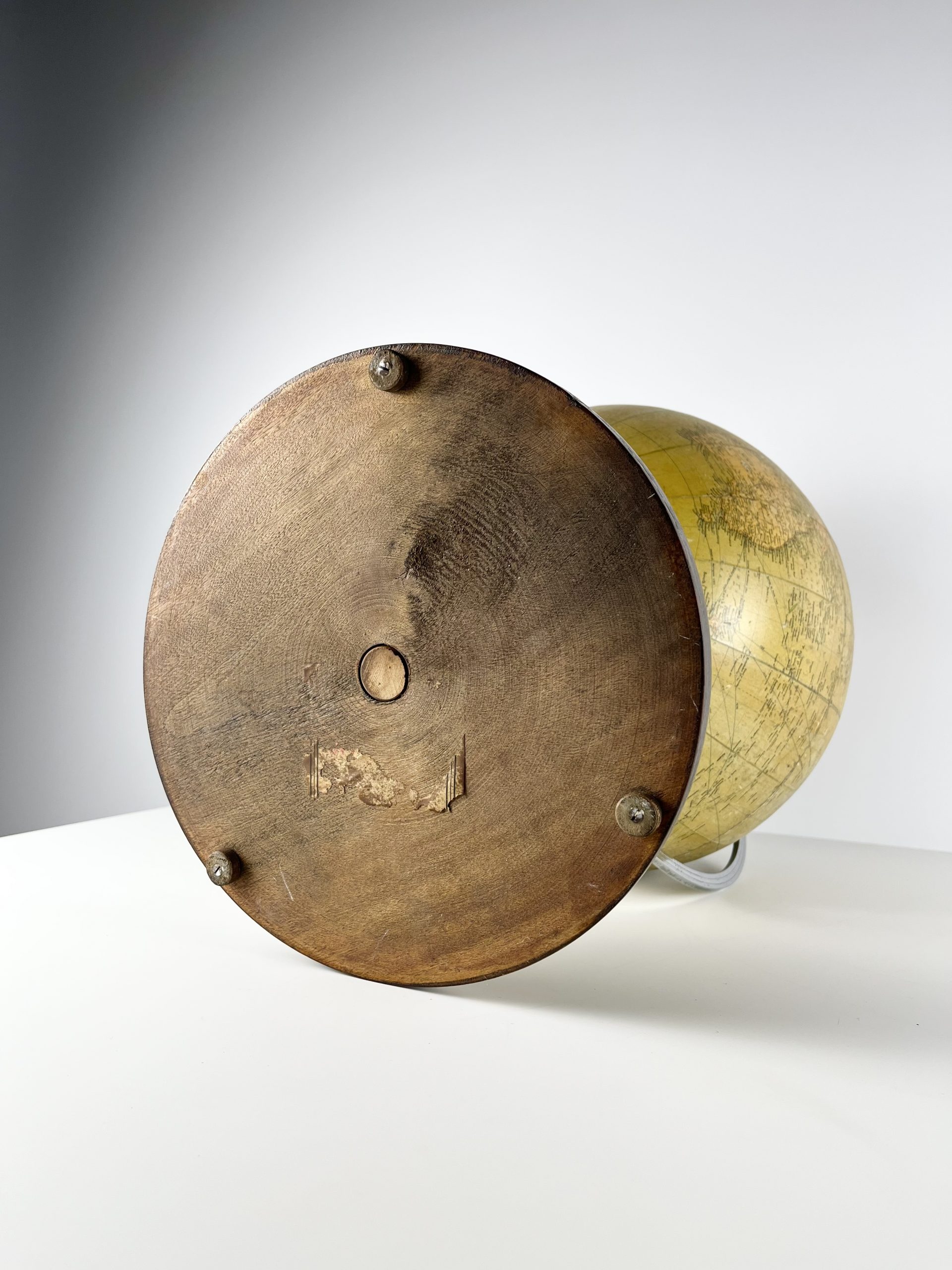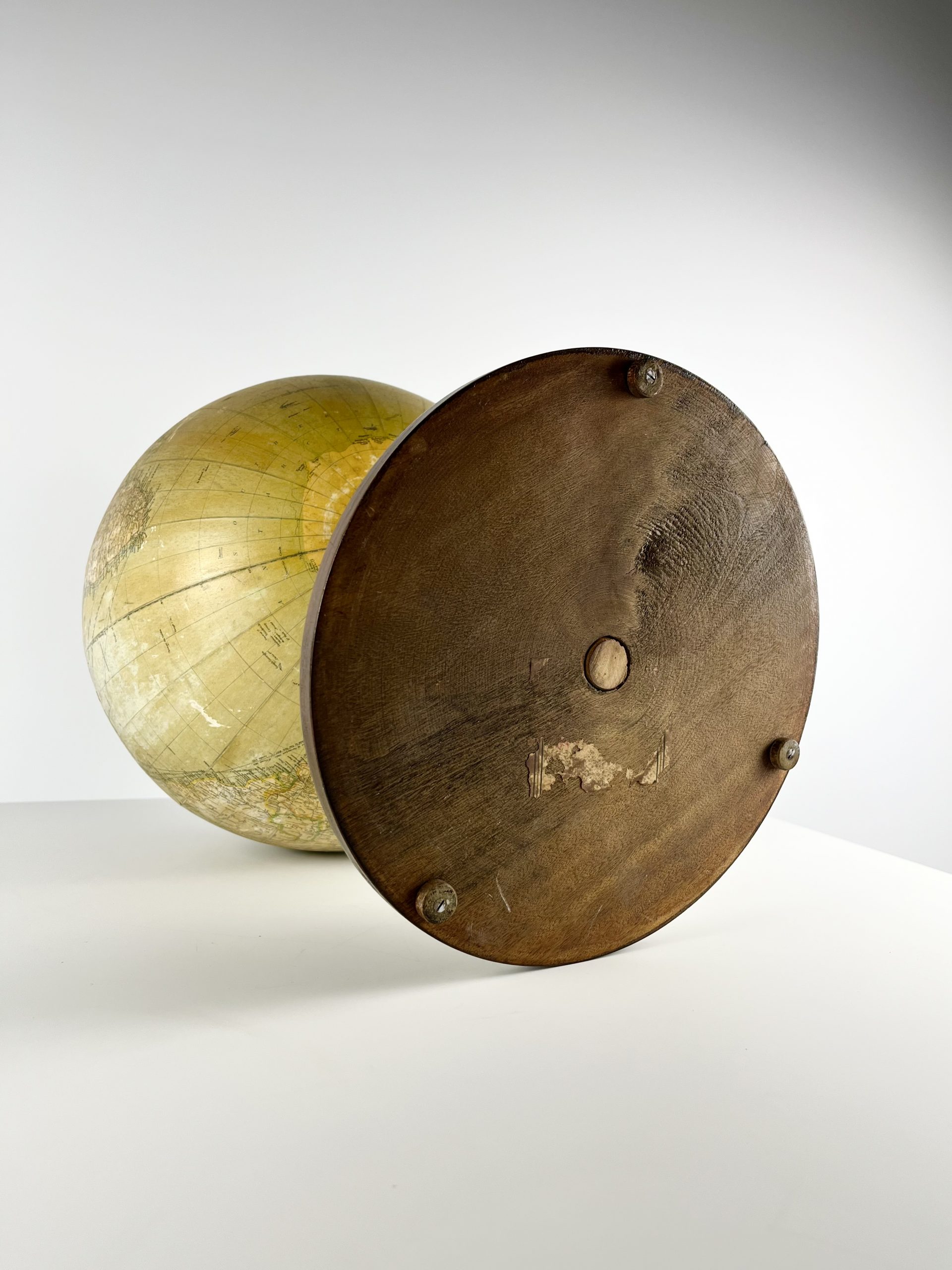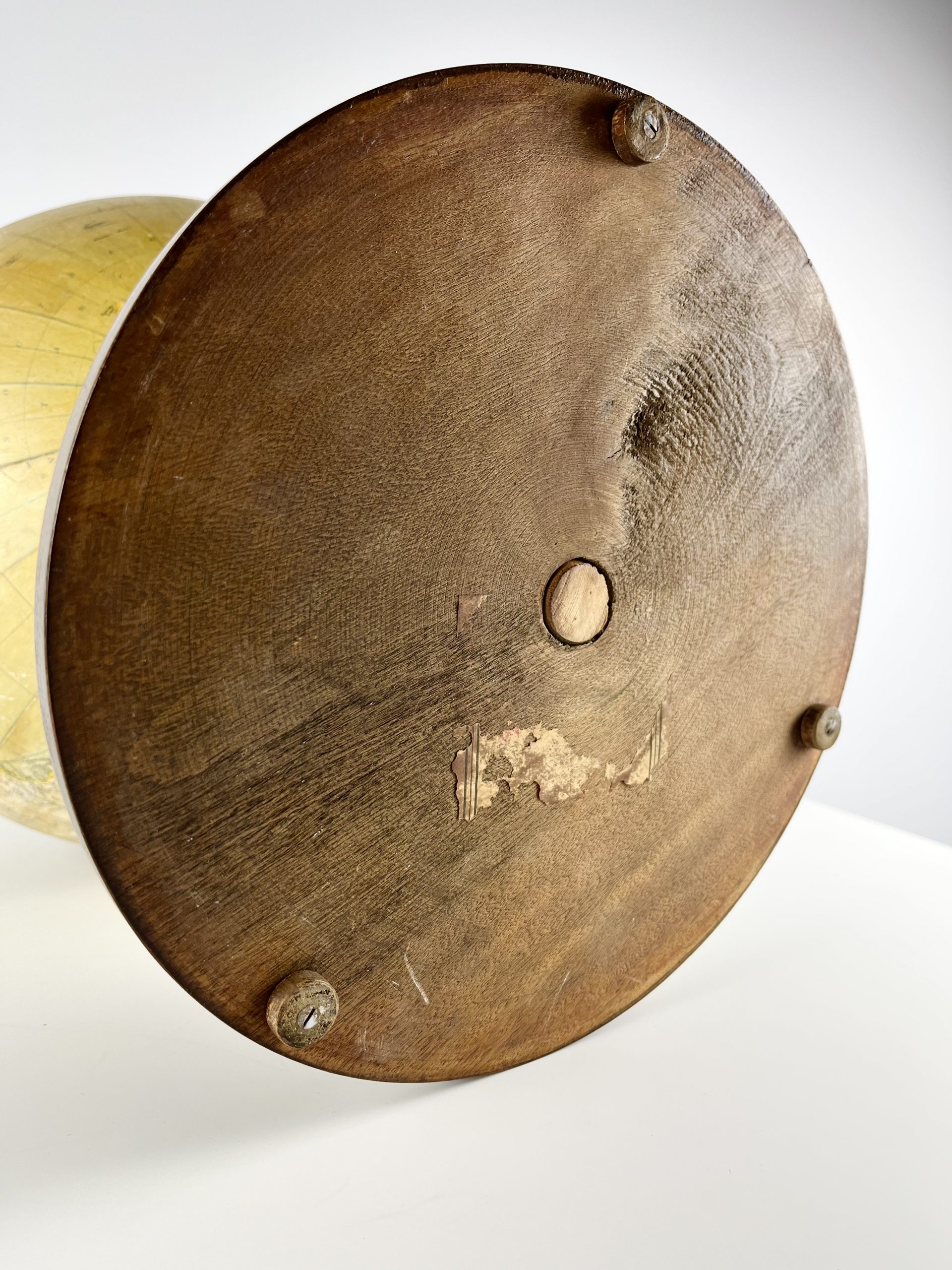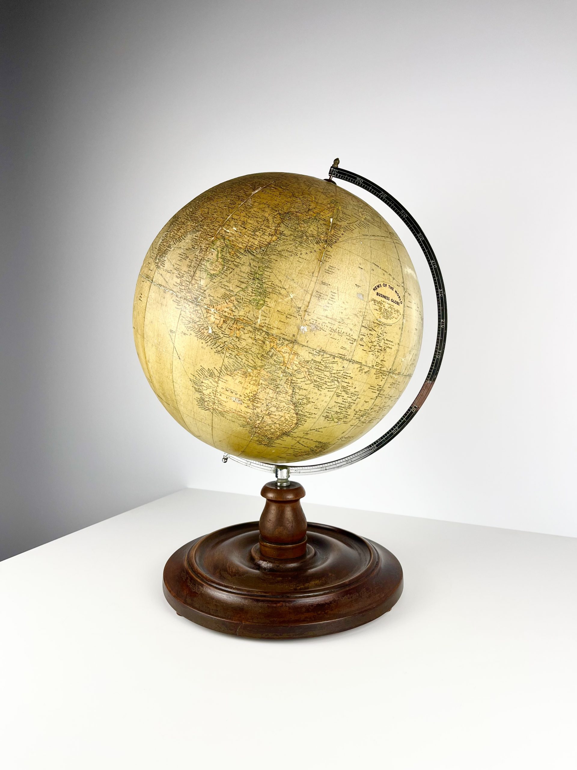 A 12-inch papier-mâché globe spins on a gleeming chrome mount, and stands proudly on a turned mahogany base. Remnants of an original label can still been seen attached to the underside of the base.