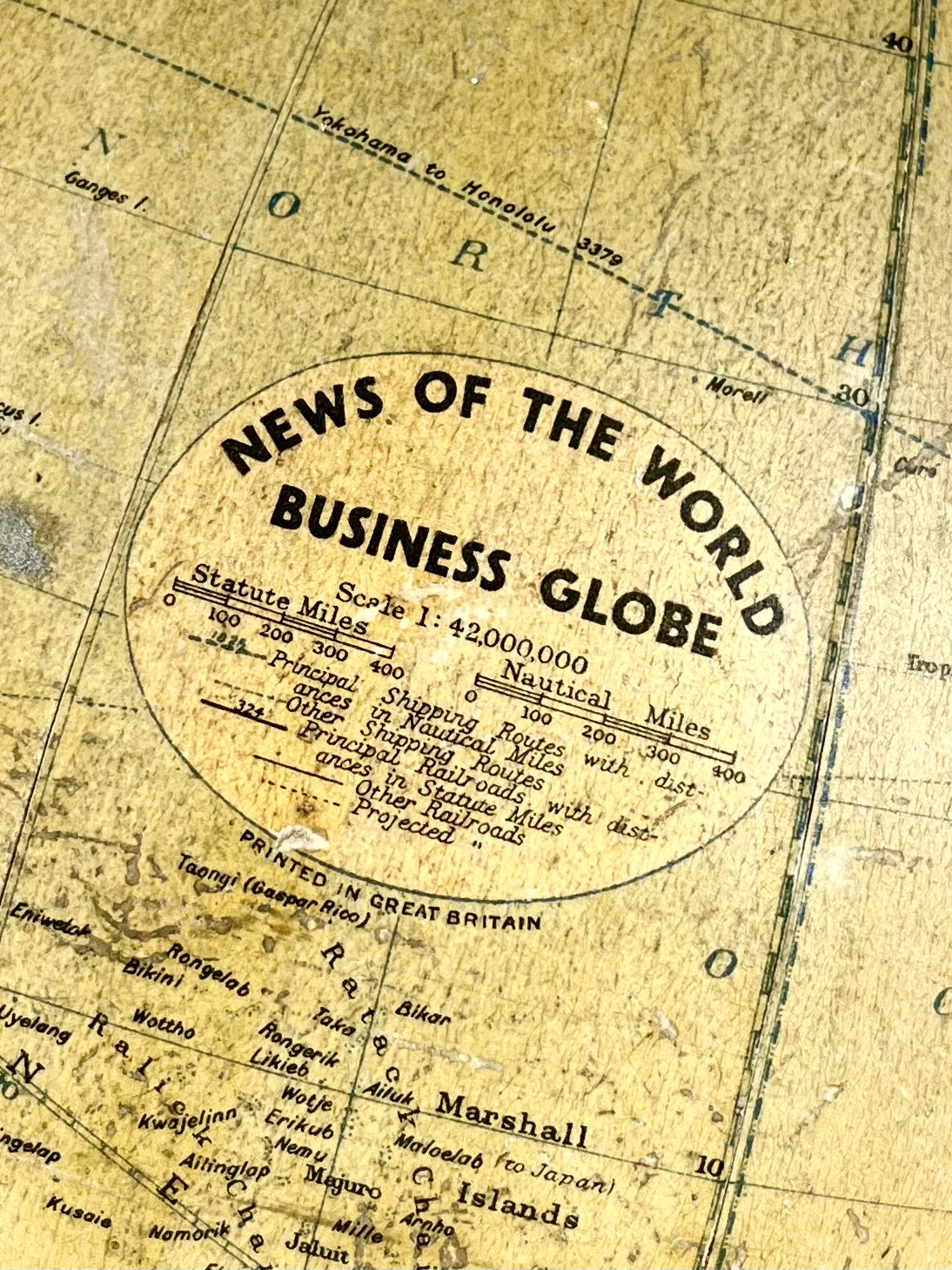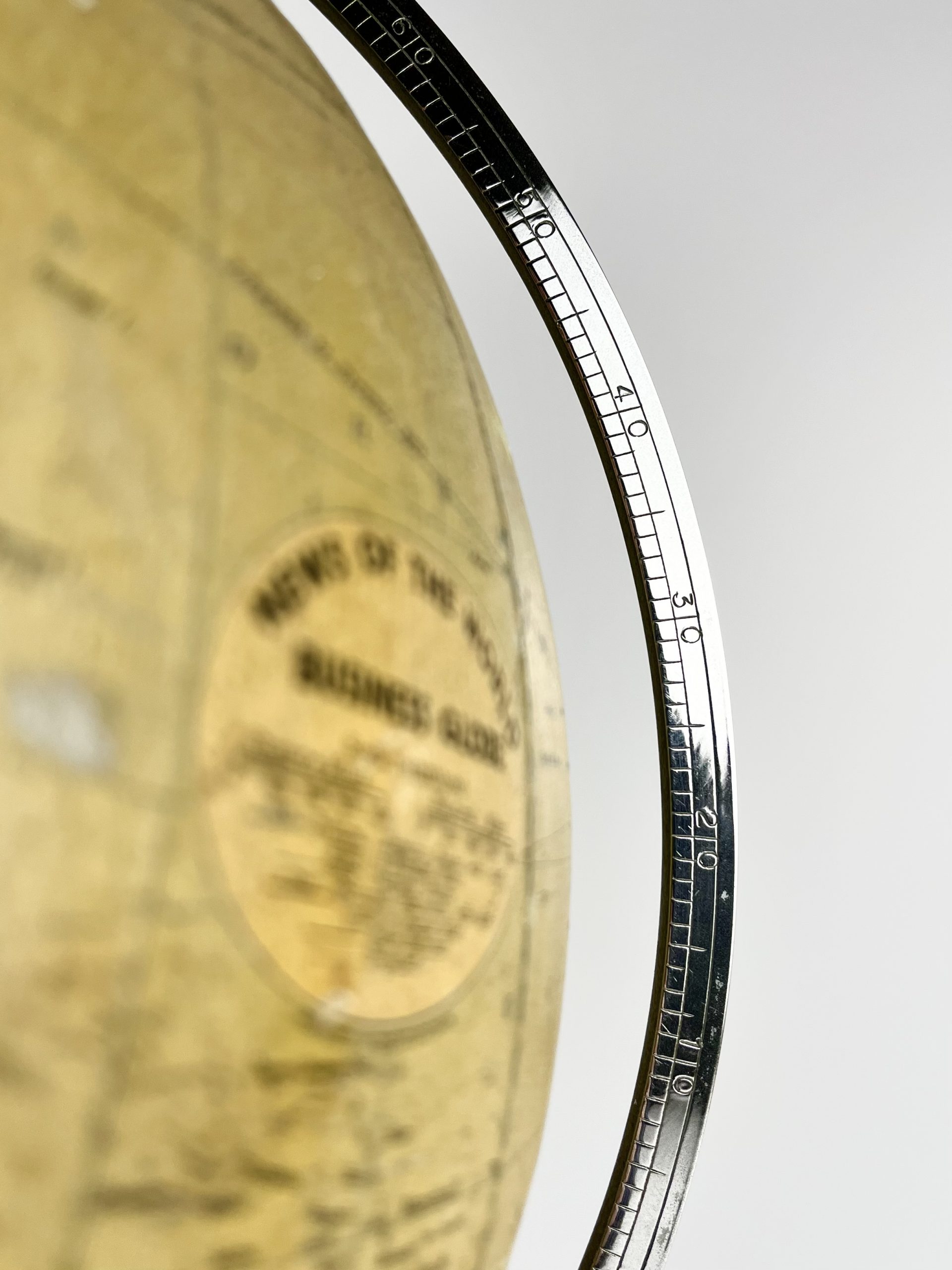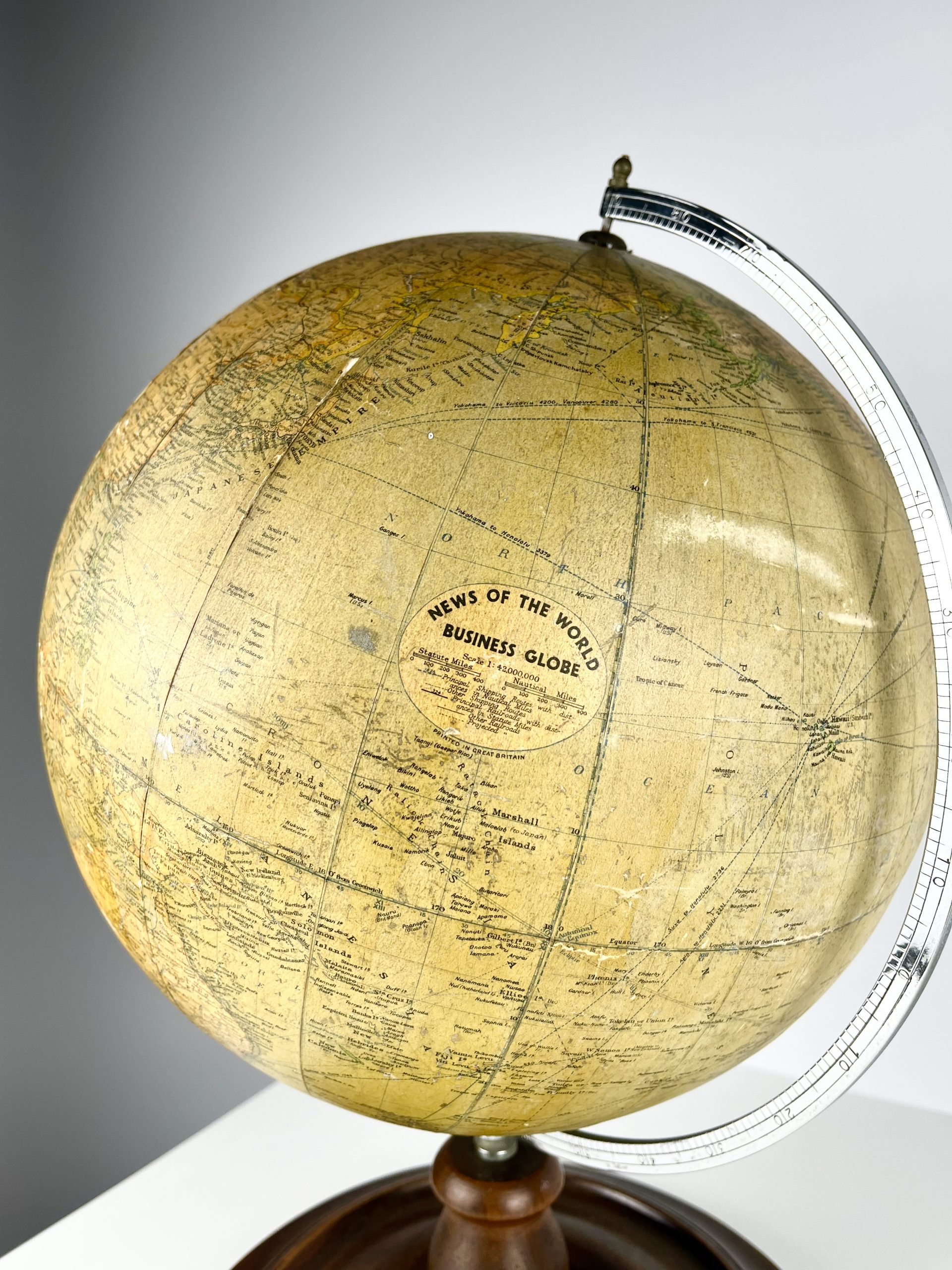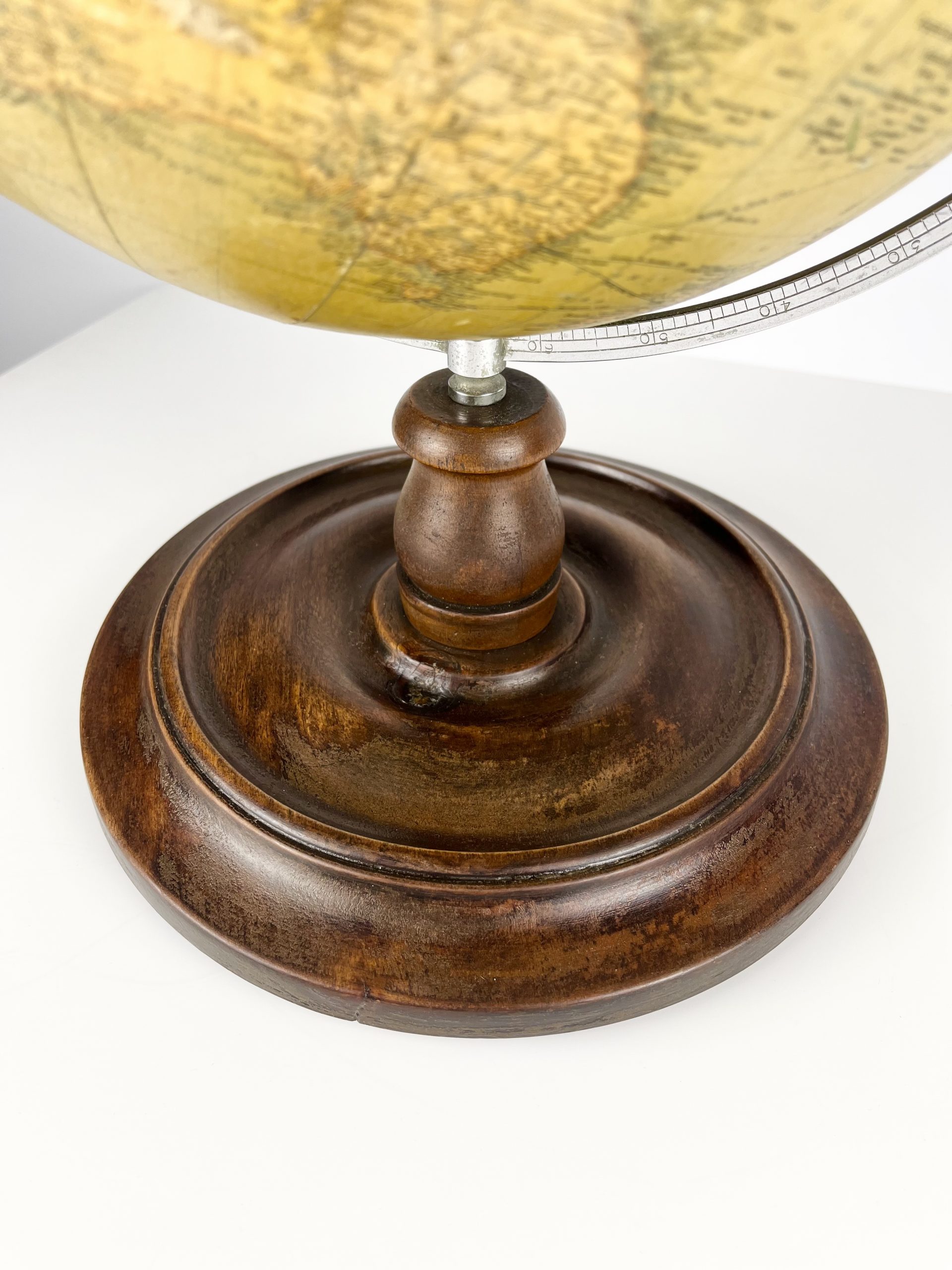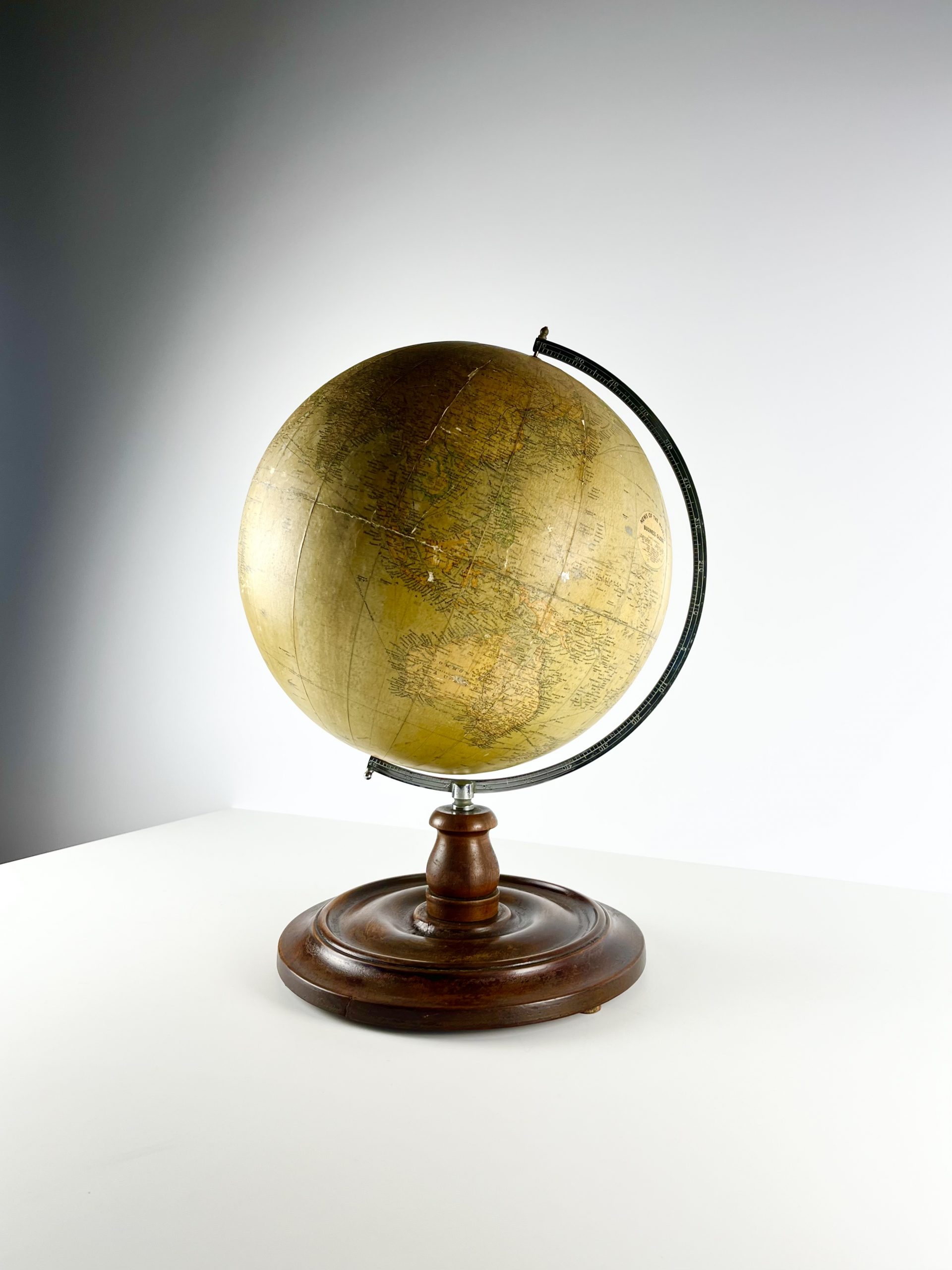A 12-inch papier-mâché globe spins on a gleeming chrome mount, and stands proudly on a turned mahogany base. Remnants of an original label can still been seen attached to the underside of the base.