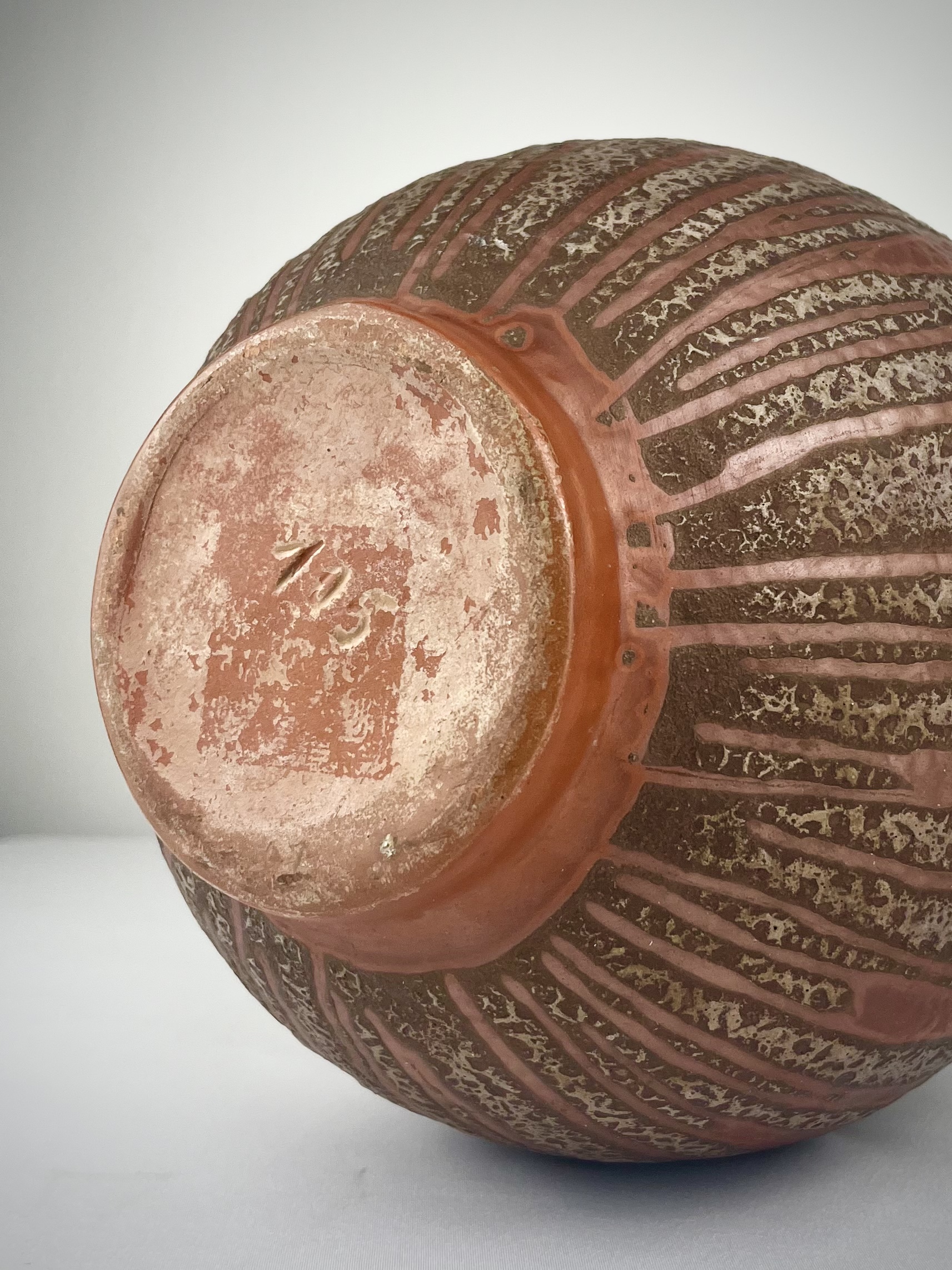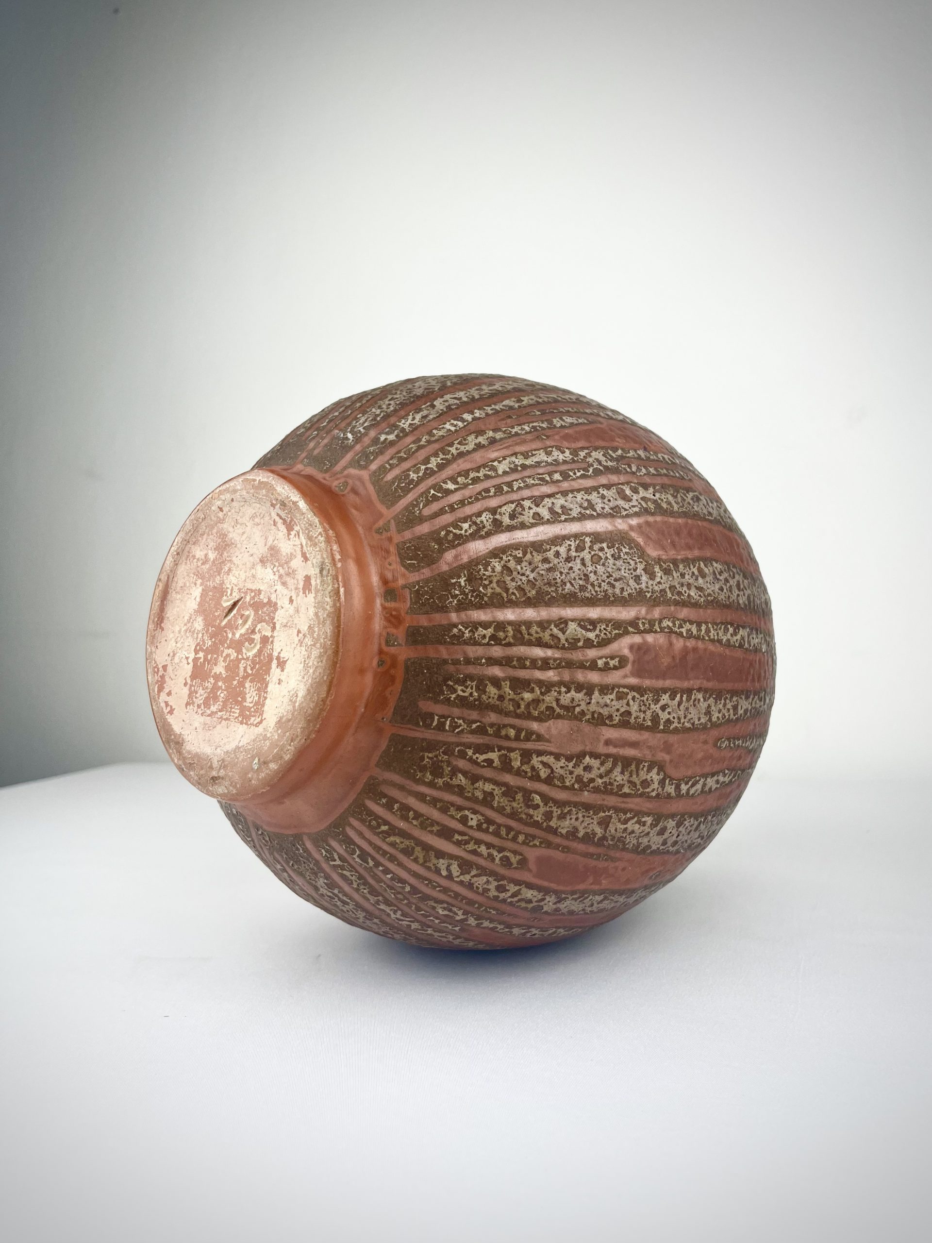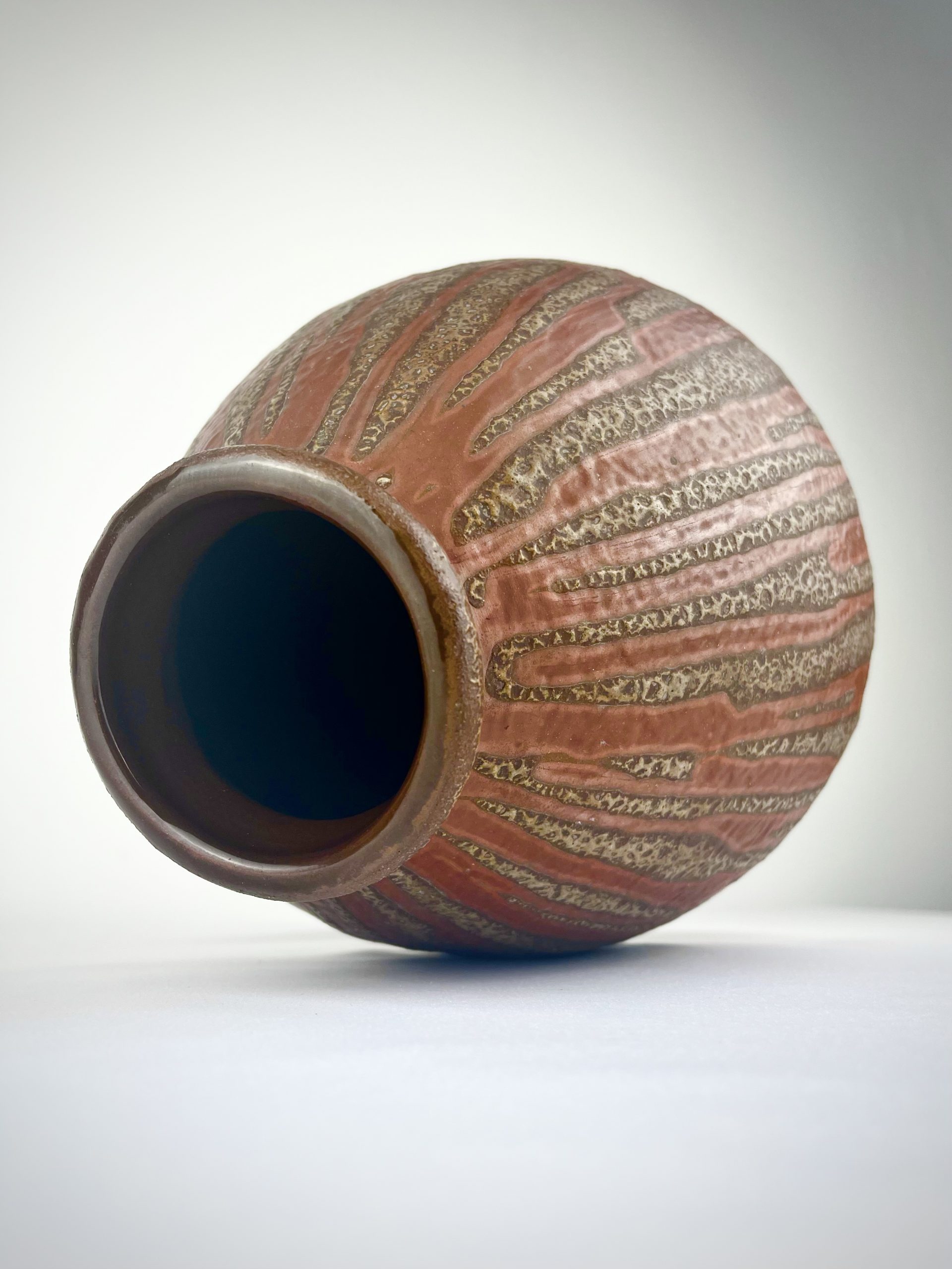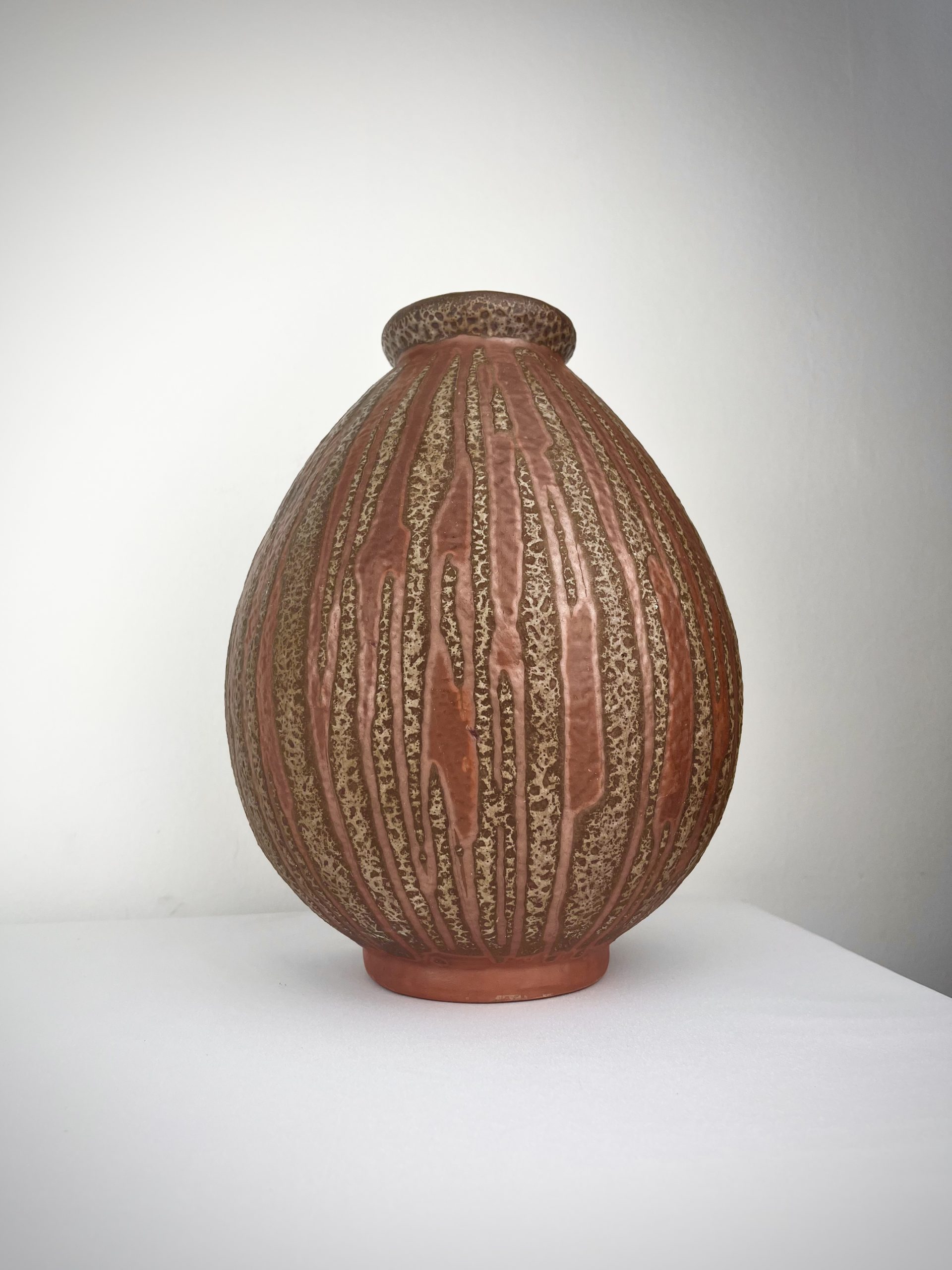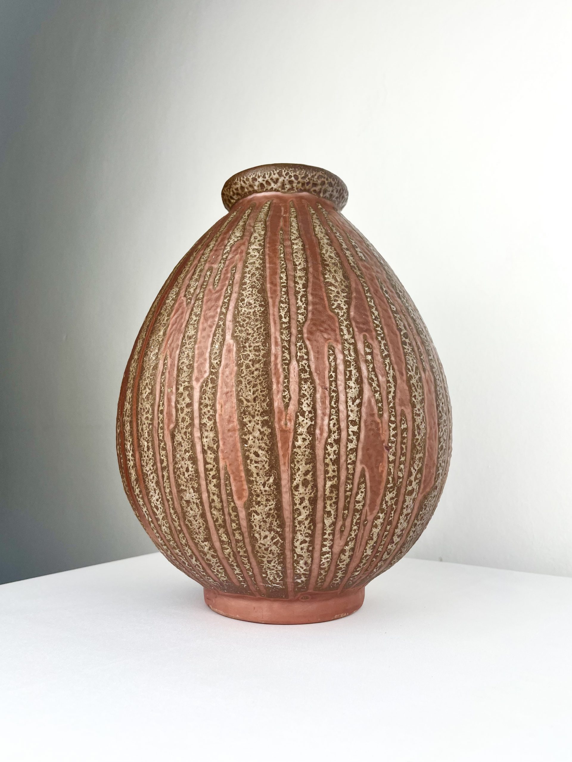A rare and very large Gerda Heuckeroth vase, with a brick red and grey Velociraptor glaze!