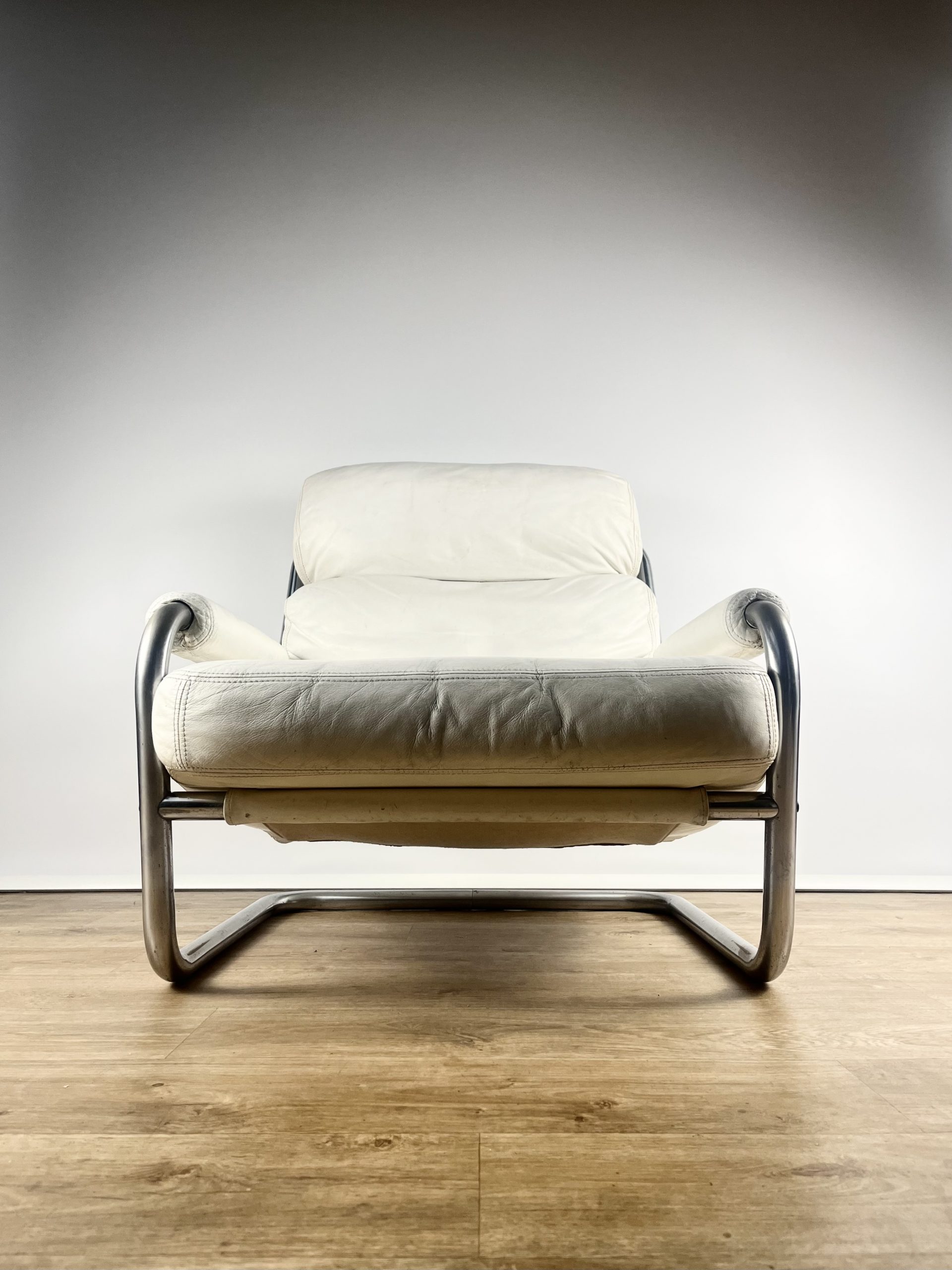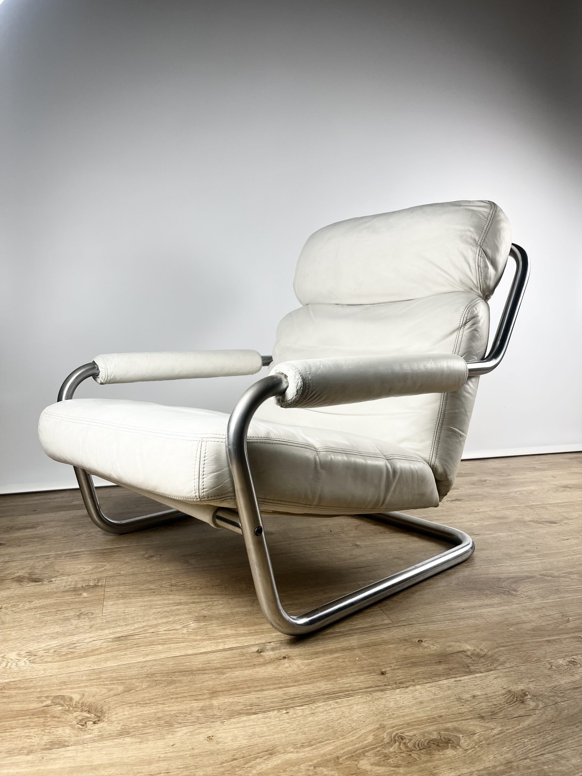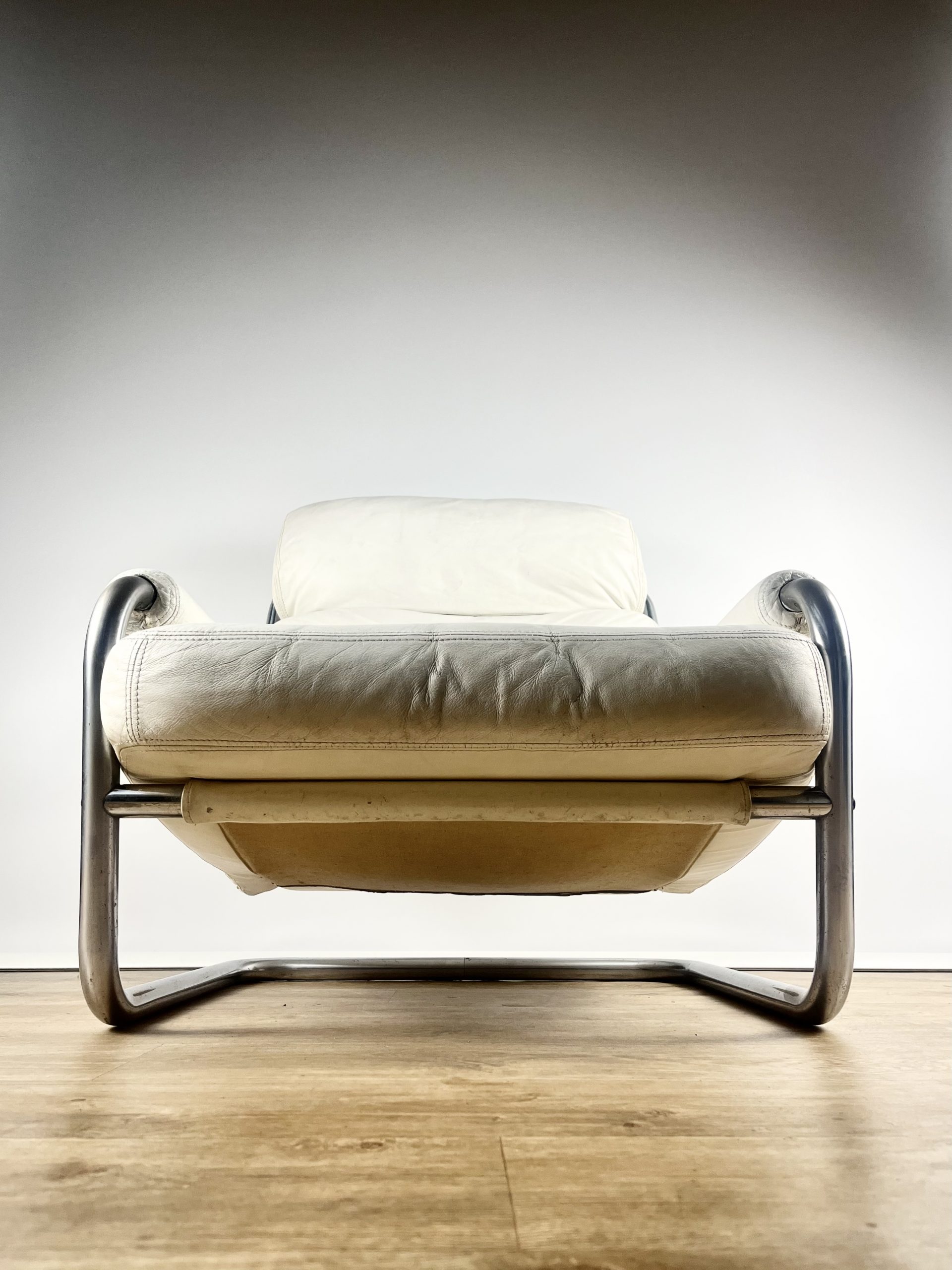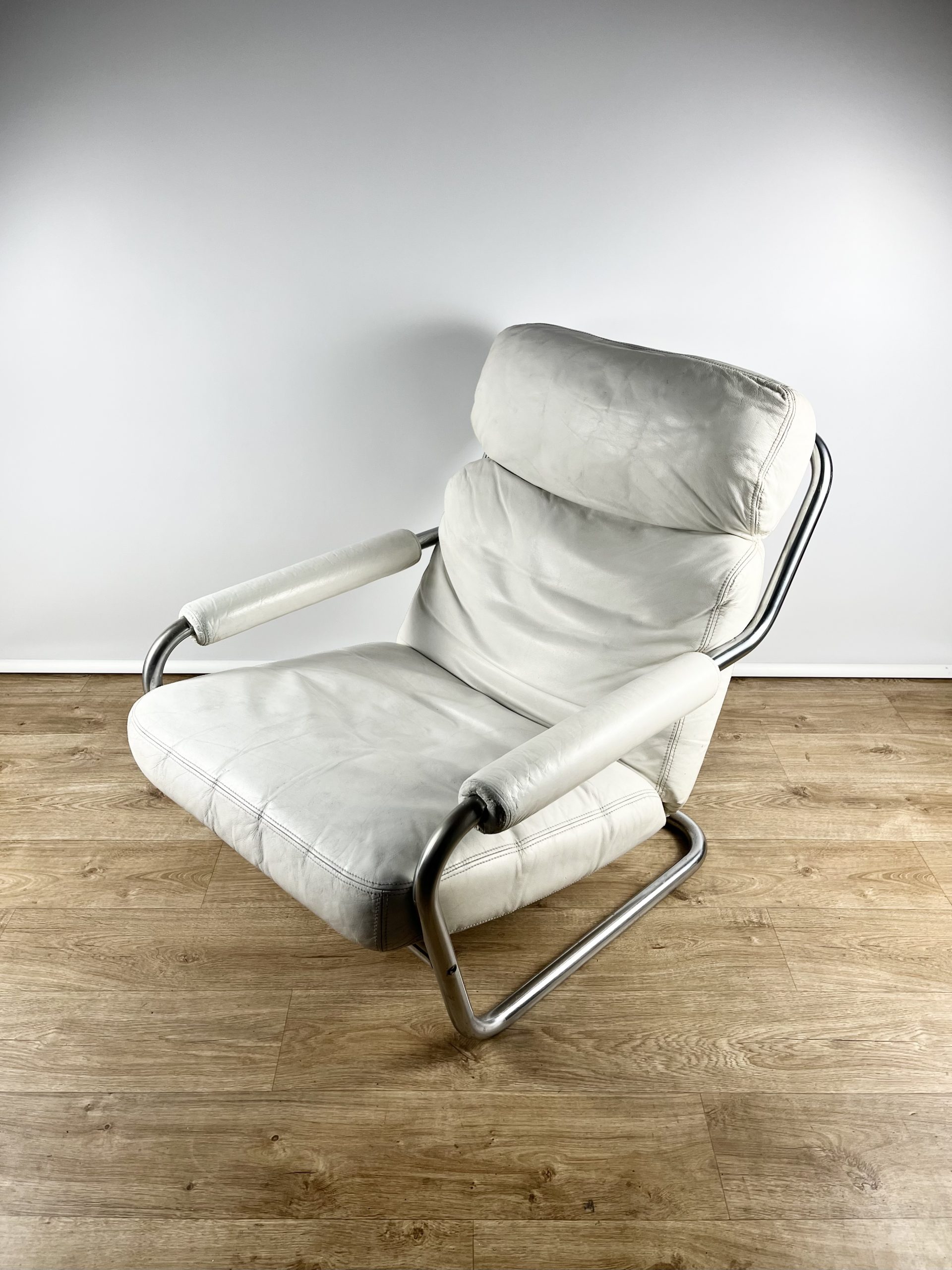 A slick looking leather and chrome easy chair, designed by Dutch architect, Jan des Bouvrie.