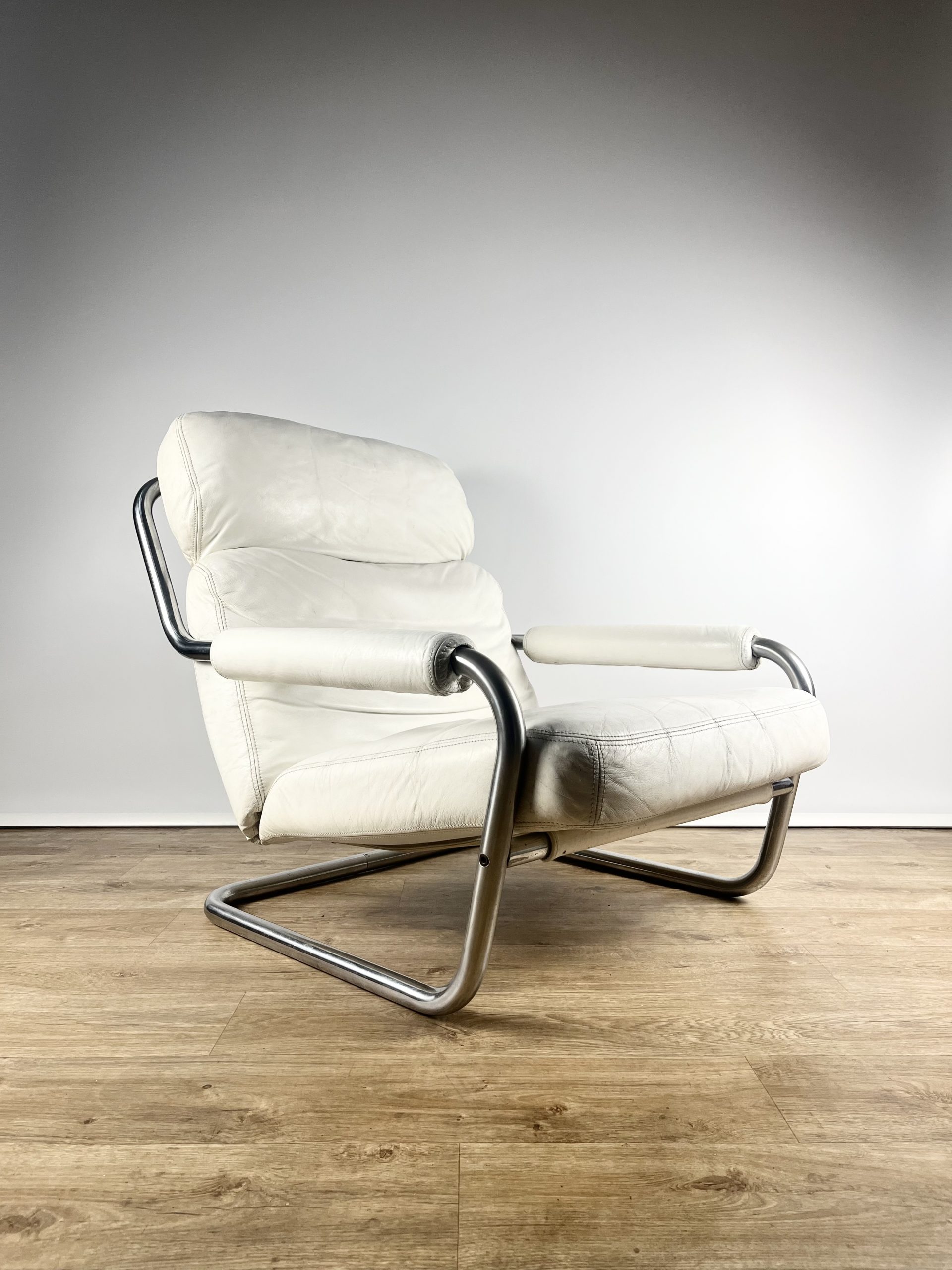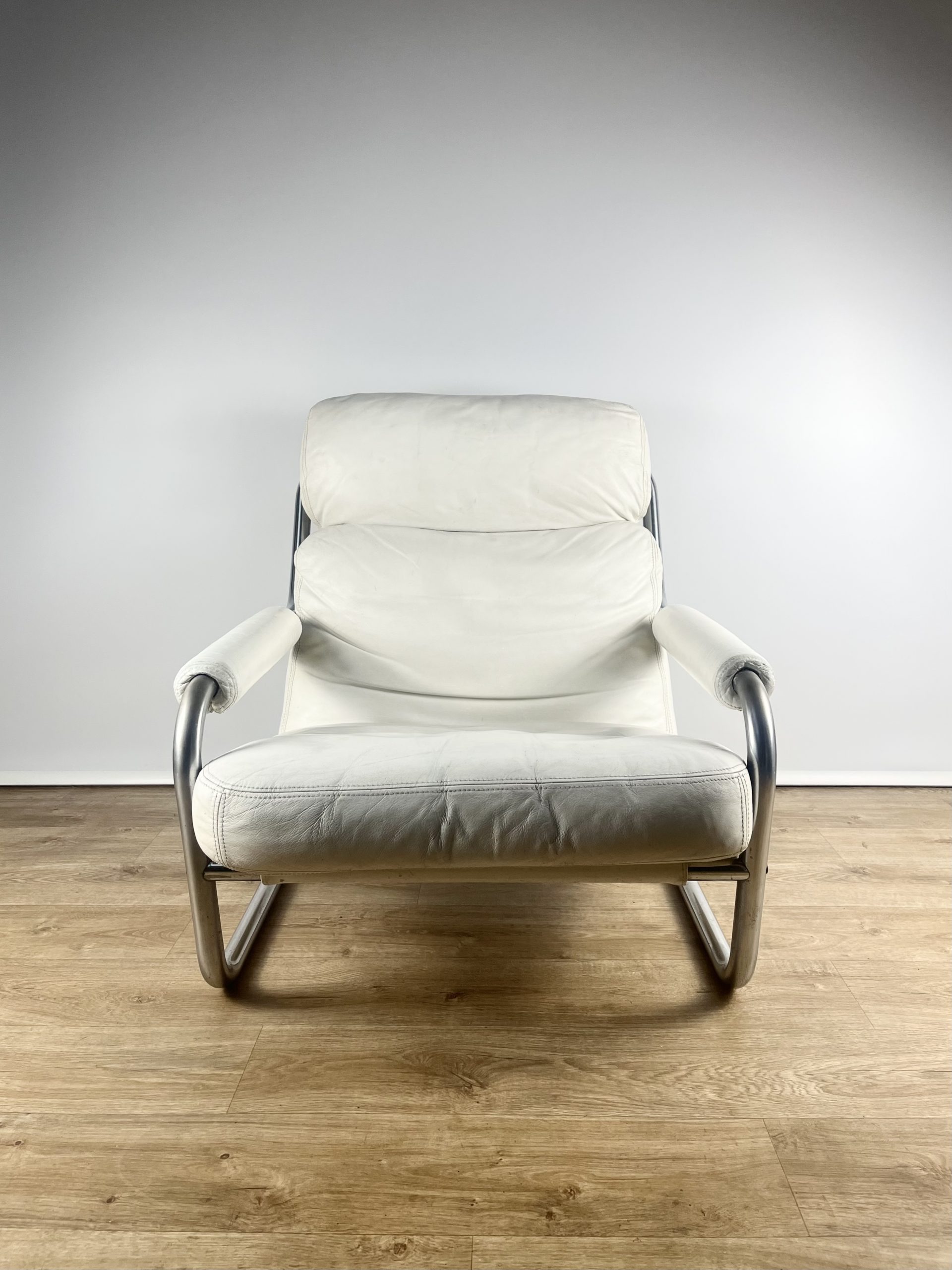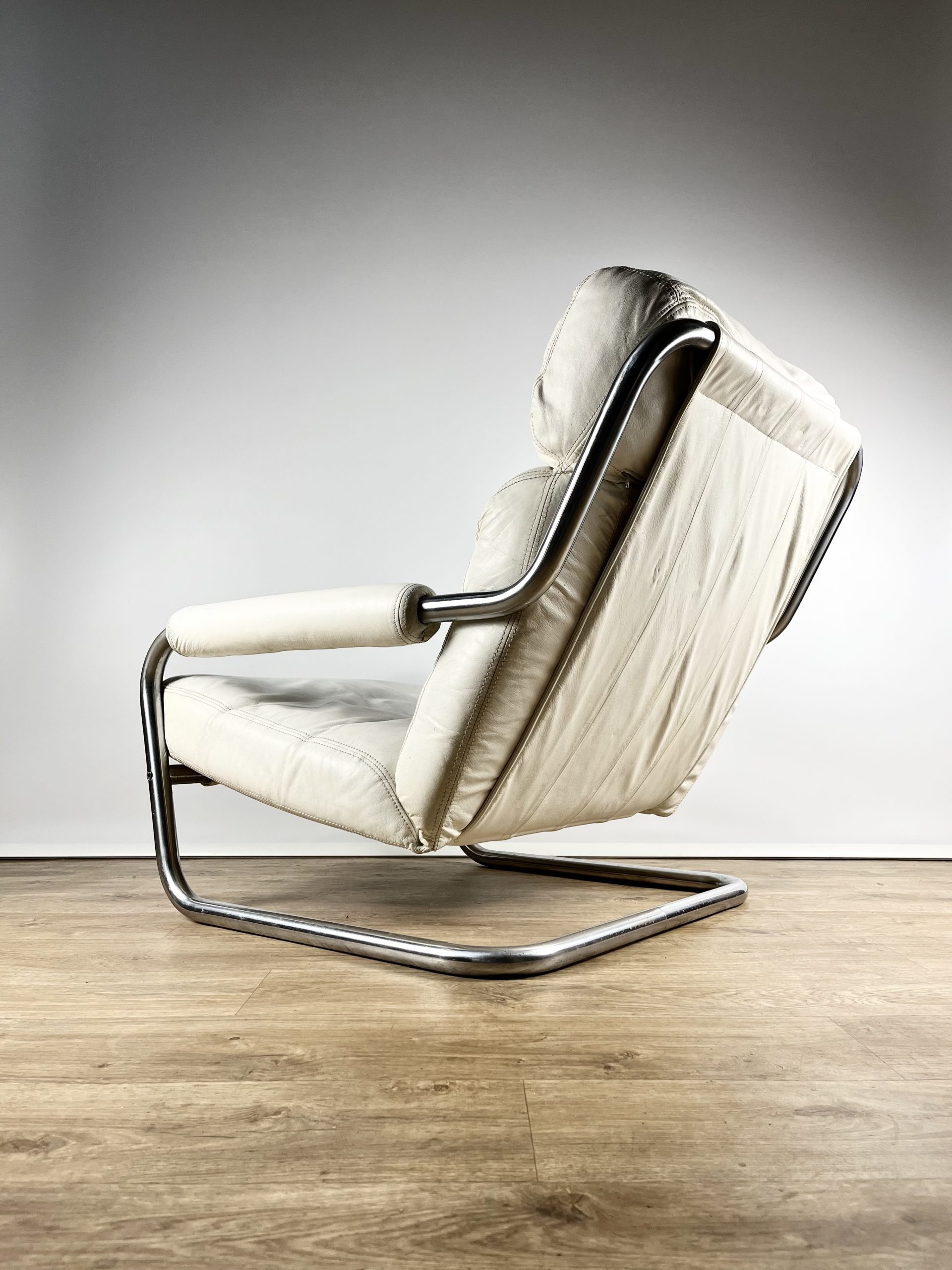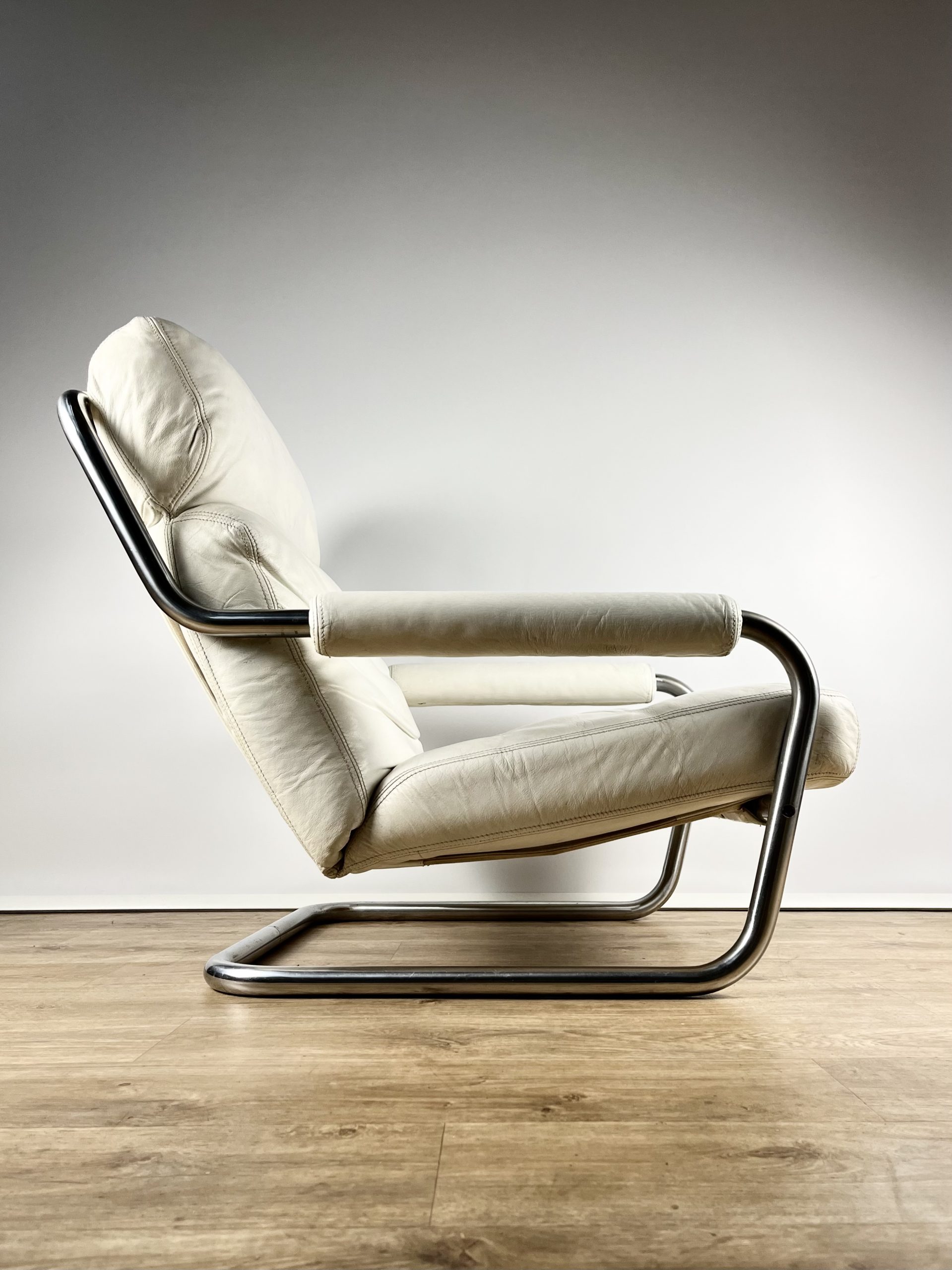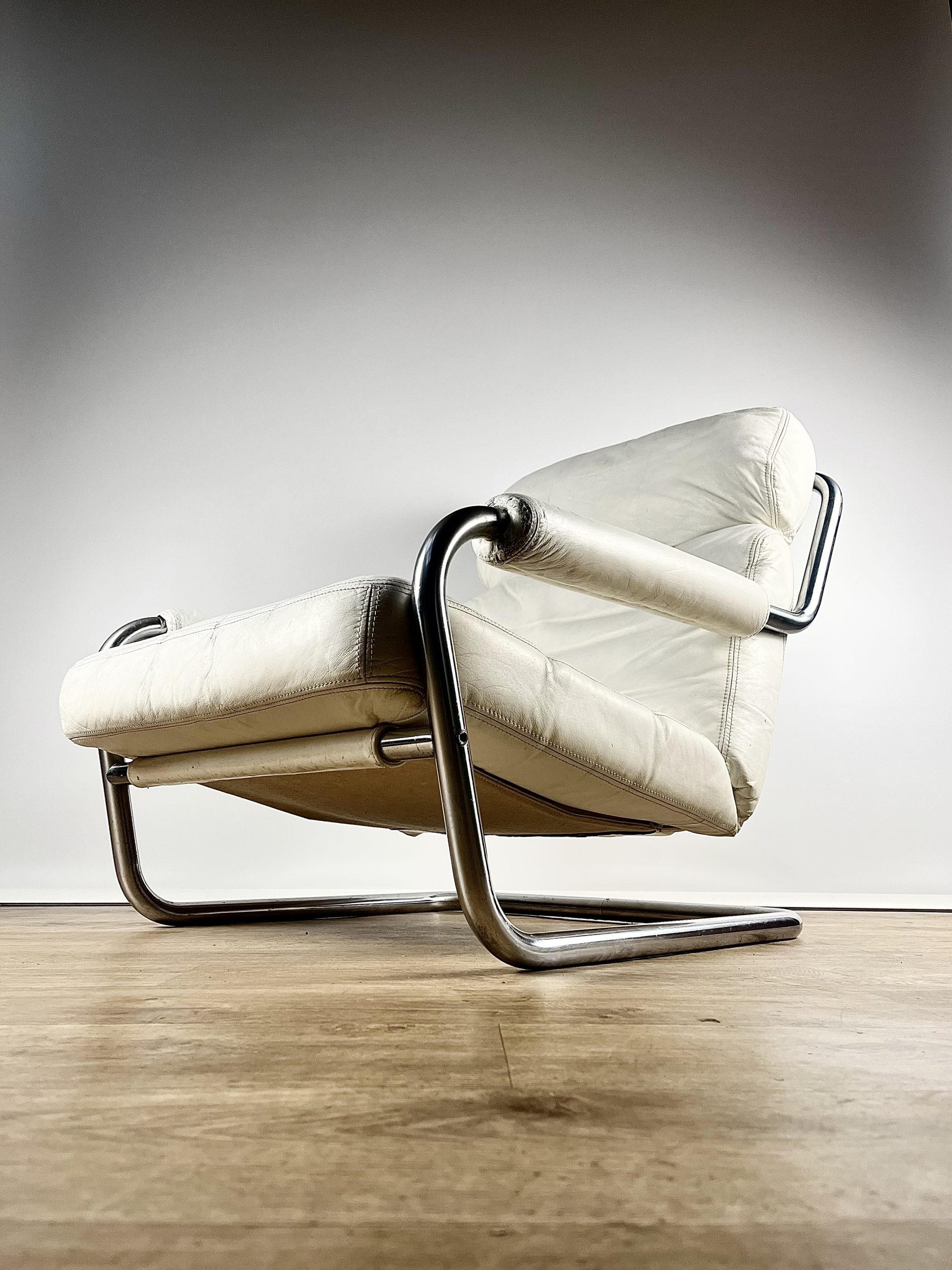 A slick looking leather and chrome easy chair, designed by Dutch architect, Jan des Bouvrie.