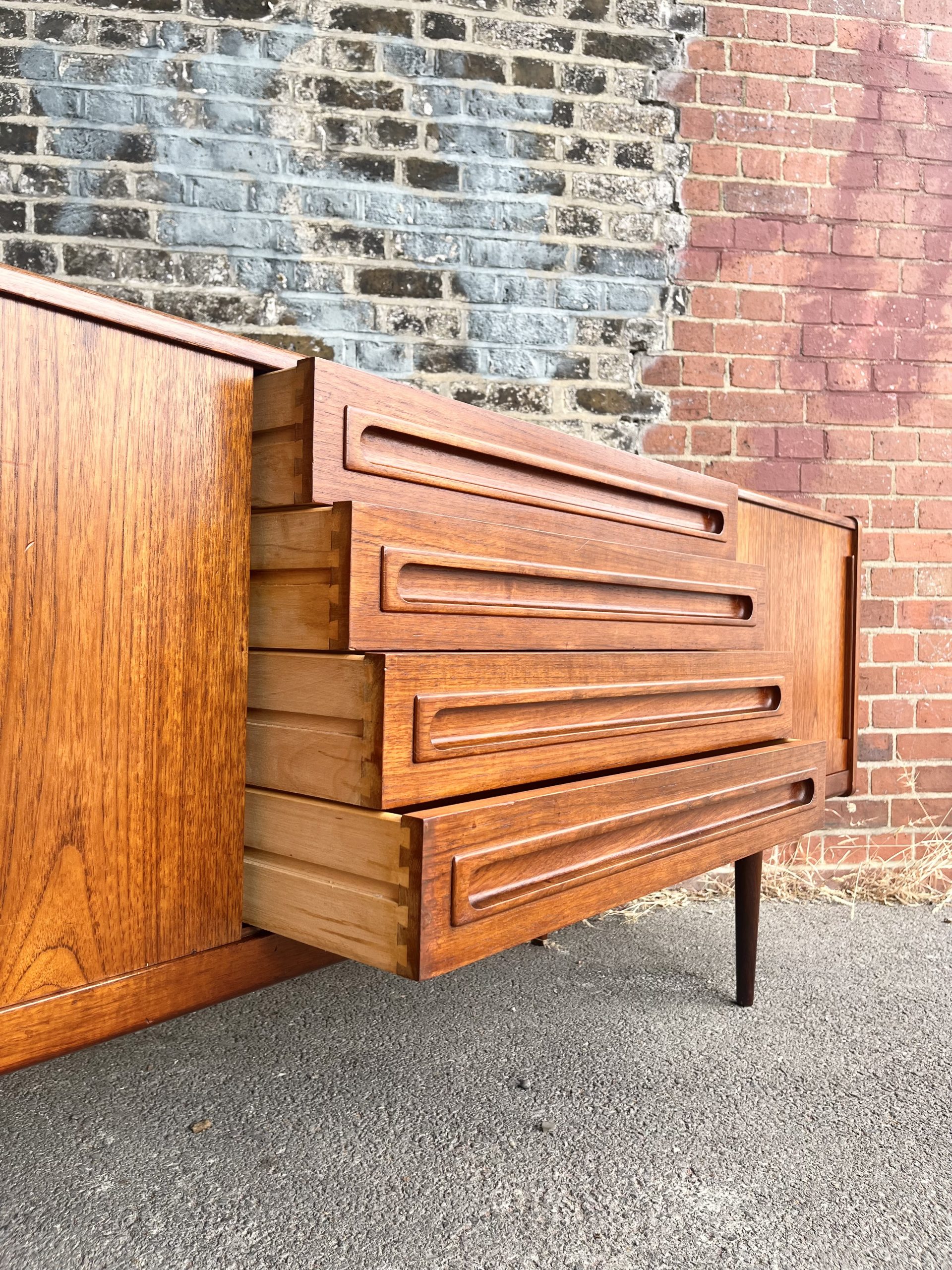Standing proud on tapered teak legs, its two end cabinets feature adjustable and removable shelves, and frame a central section containing four dovetail-jointed drawers.