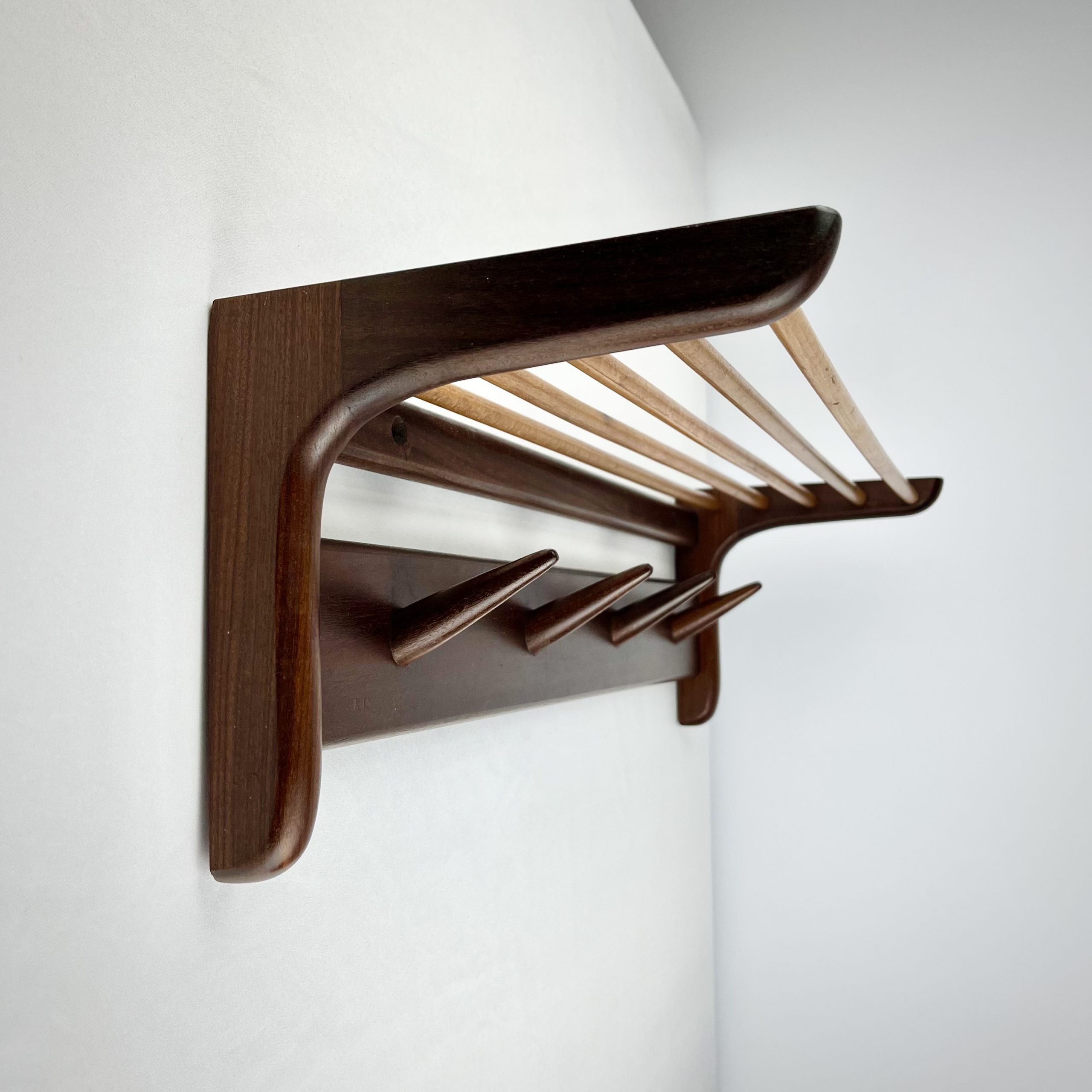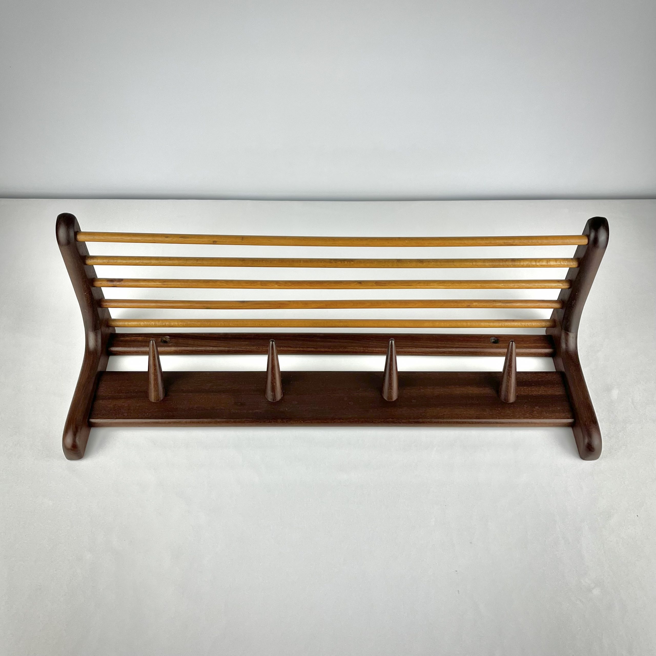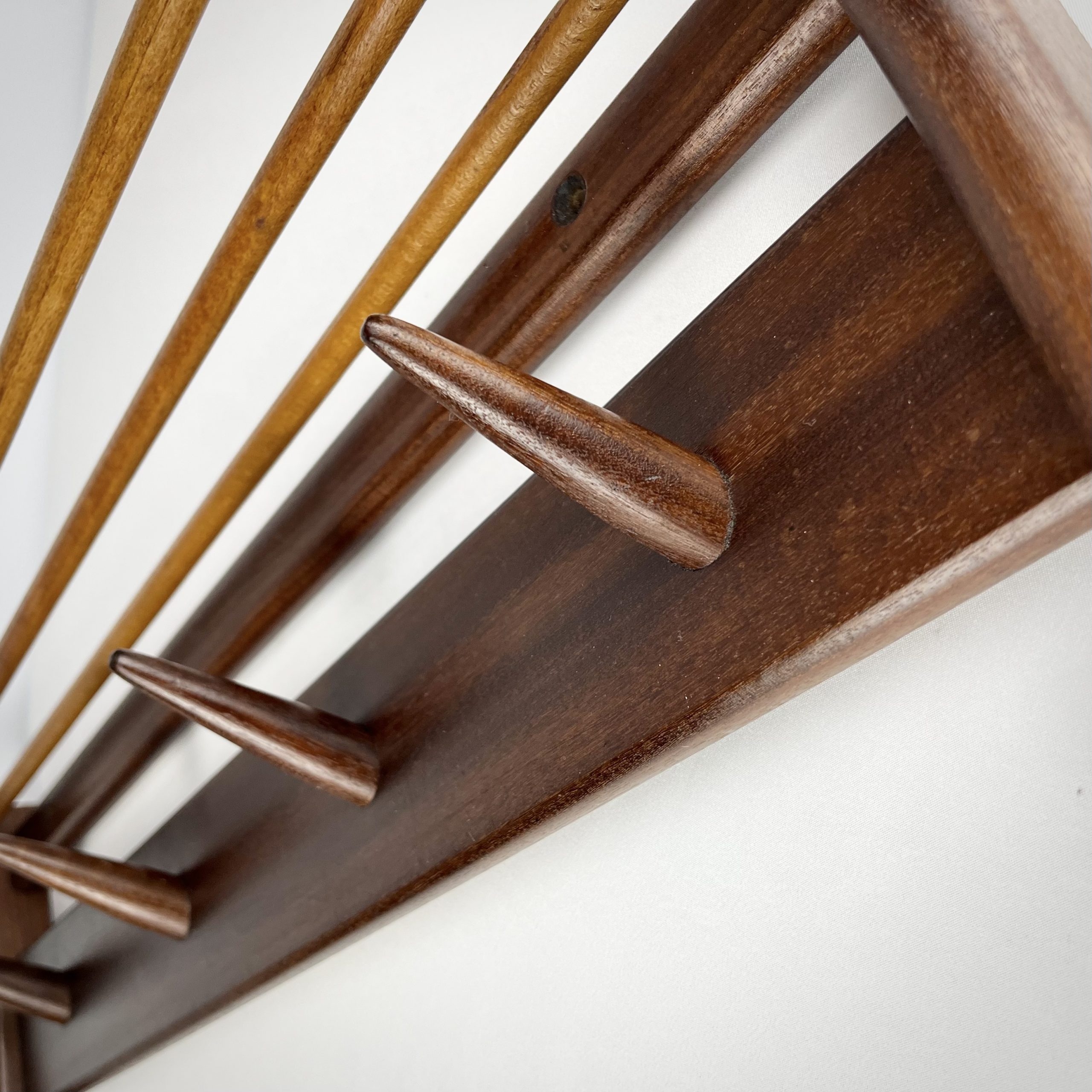 Produced in the 1960s by quality furniture manufacturer A. Younger Ltd, this iconic, sculptural design features a slatted beech hat rack and a solid afrormosia frame, with four tusk-like coat hooks.