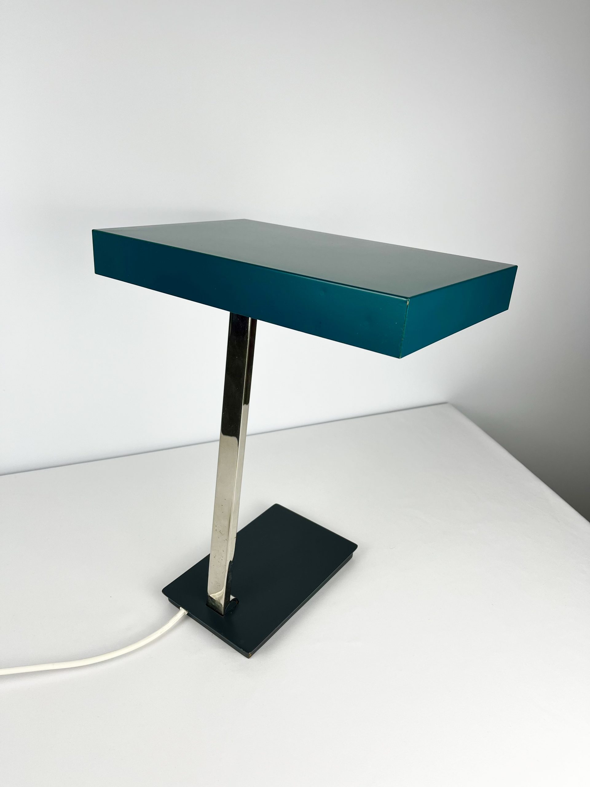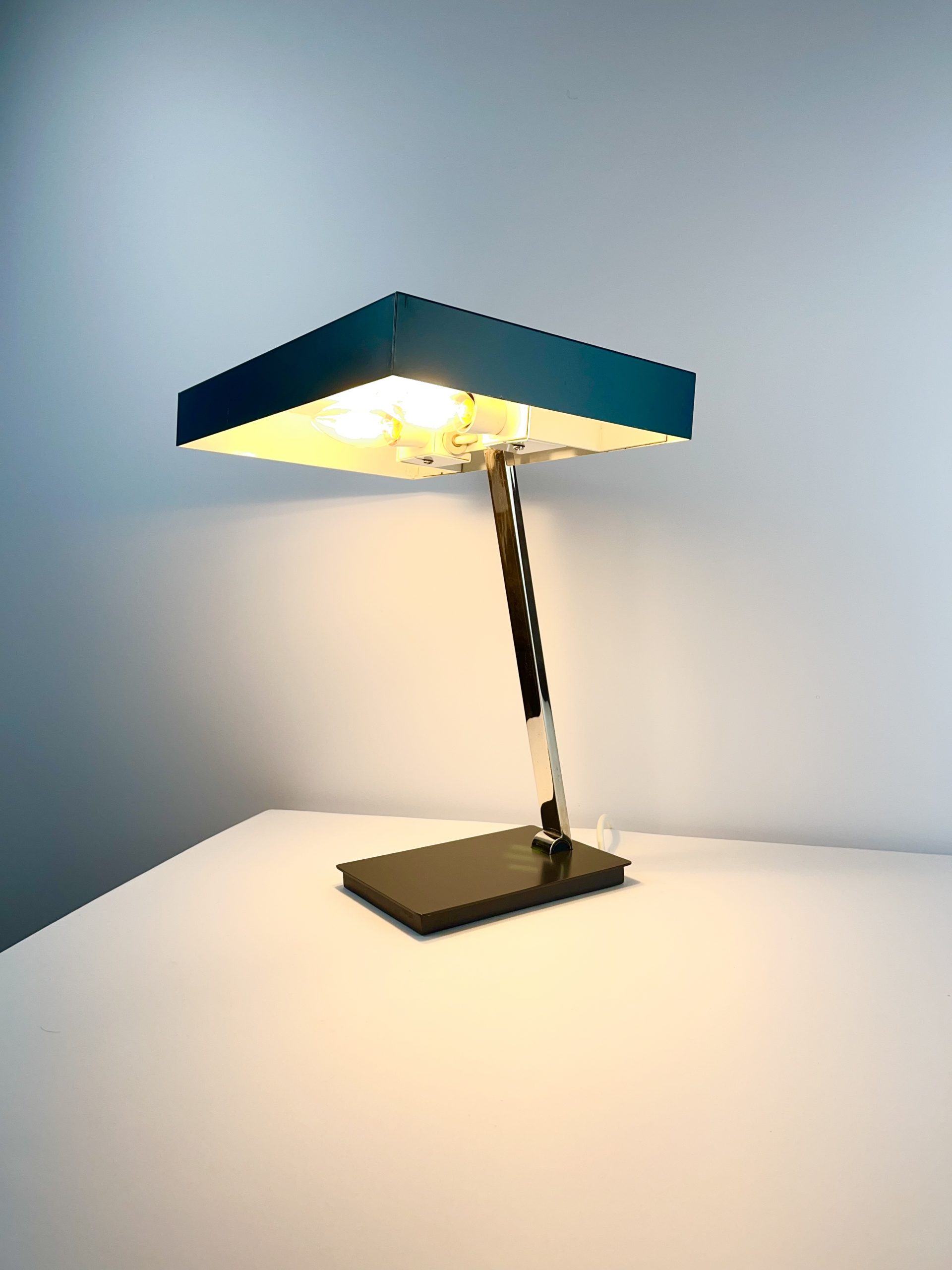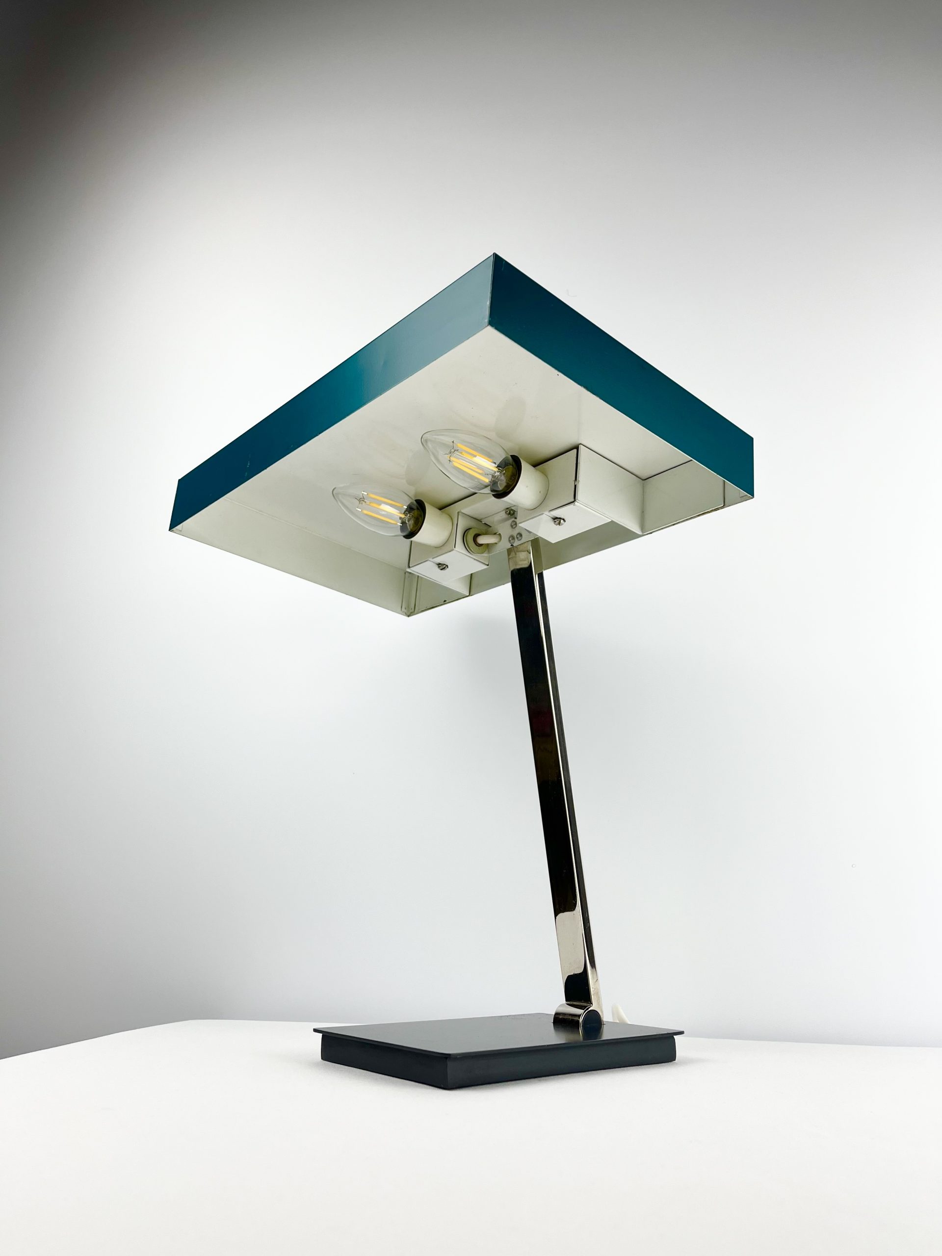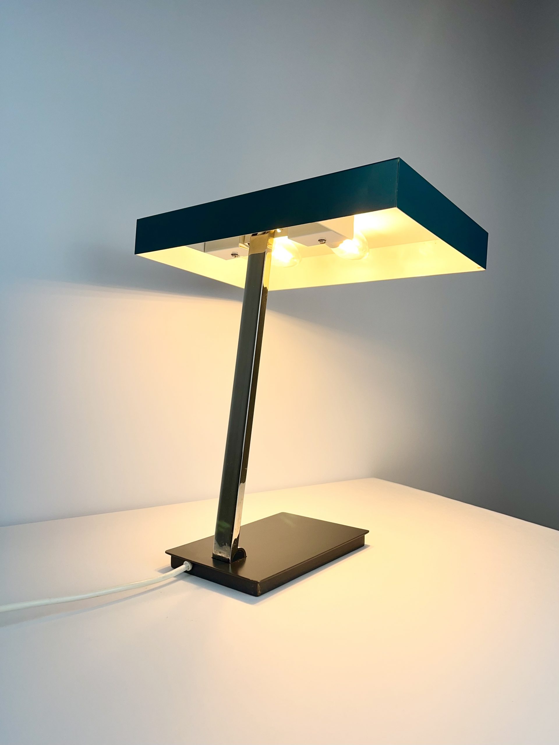 This large lamp is a Model 6874 and I believe it was designed by Klaus Hempel during the 1960s. Solidly constructed with a heavy black metal base, adjustable chrome neck and teal coloured metal shade, it features dual bulb holders and comes in a classic stripped-down Bauhaus design!
