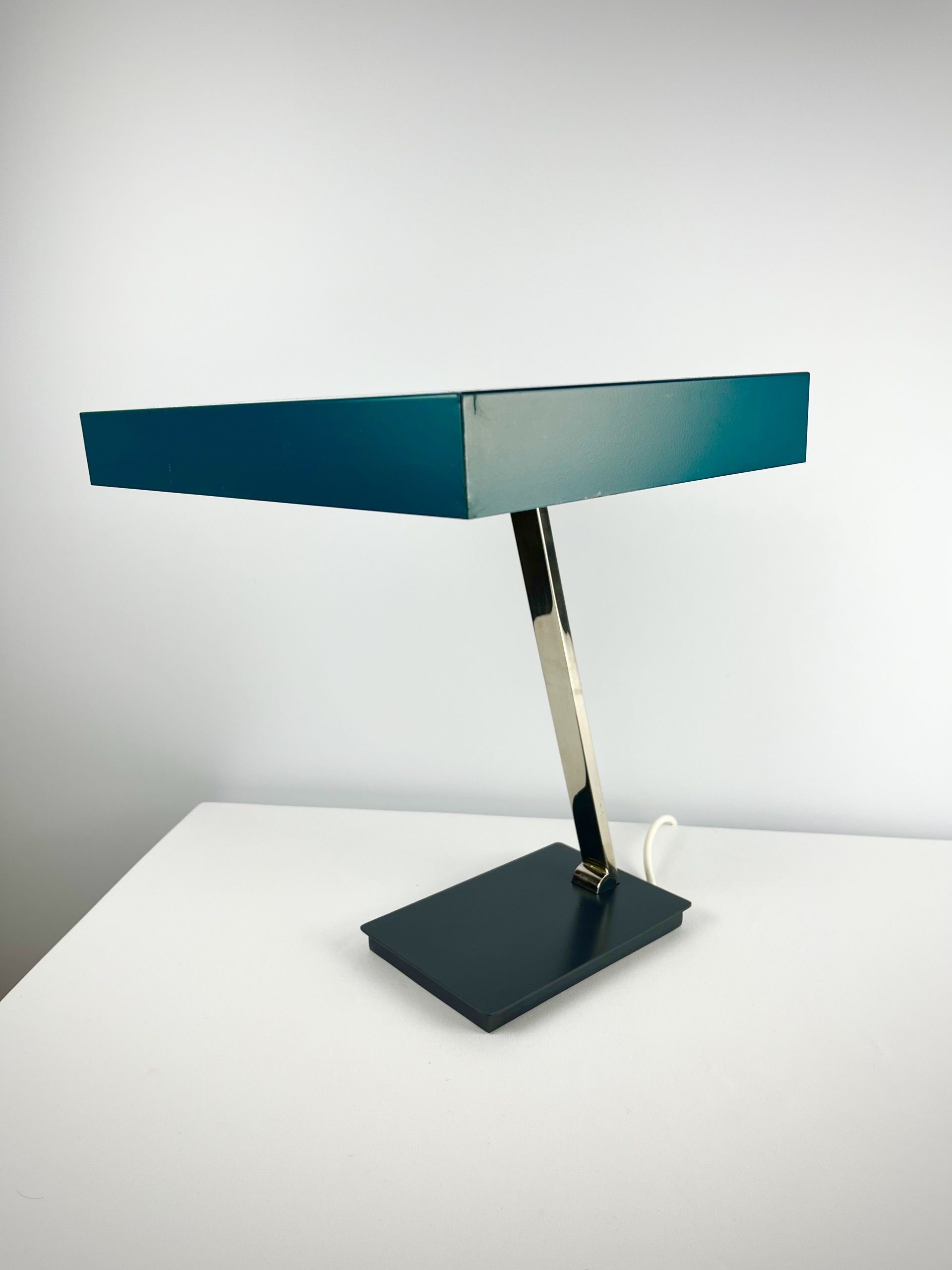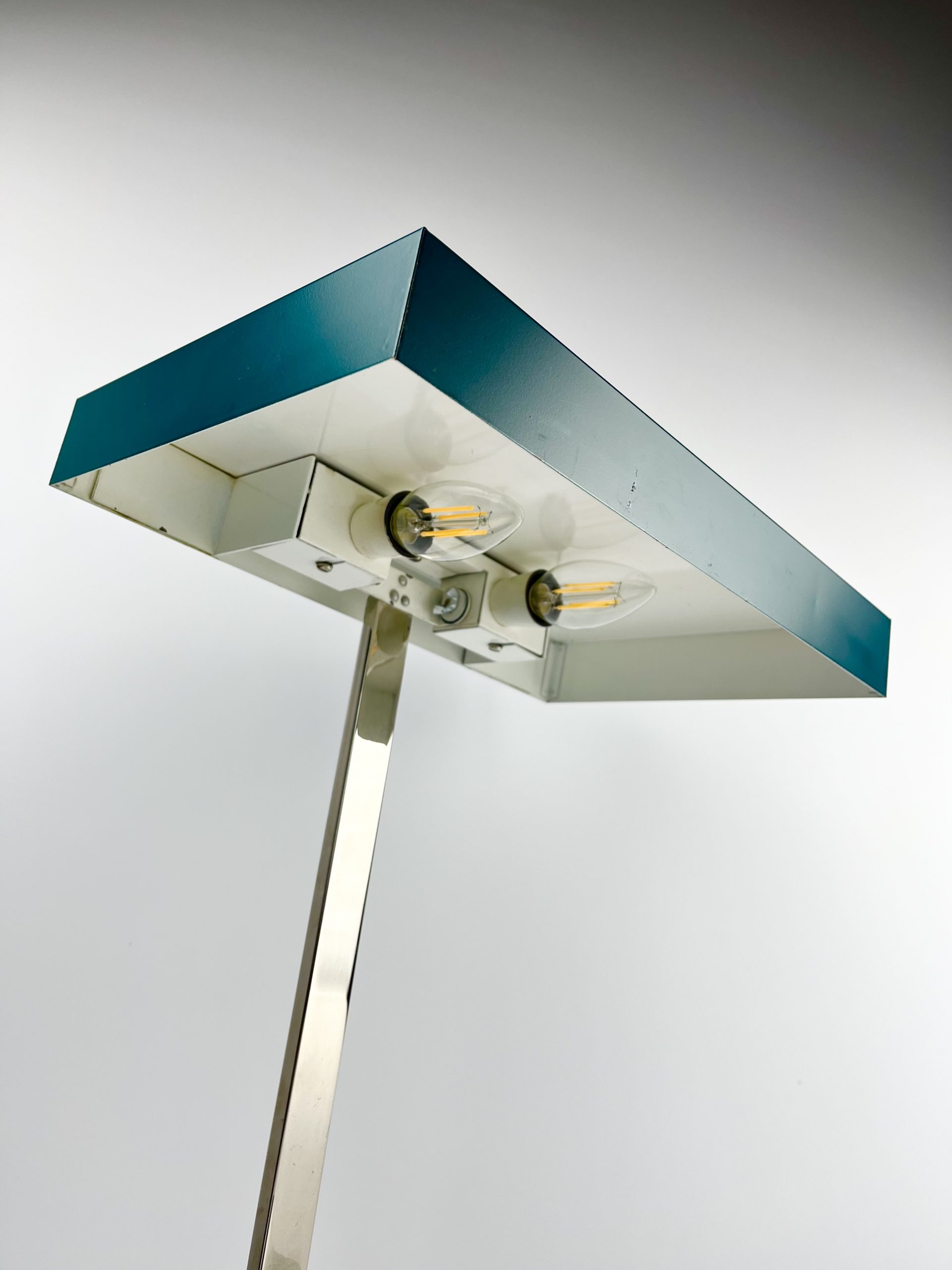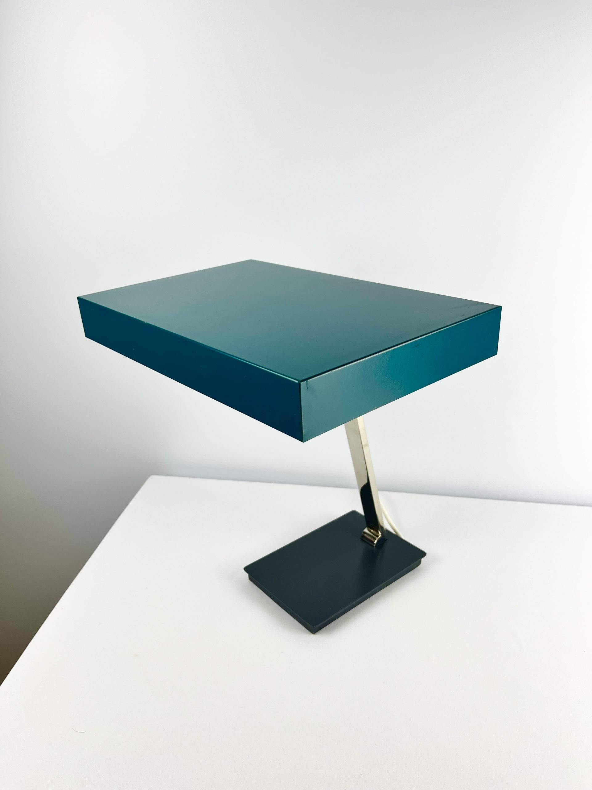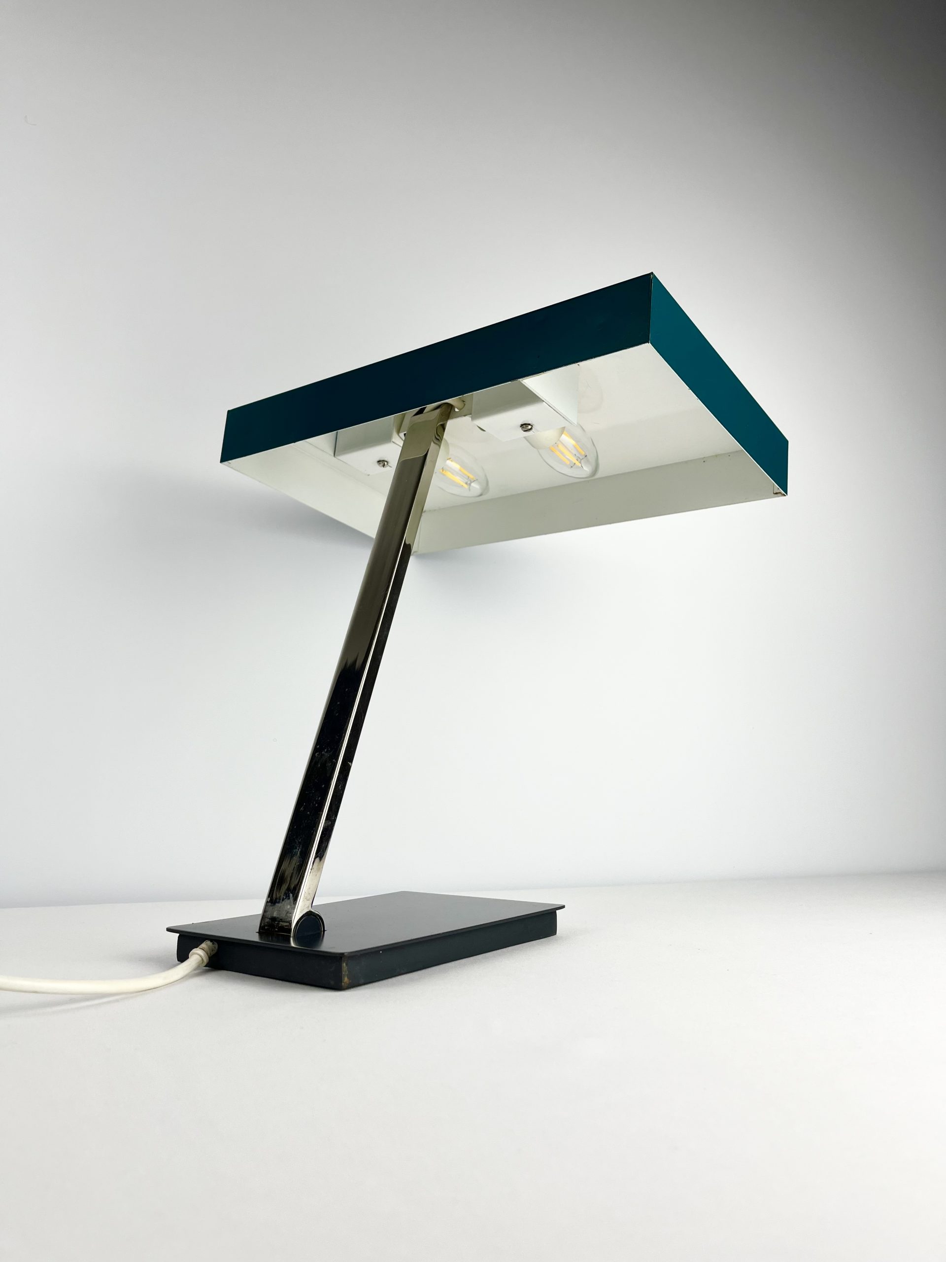 This large lamp is a Model 6874 and I believe it was designed by Klaus Hempel during the 1960s. Solidly constructed with a heavy black metal base, adjustable chrome neck and teal coloured metal shade, it features dual bulb holders and comes in a classic stripped-down Bauhaus design!