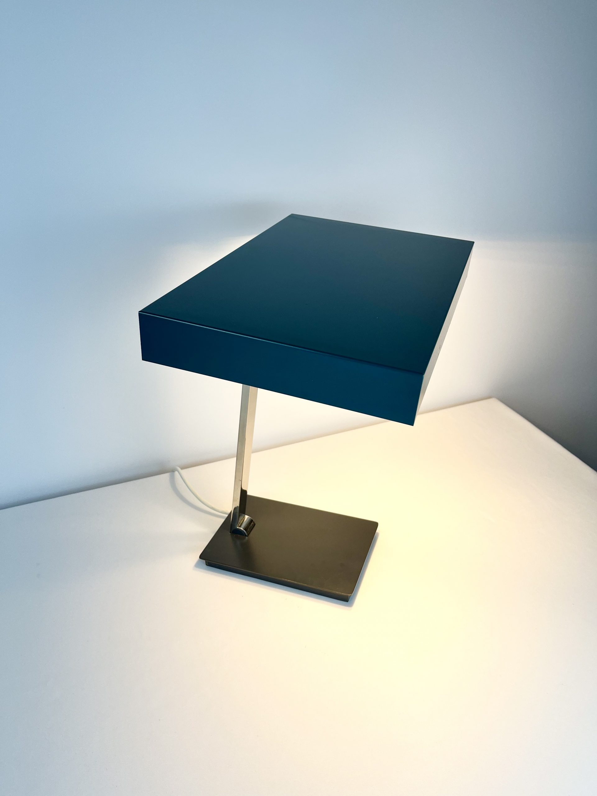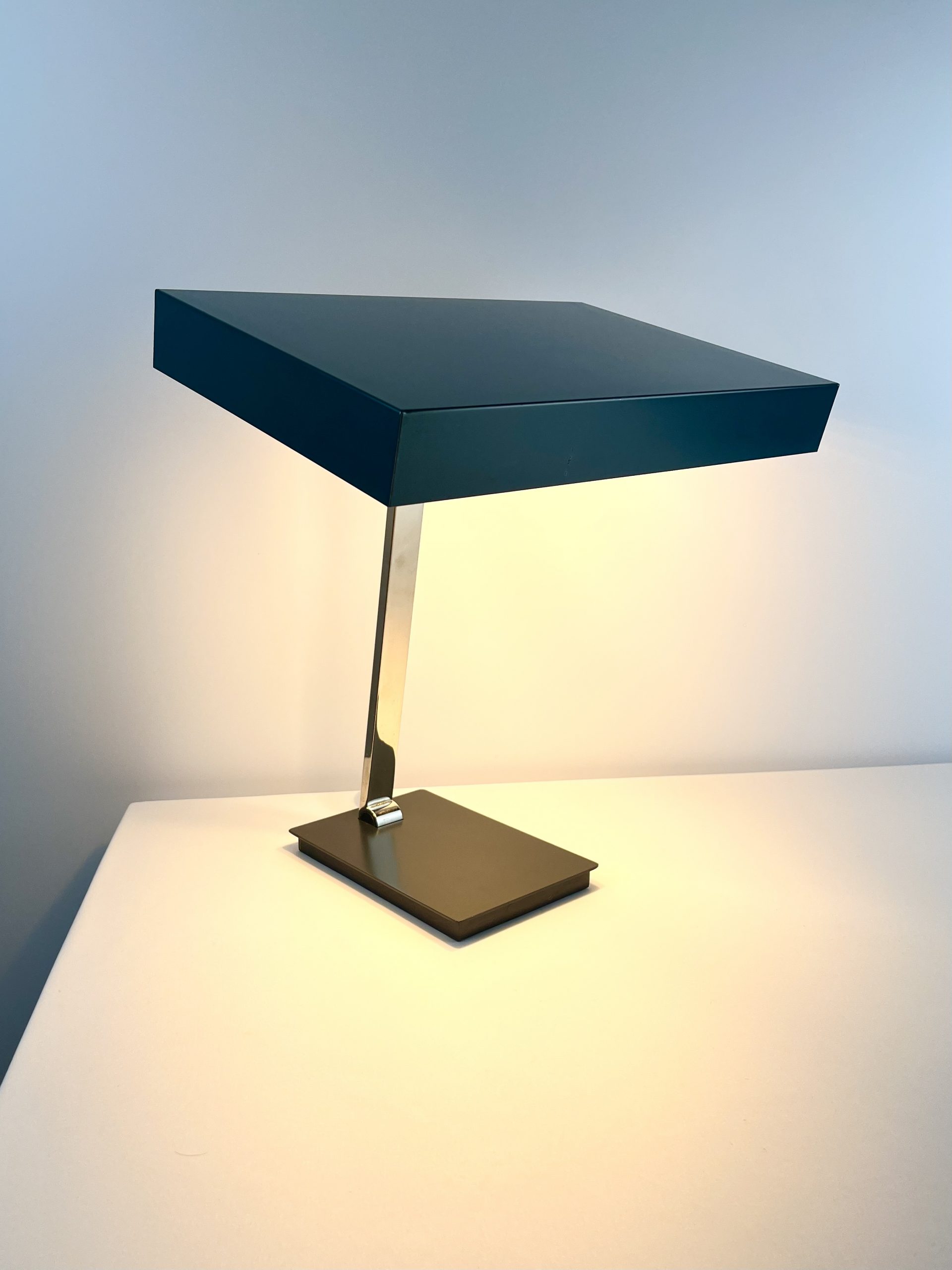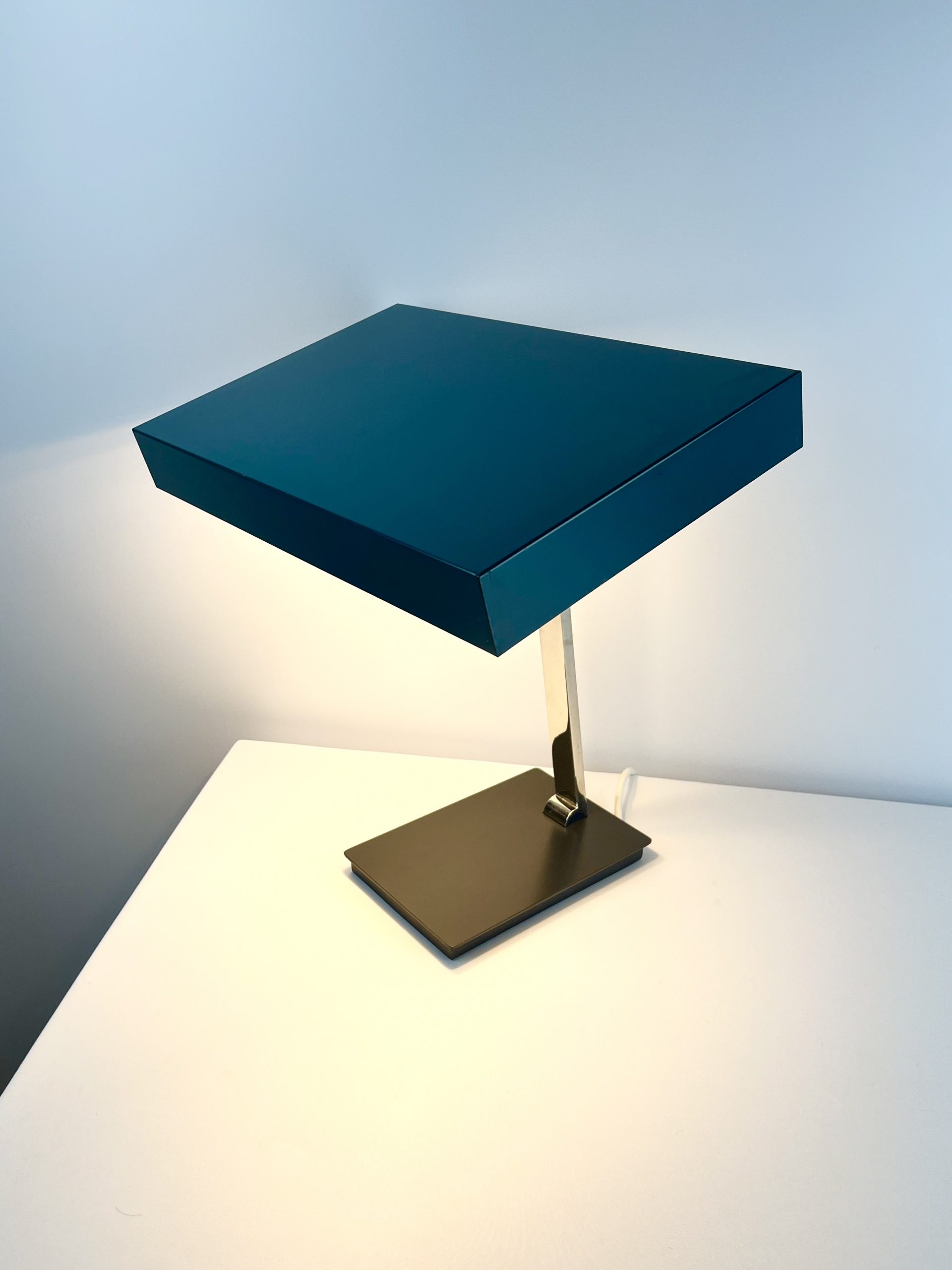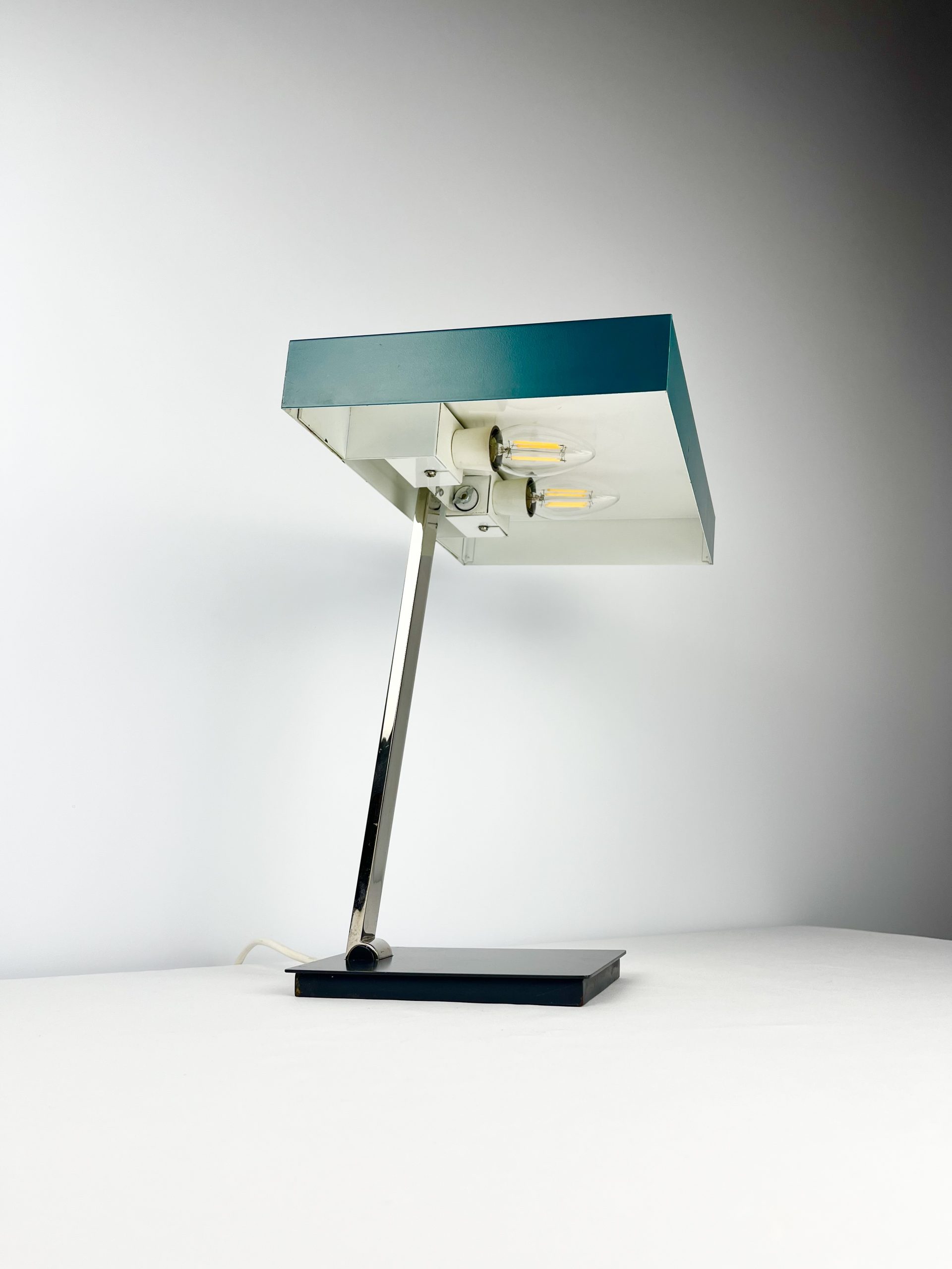 This large lamp is a Model 6874 and I believe it was designed by Klaus Hempel during the 1960s. Solidly constructed with a heavy black metal base, adjustable chrome neck and teal coloured metal shade, it features dual bulb holders and comes in a classic stripped-down Bauhaus design!