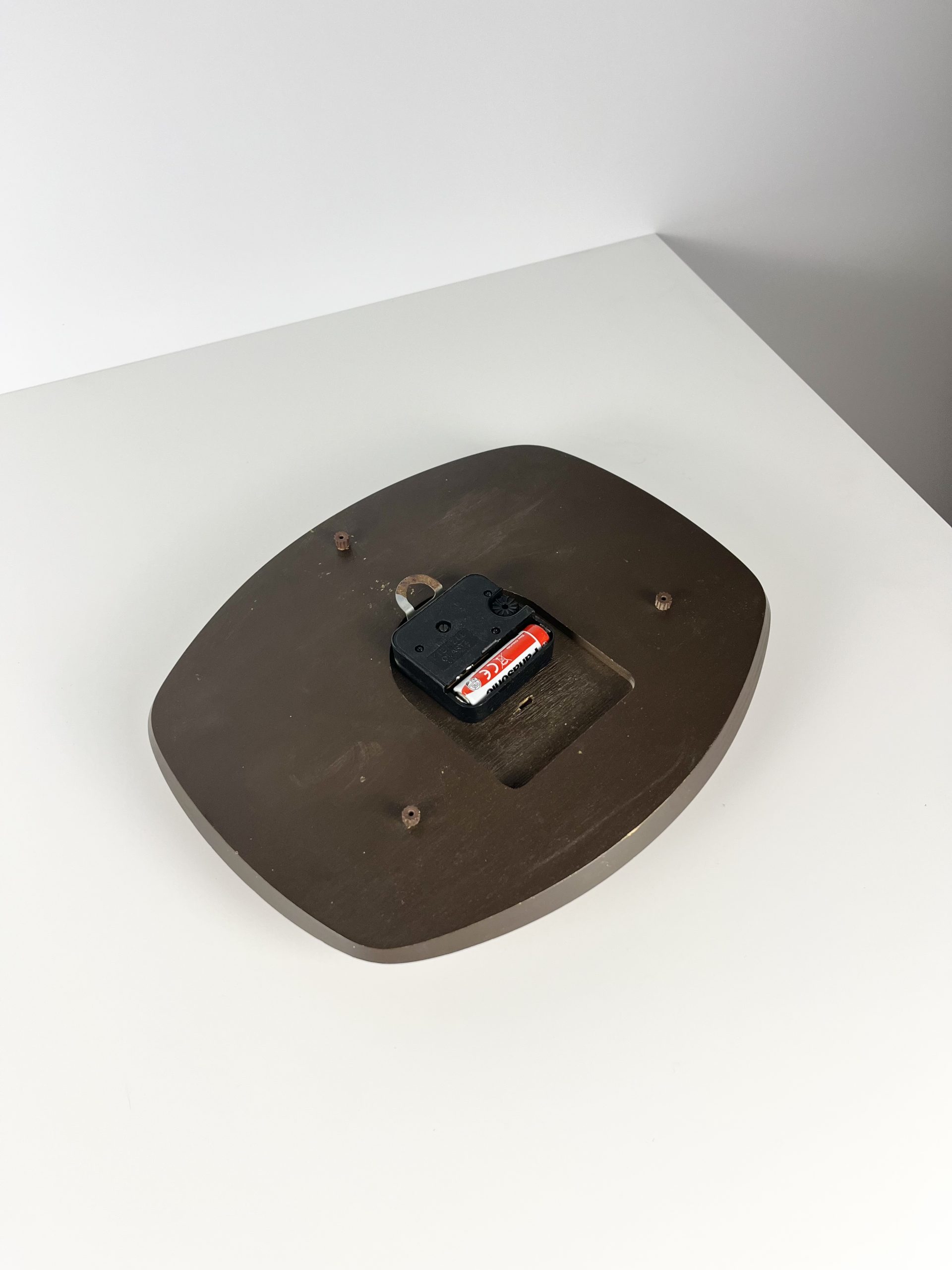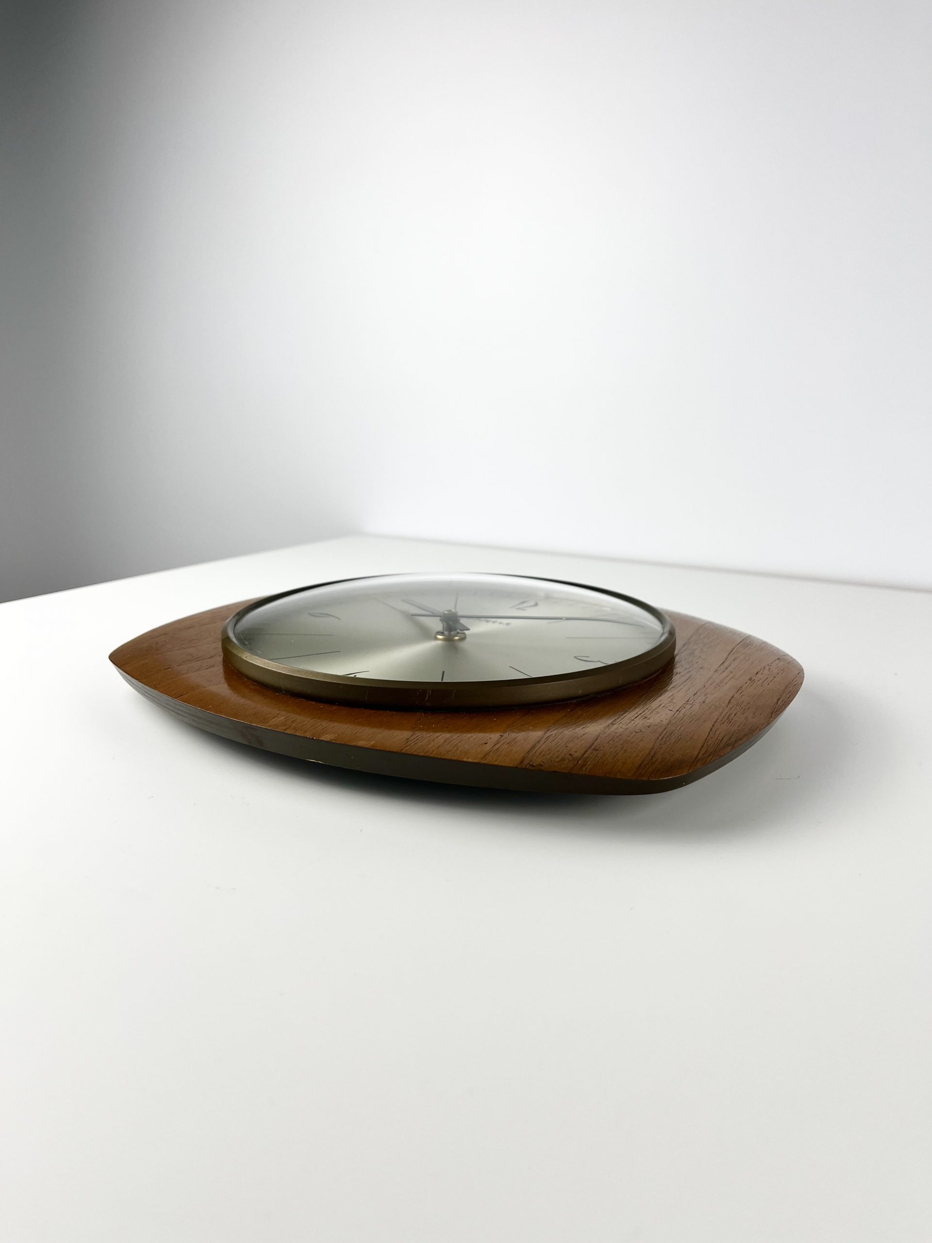 Teak with an aluminium face and stylised font, framed by a patinaed brass surround, it comes in very good vintage condition and is keeping time well!