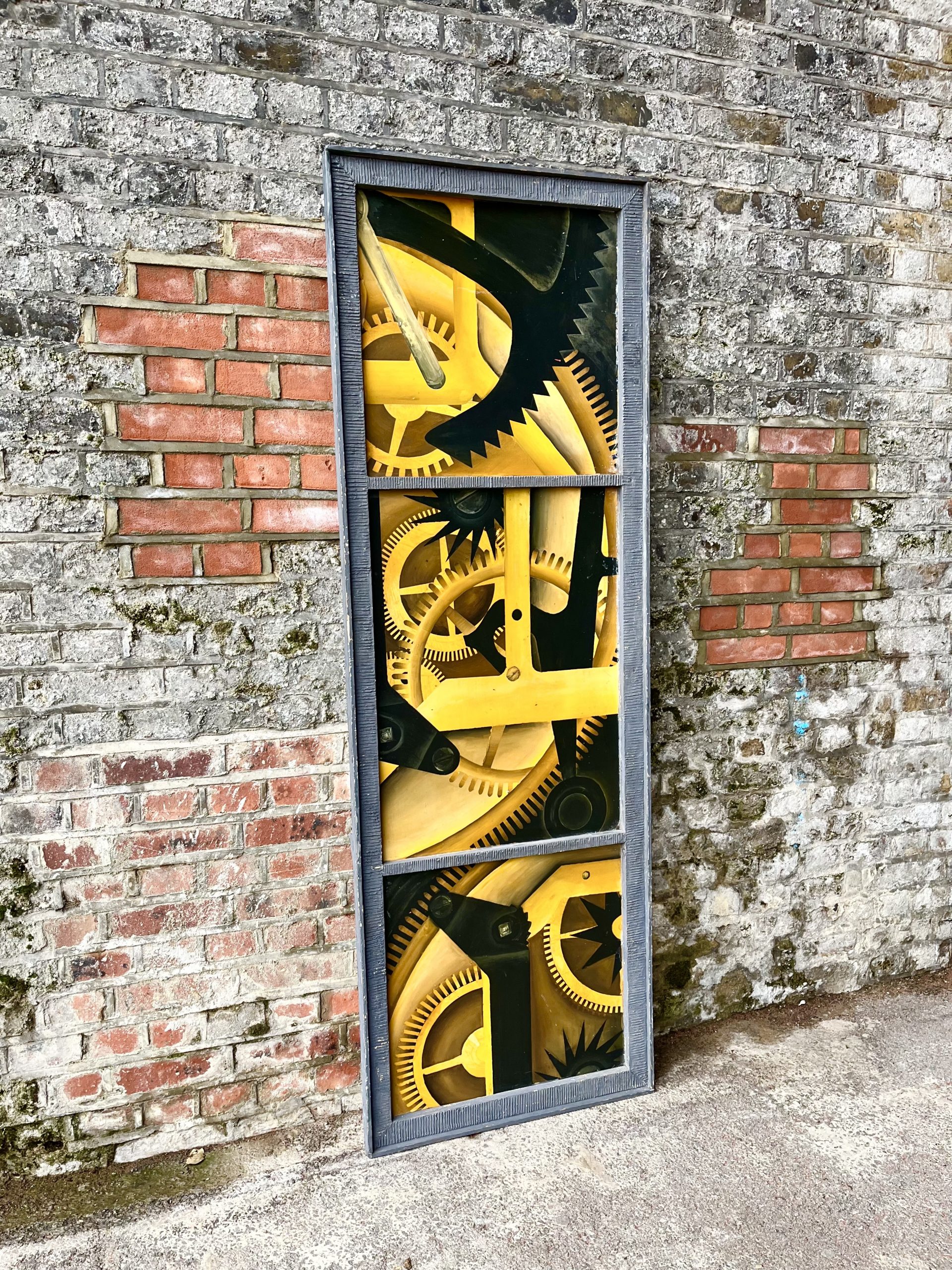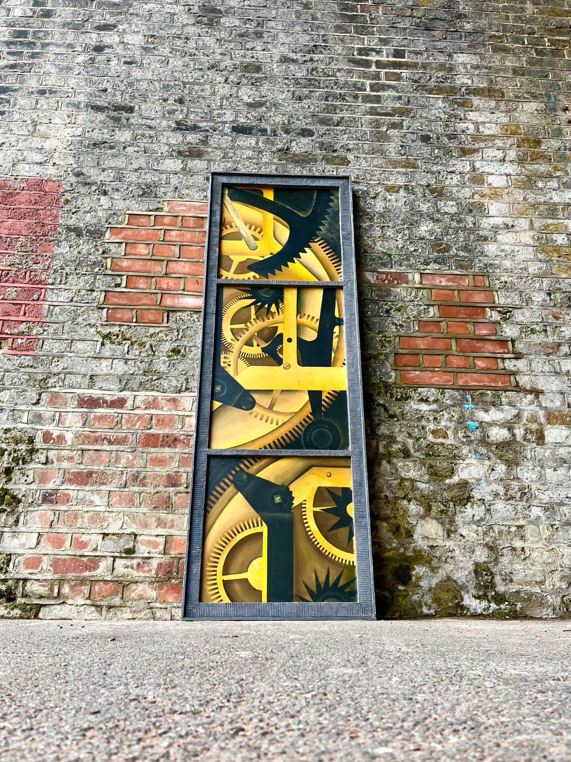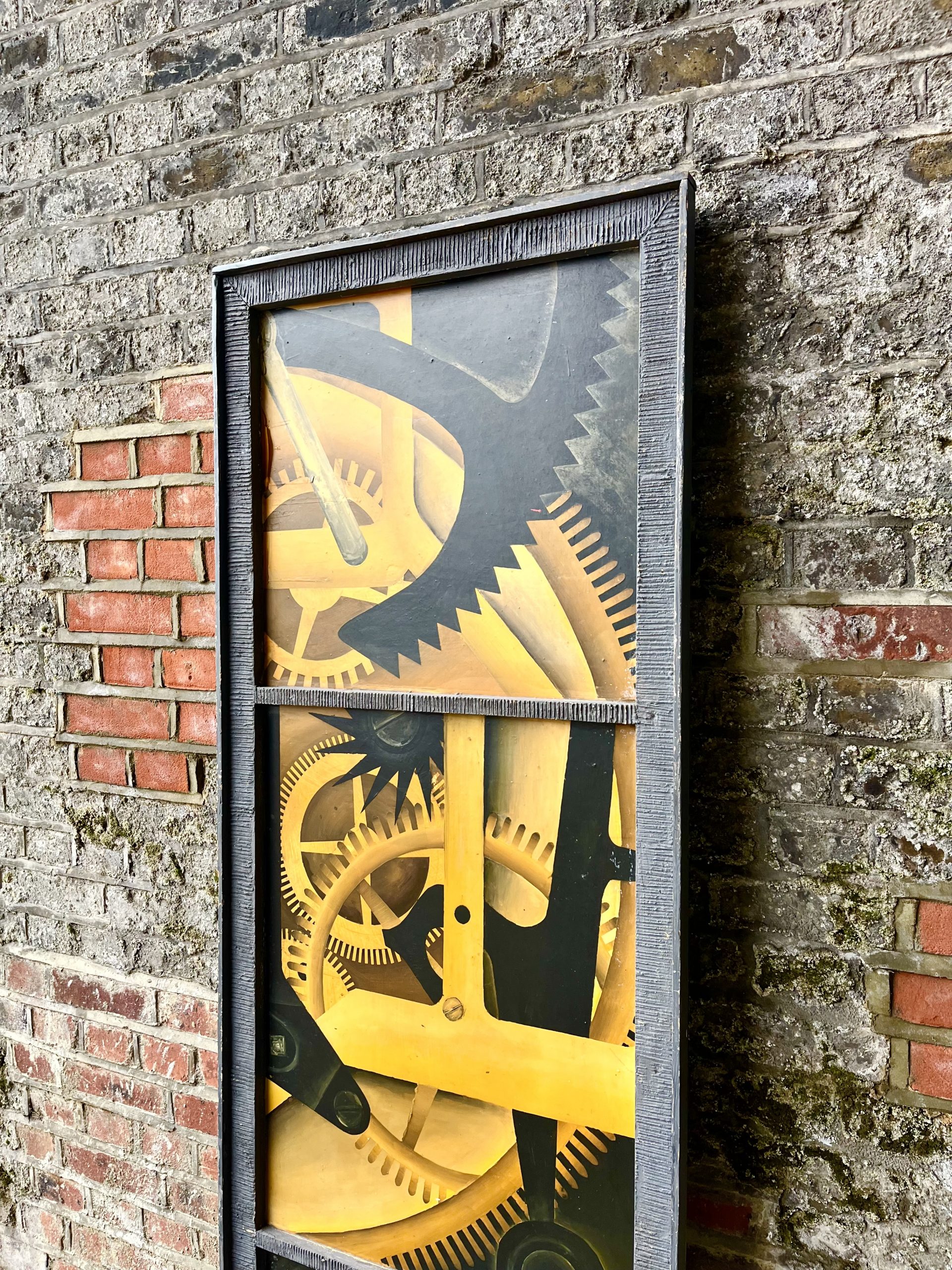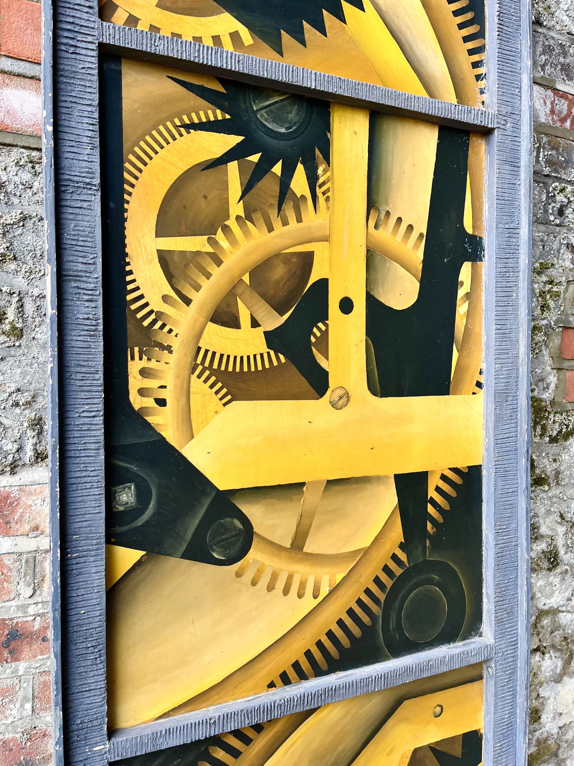 Likely dating from the 1950s and possibly a little earlier, the unknown artist has scaled up the inner workings of a clock with what I believe to be acrylic paint on hardboard panels, and then mounted them in a somewhat rough and ready wooden frame.