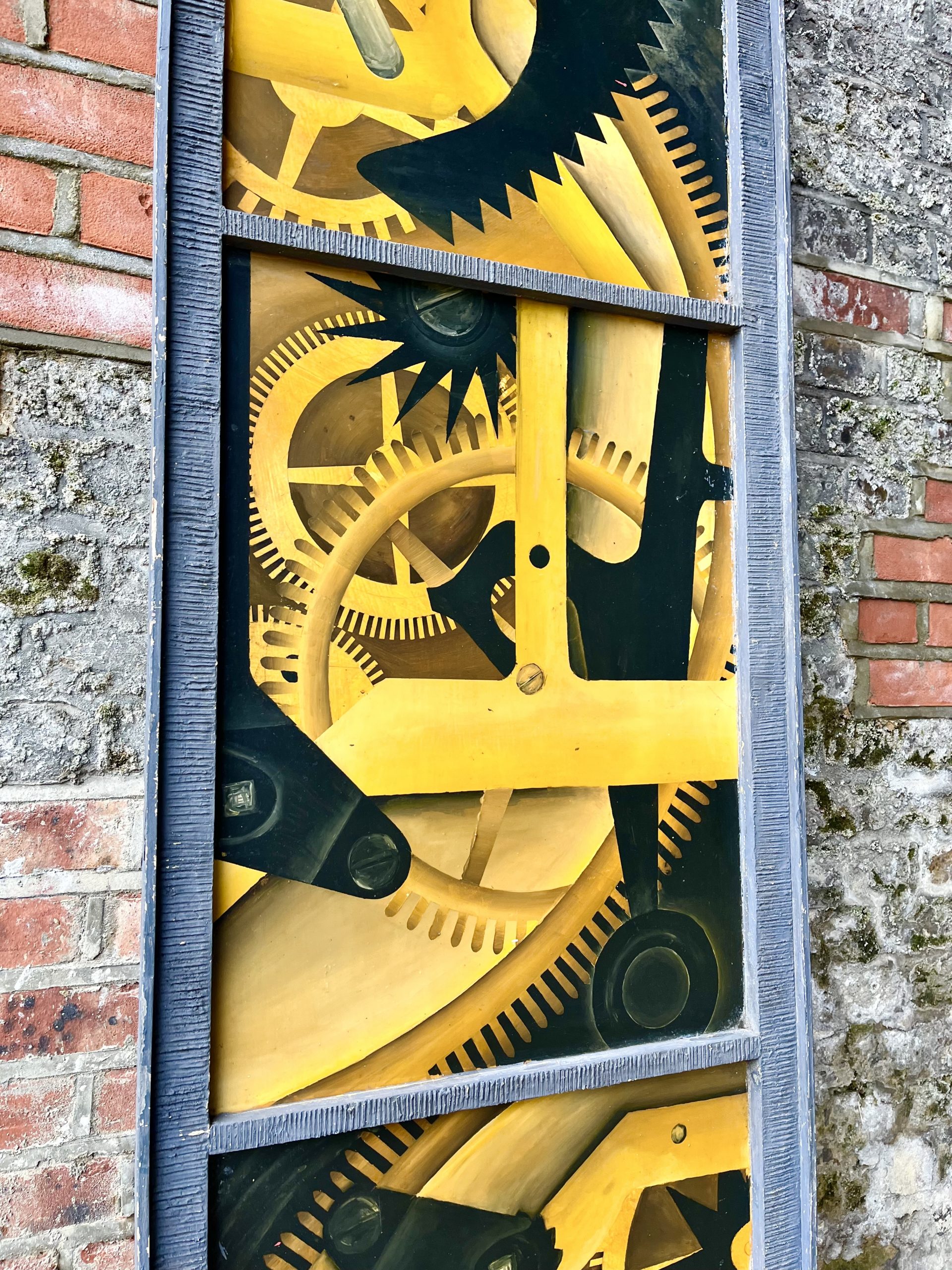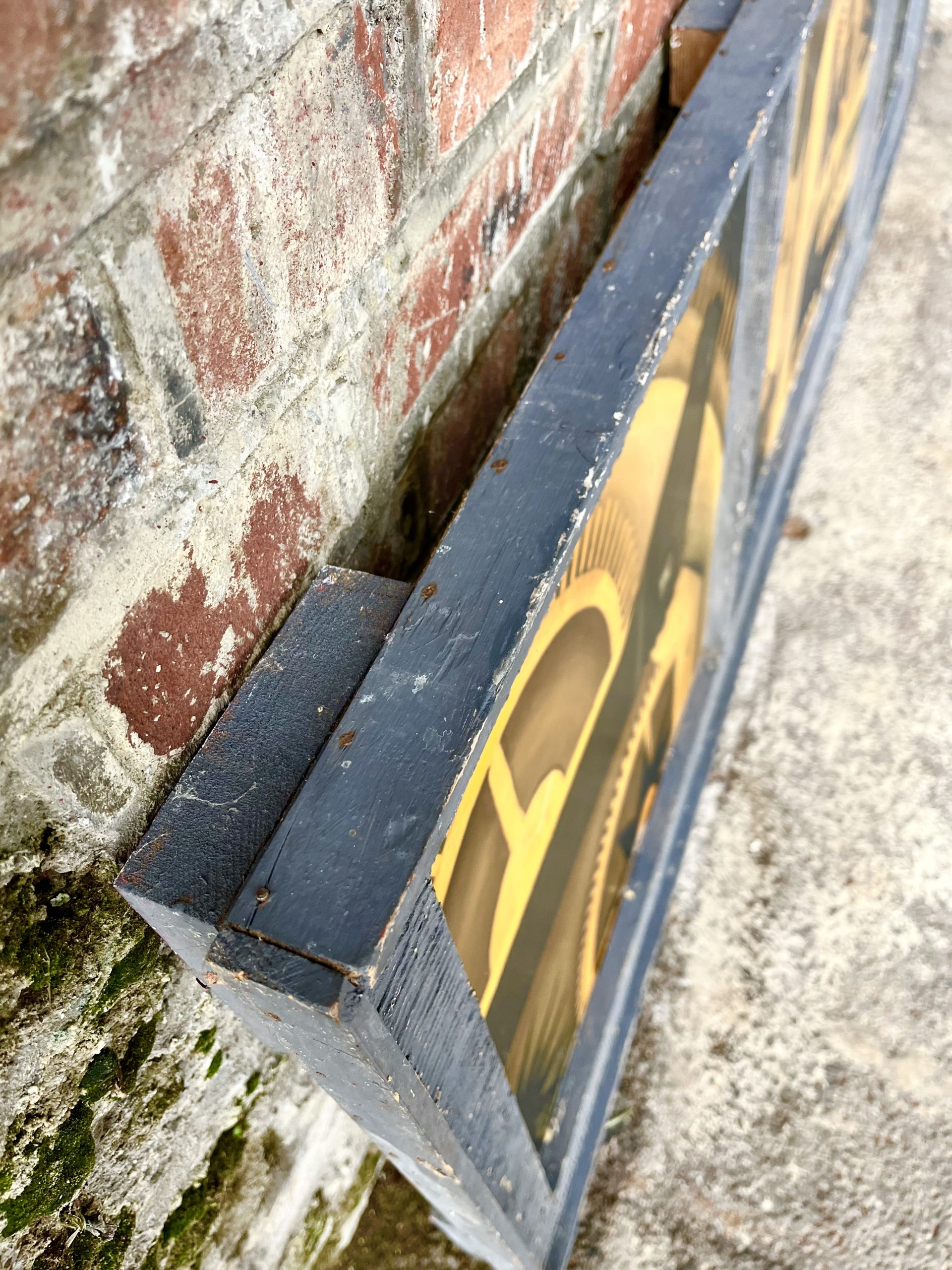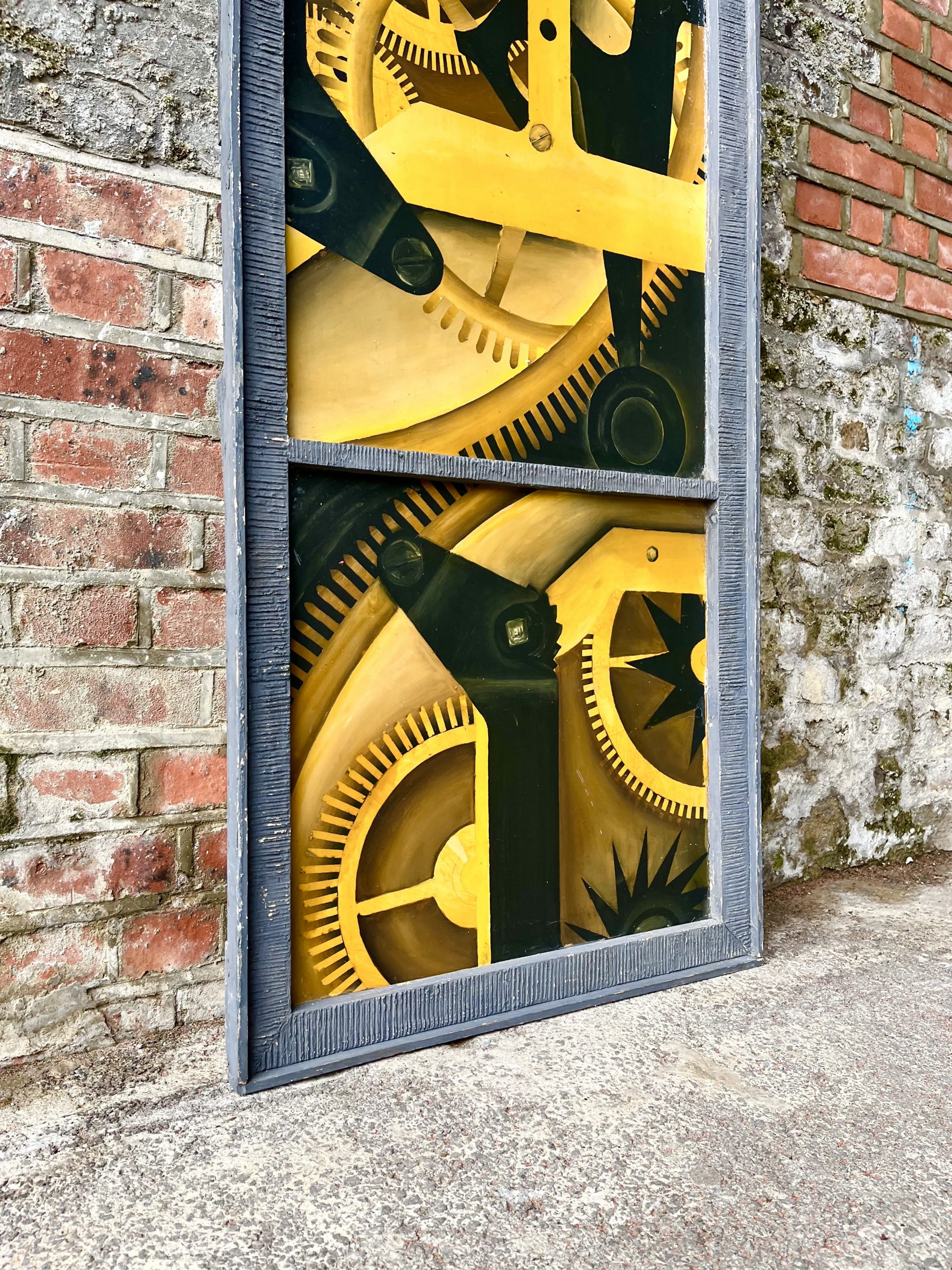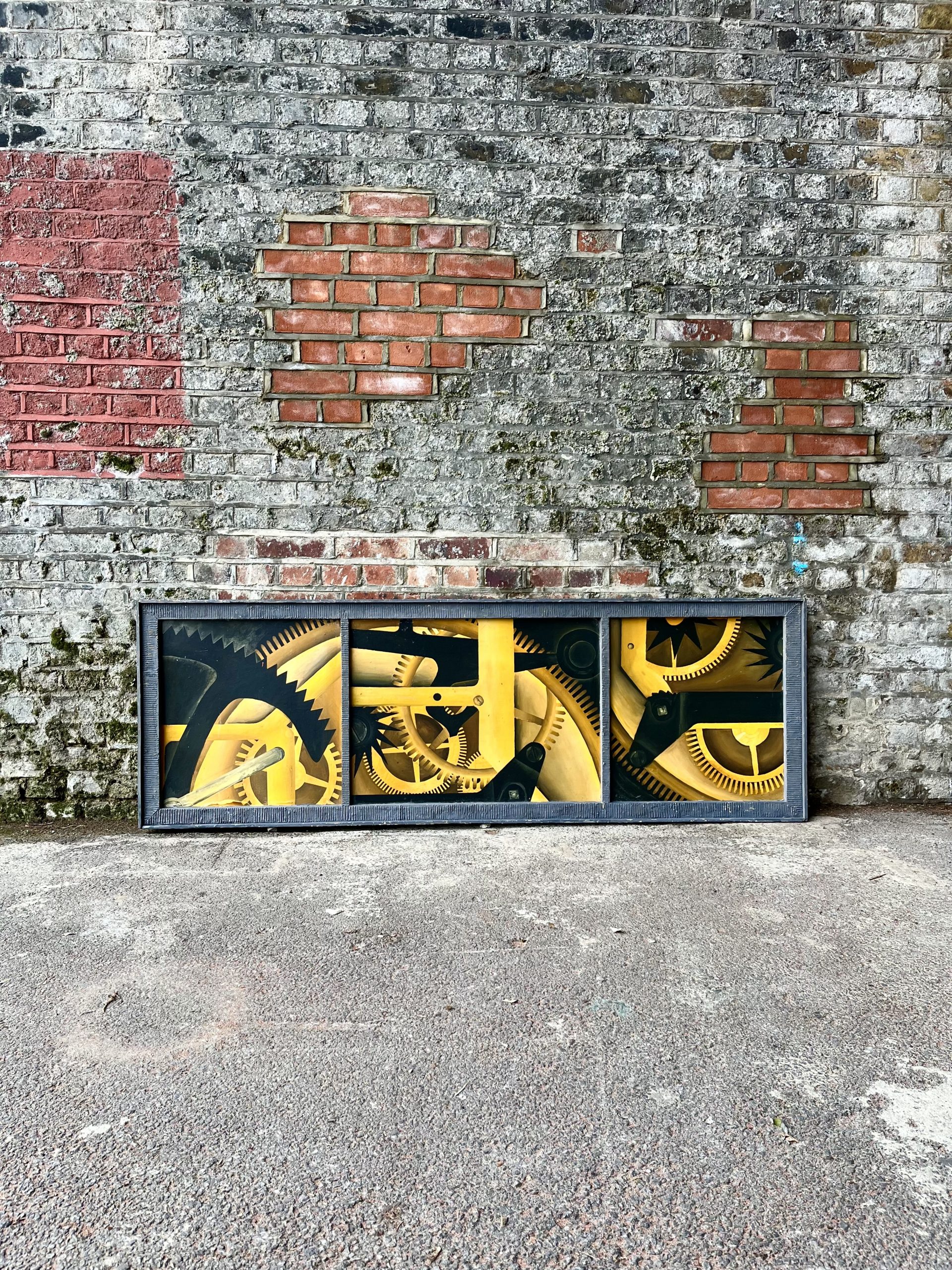 Likely dating from the 1950s and possibly a little earlier, the unknown artist has scaled up the inner workings of a clock with what I believe to be acrylic paint on hardboard panels, and then mounted them in a somewhat rough and ready wooden frame.