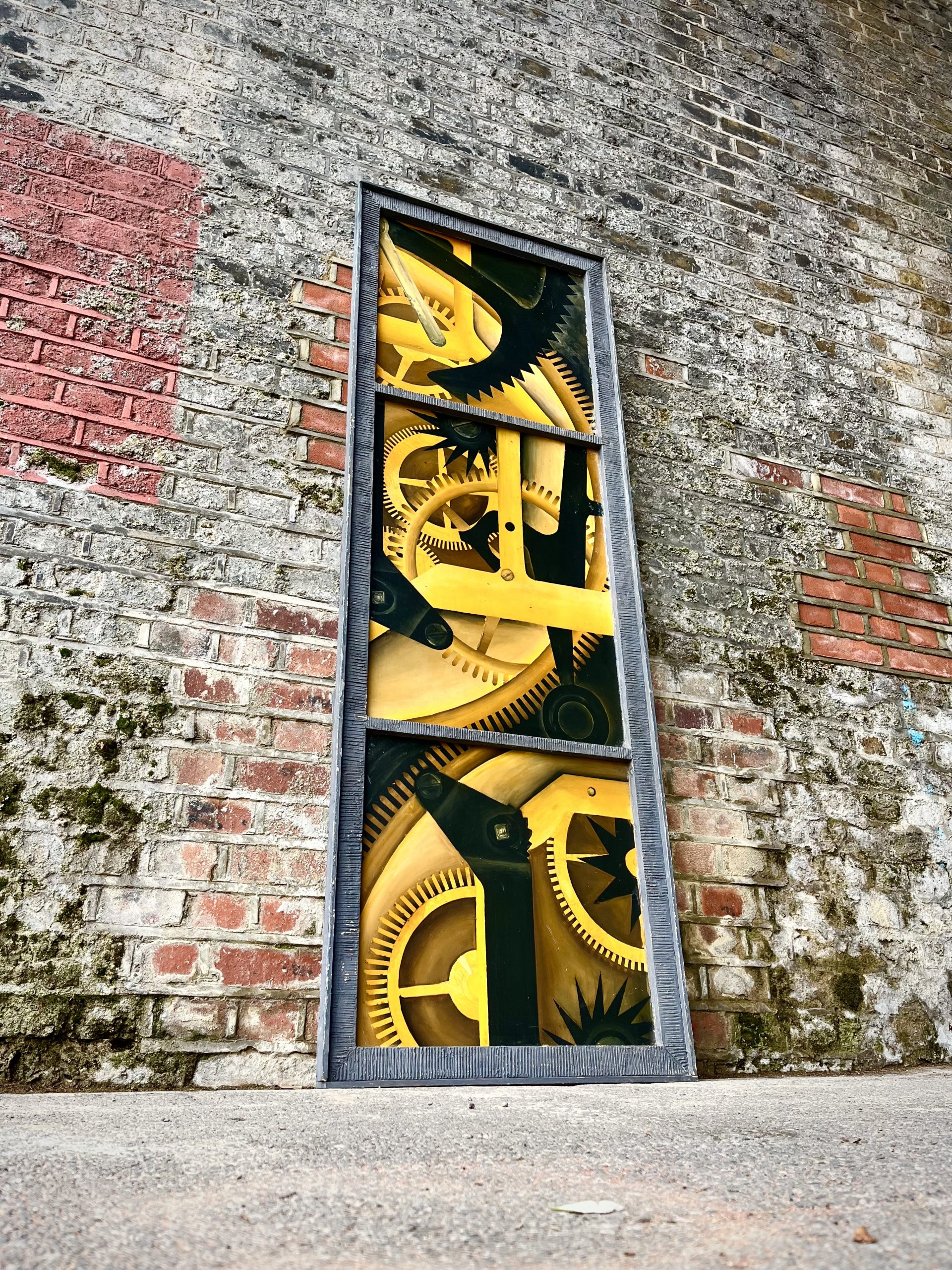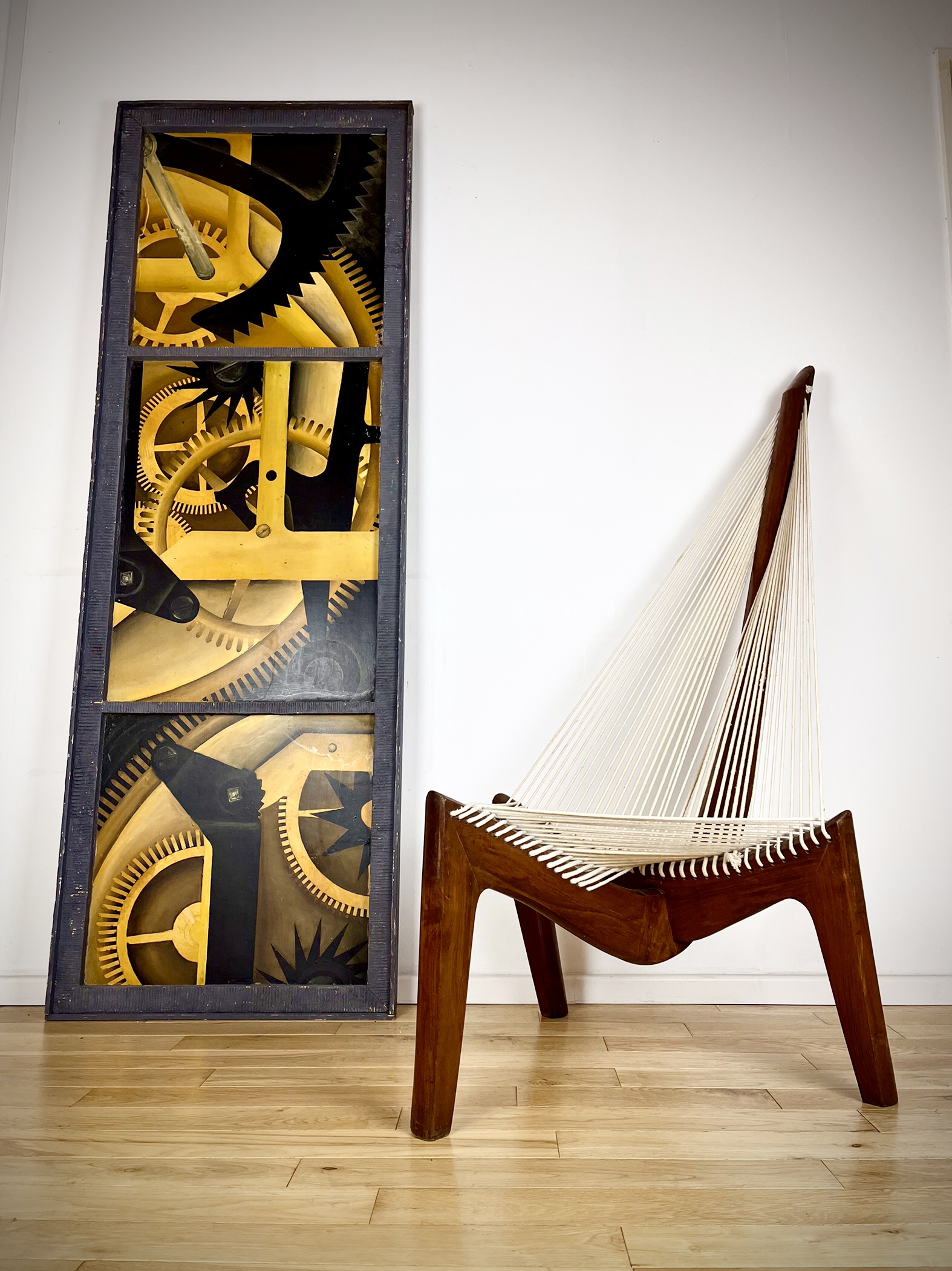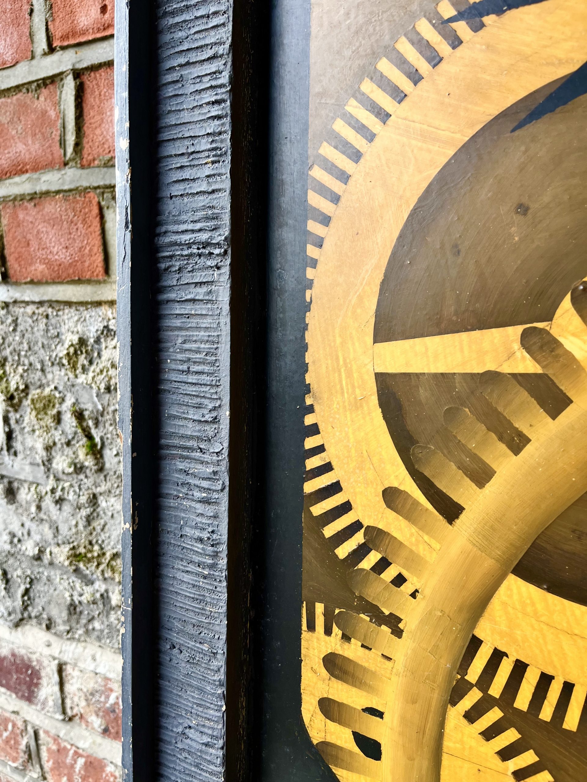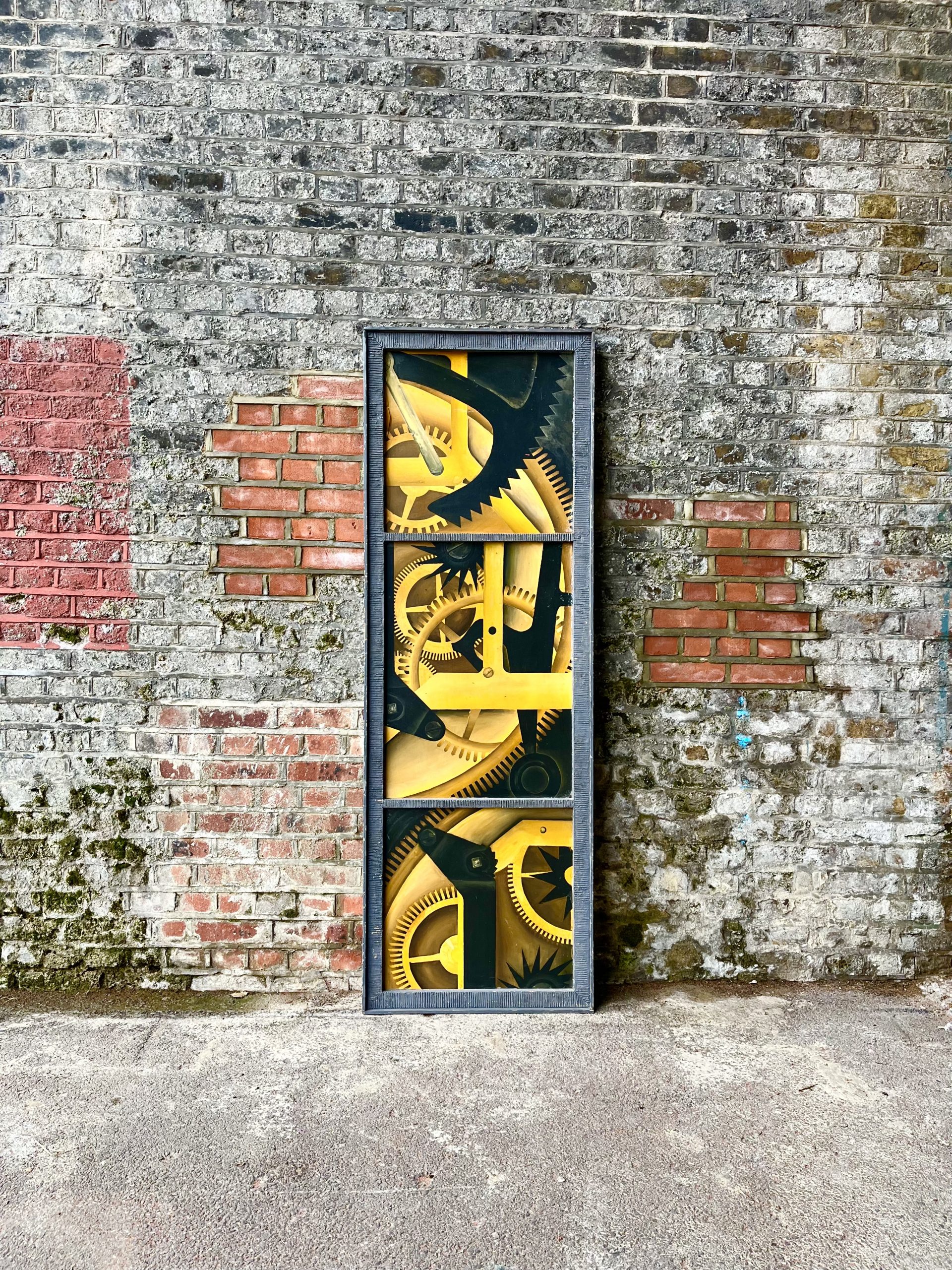 Likely dating from the 1950s and possibly a little earlier, the unknown artist has scaled up the inner workings of a clock with what I believe to be acrylic paint on hardboard panels, and then mounted them in a somewhat rough and ready wooden frame.