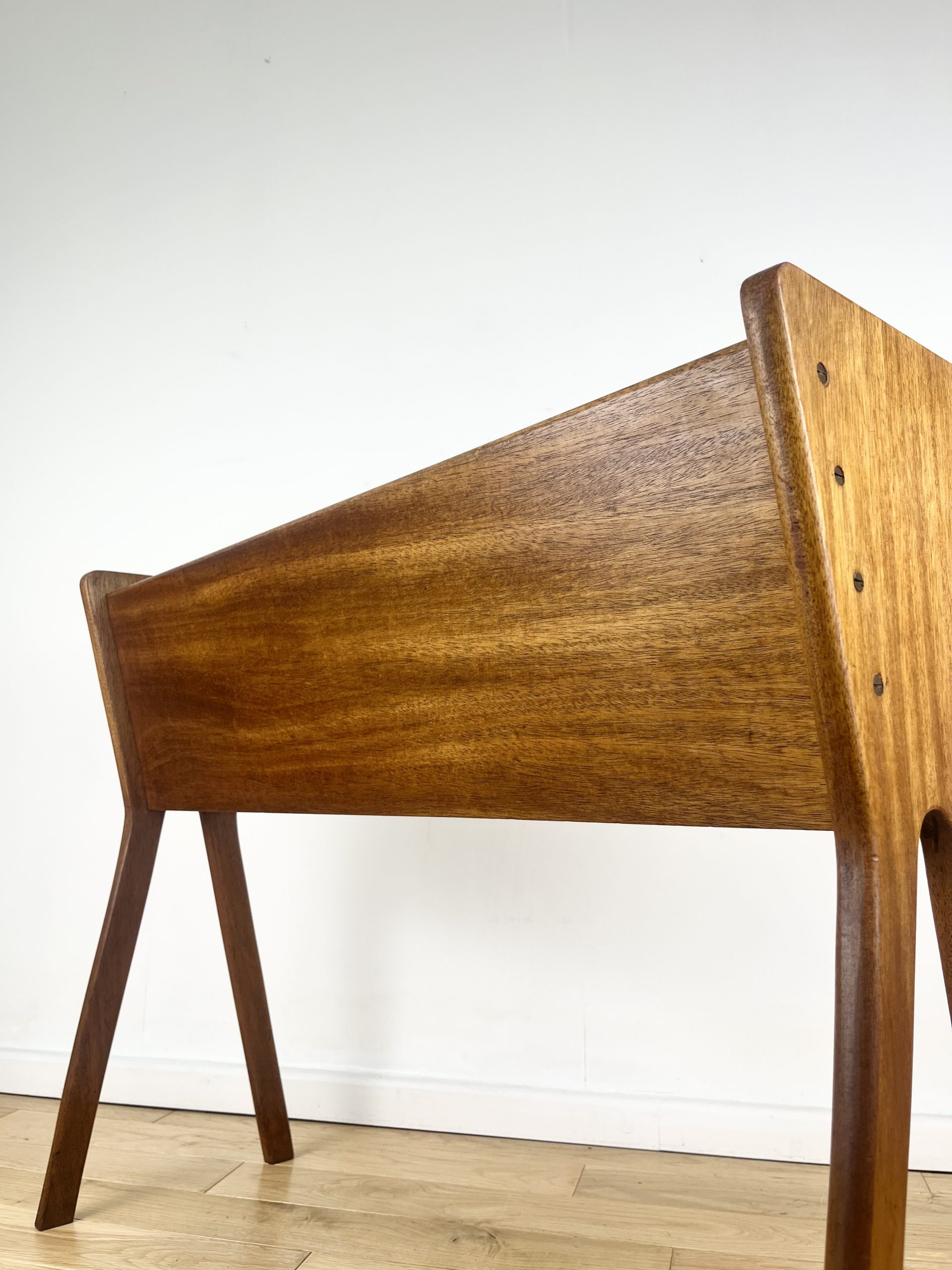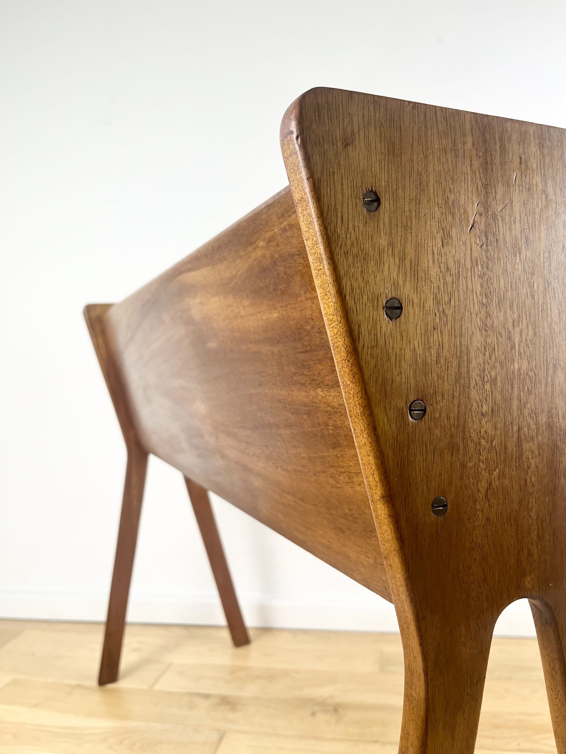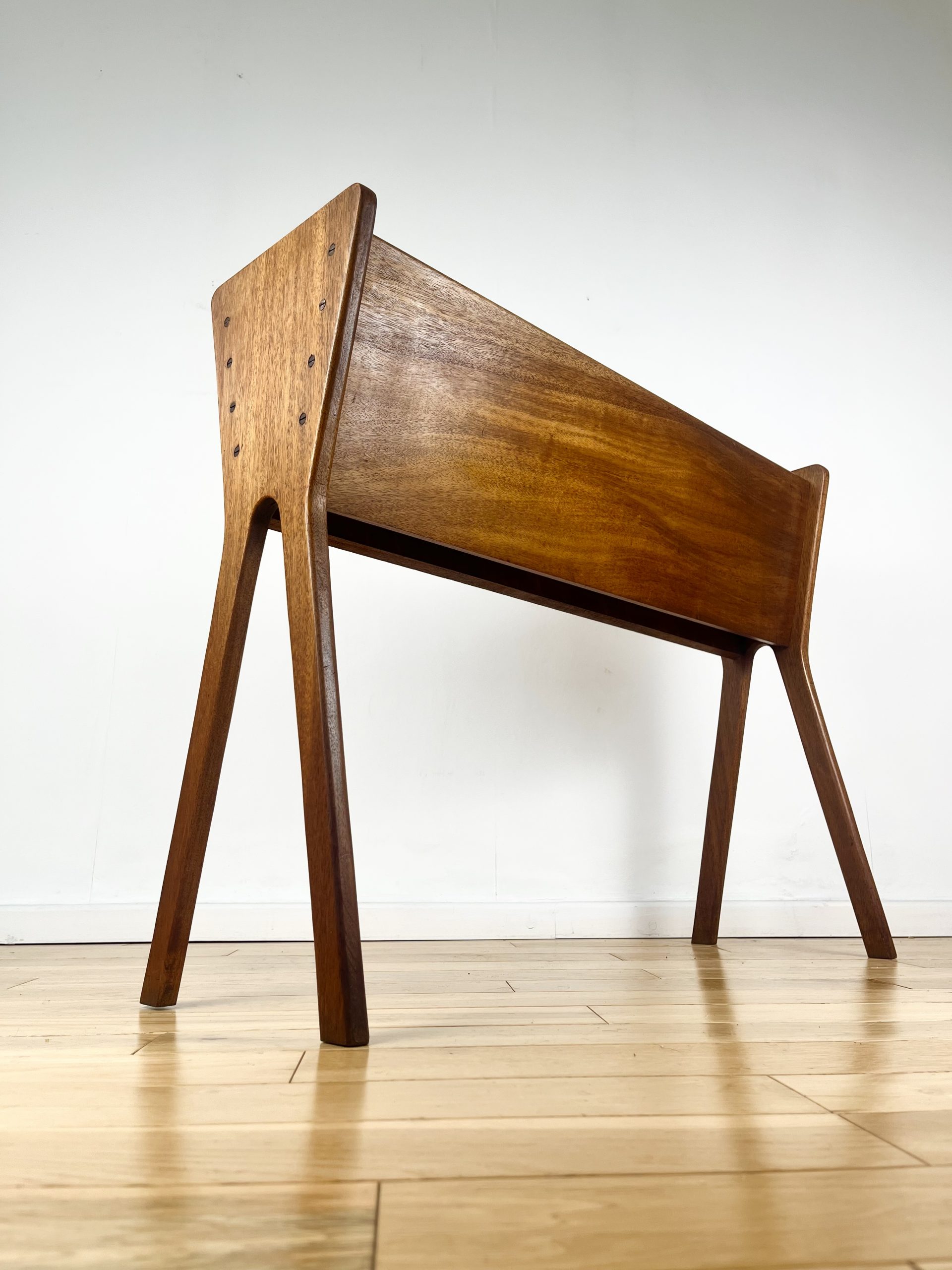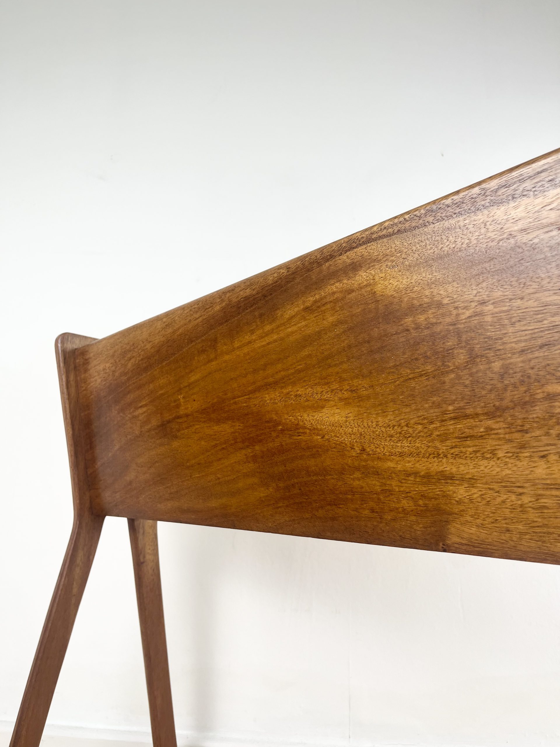 Two solid wood lengths raised on shapely end sections are secured by 16 brass screws, resulting in this stripped-down, modernist look.