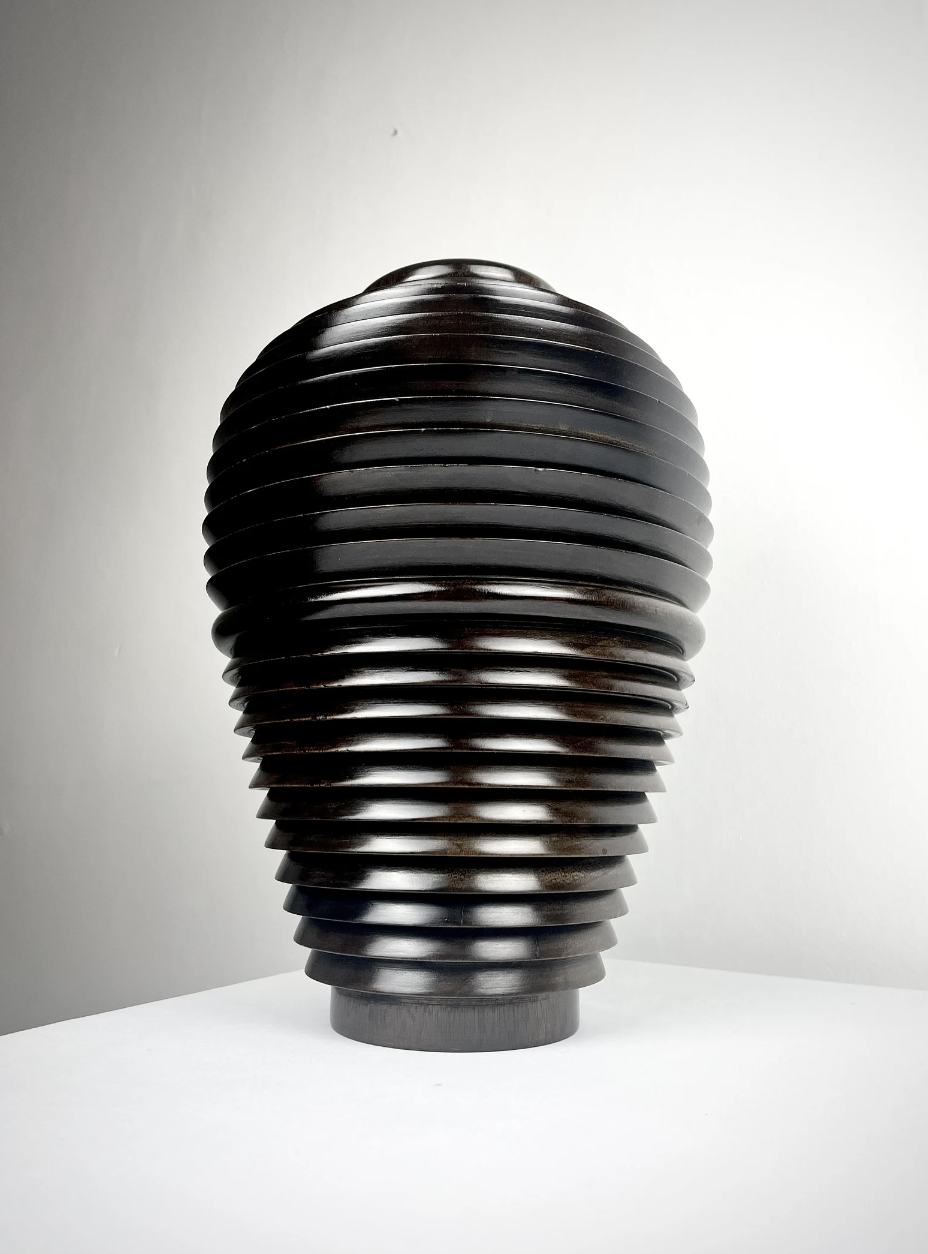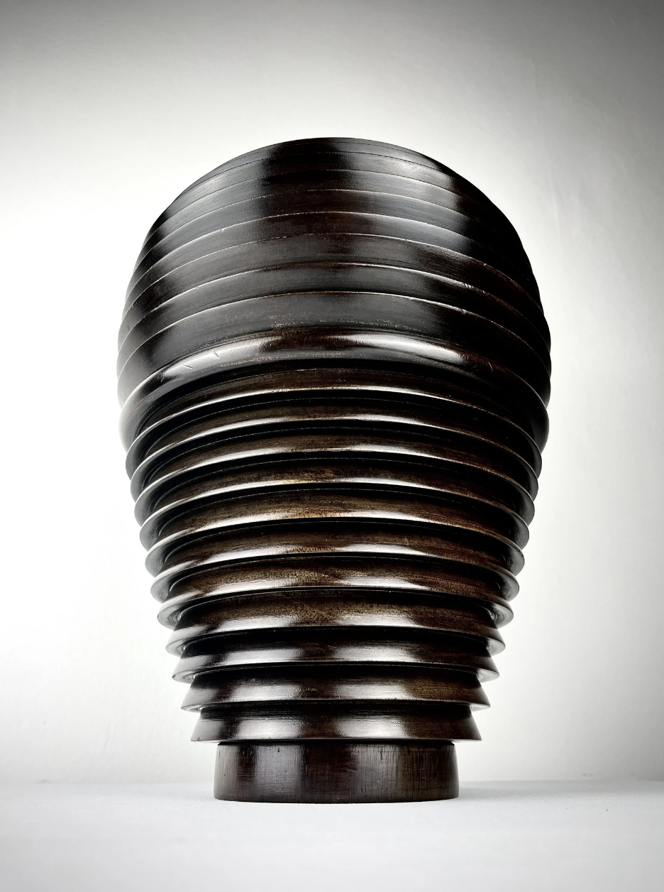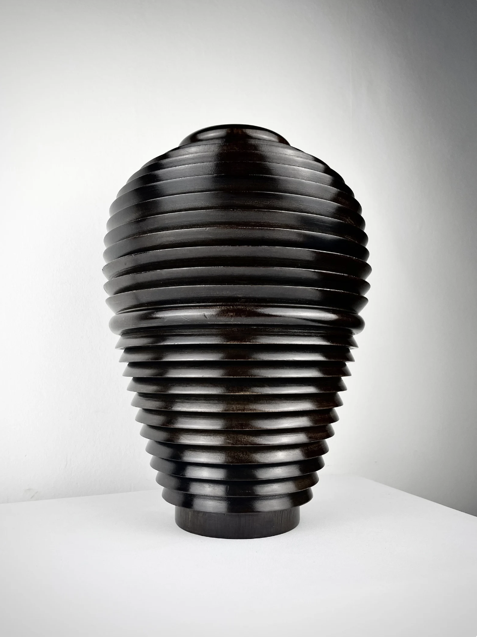 This large and spectacular beehive vase is made from dark lacquered wood, but has an almost Bakelite feel to it!