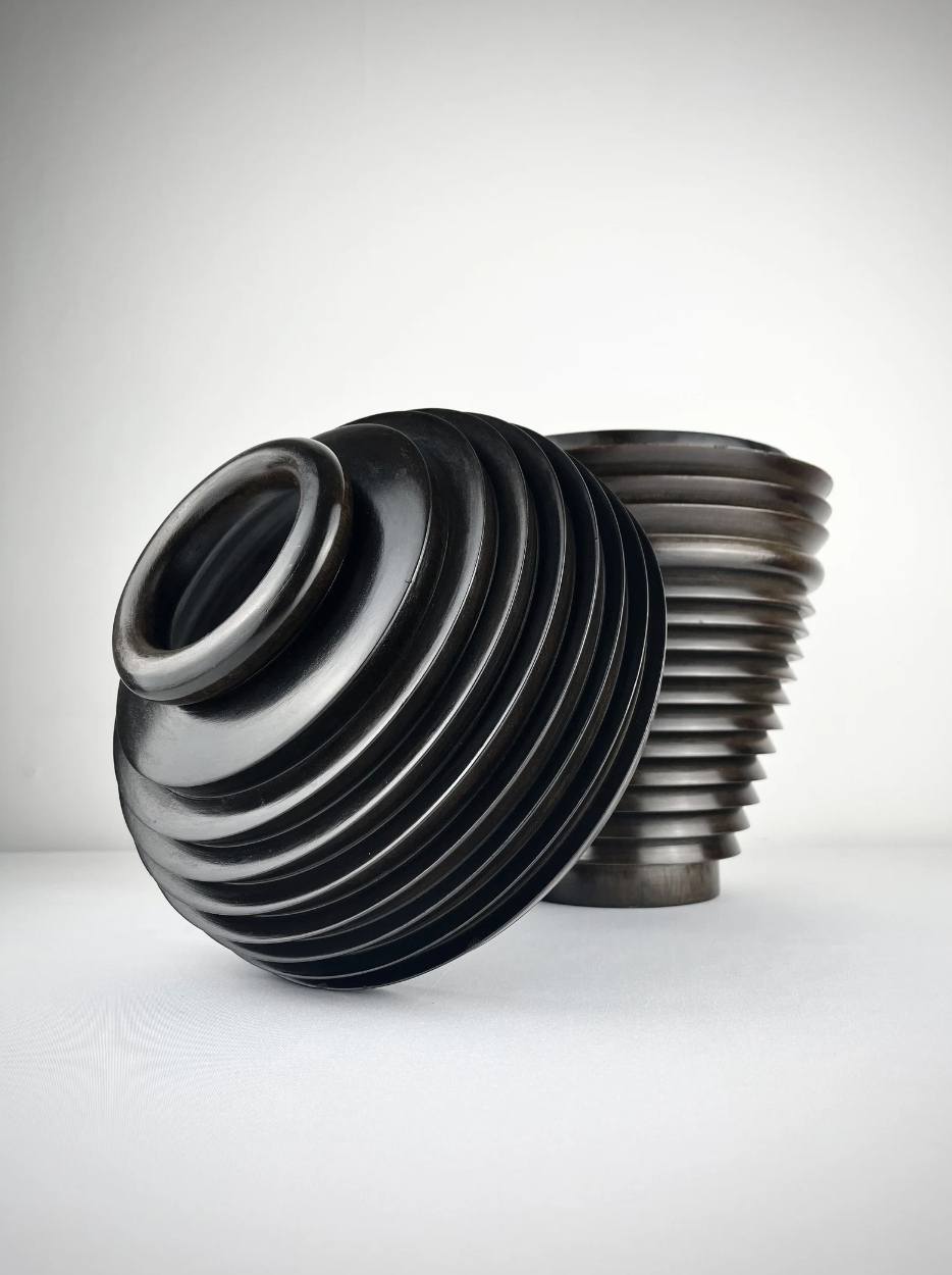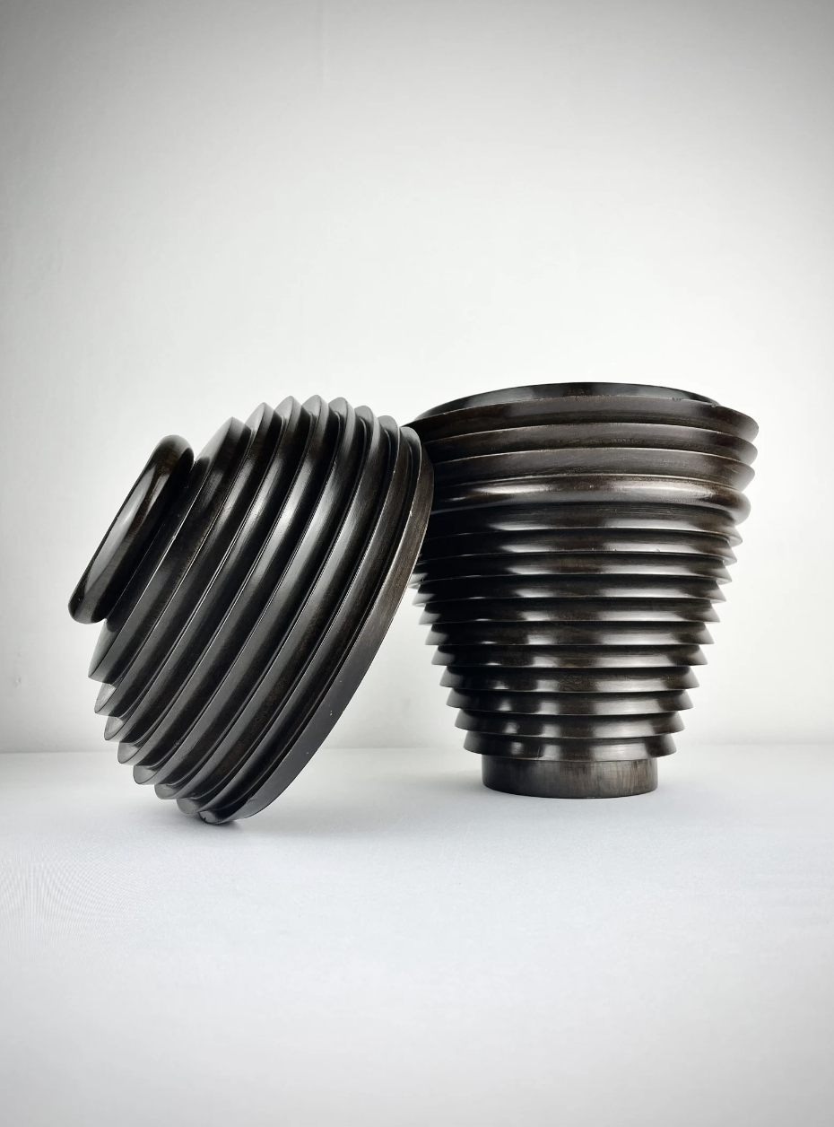 The vase comes in two detachable sections which have been skilfully turned on a lathe to achieve this awesome ribbed and geometric form.