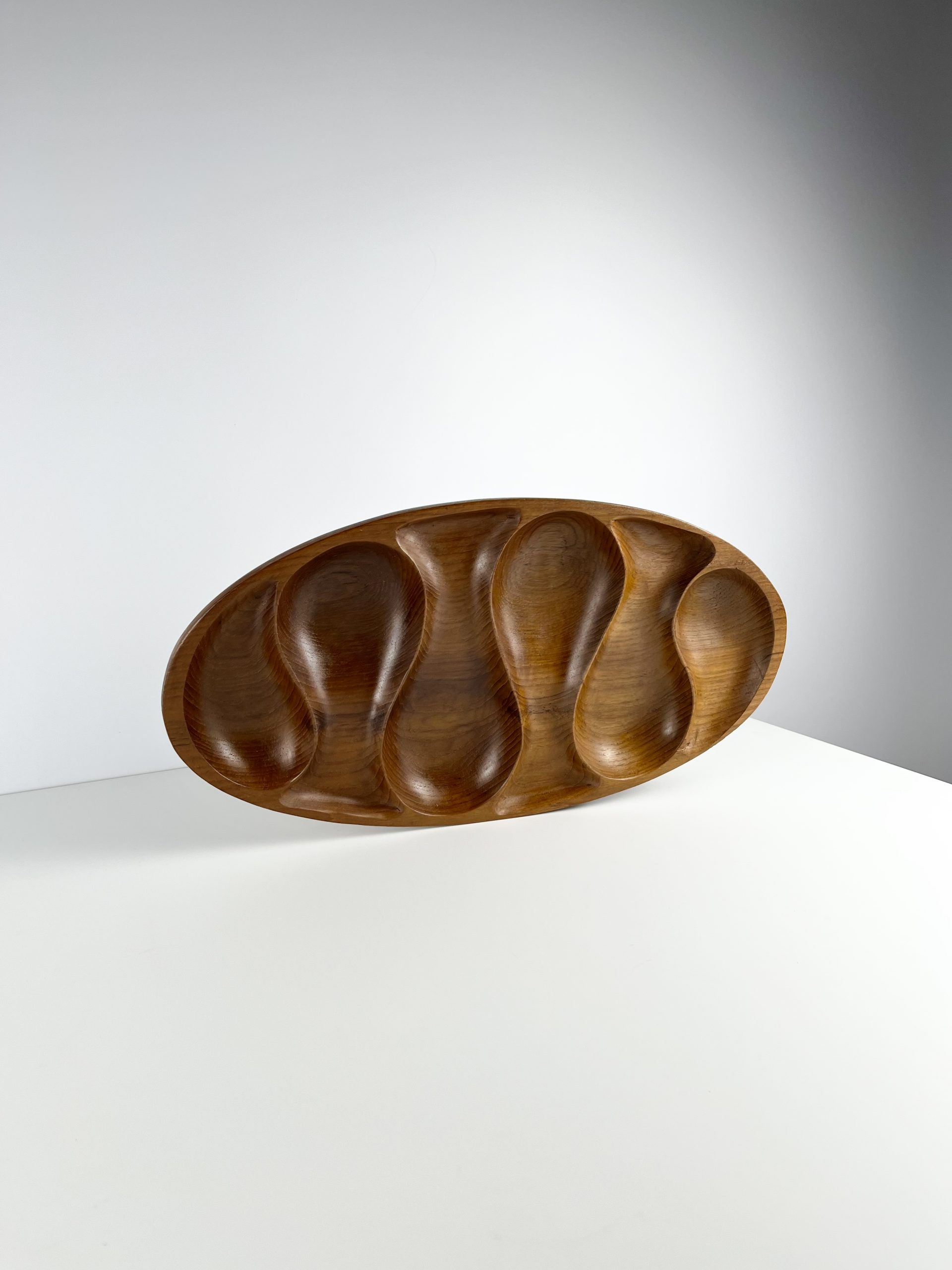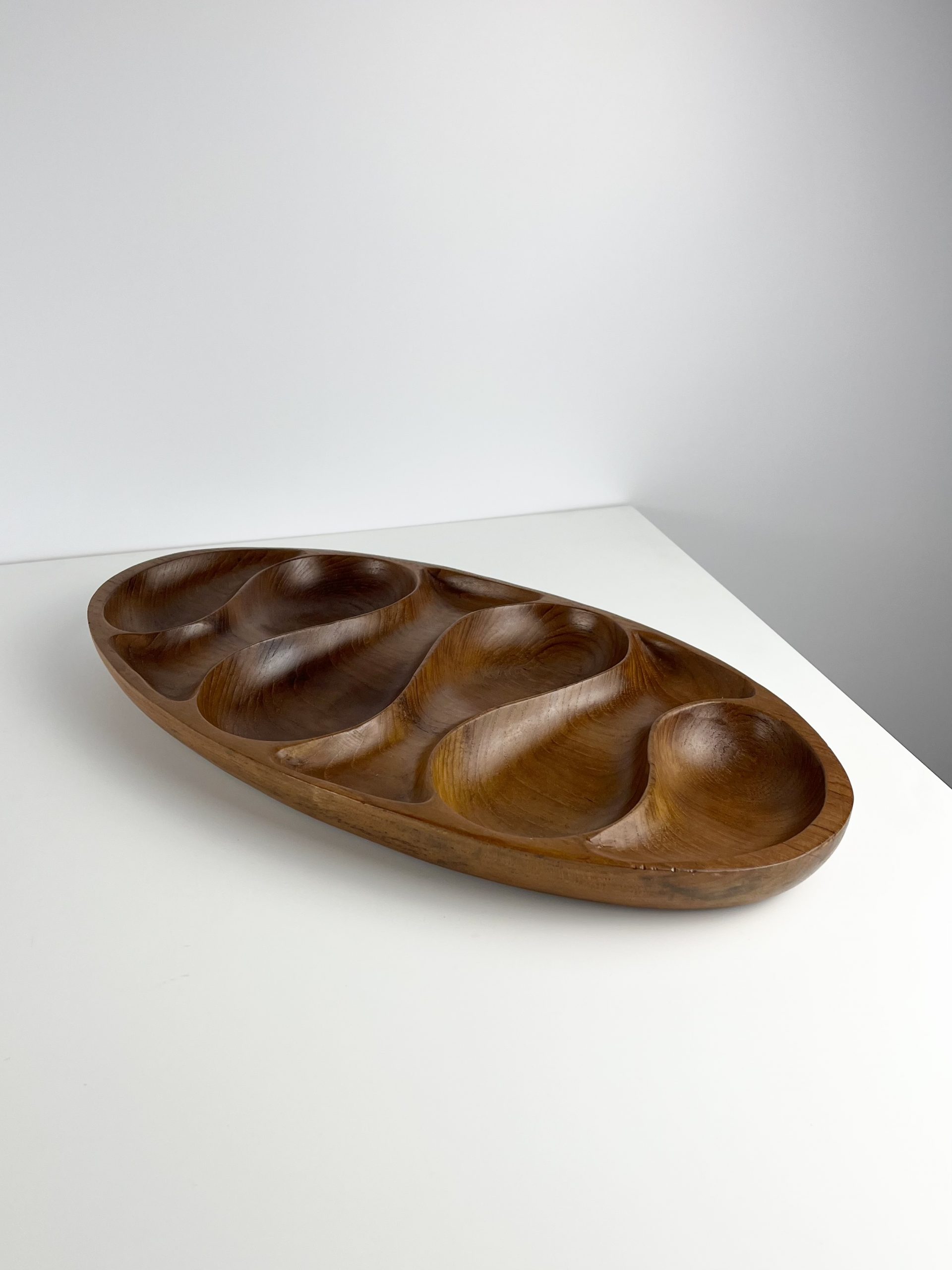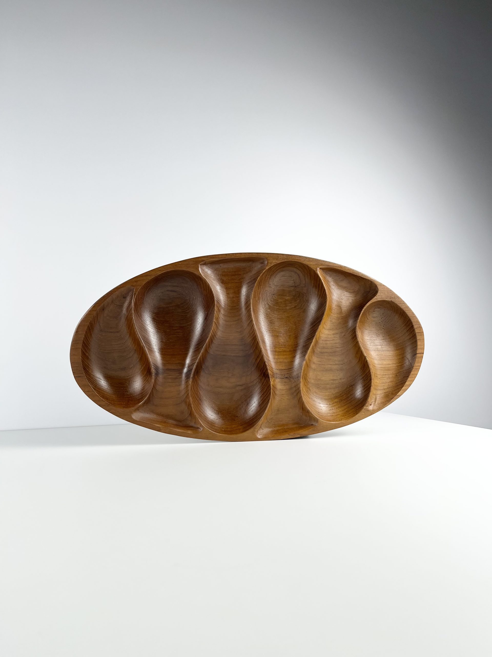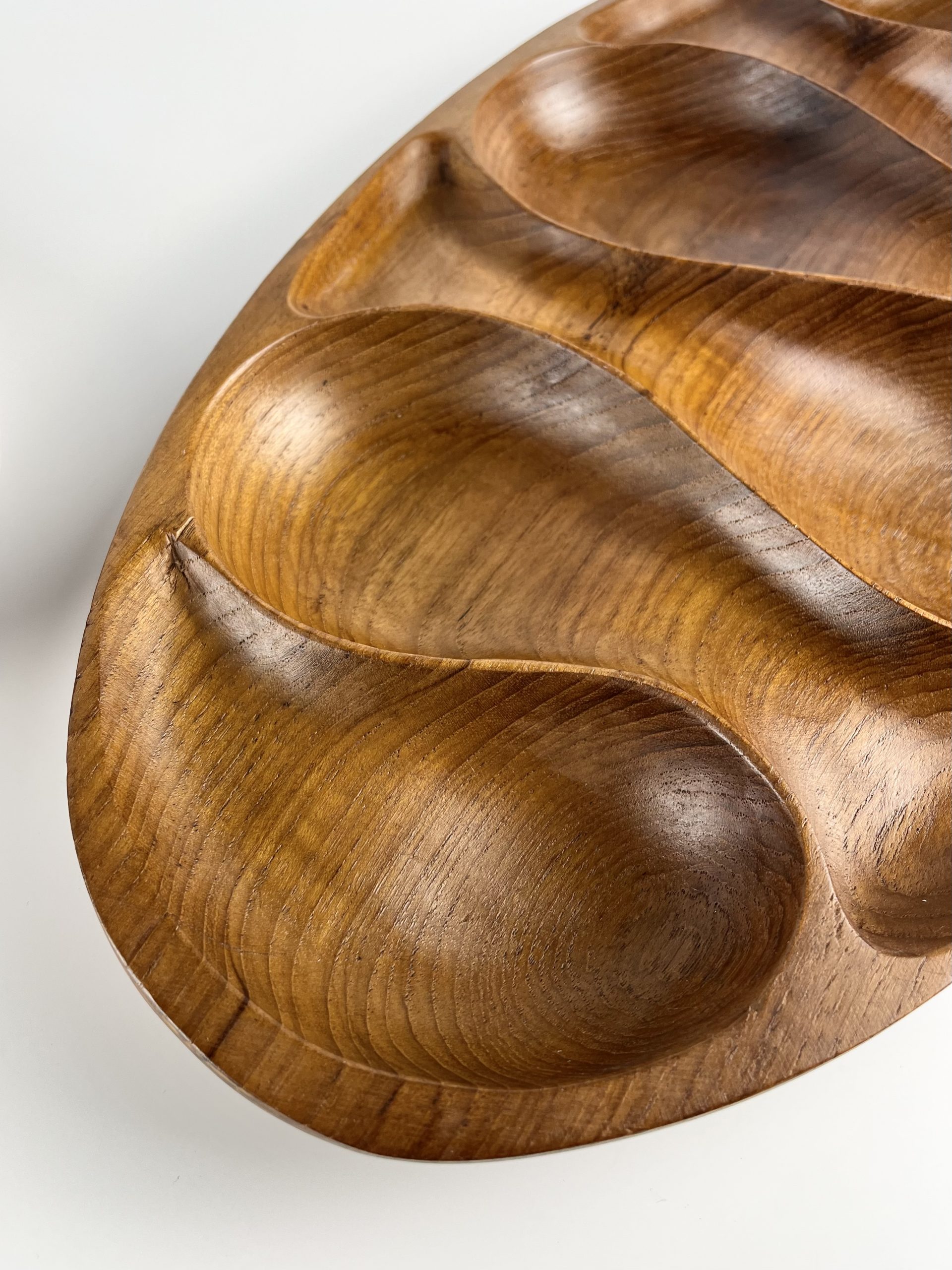 A large and sculptural solid teak snack bowl, hand carved into this distinctive, undulating form.