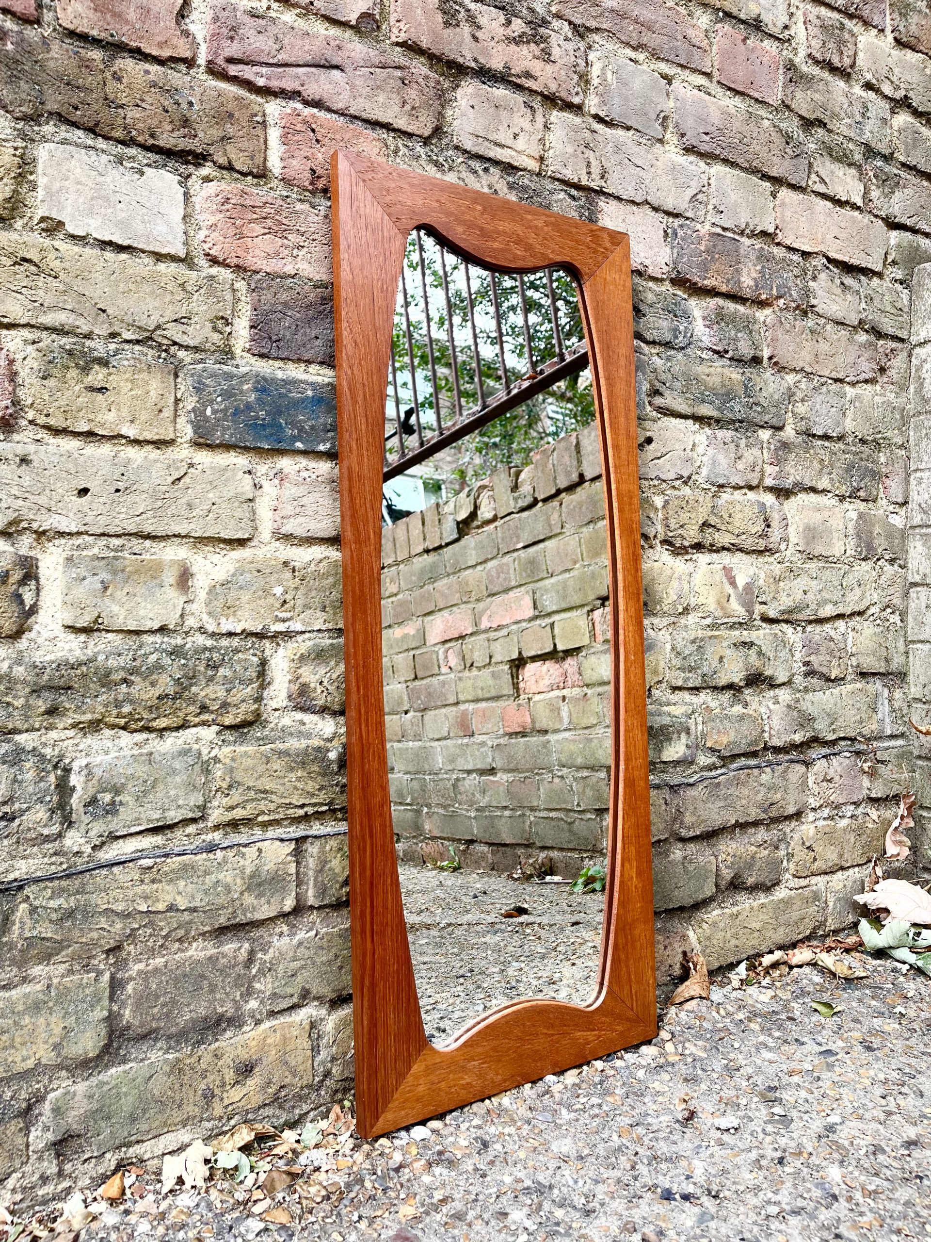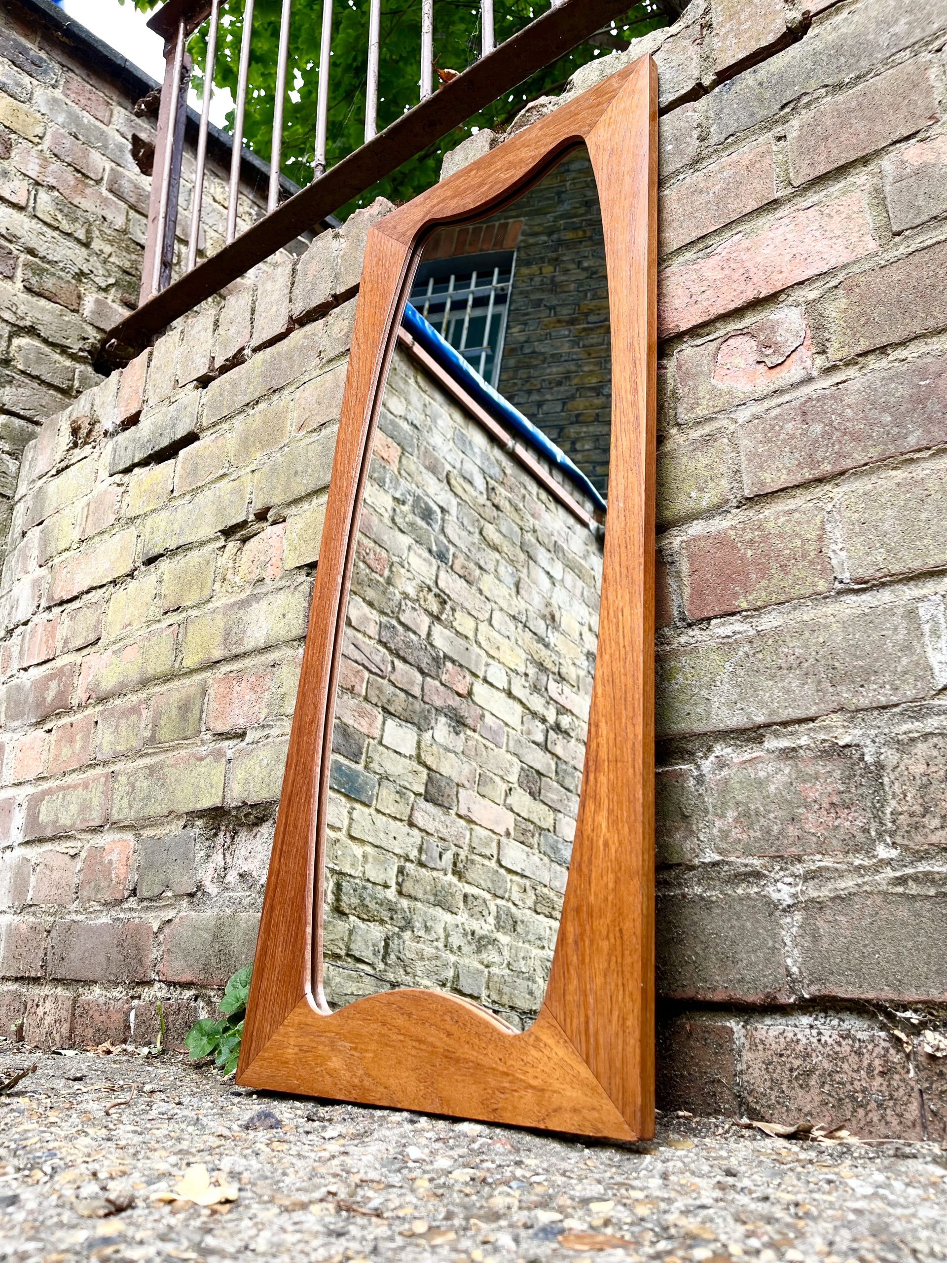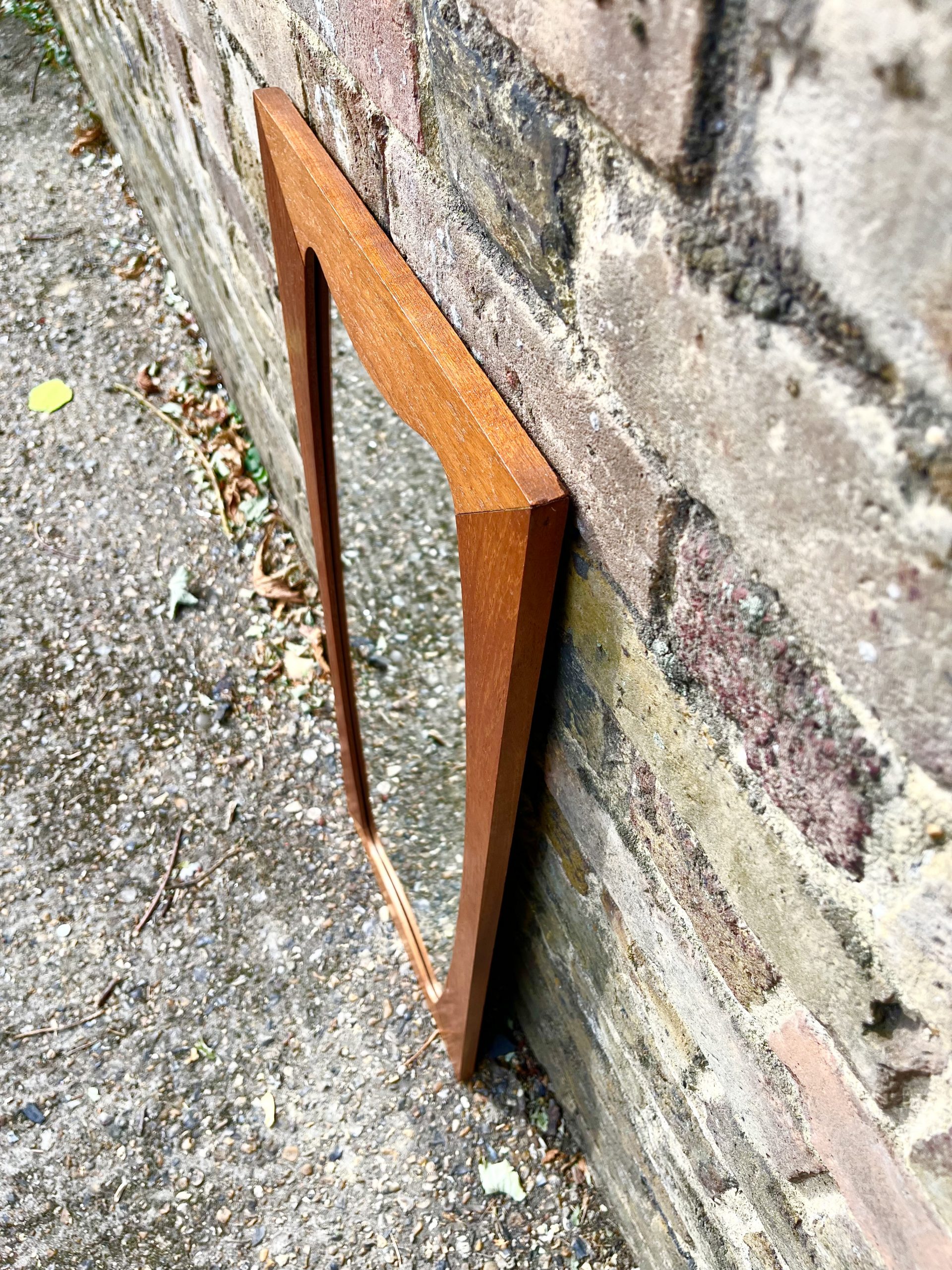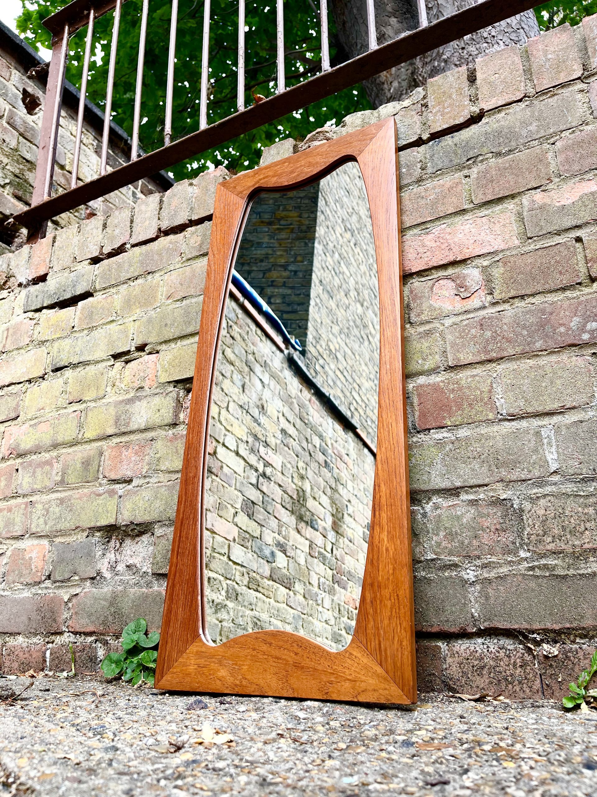 Just catching the early morning rays, this mid-century wall mirror with an unusual sculpted teak frame!