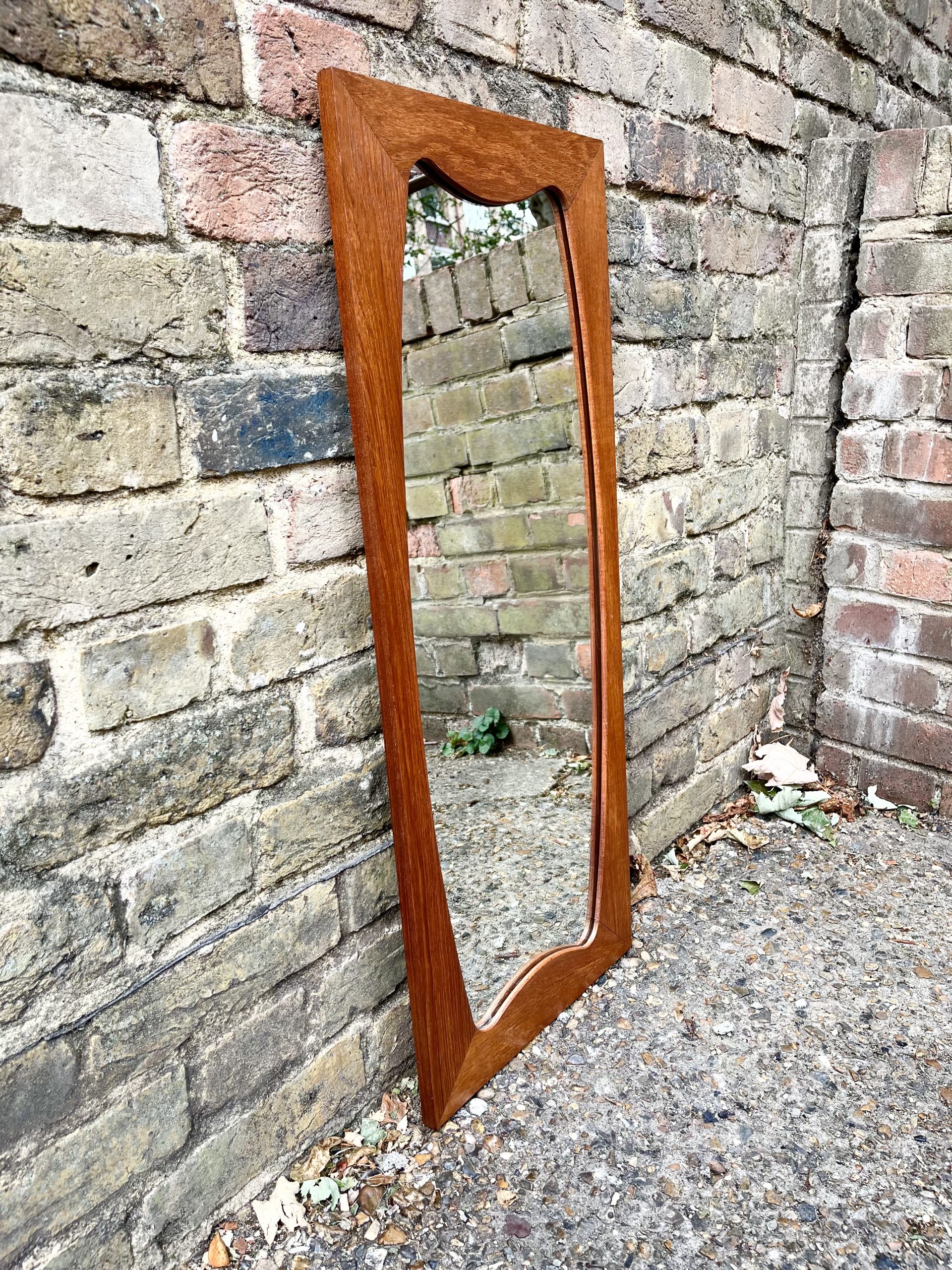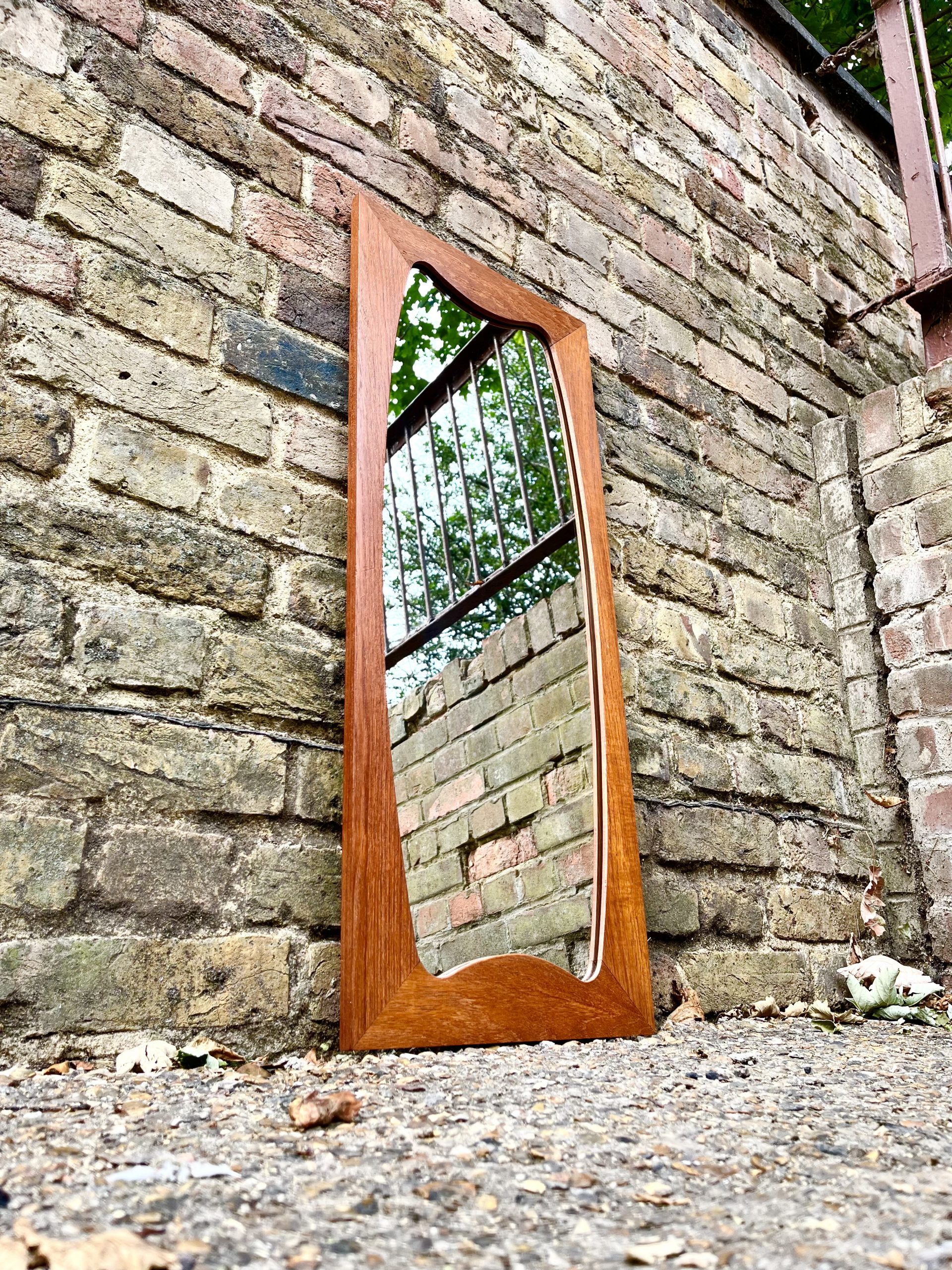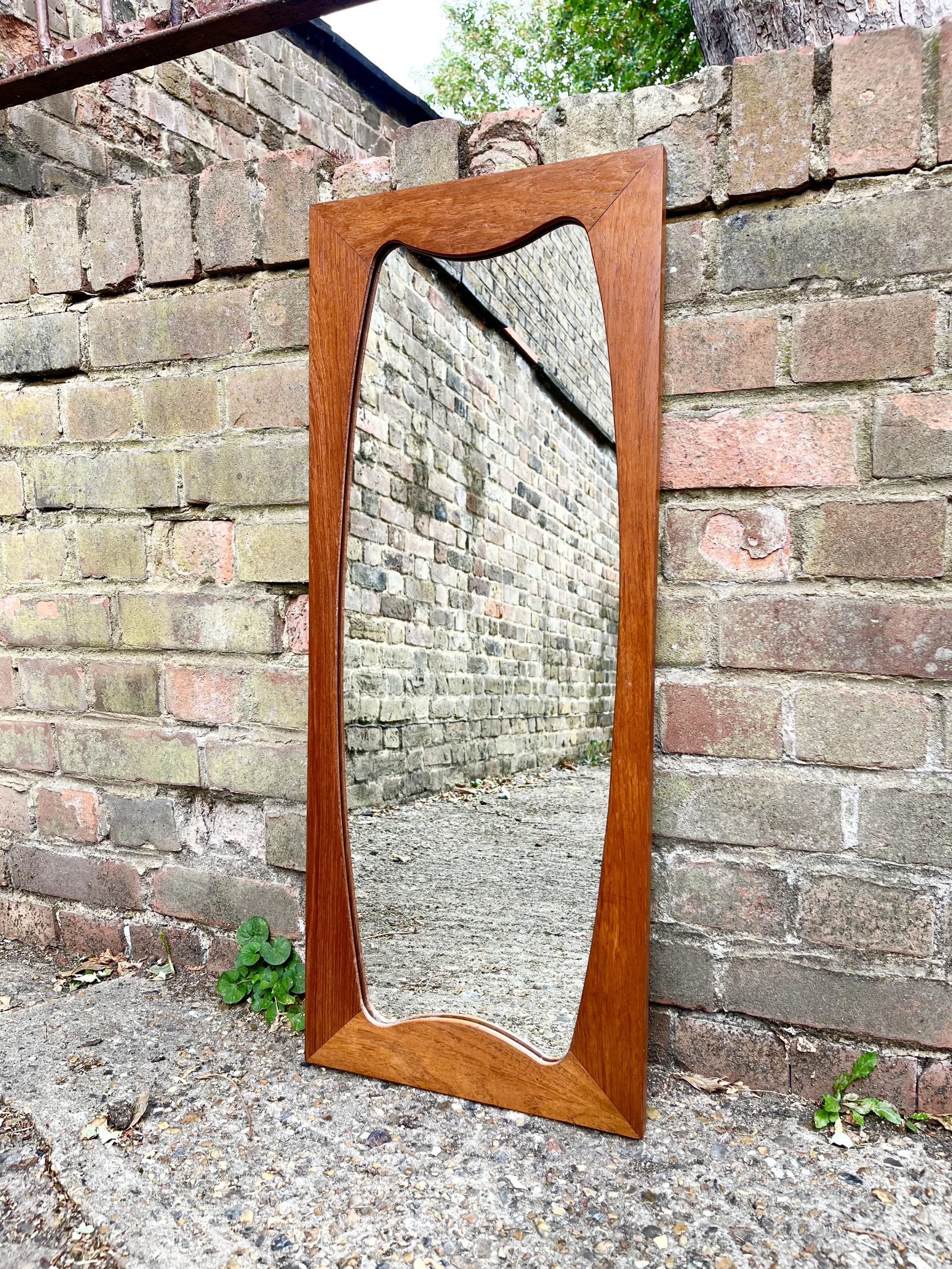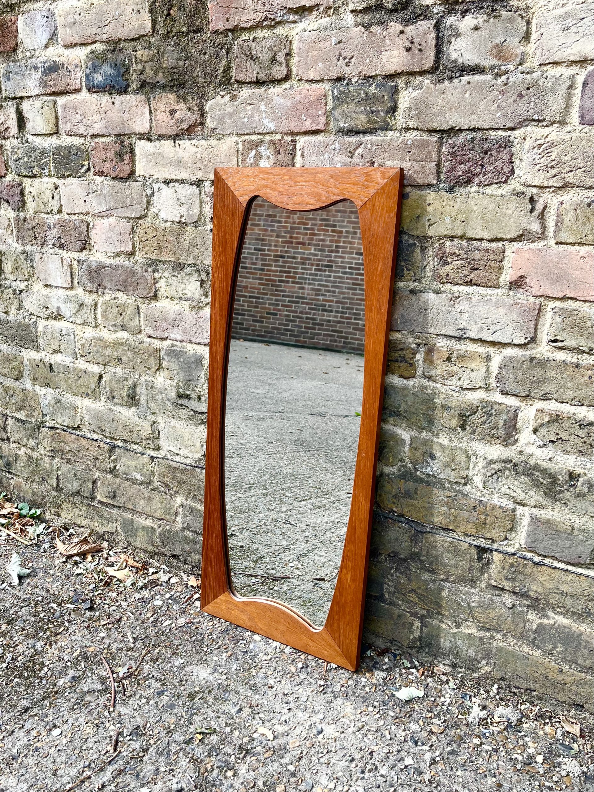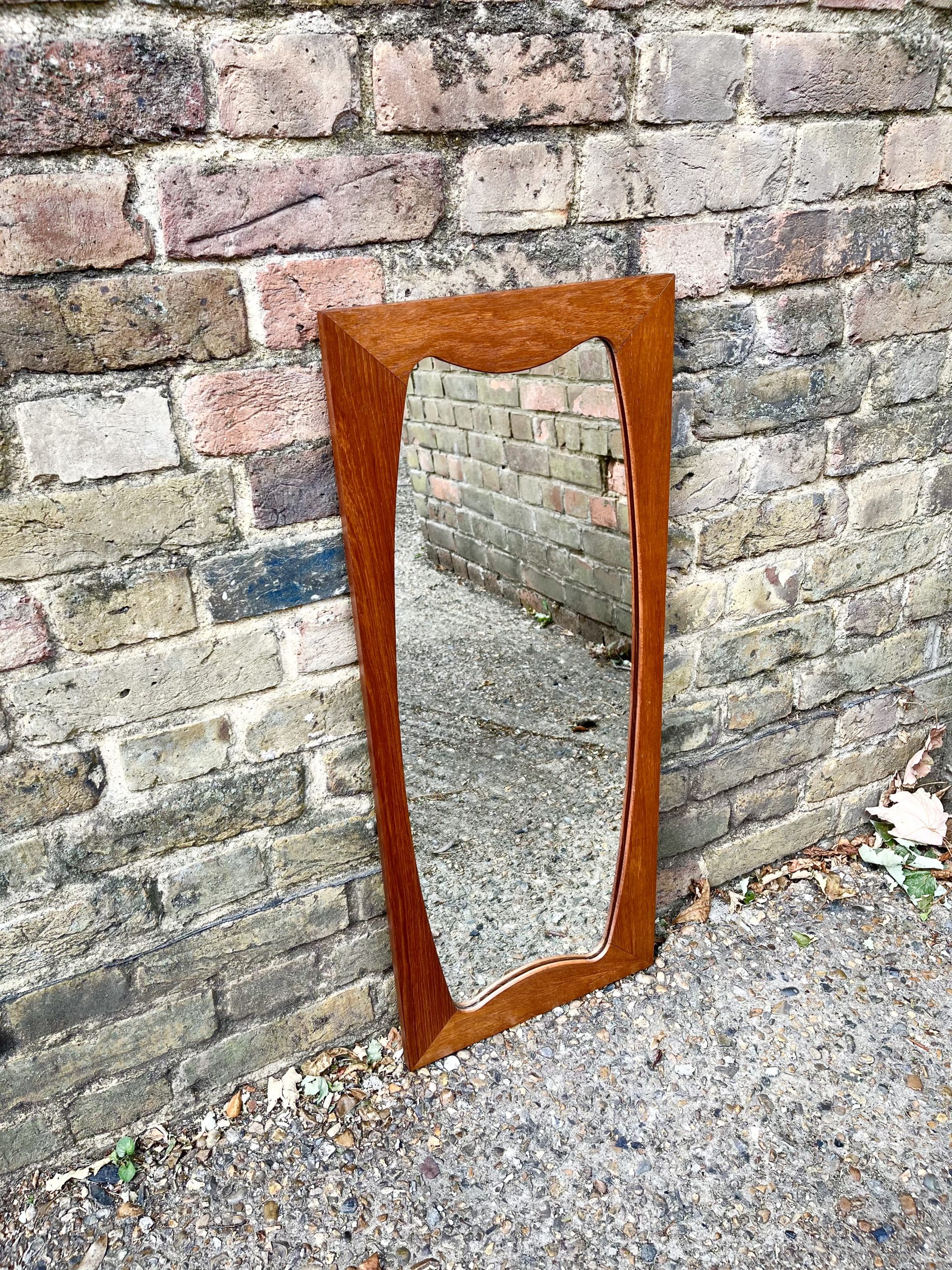 Just catching the early morning rays, this mid-century wall mirror with an unusual sculpted teak frame!