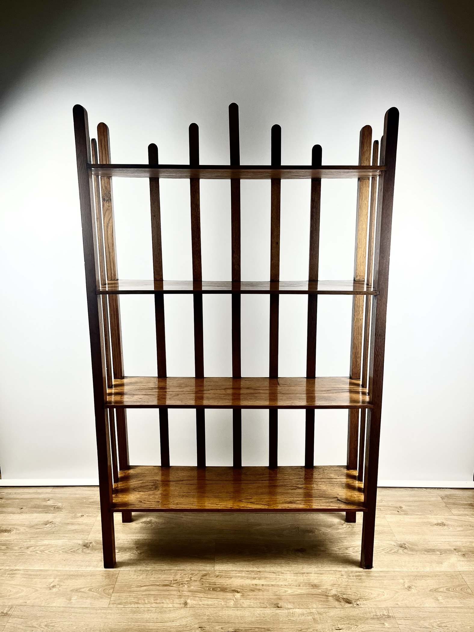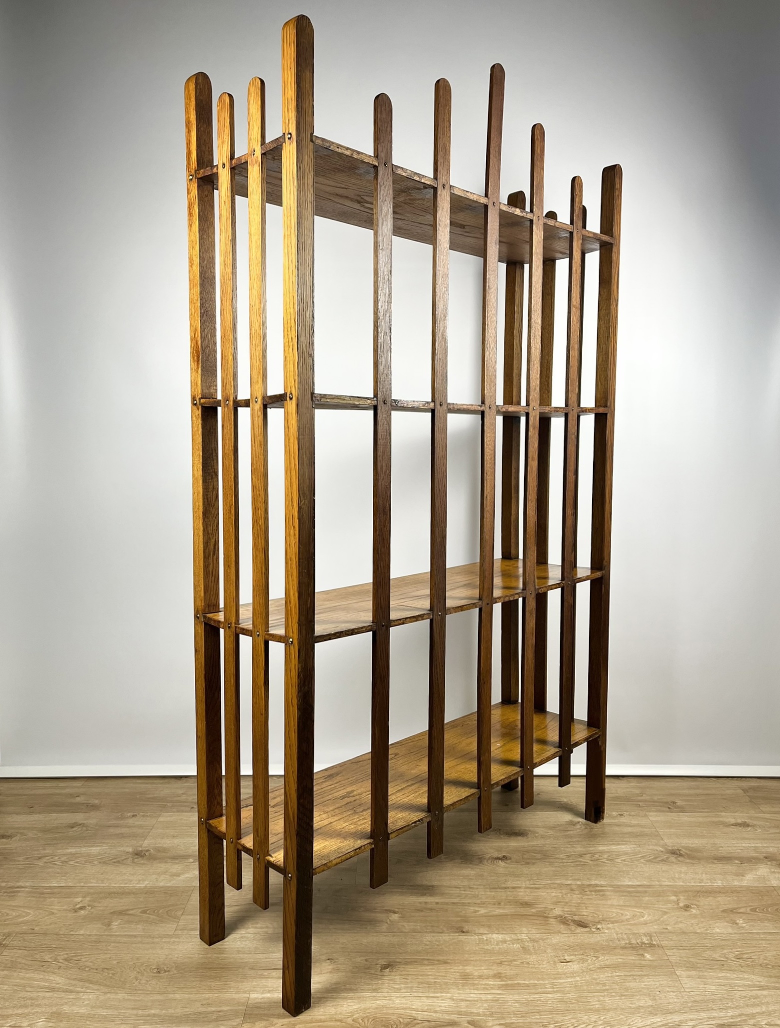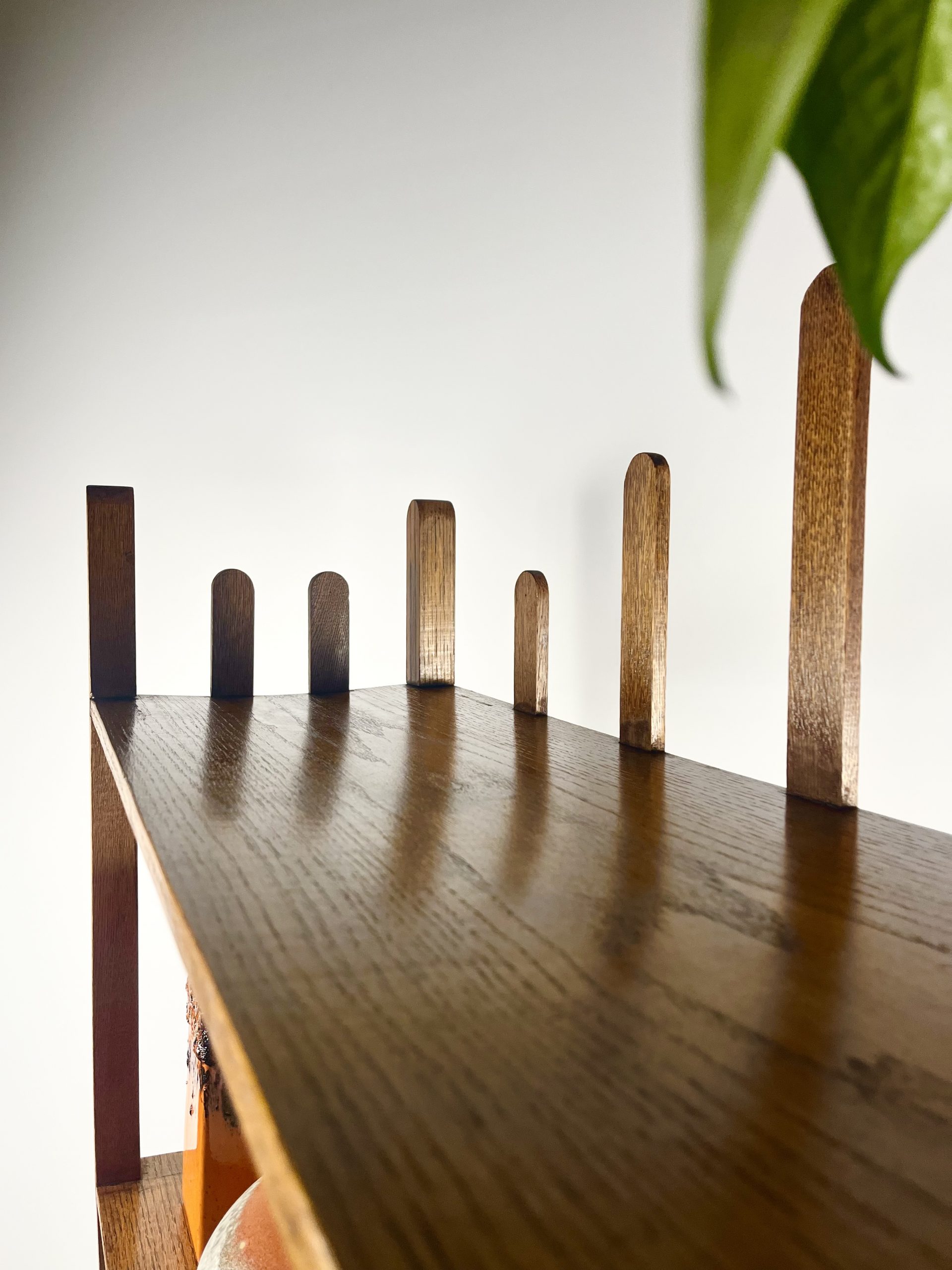 Four oak shelves are suspended on vertical slats of varying lengths resulting in this awesome, modernist form.
