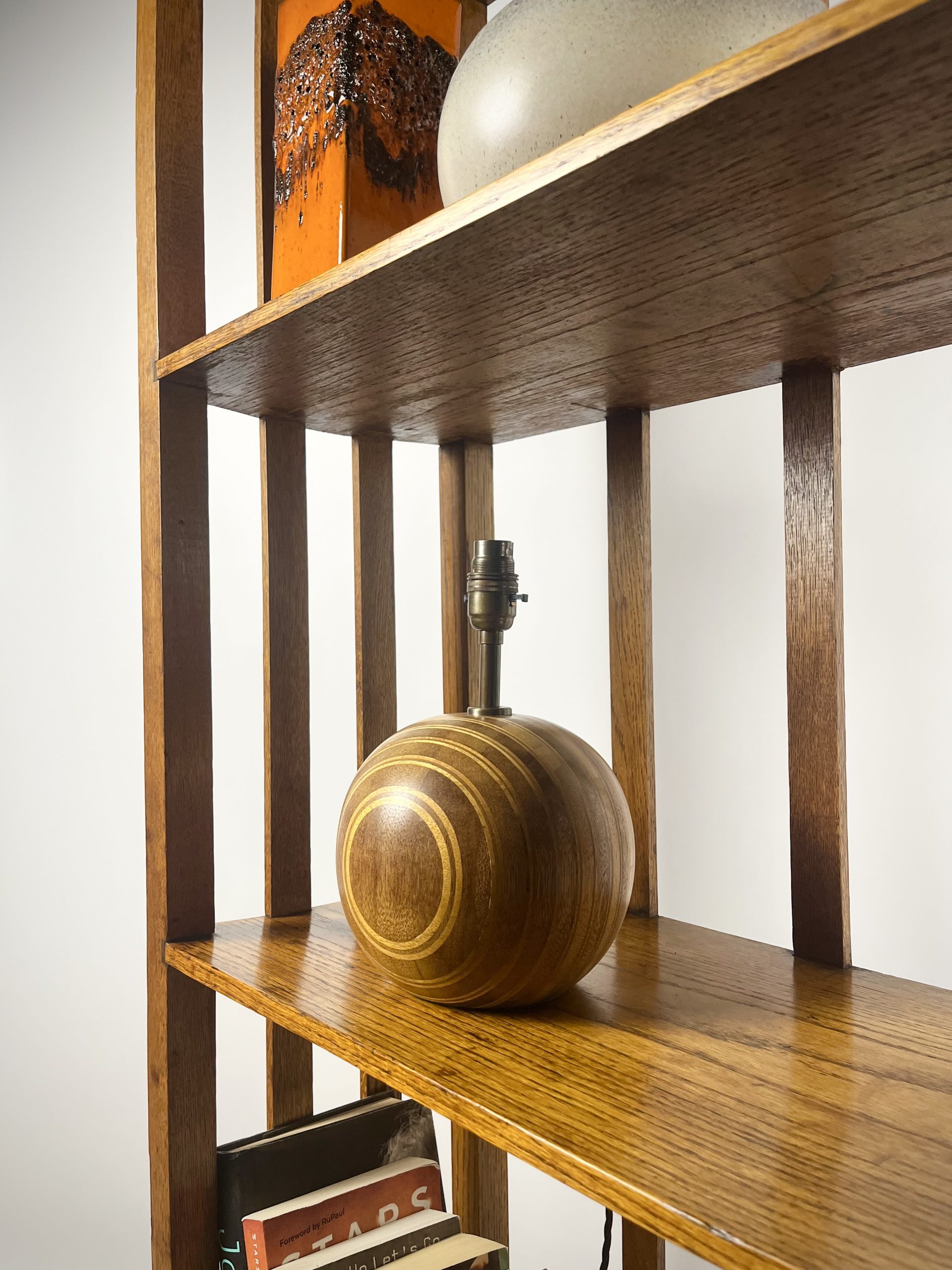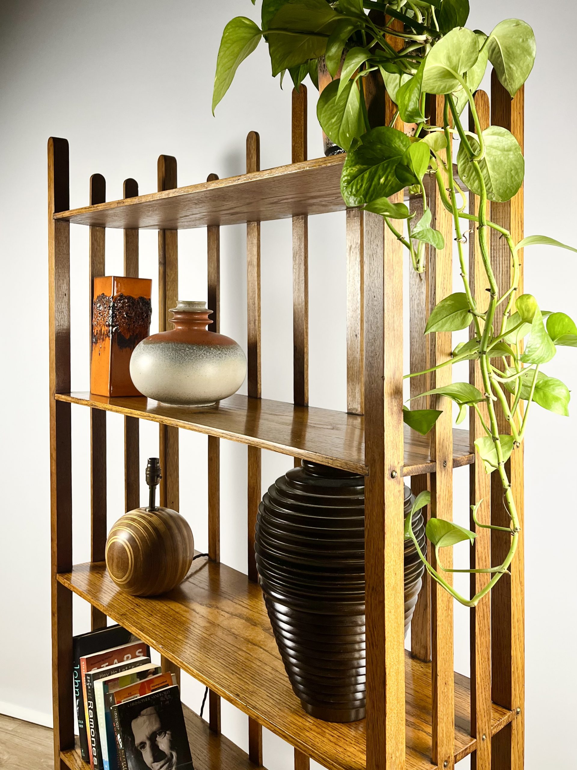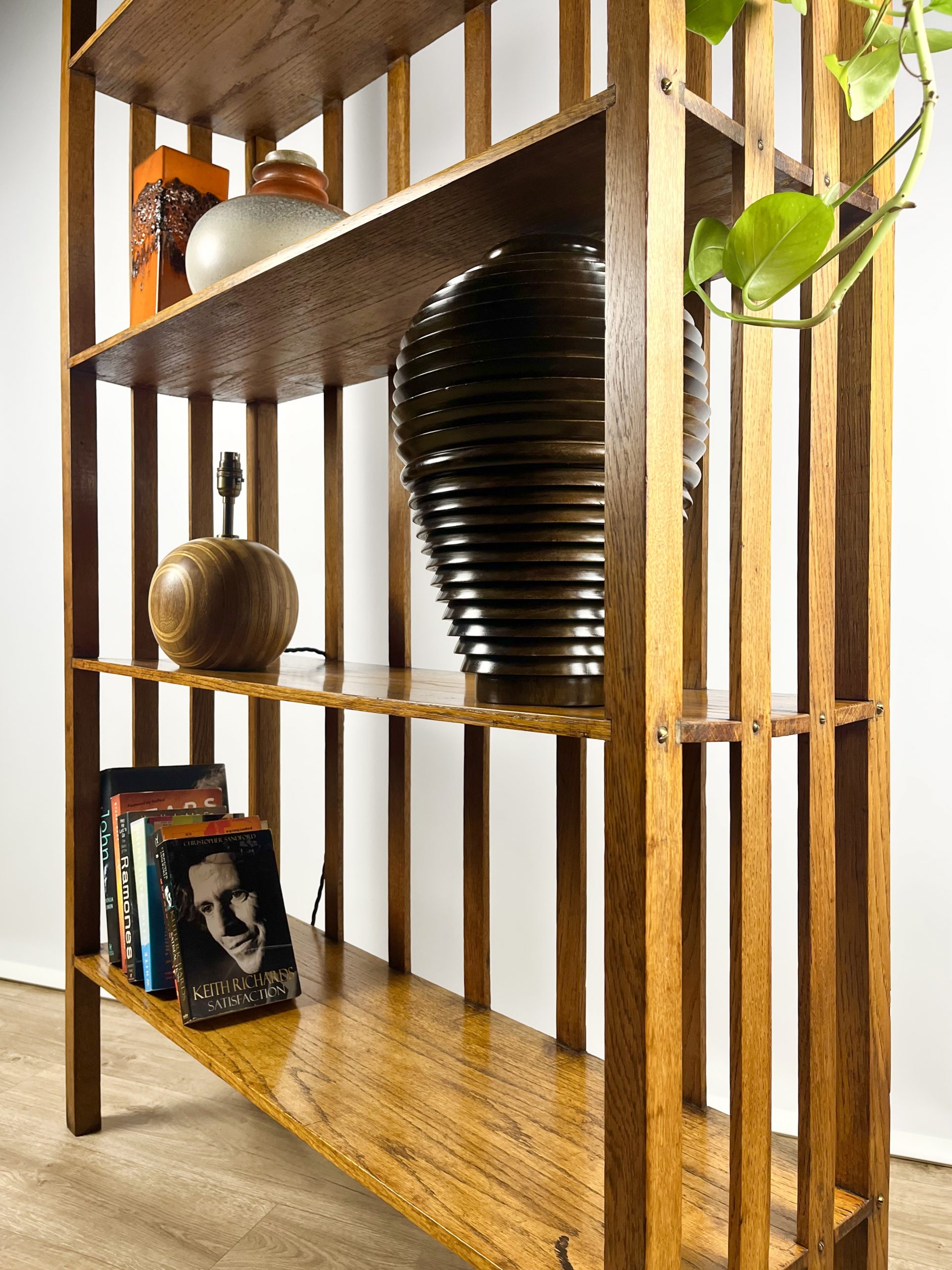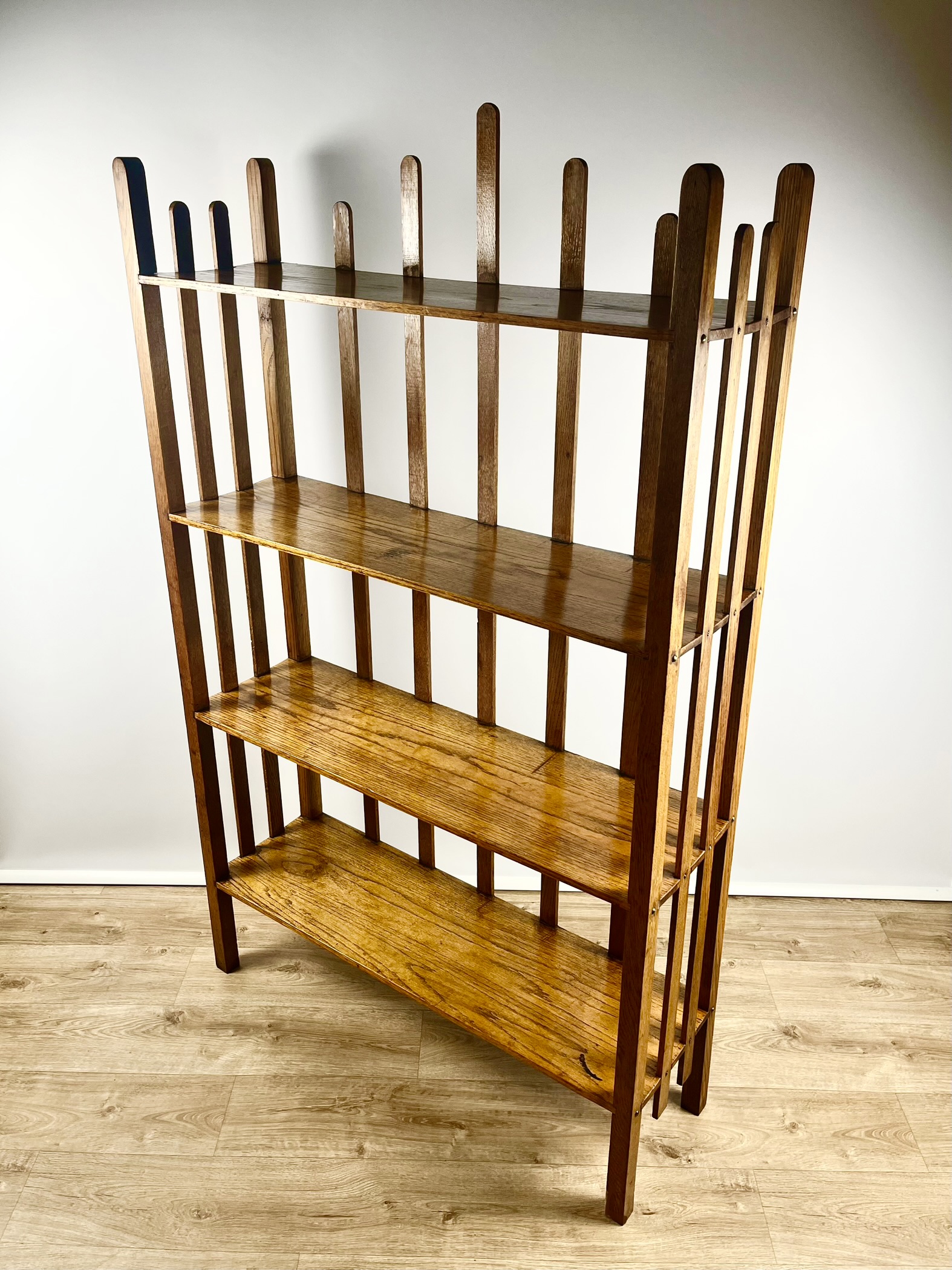 Four oak shelves are suspended on vertical slats of varying lengths resulting in this awesome, modernist form.