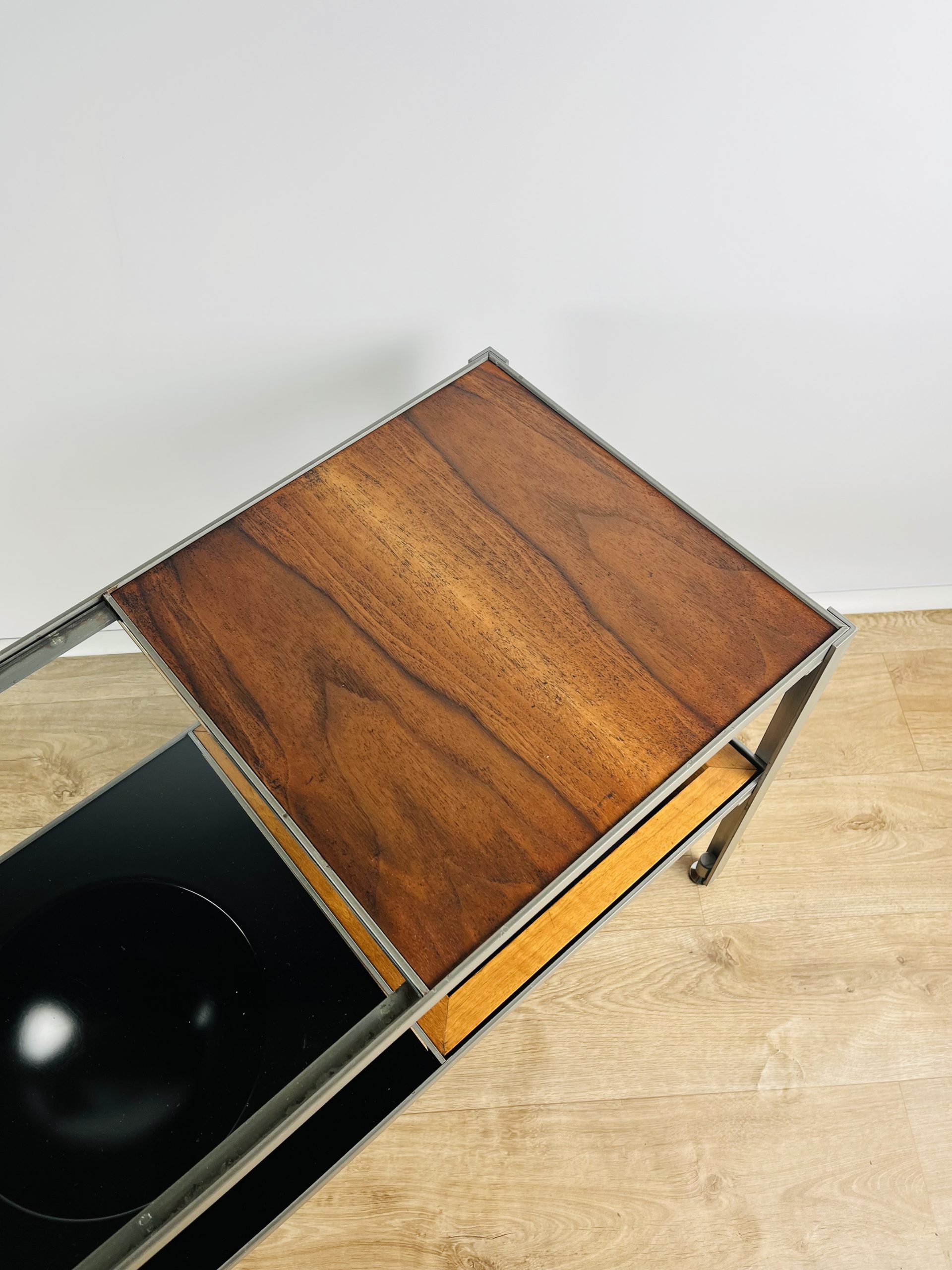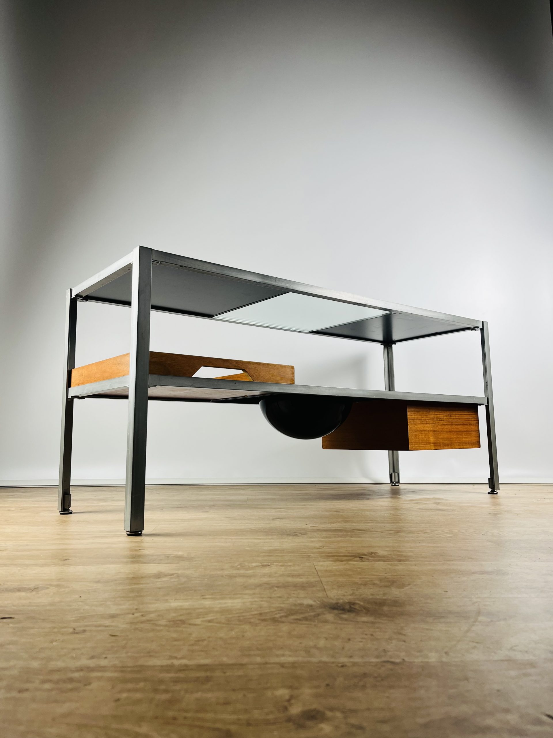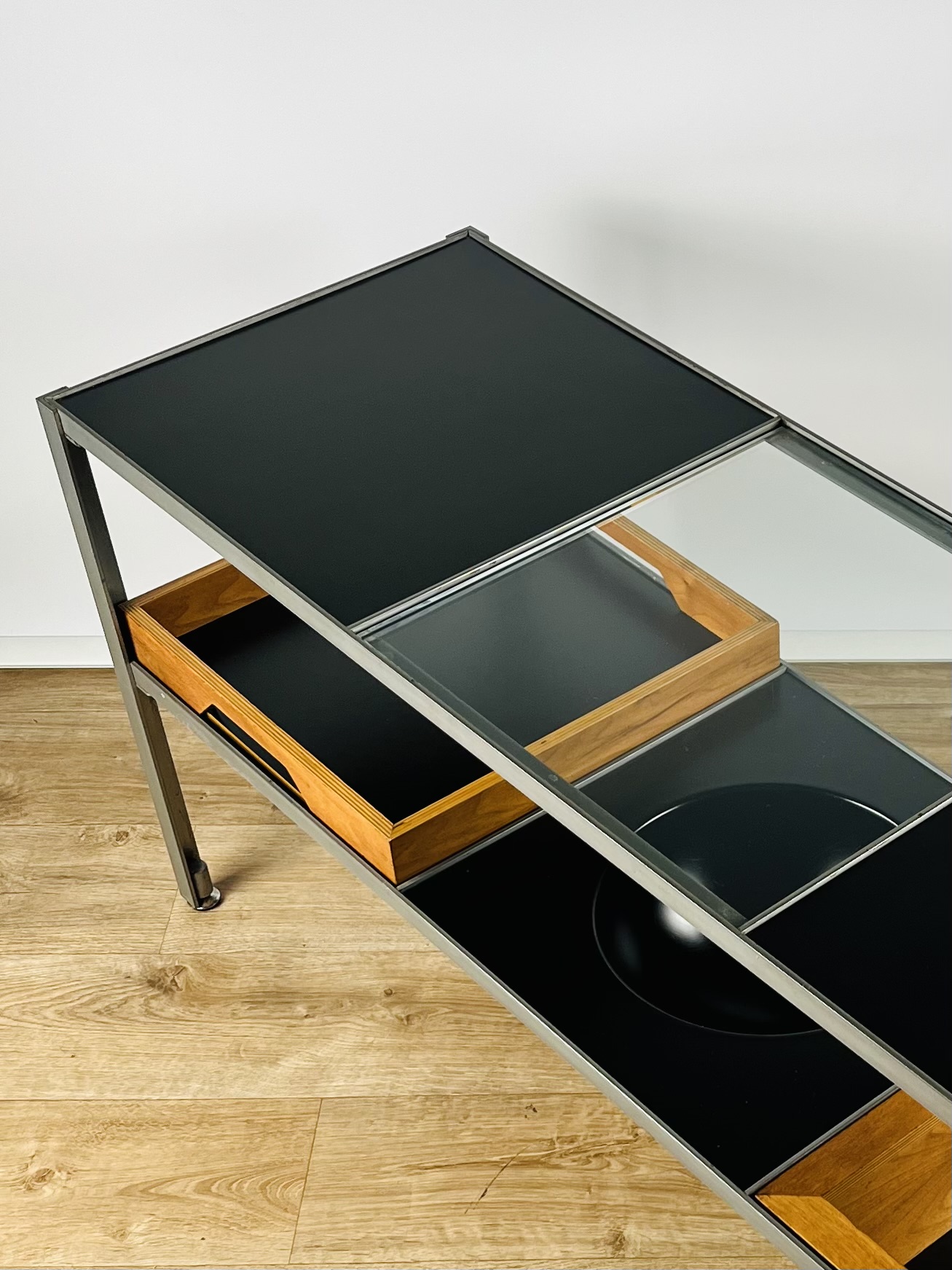 A glass shelf, two reversible walnut / black melamine shelves, a shallow tray, deep tray and an unusual fruit / key bowl, combine to create this sleek and futuristic design.