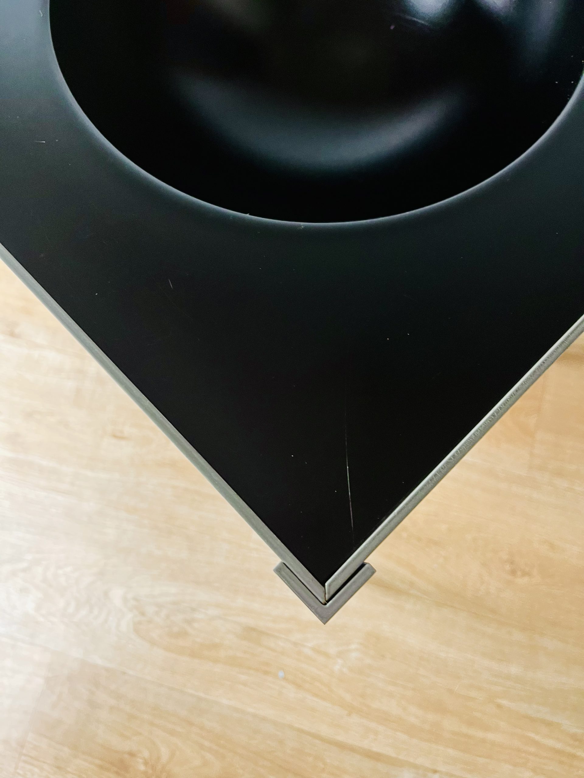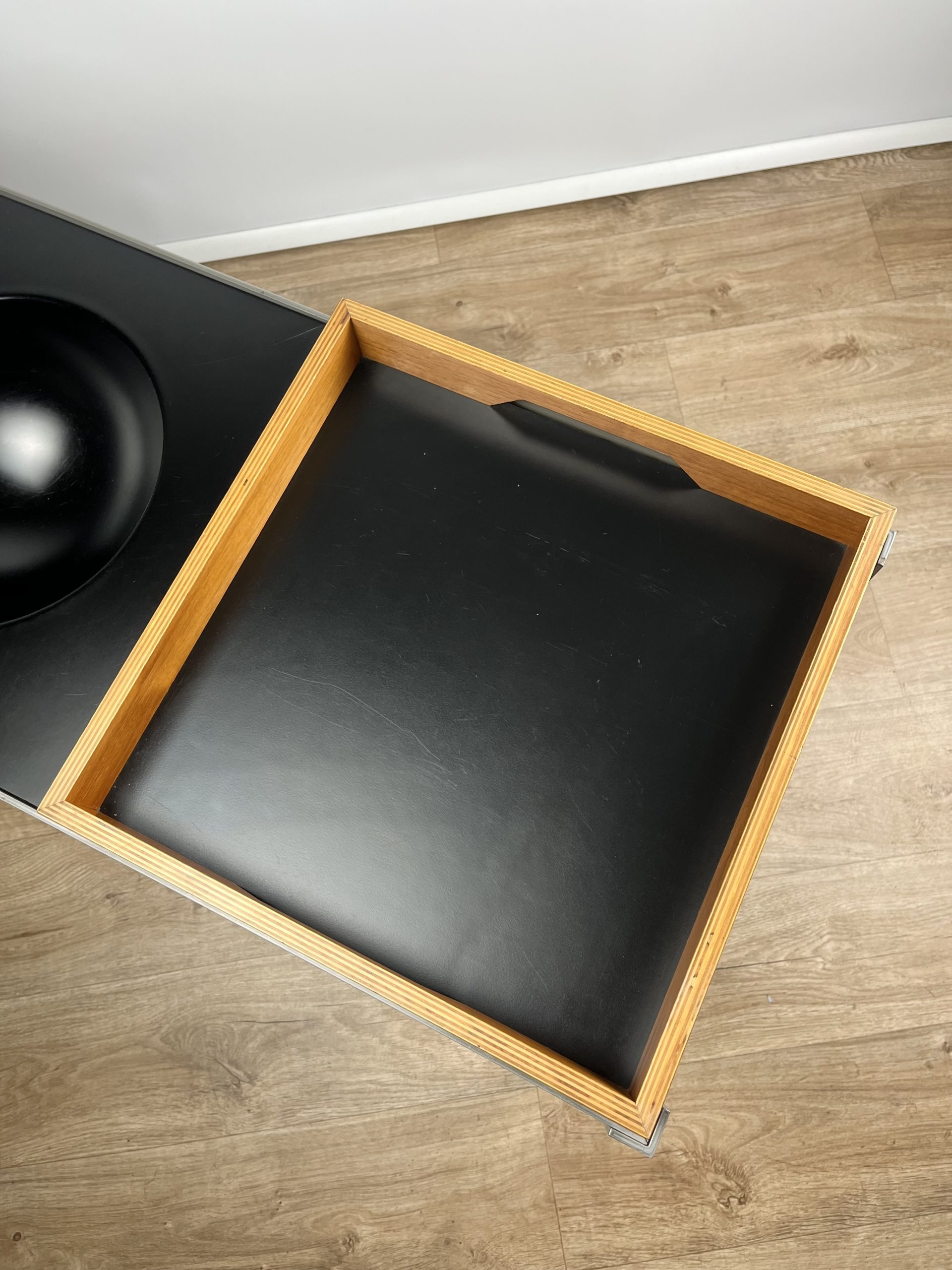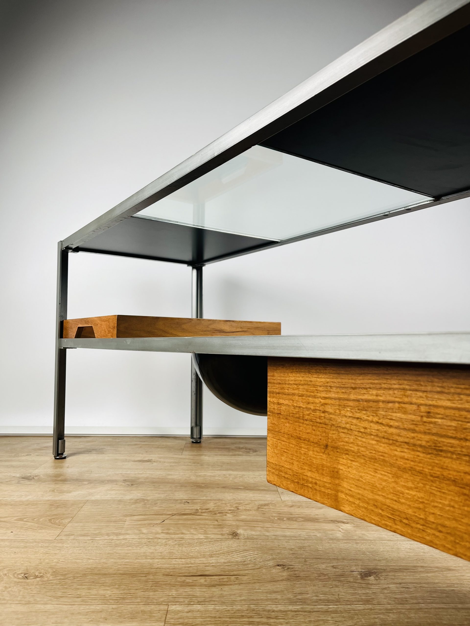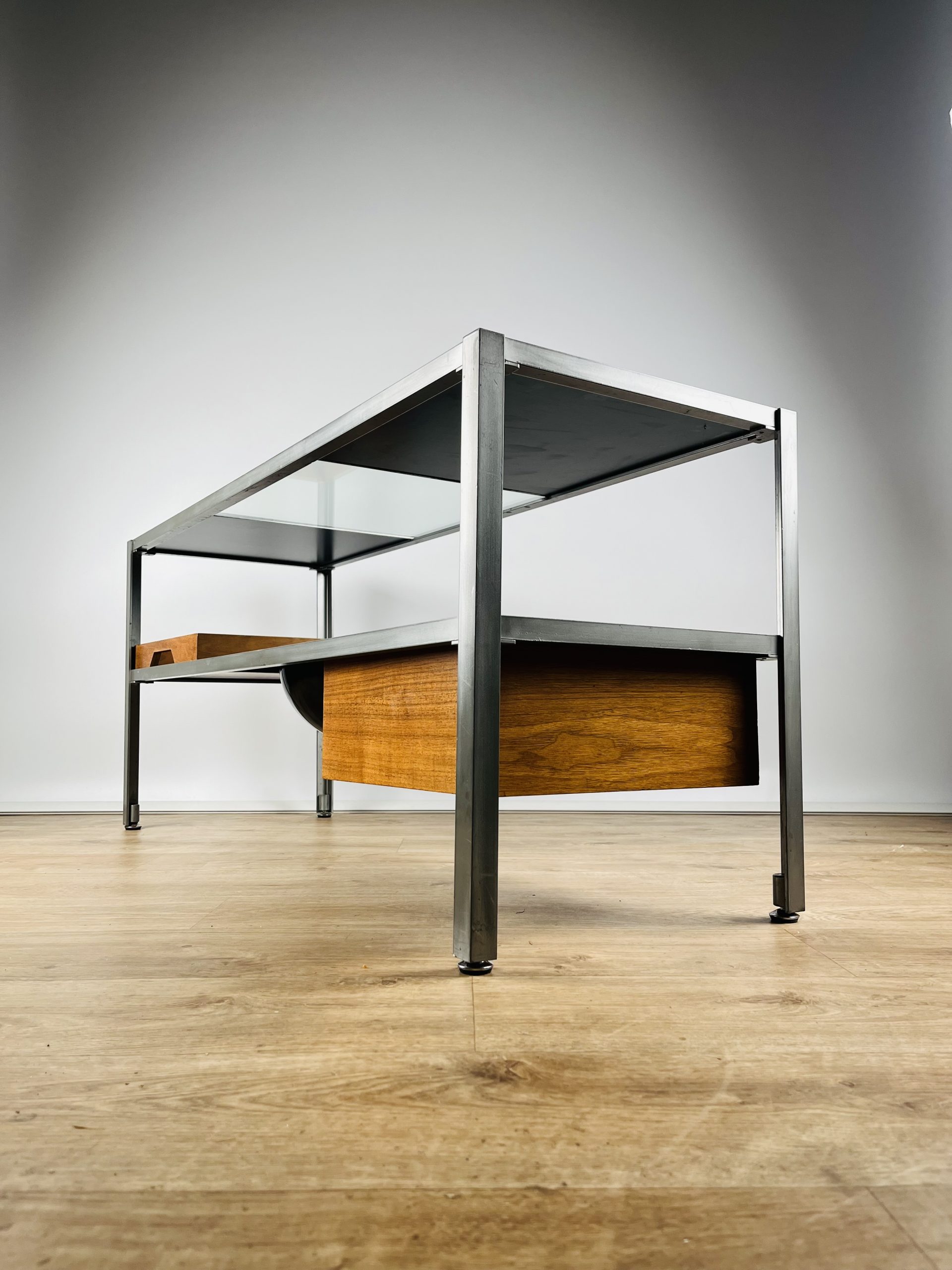 A glass shelf, two reversible walnut / black melamine shelves, a shallow tray, deep tray and an unusual fruit / key bowl, combine to create this sleek and futuristic design.