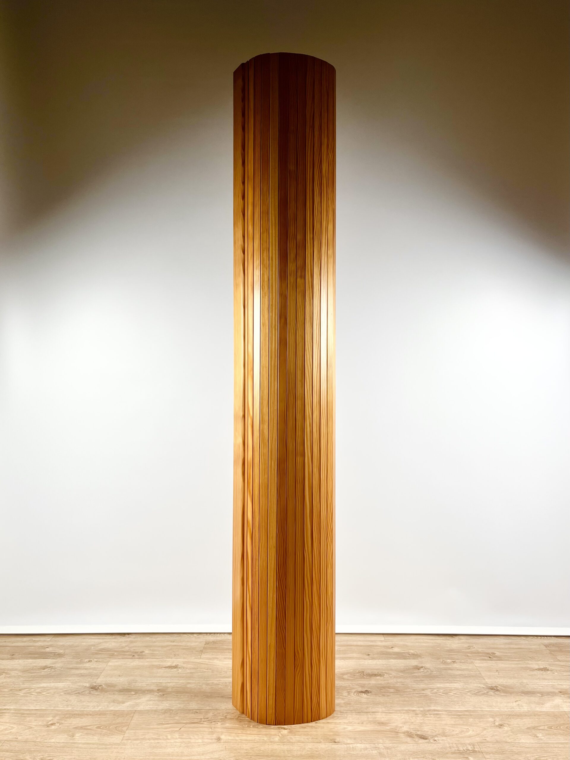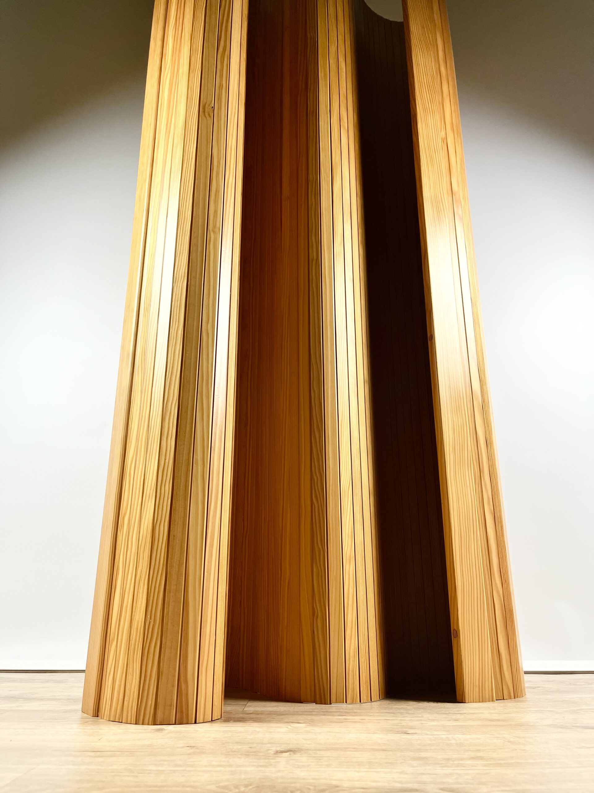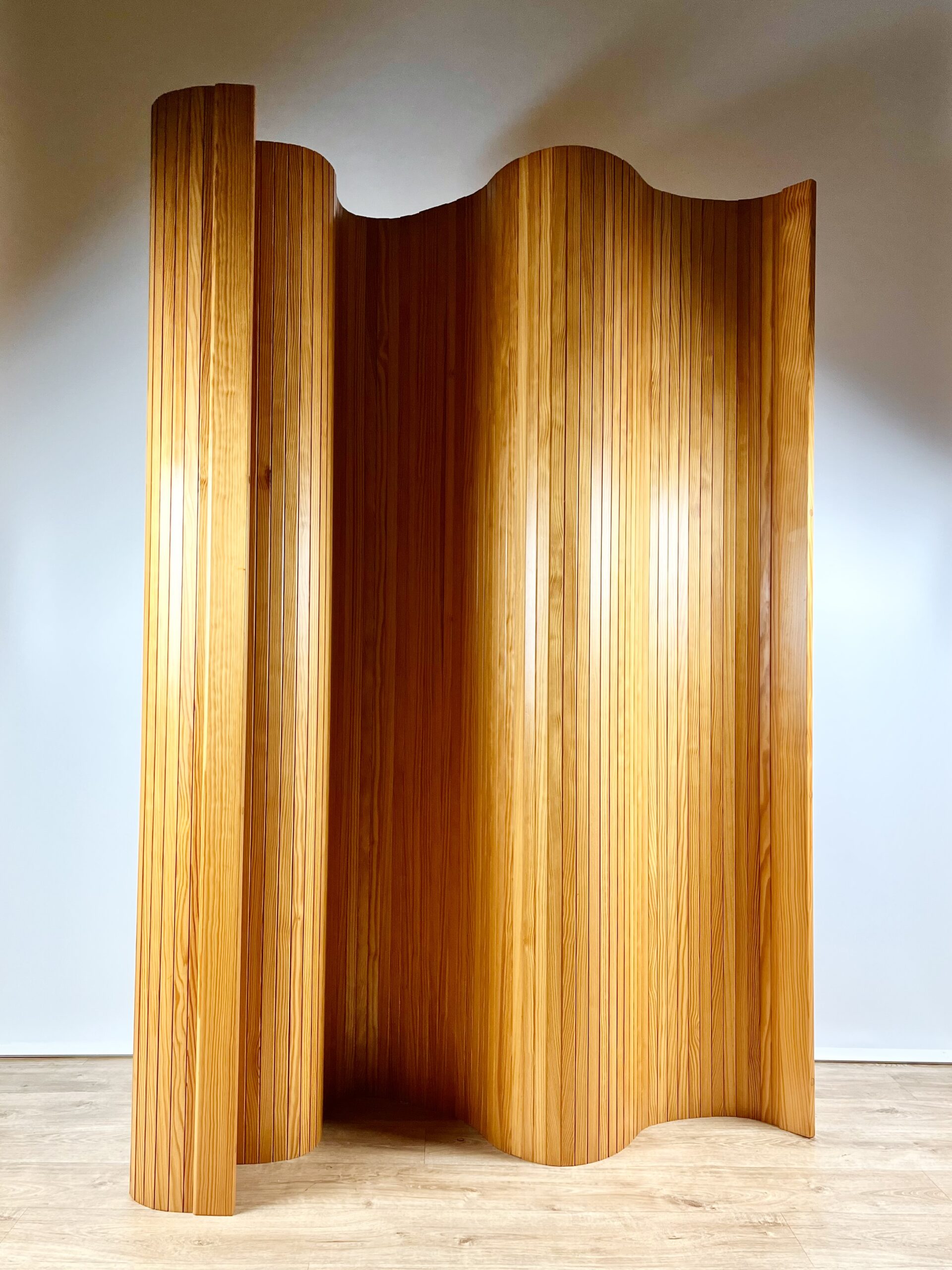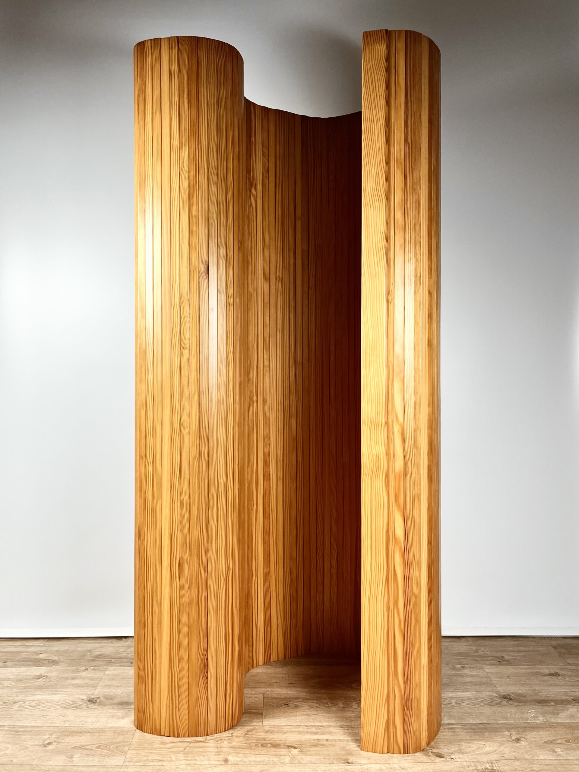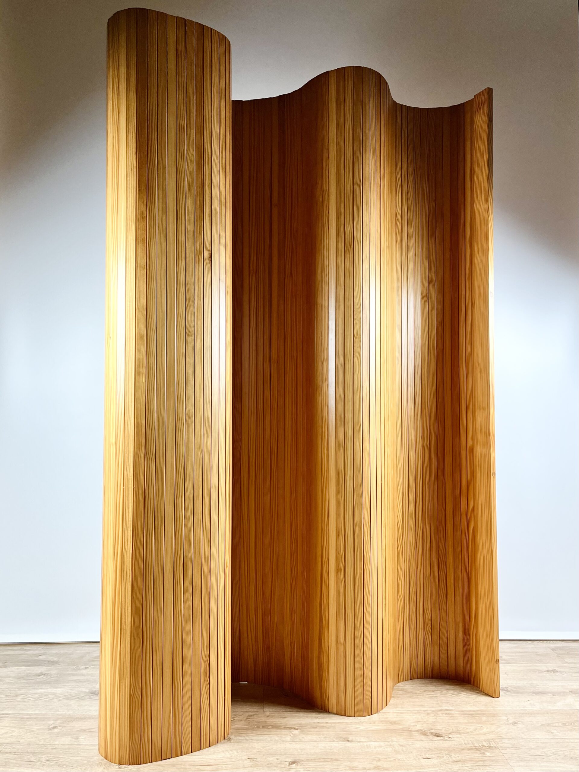 Beautifully figured slats of solid pine are connected by steel cables to create this sculptural, articulated form.