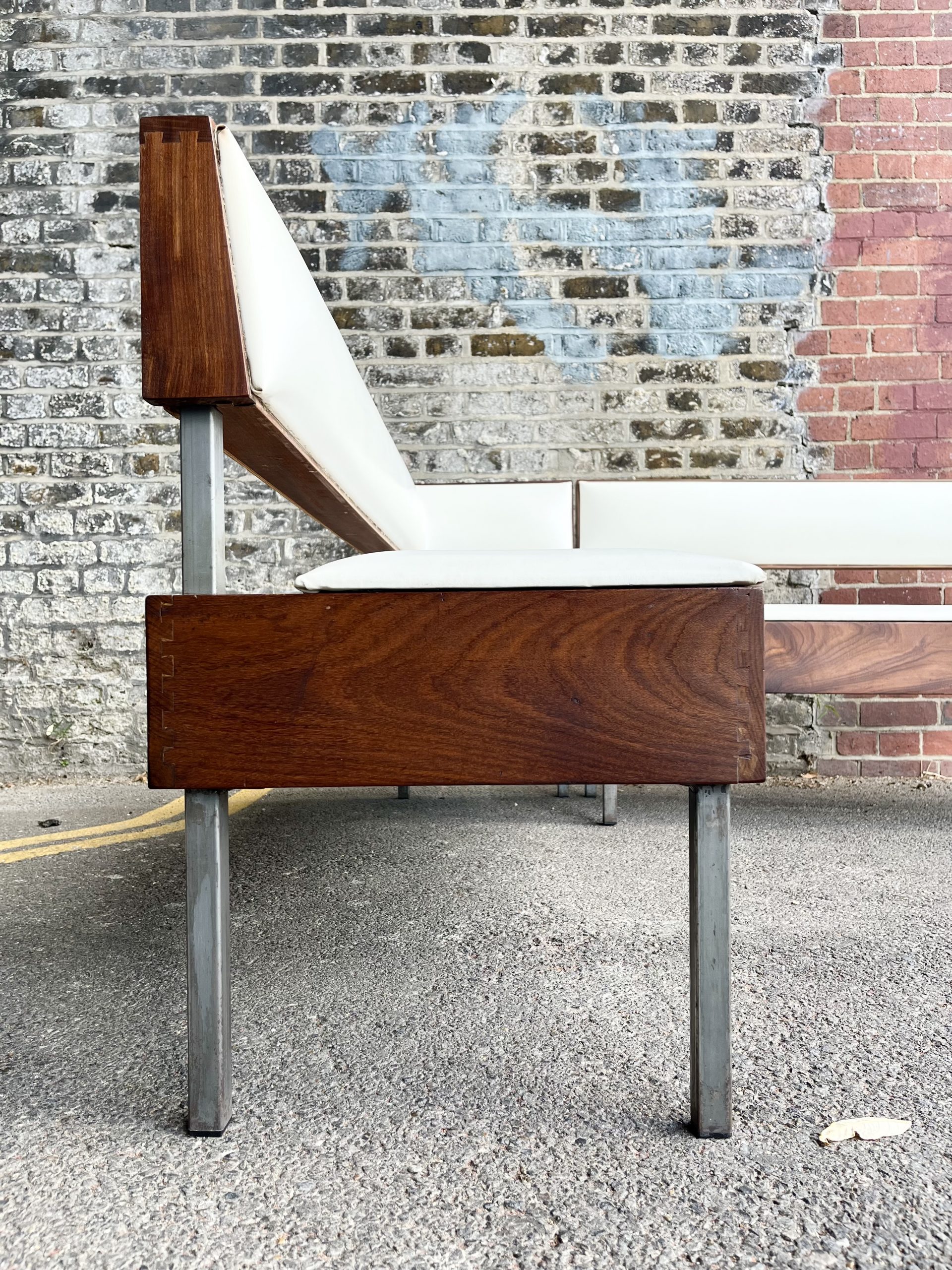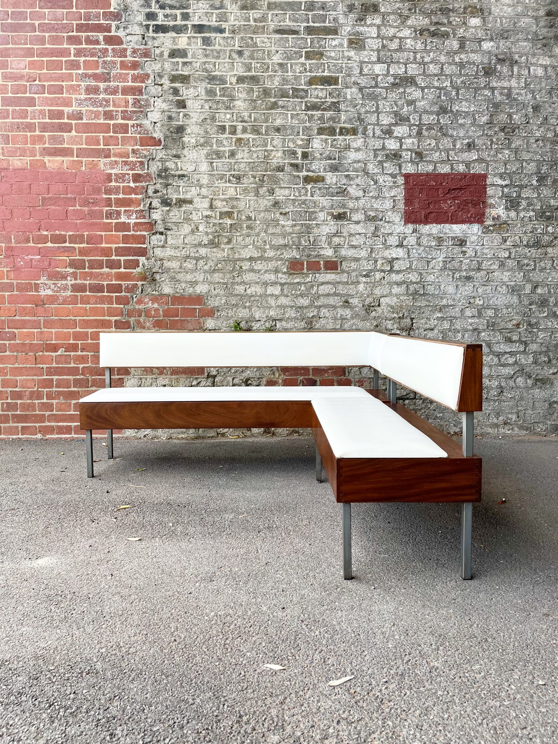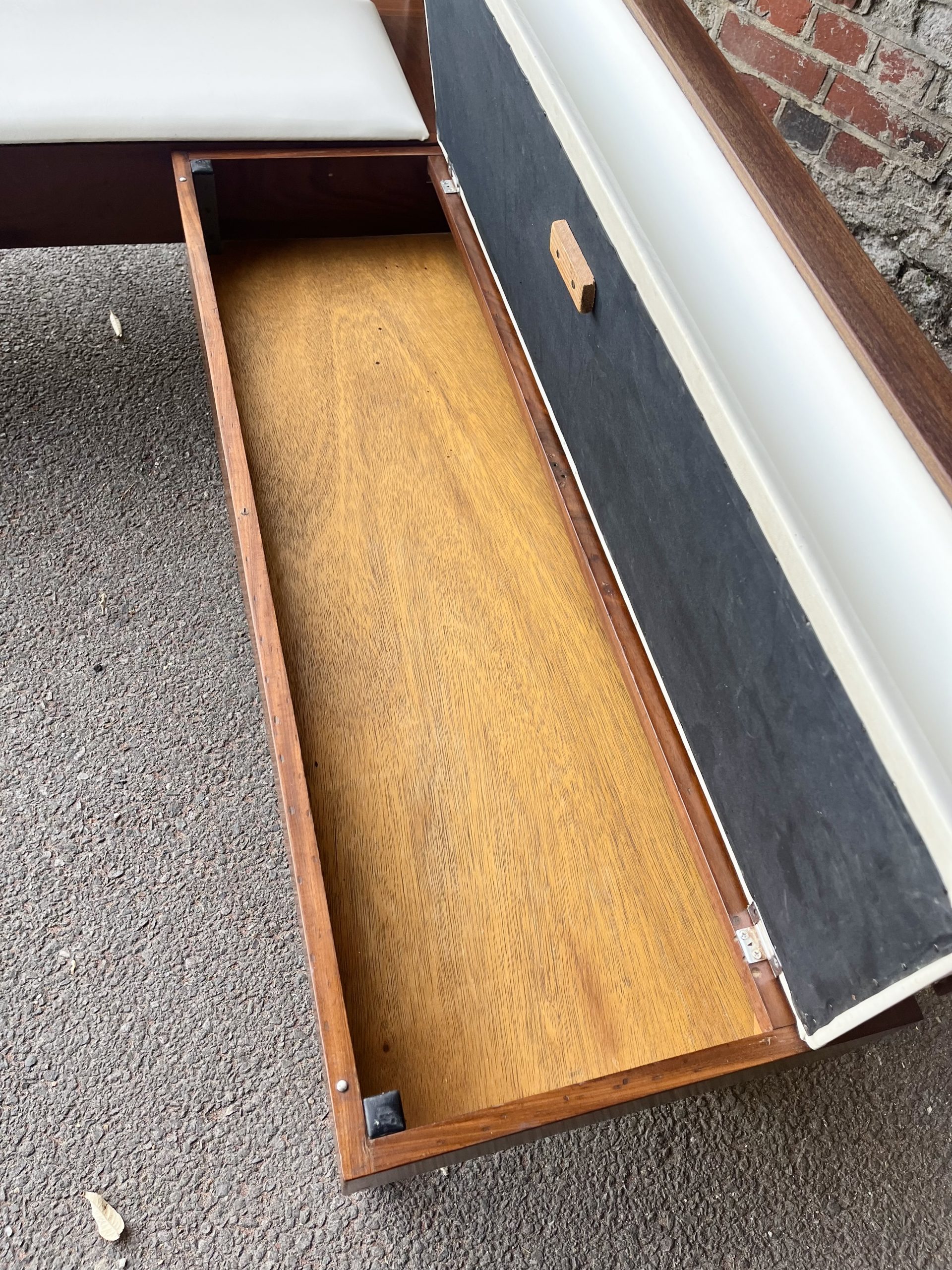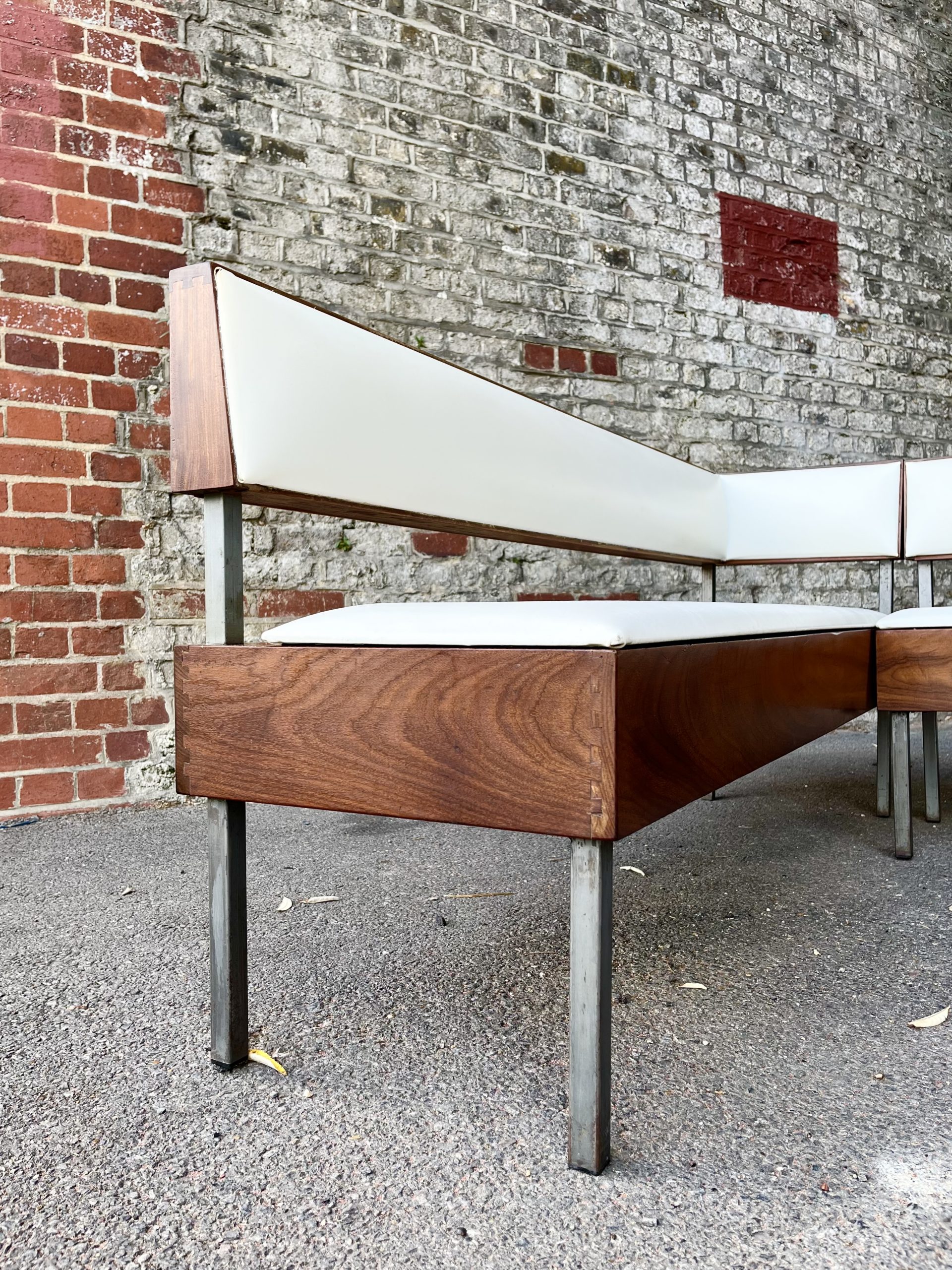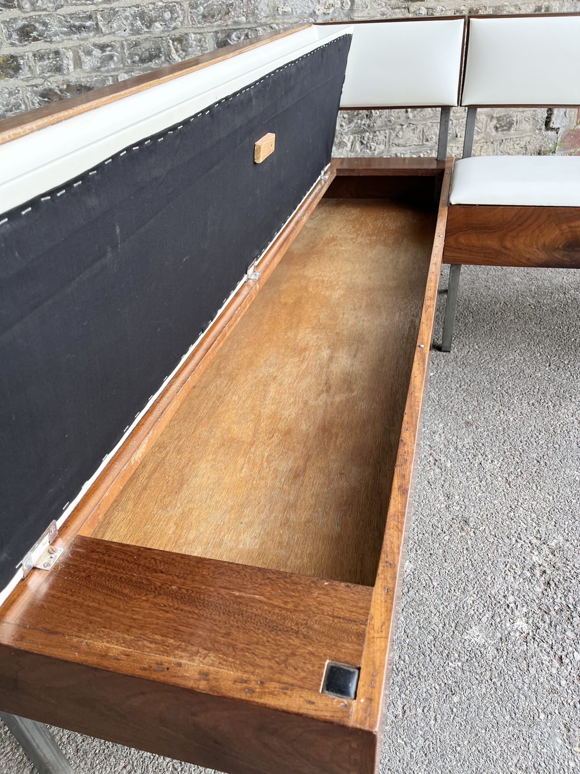Constructed from African walnut, steel and plywood with white vinyl upholstery, the two sections can be used separately or butted up together as a corner unit. The seats lift up on hinges to reveal hidden storage compartments beneath.