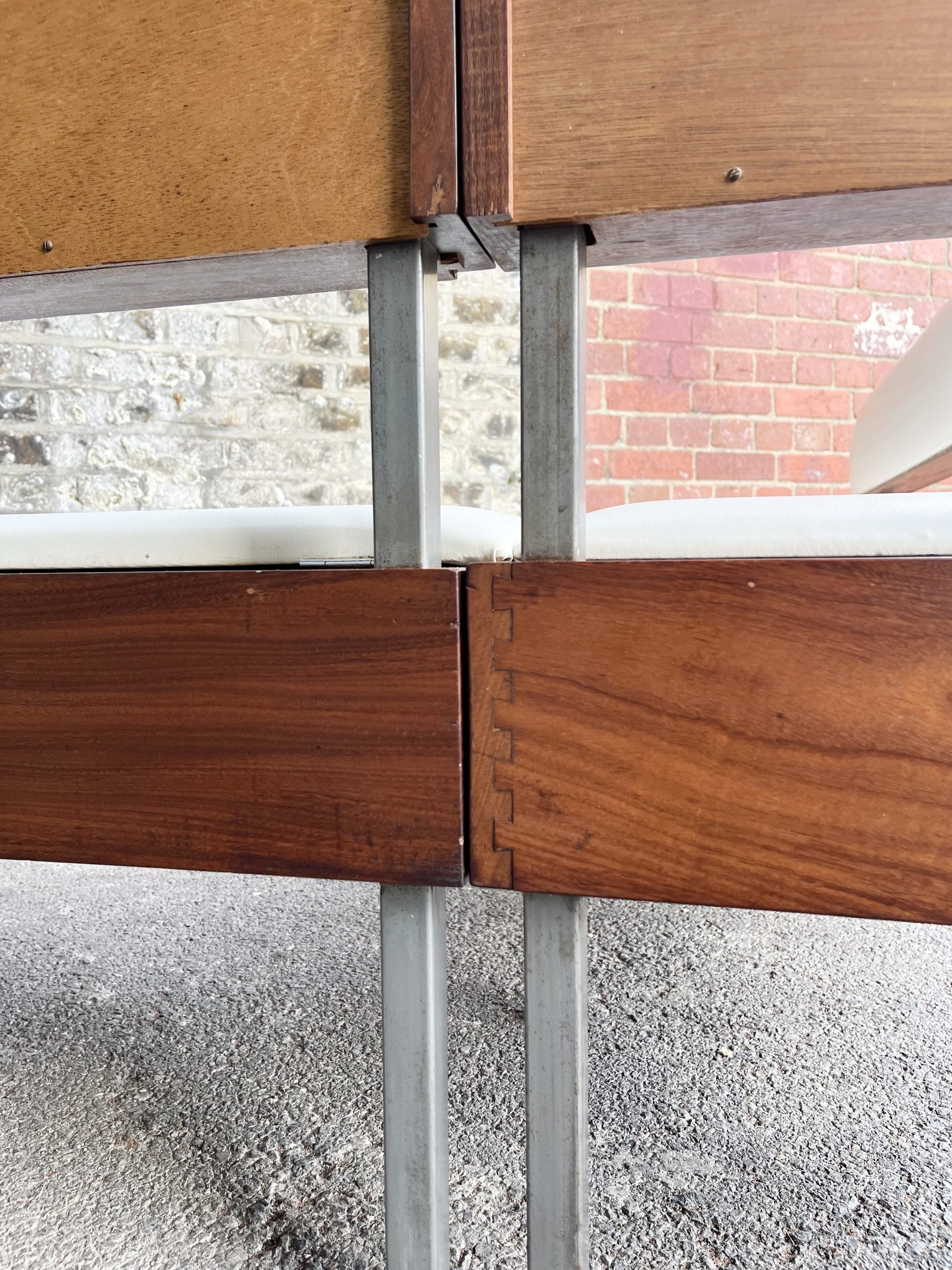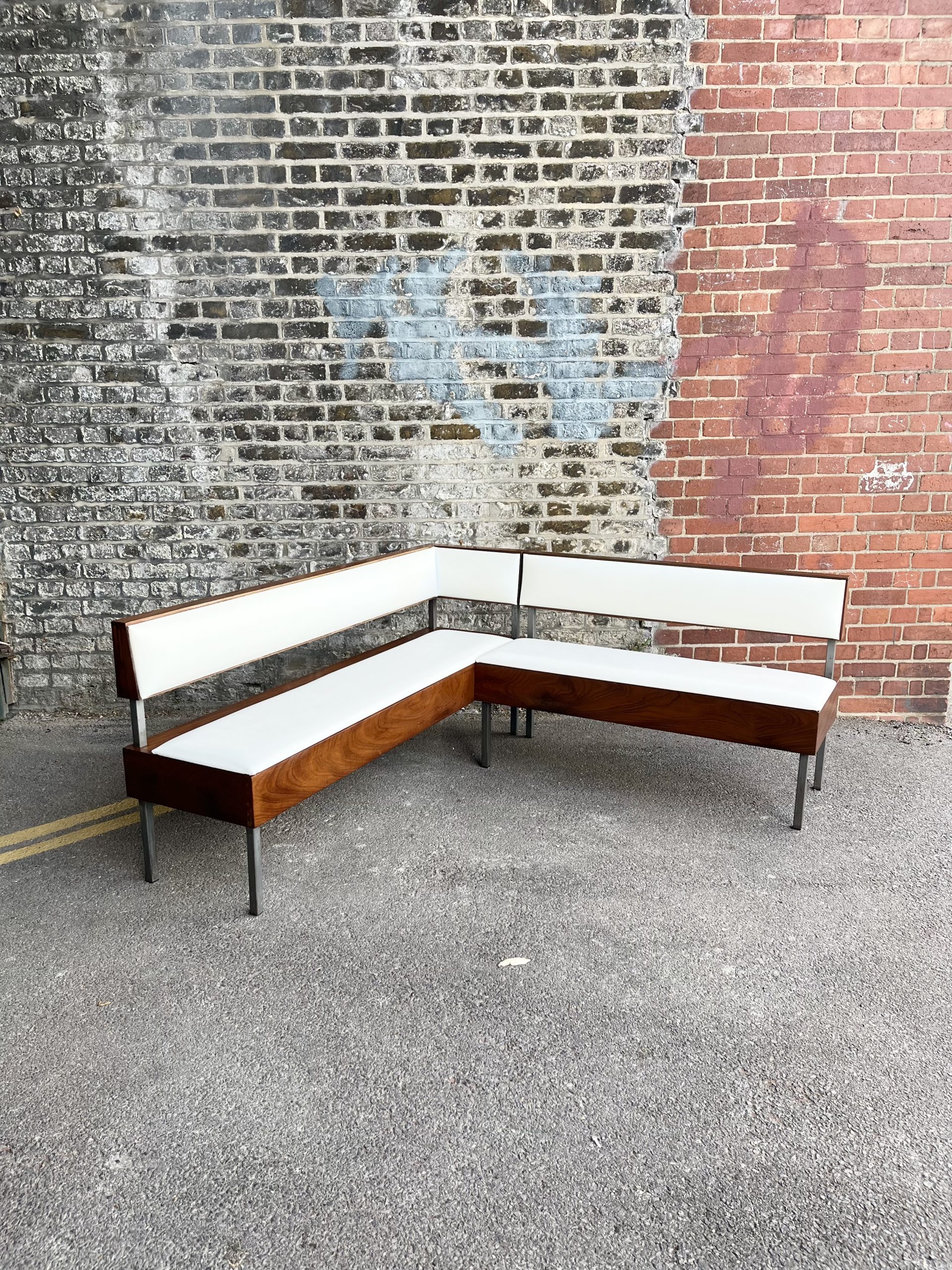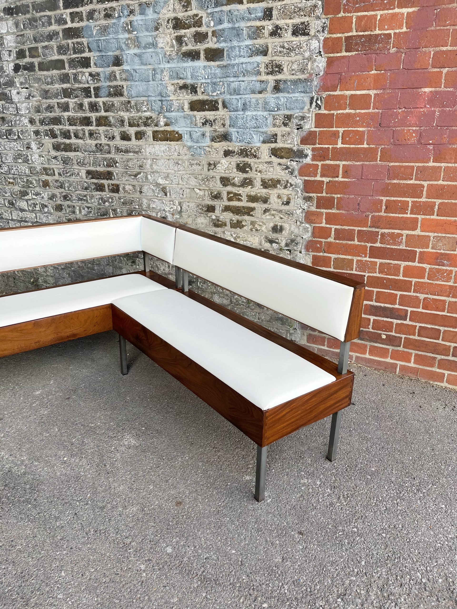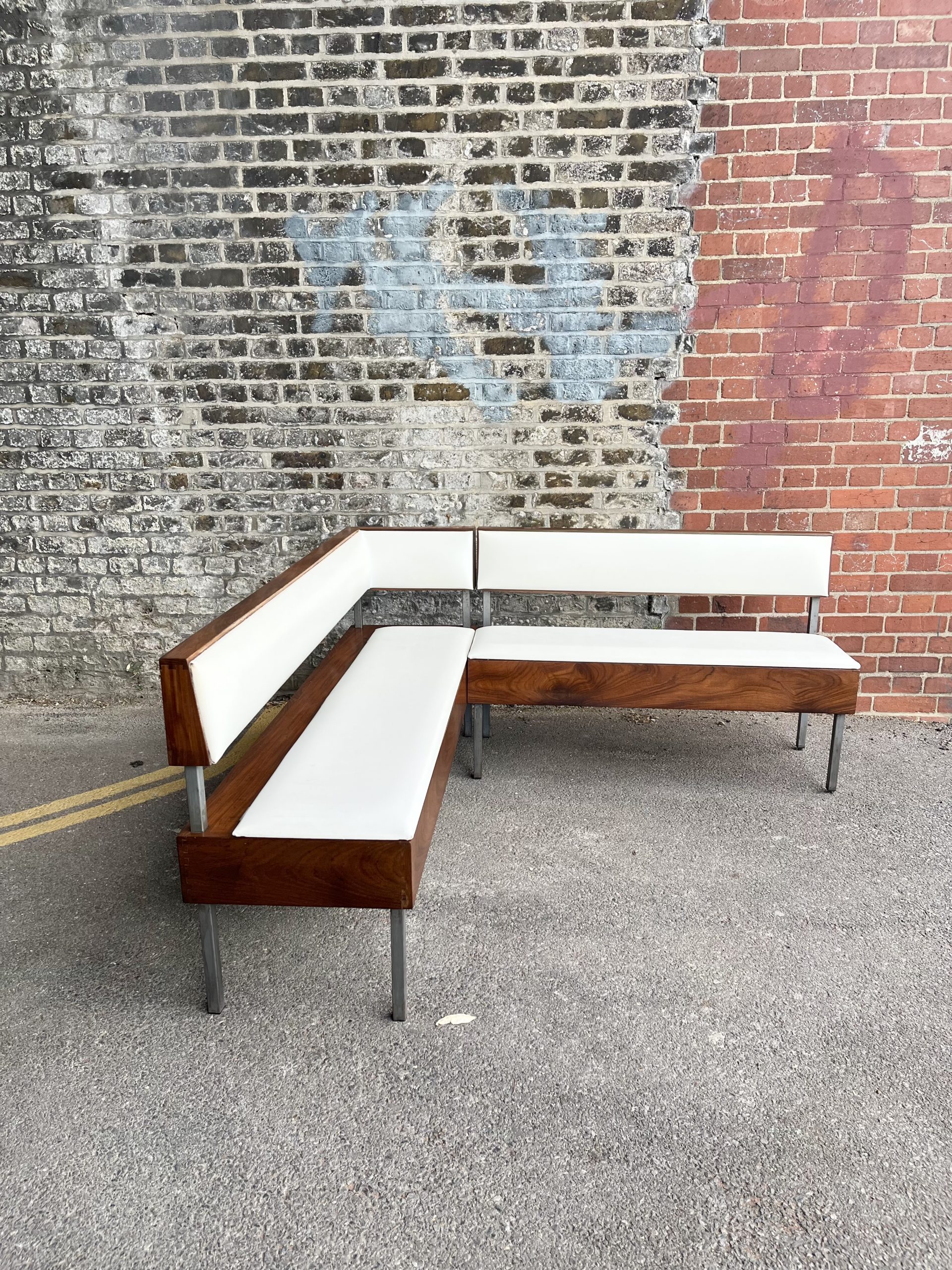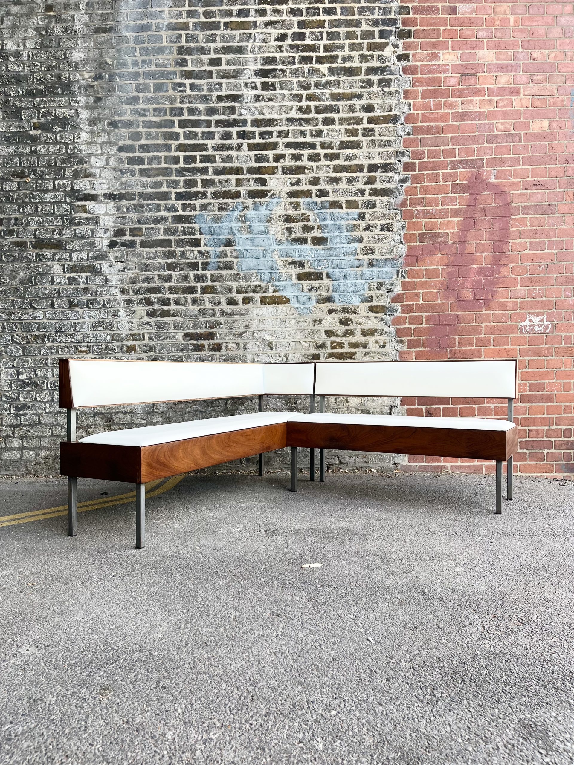 Constructed from African walnut, steel and plywood with white vinyl upholstery, the two sections can be used separately or butted up together as a corner unit. The seats lift up on hinges to reveal hidden storage compartments beneath.