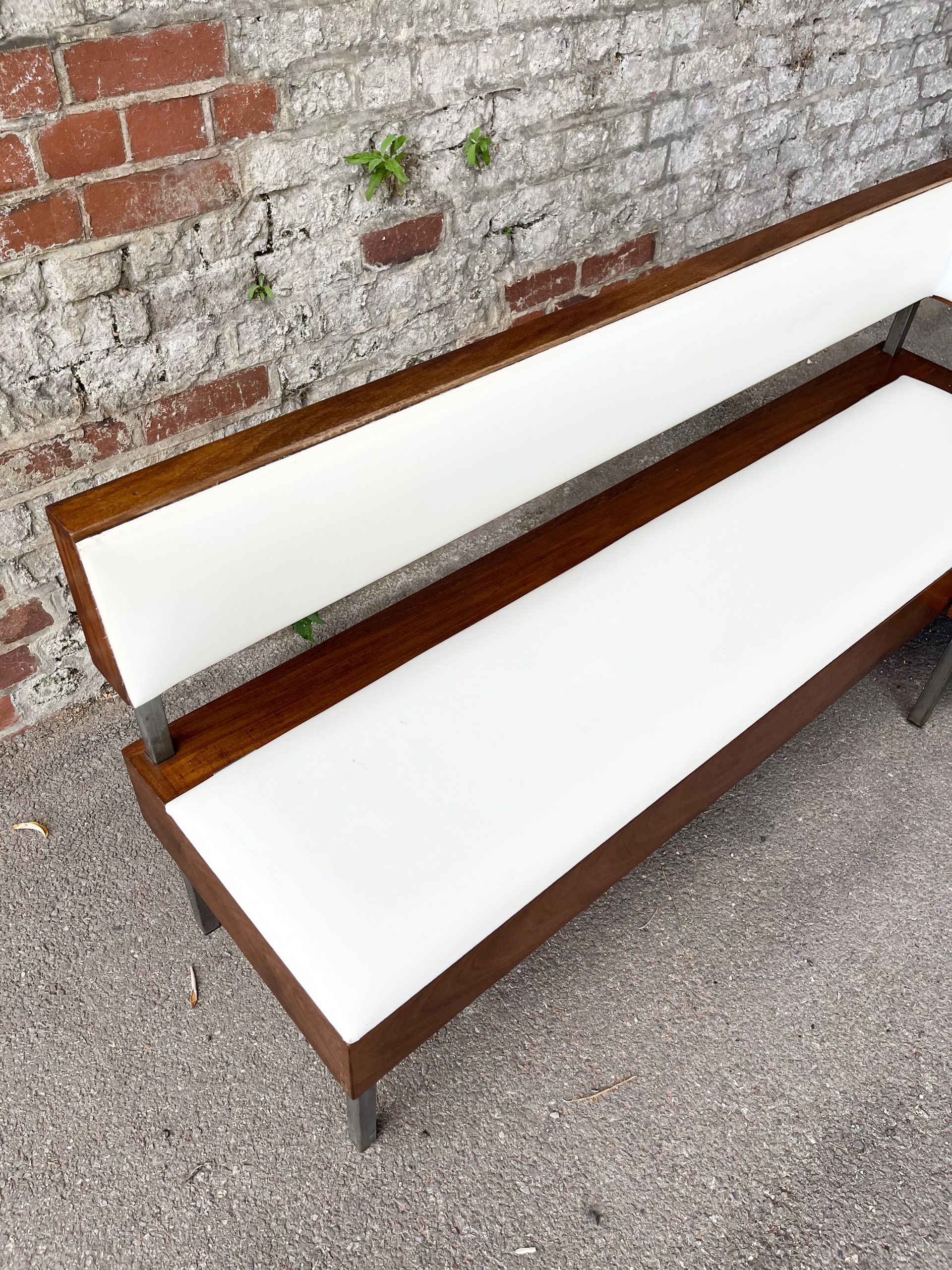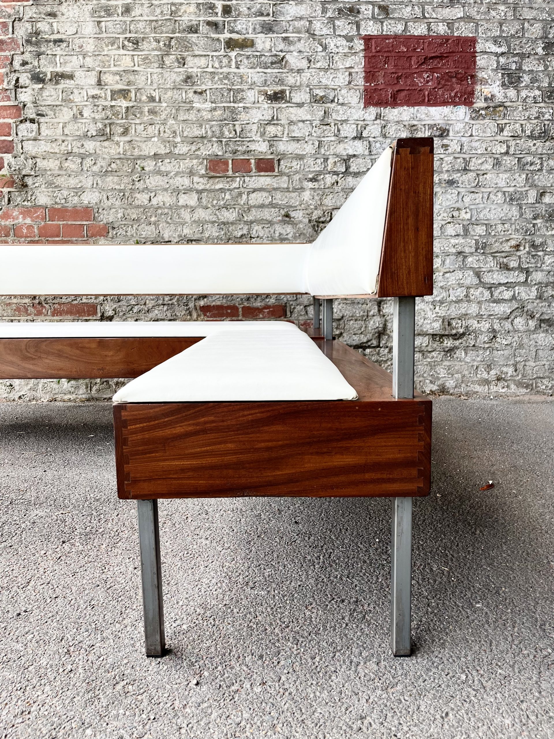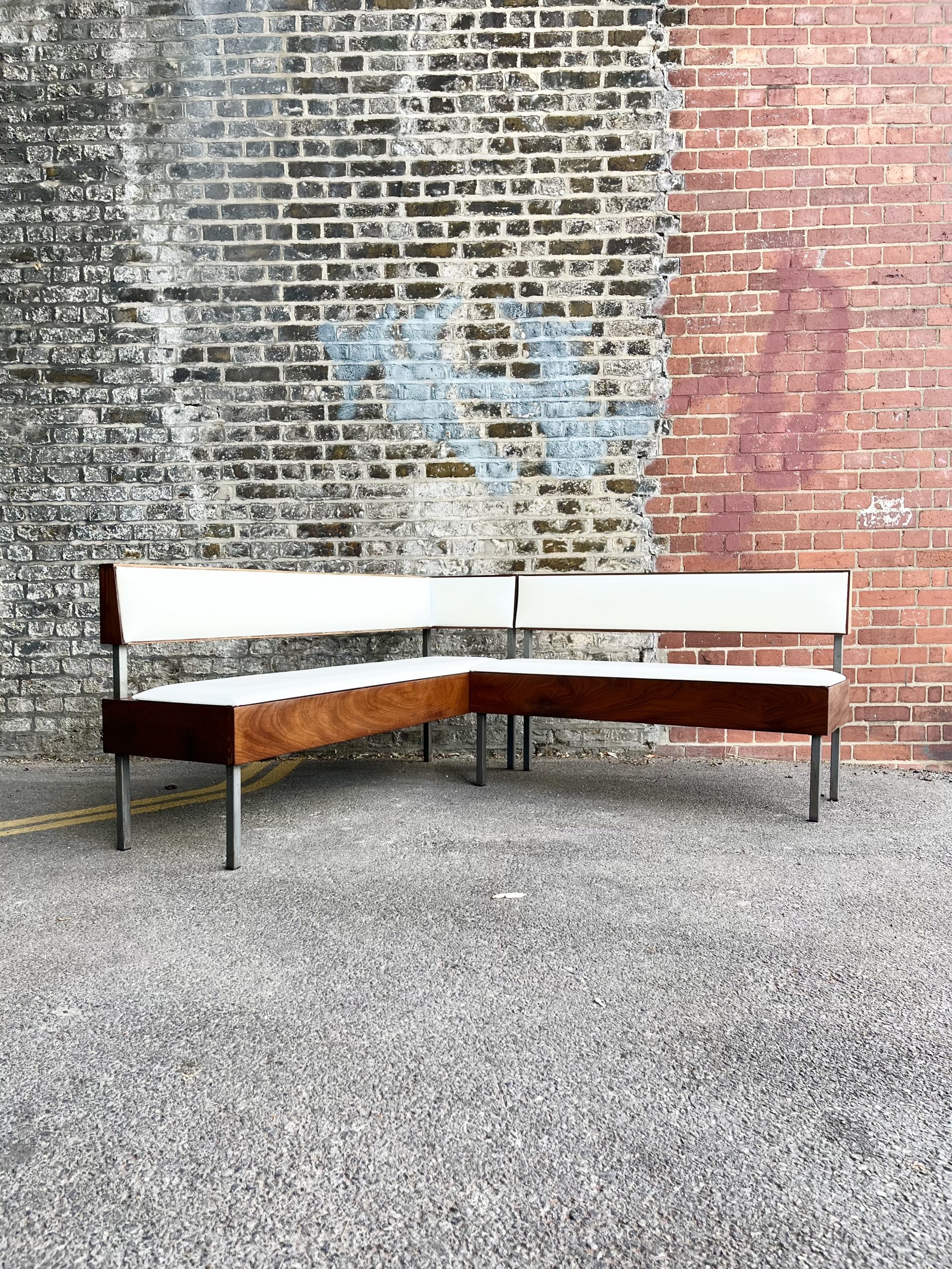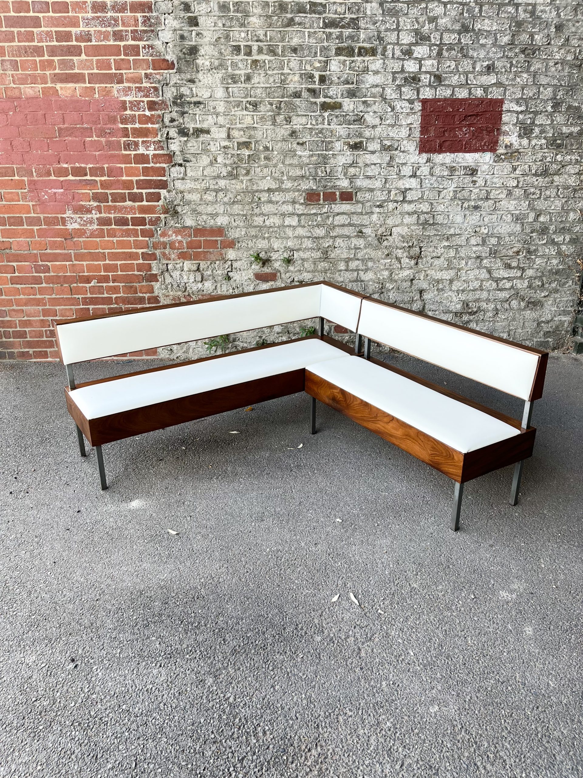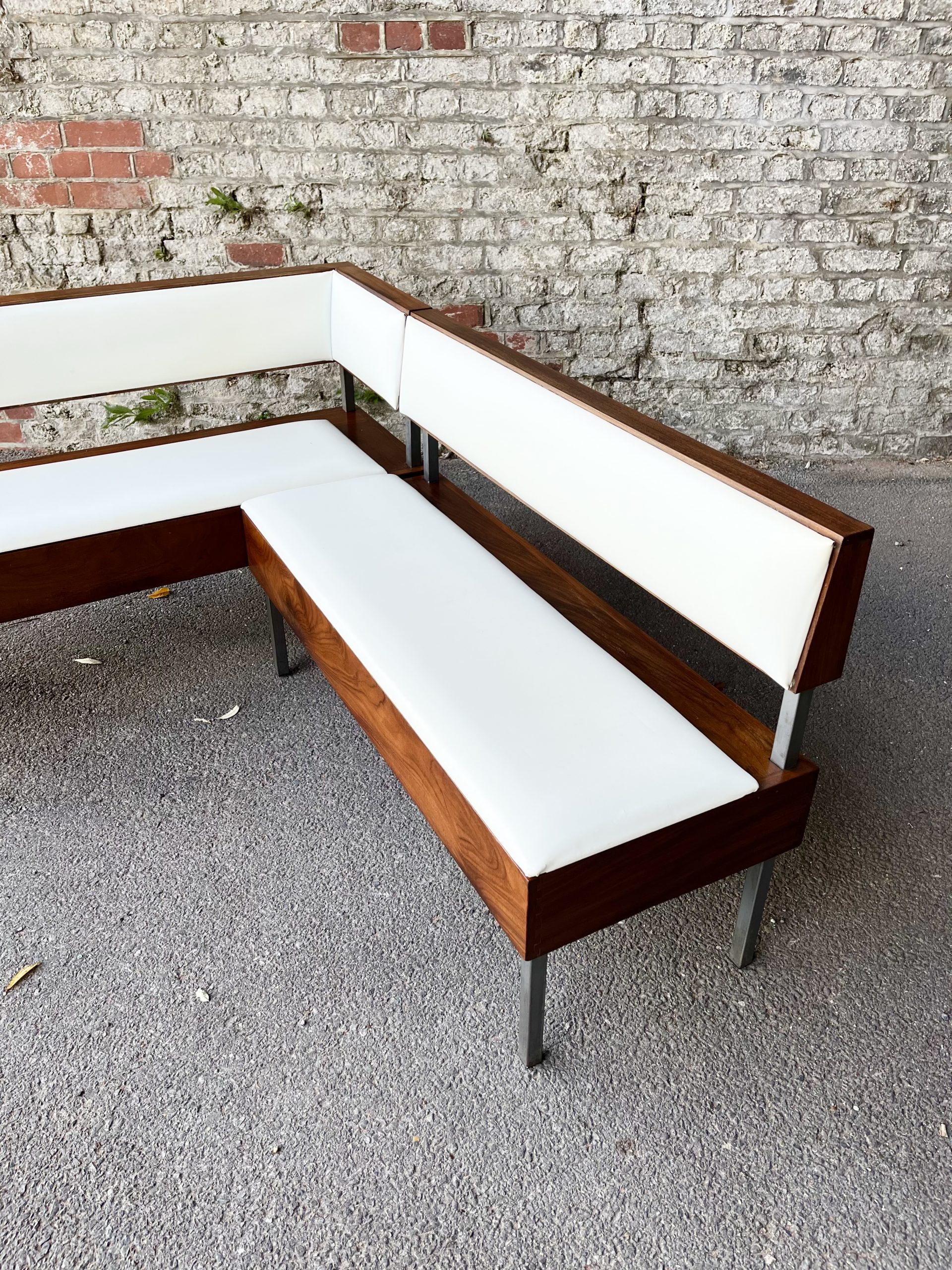 Constructed from African walnut, steel and plywood with white vinyl upholstery, the two sections can be used separately or butted up together as a corner unit. The seats lift up on hinges to reveal hidden storage compartments beneath.