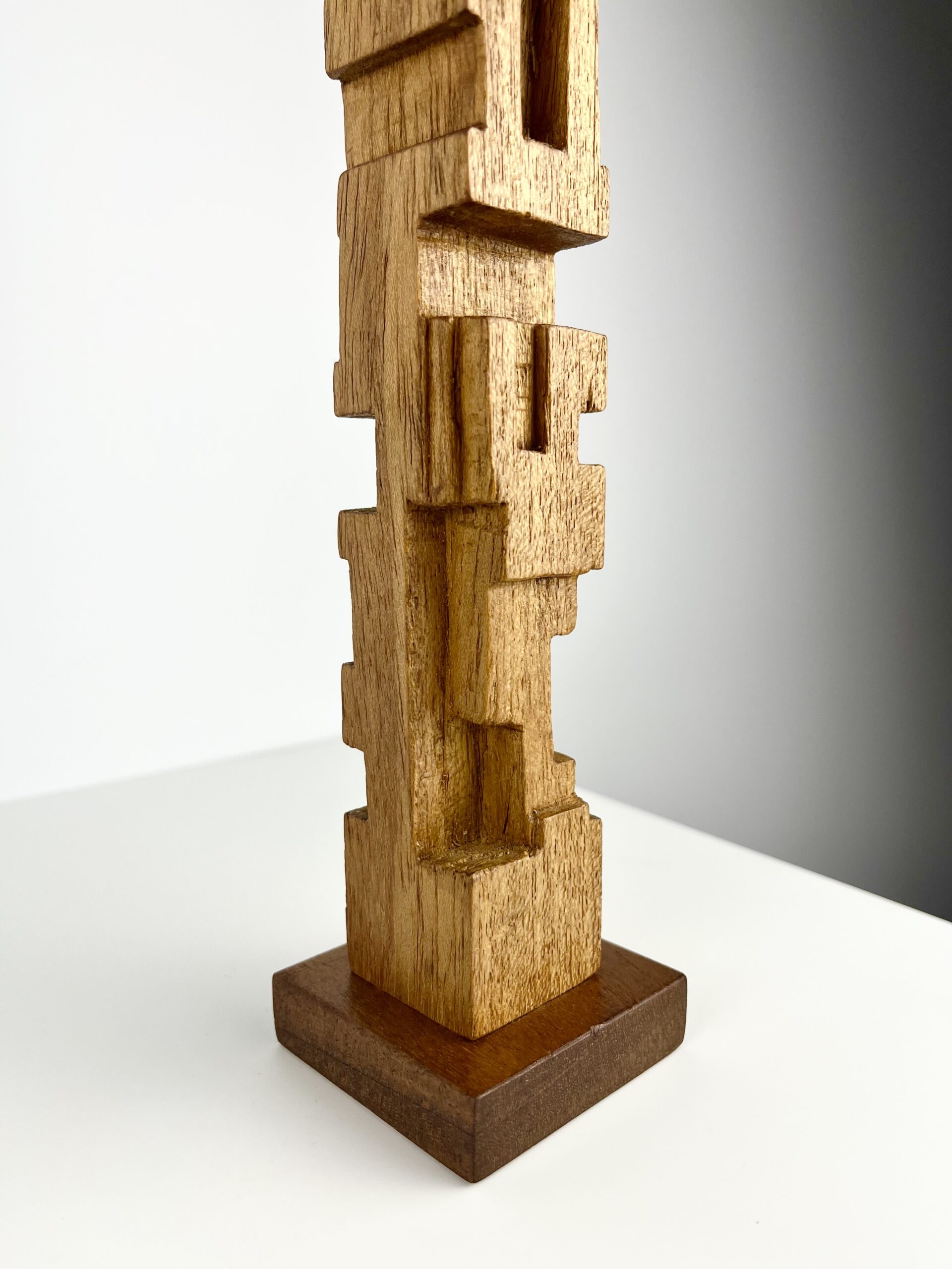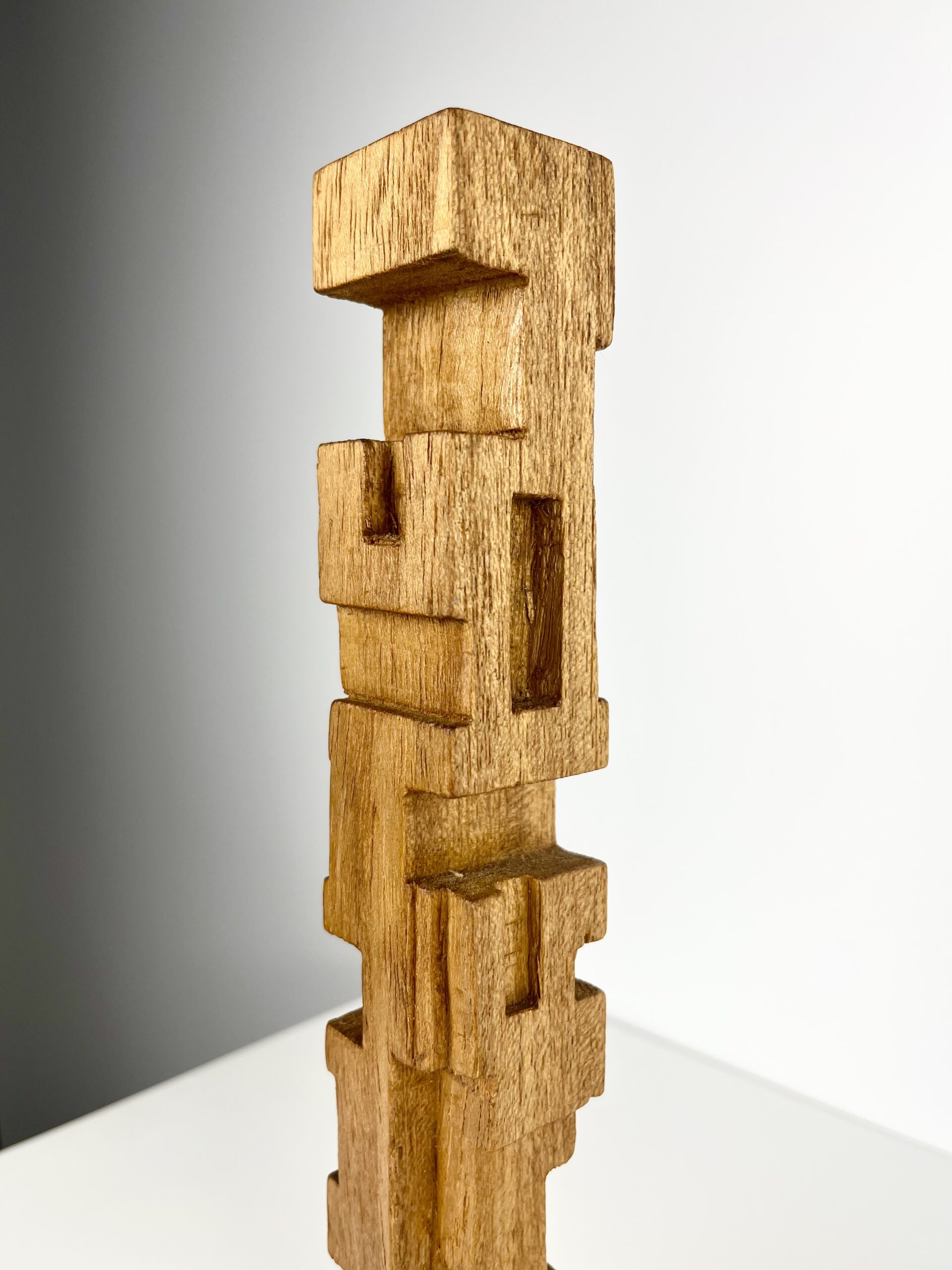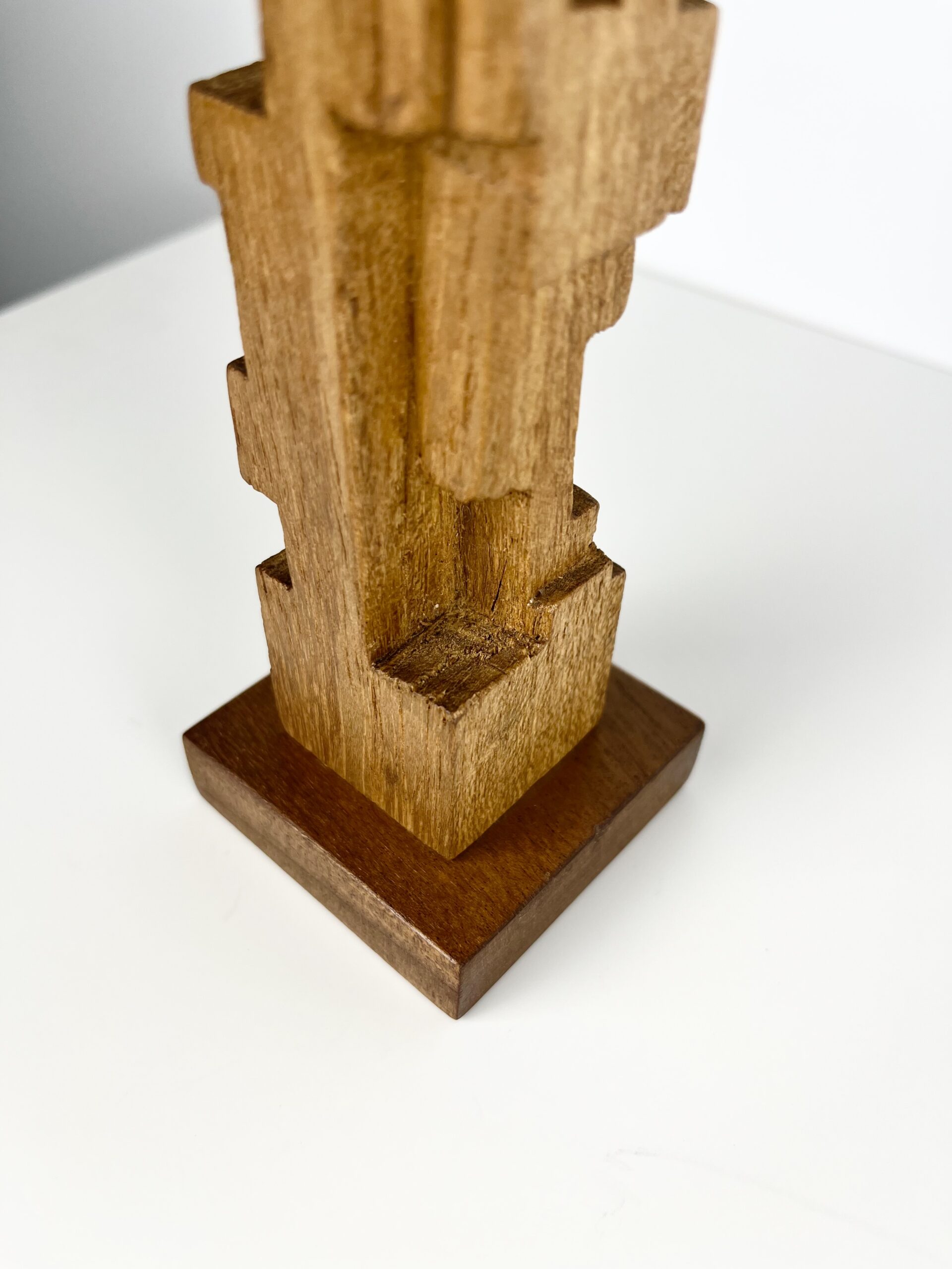 A crudely carved but decorative softwood sculpture, mounted on a mahogany base.