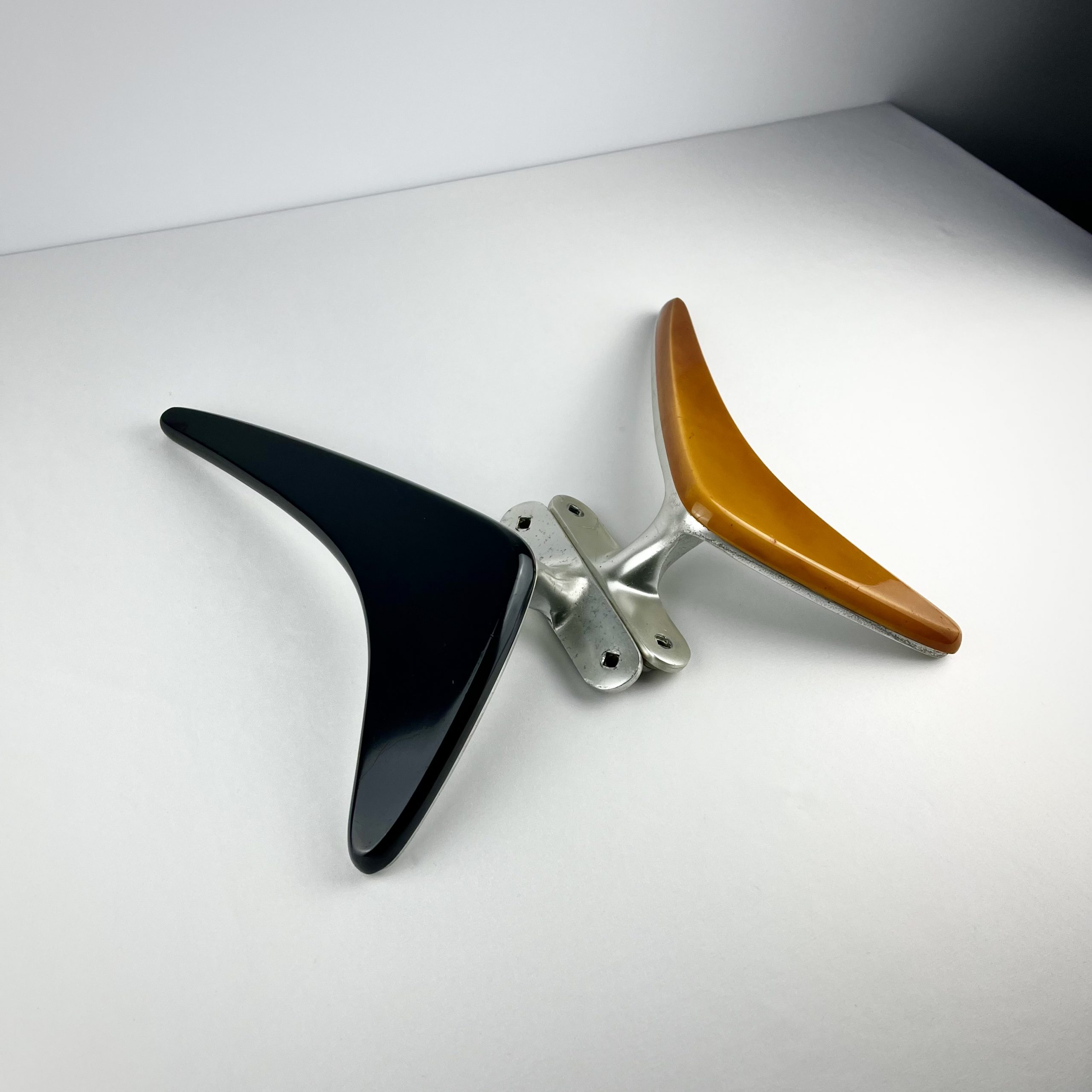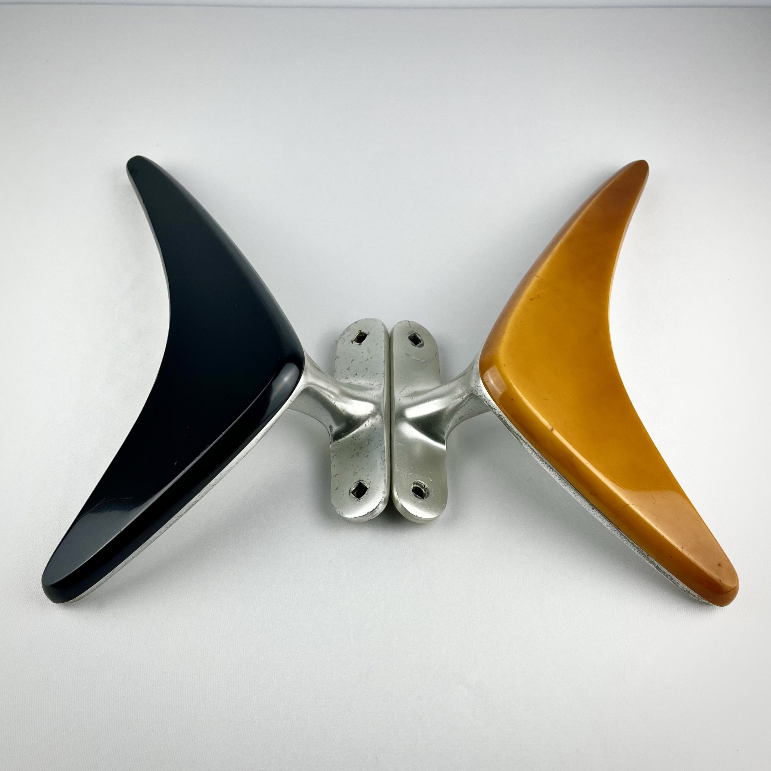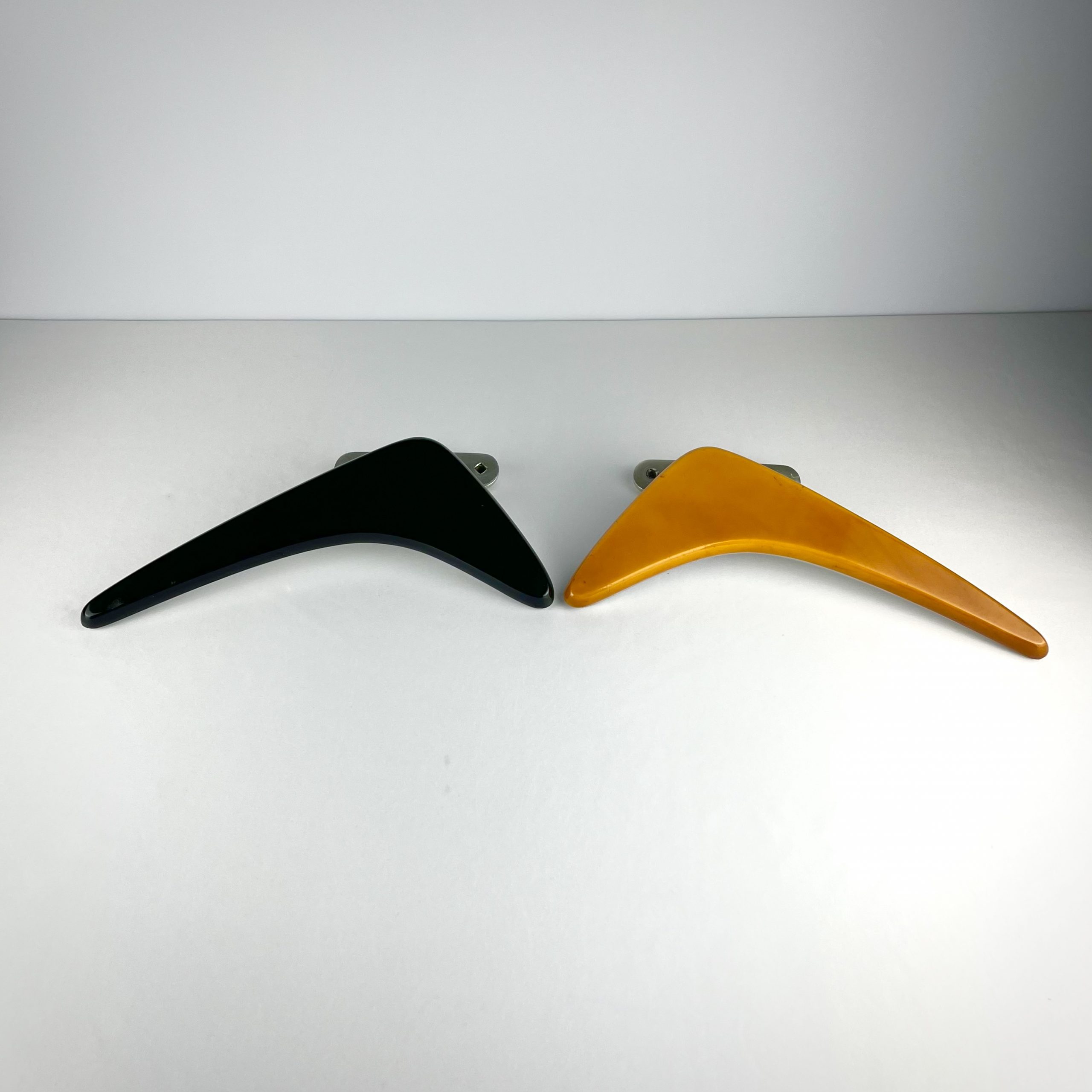 Constructed from aluminium and hard resin, their boomerang shaped design gives them a distinctive, aerofoil-like appearance!