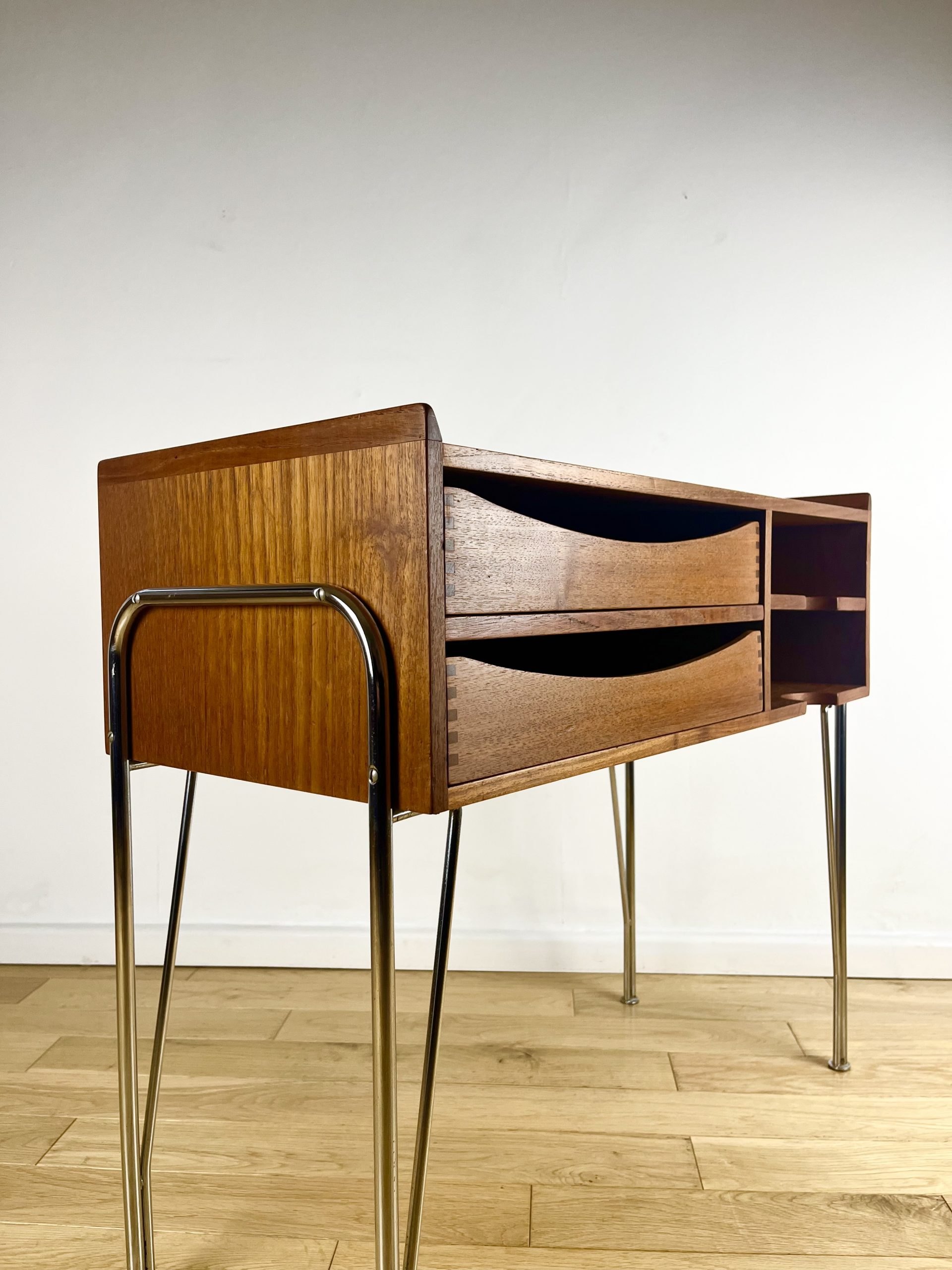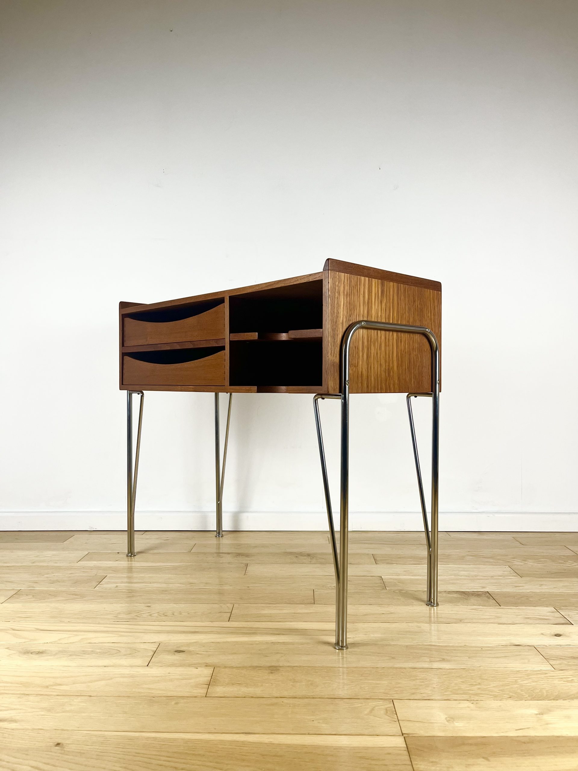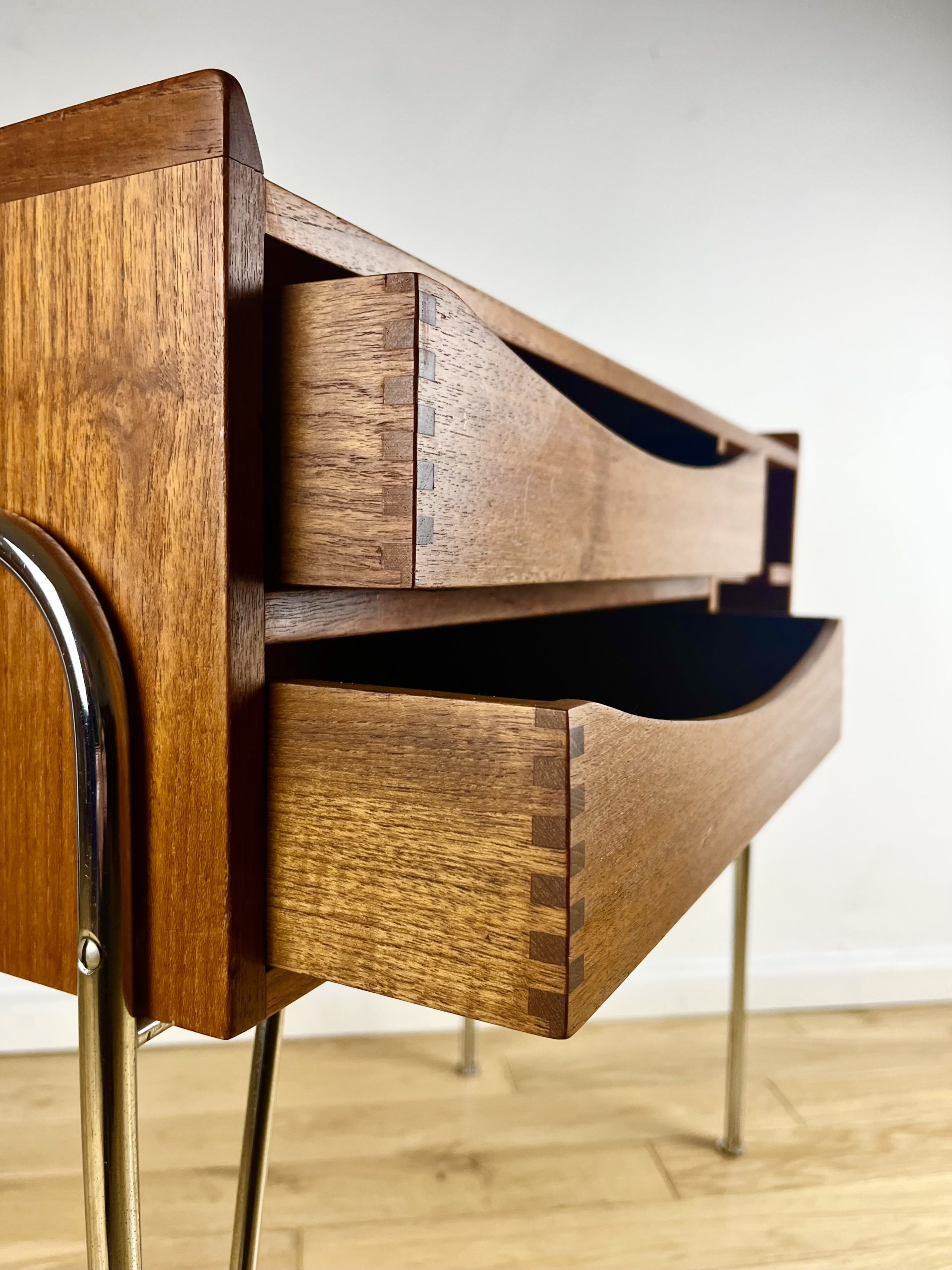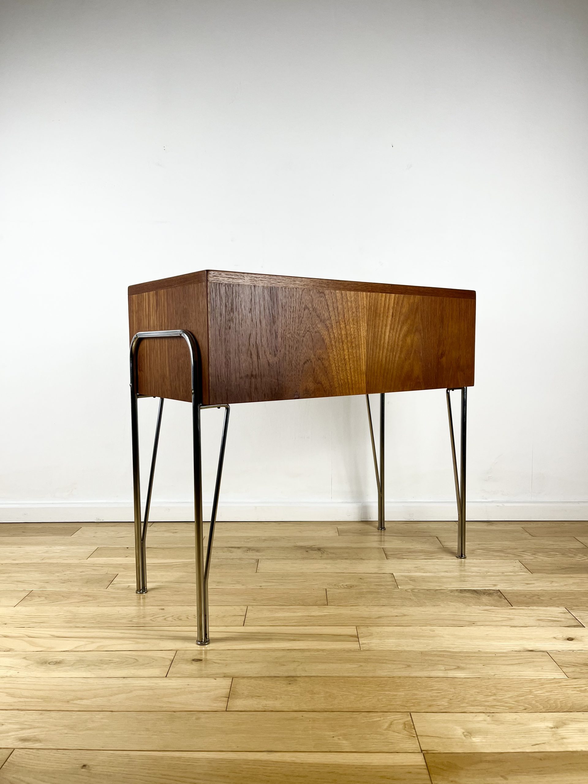 A teak veneered carcass with lipped top houses two beautifully dovetail-jointed drawers and a removable shelf, and is raised on unusual Bauhaus-esque chrome legs.