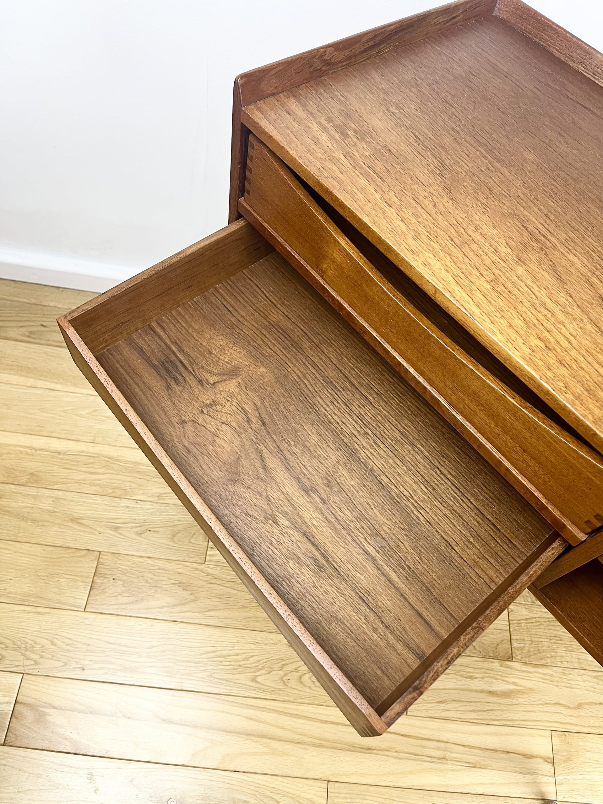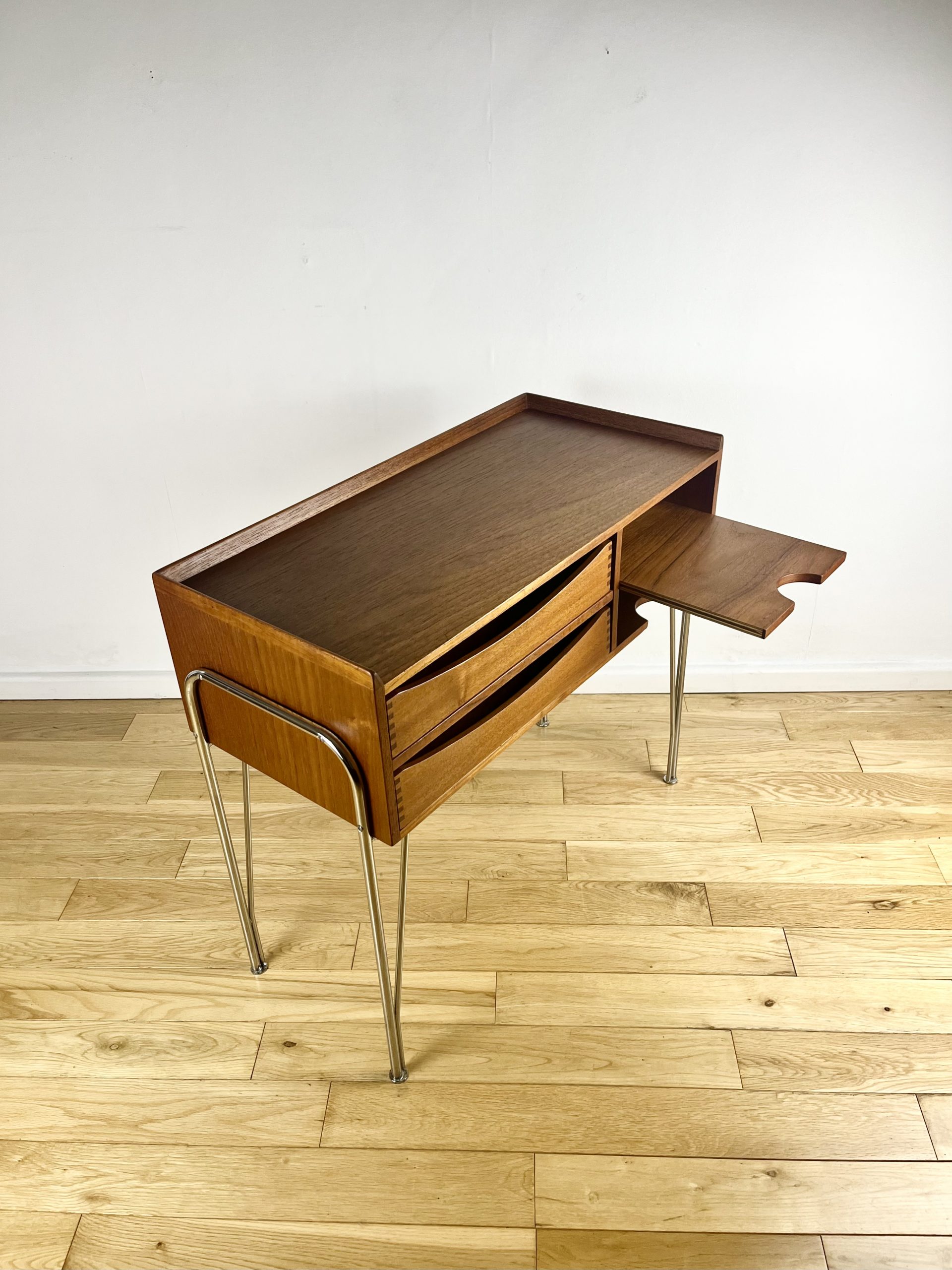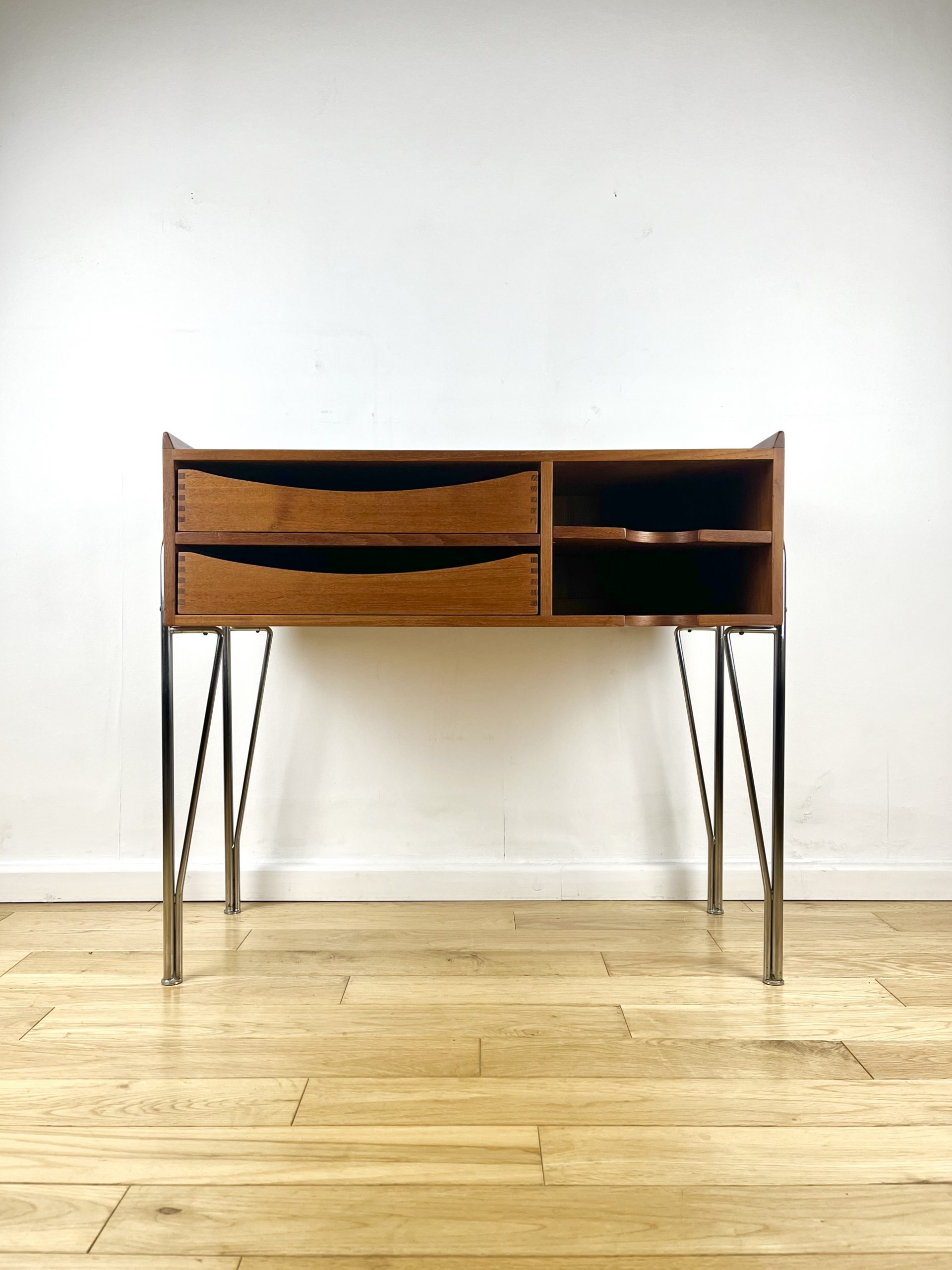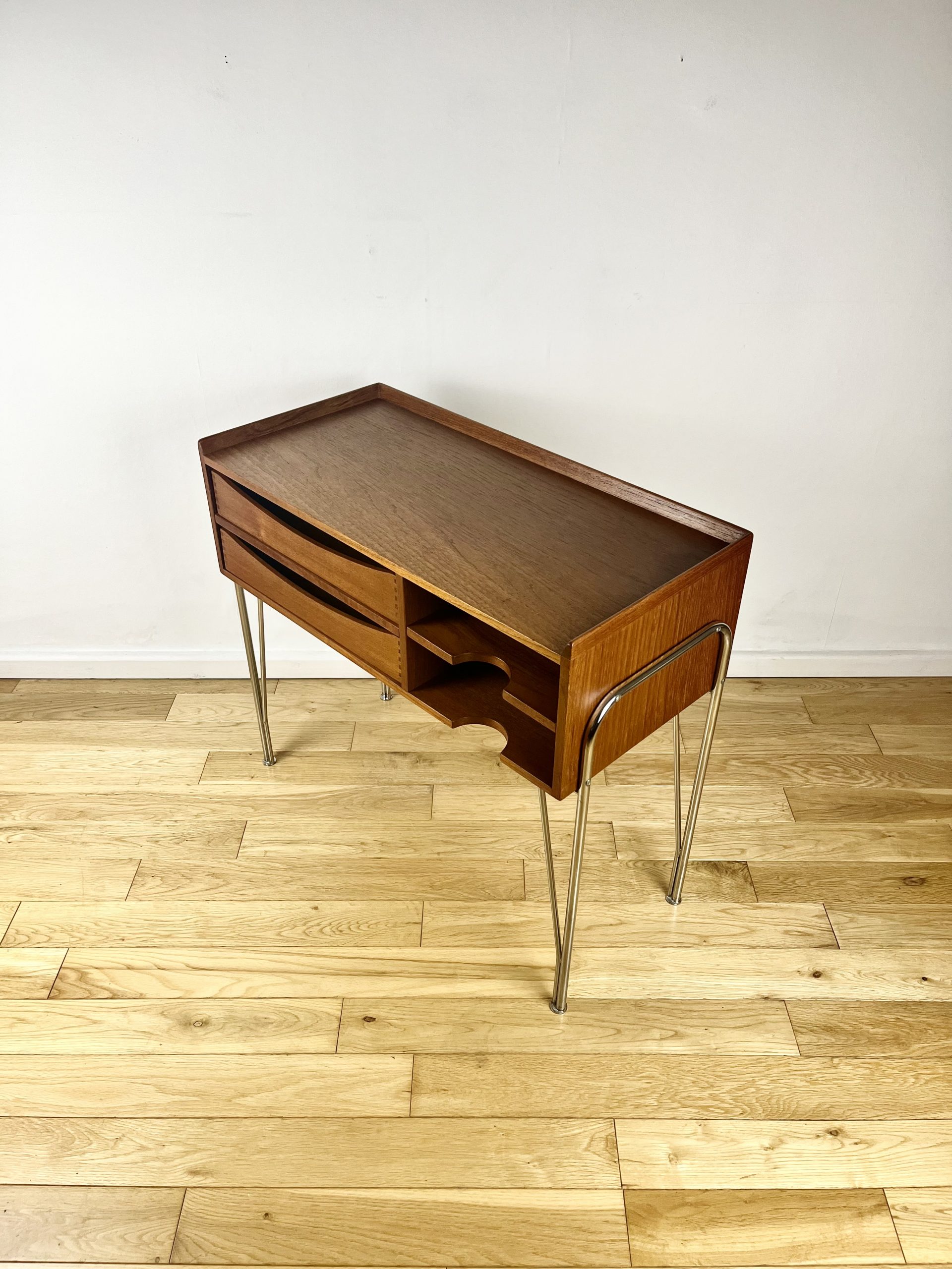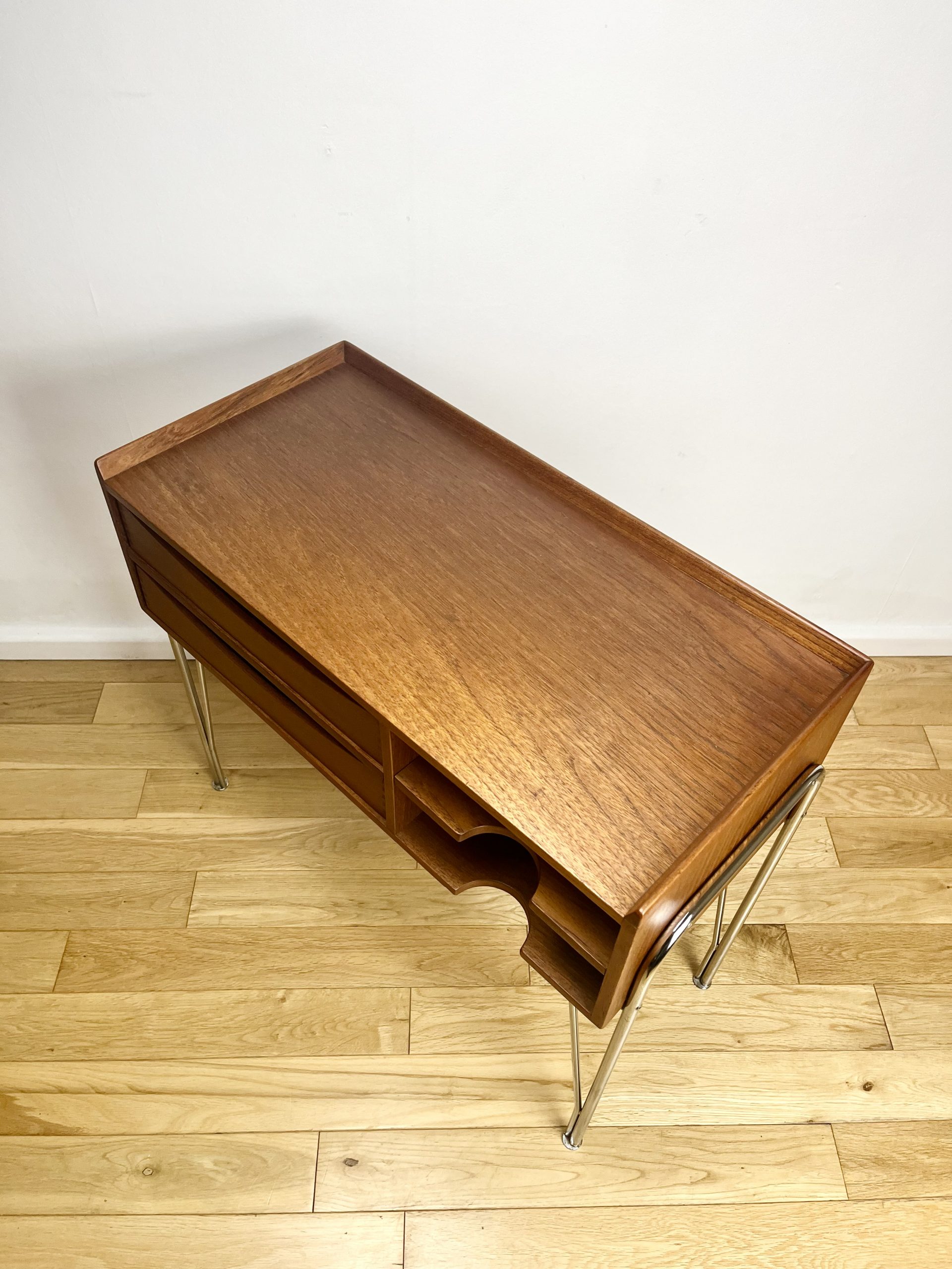 A teak veneered carcass with lipped top houses two beautifully dovetail-jointed drawers and a removable shelf, and is raised on unusual Bauhaus-esque chrome legs.