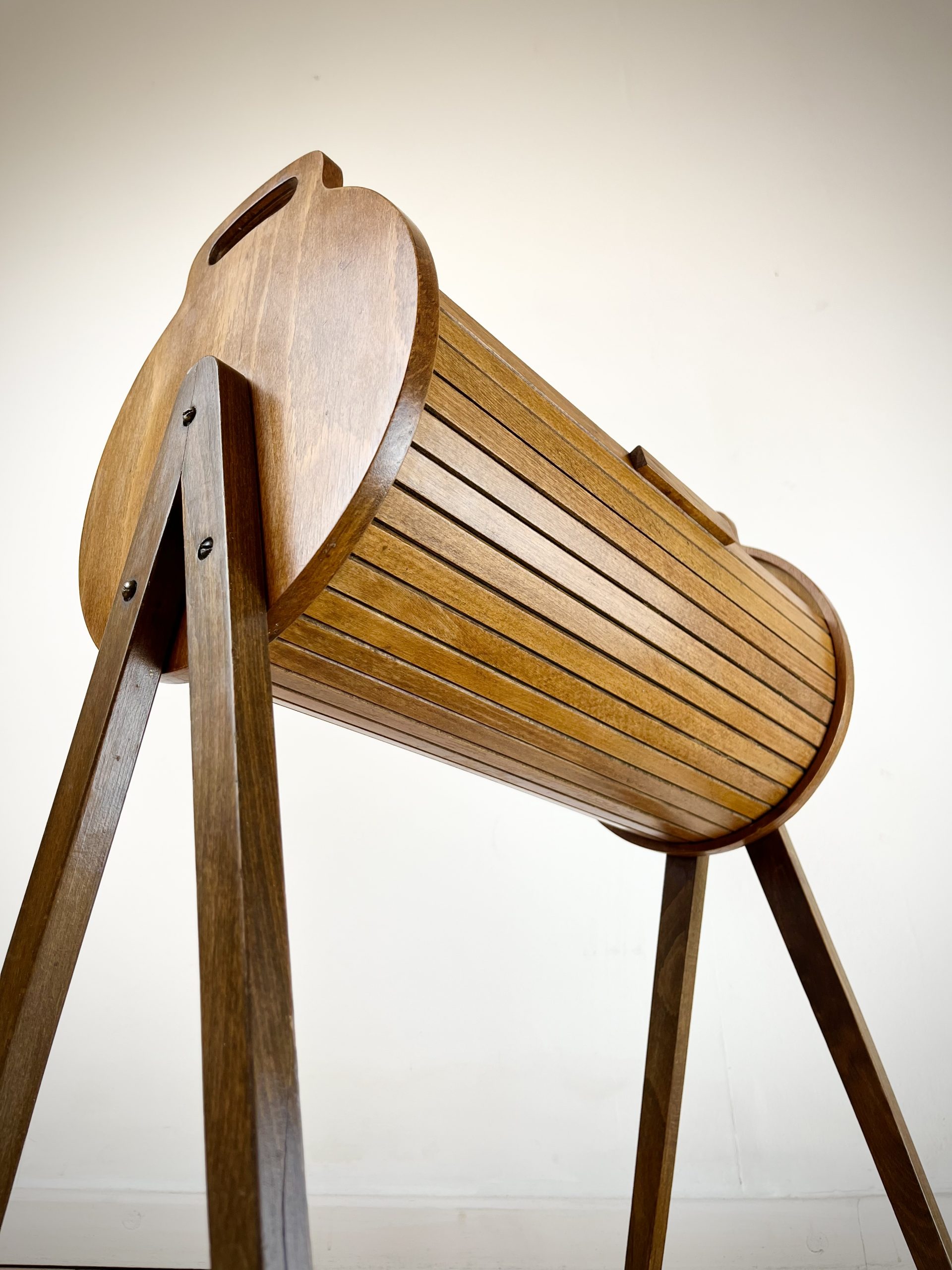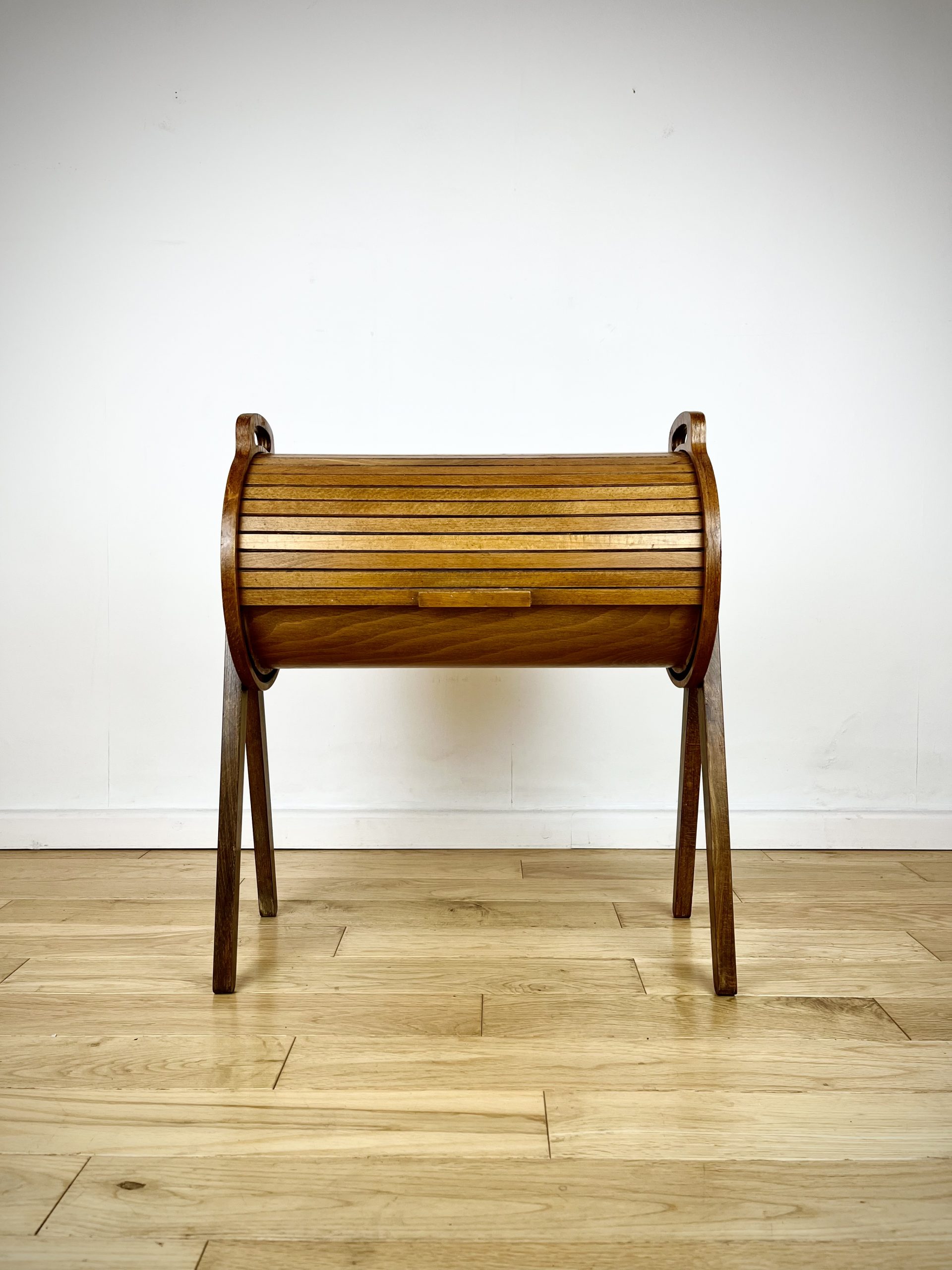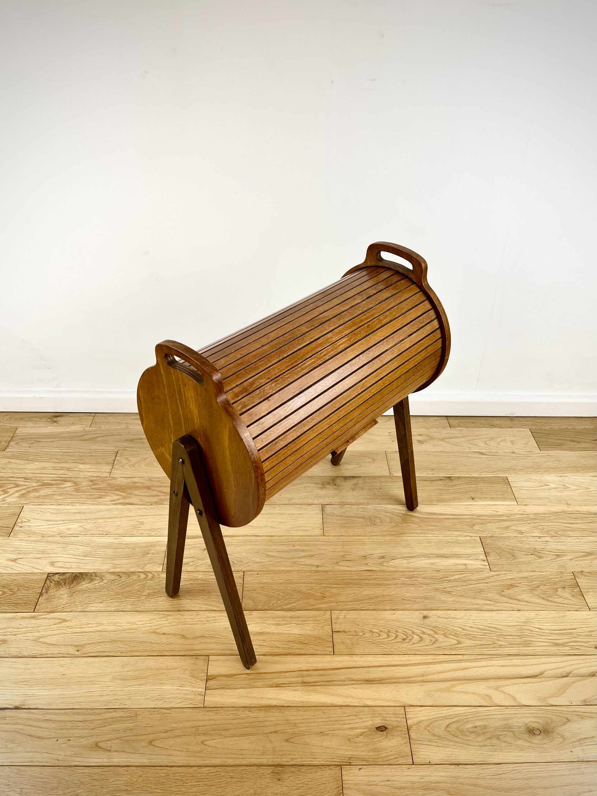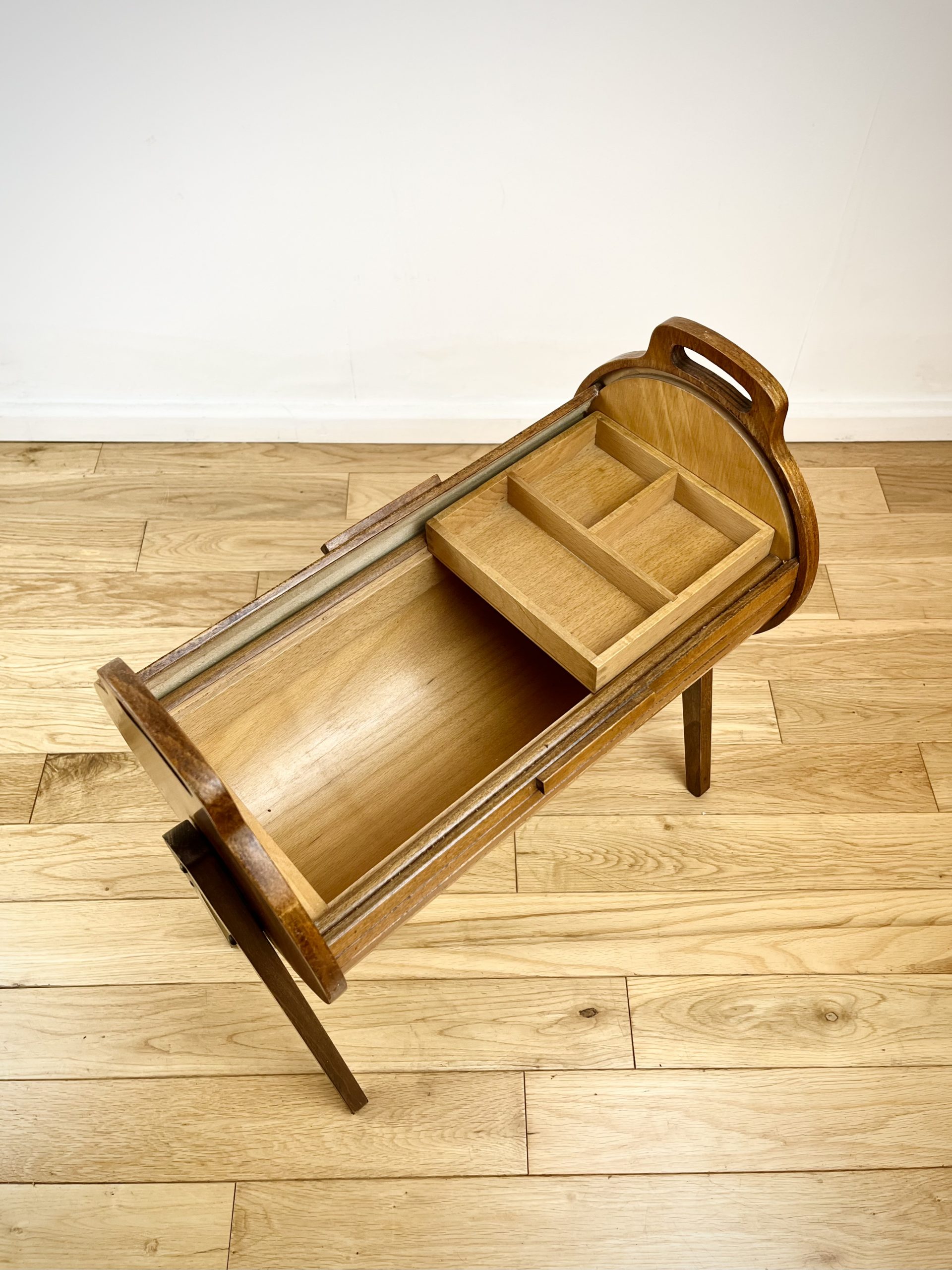 A walnut ply exterior and revolving tambour top, which glides open open to reveal a beech lined interior with a sliding and removable dovetail-jointed drawer.