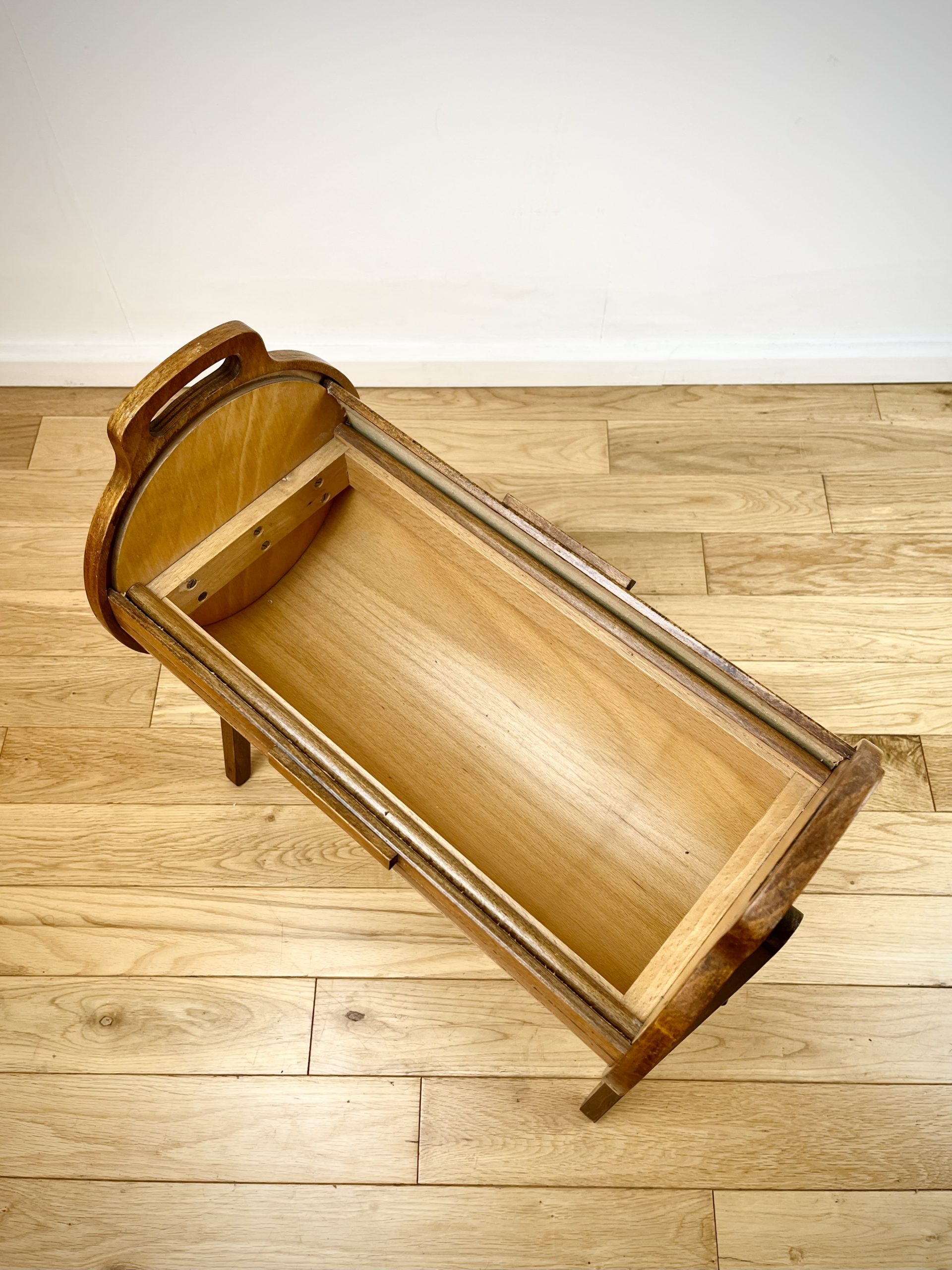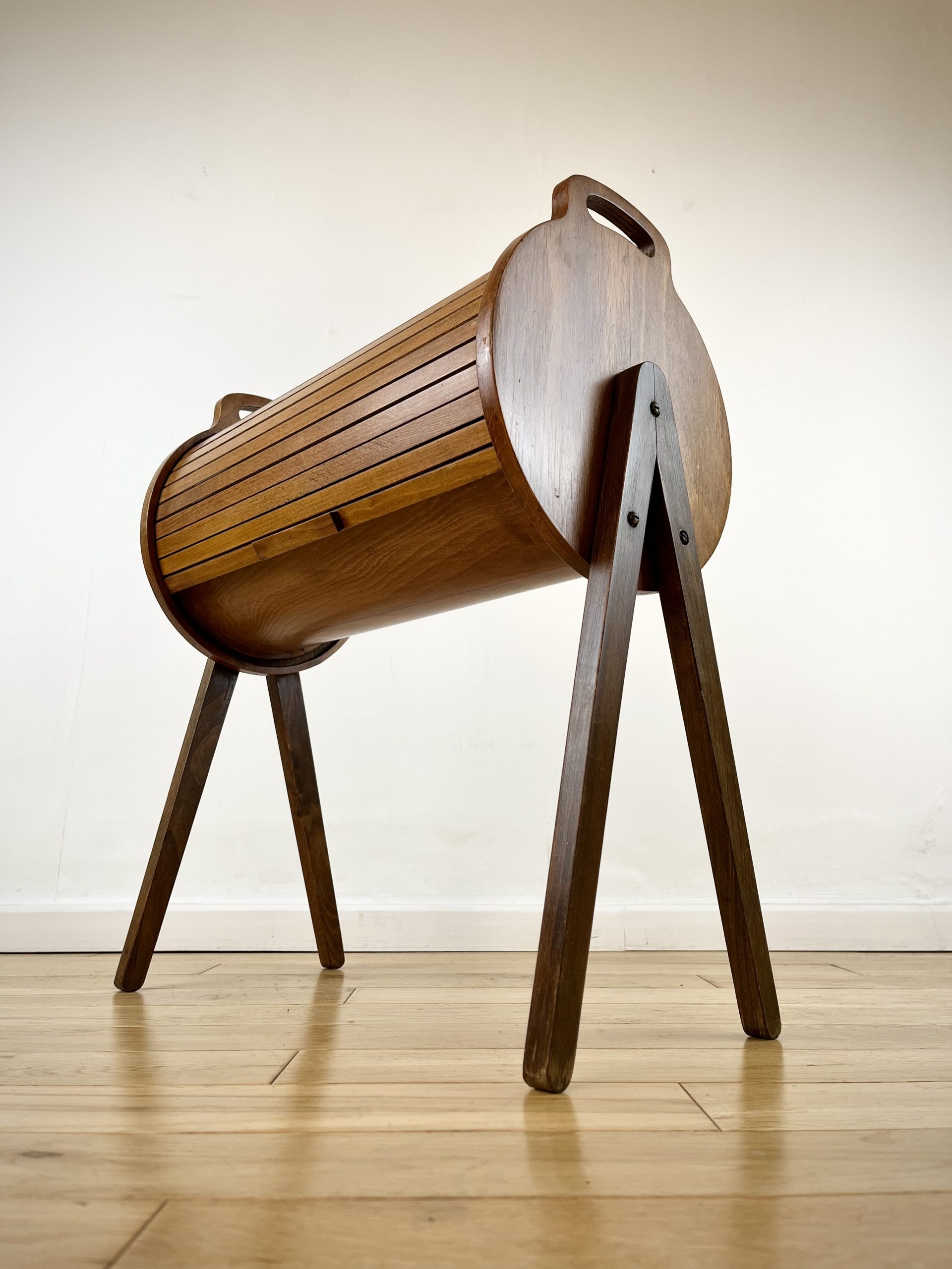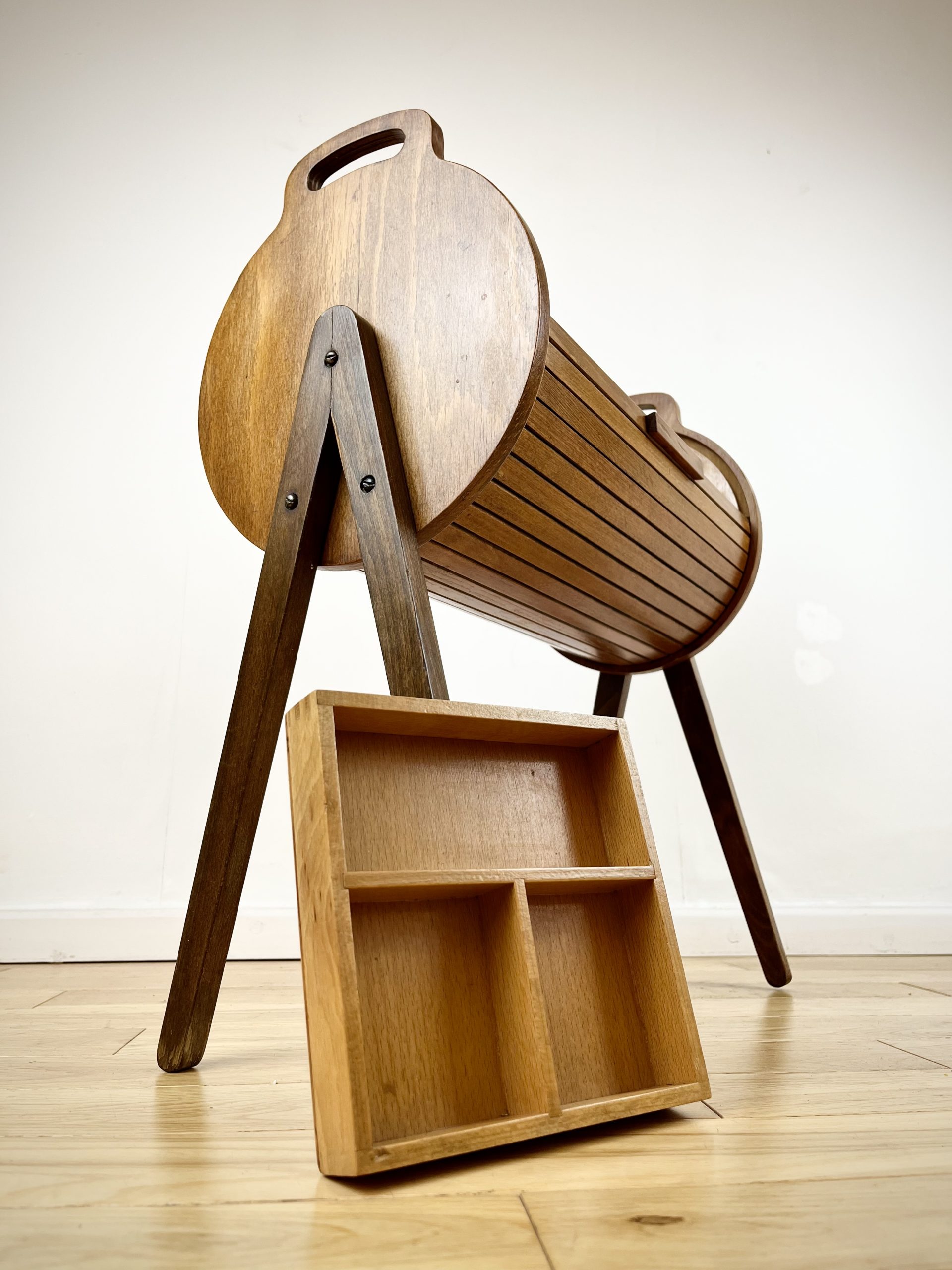 A walnut ply exterior and revolving tambour top, which glides open open to reveal a beech lined interior with a sliding and removable dovetail-jointed drawer.