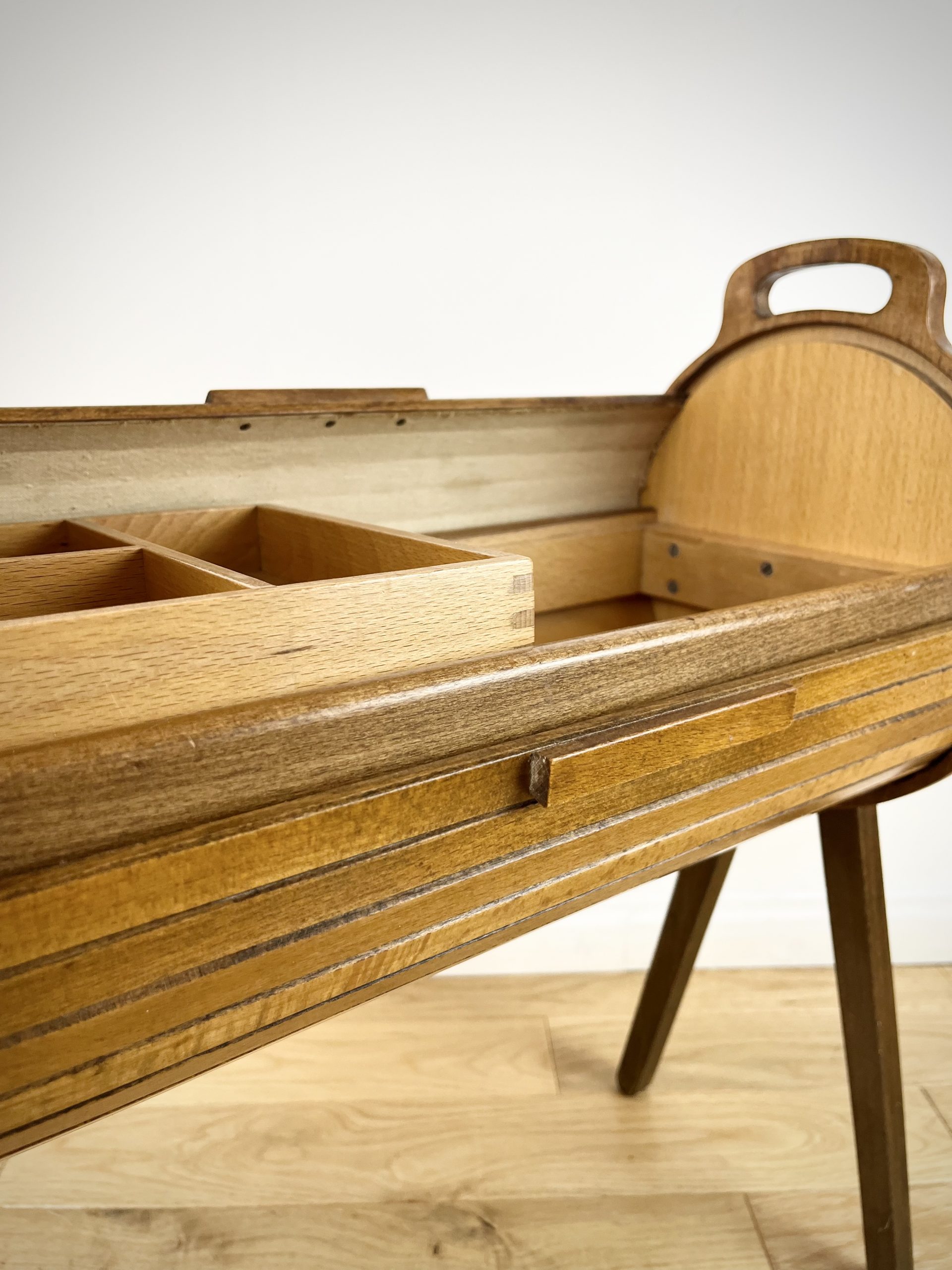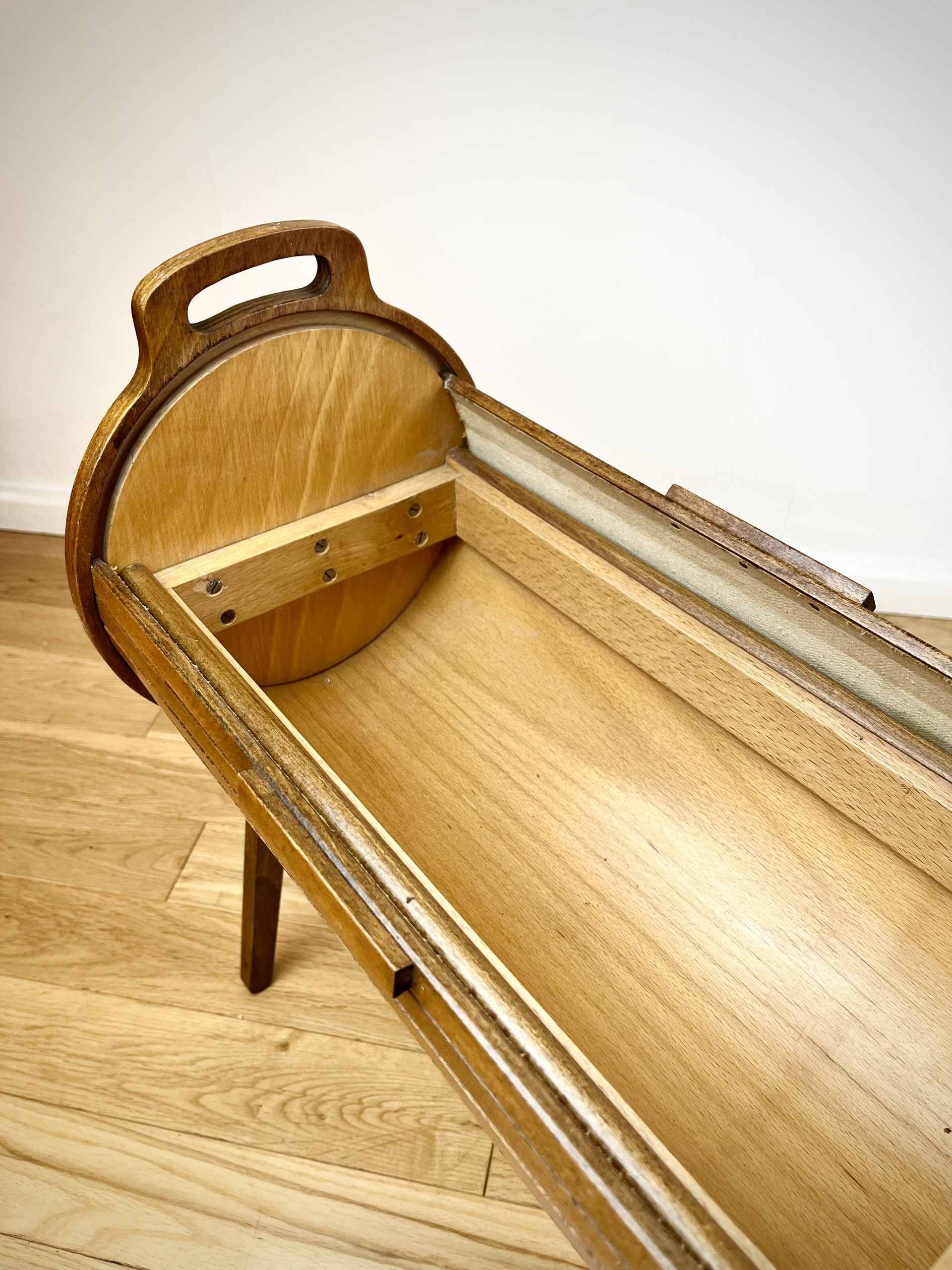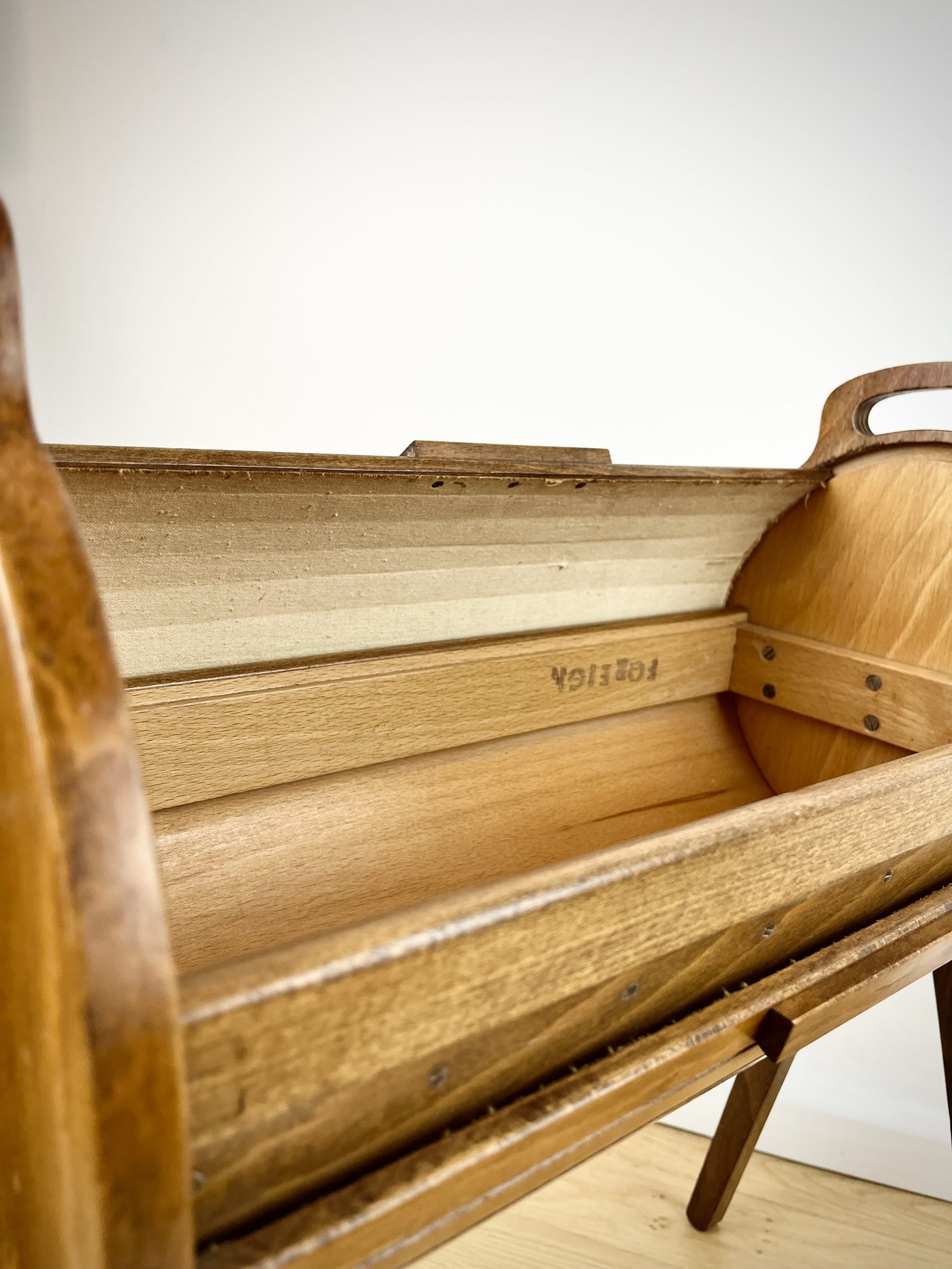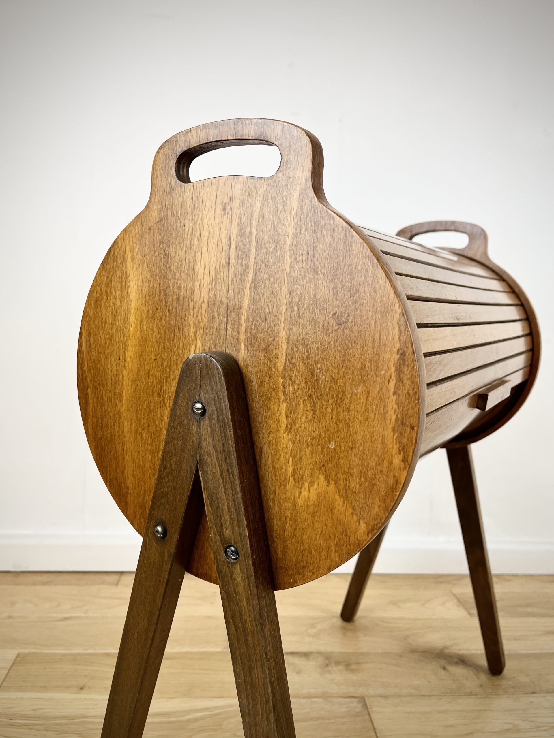 A walnut ply exterior and revolving tambour top, which glides open open to reveal a beech lined interior with a sliding and removable dovetail-jointed drawer.